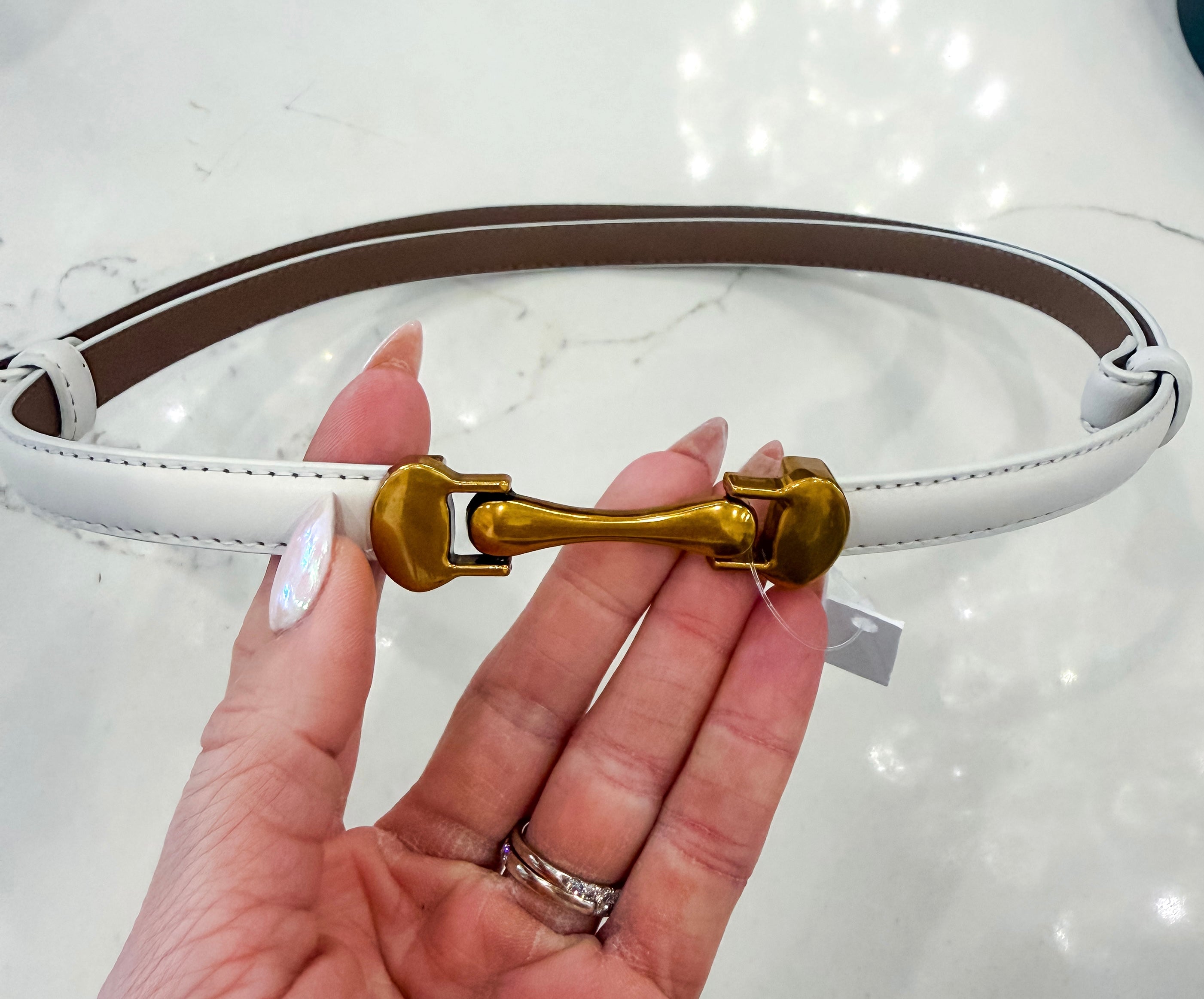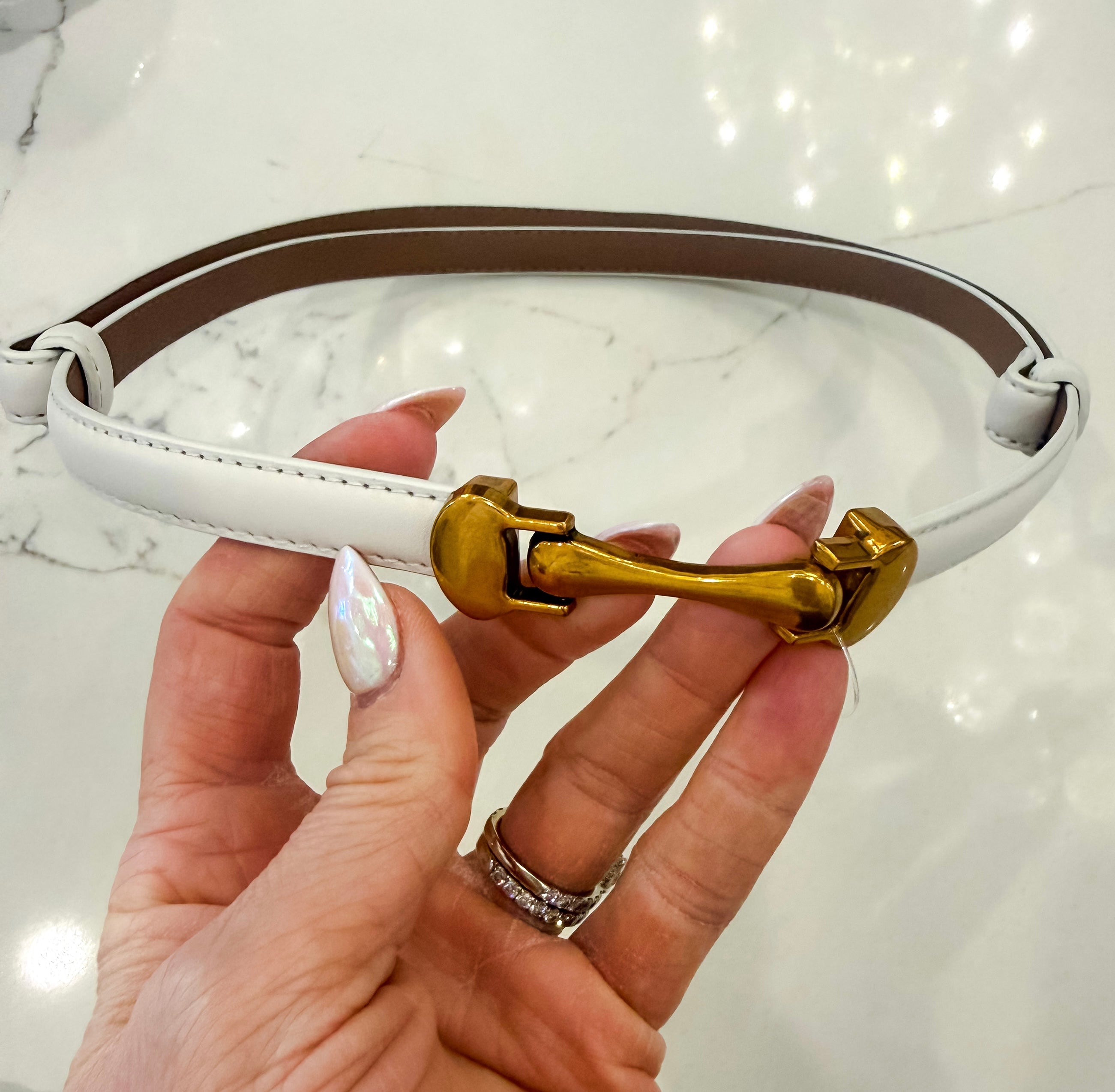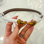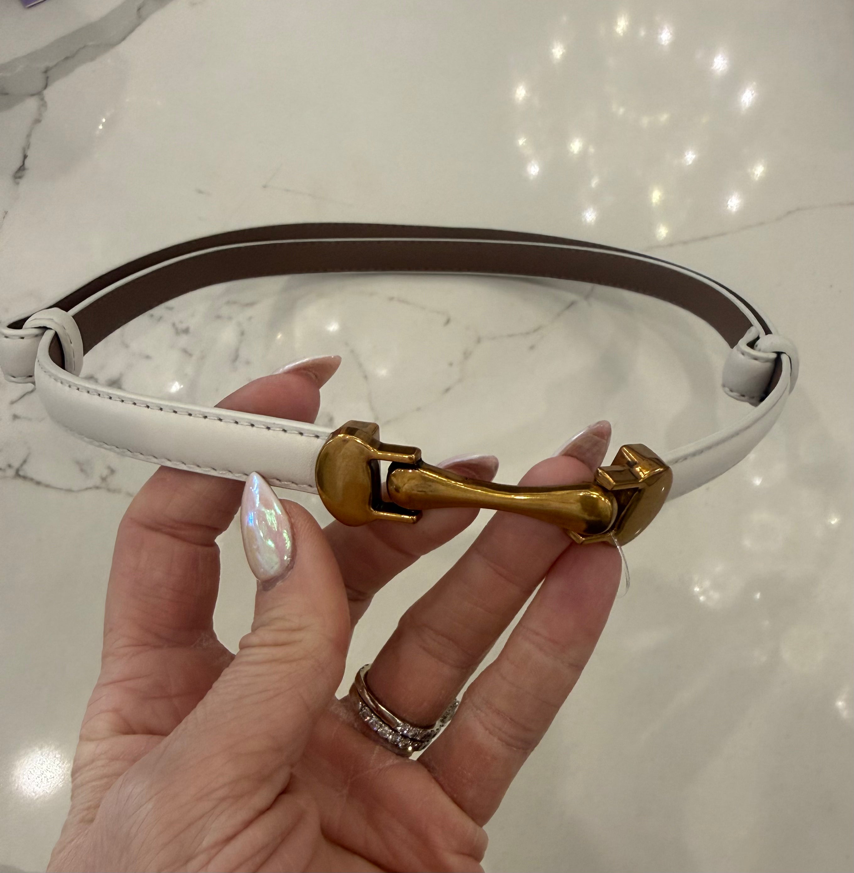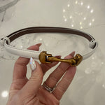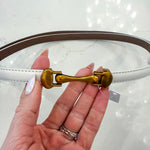 The Caspian Belt in white combines minimalist elegance with functional design. This sleek, thin belt features a distinctive front-hook closure and subtle gold detailing for refined sophistication. One-size-fits-all construction slides smoothly at the back for a customized fit at your waist. Perfect for elevating casual or polished looks with understated style.