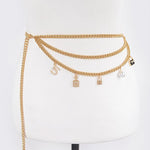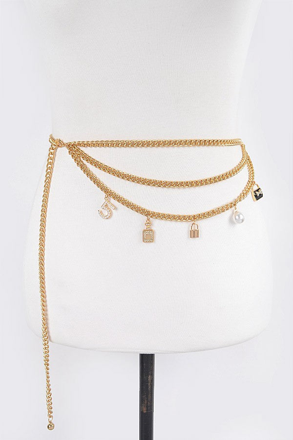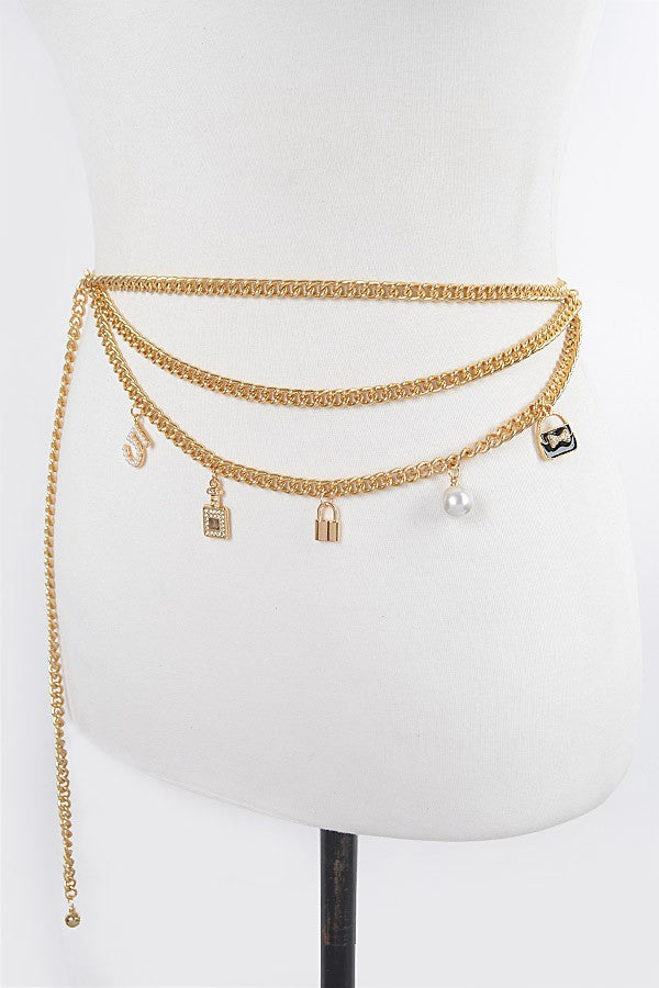 Elevate your accessory game with this sophisticated layered chain belt, where luxury meets versatility. Featuring an expertly curated mix of gleaming gold chains, ornamental locks, and lustrous pearls, this statement piece transforms any outfit from ordinary to extraordinary. The intricate charm detailing creates visual depth and movement, while the refined construction ensures lasting wear. Perfect for those who understand that true style lies in the details—wear it cinched at the waist for definition or layered over dresses for an effortlessly polished look.