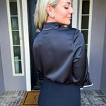 Elevate your wardrobe with the Ibiza Nights Ruffle Blouse, expertly designed to combine elegance and modern style. This blouse features flared cuffs that add a graceful silhouette, complemented by a refined ruffle detail at the neck for a touch of sophistication. The subtle white piping enhances its chic appeal, making it a versatile piece perfect for both professional settings and stylish evenings out.