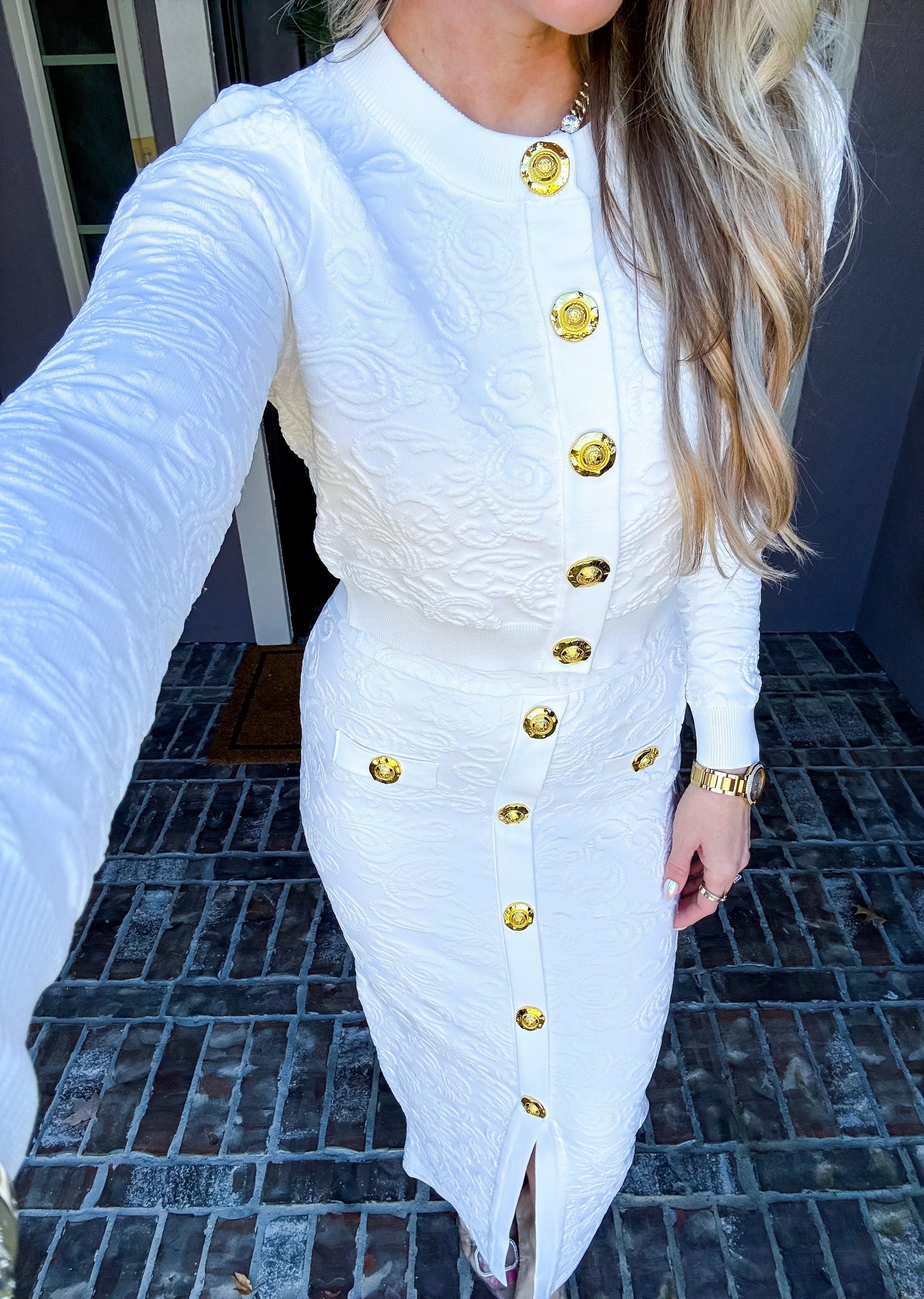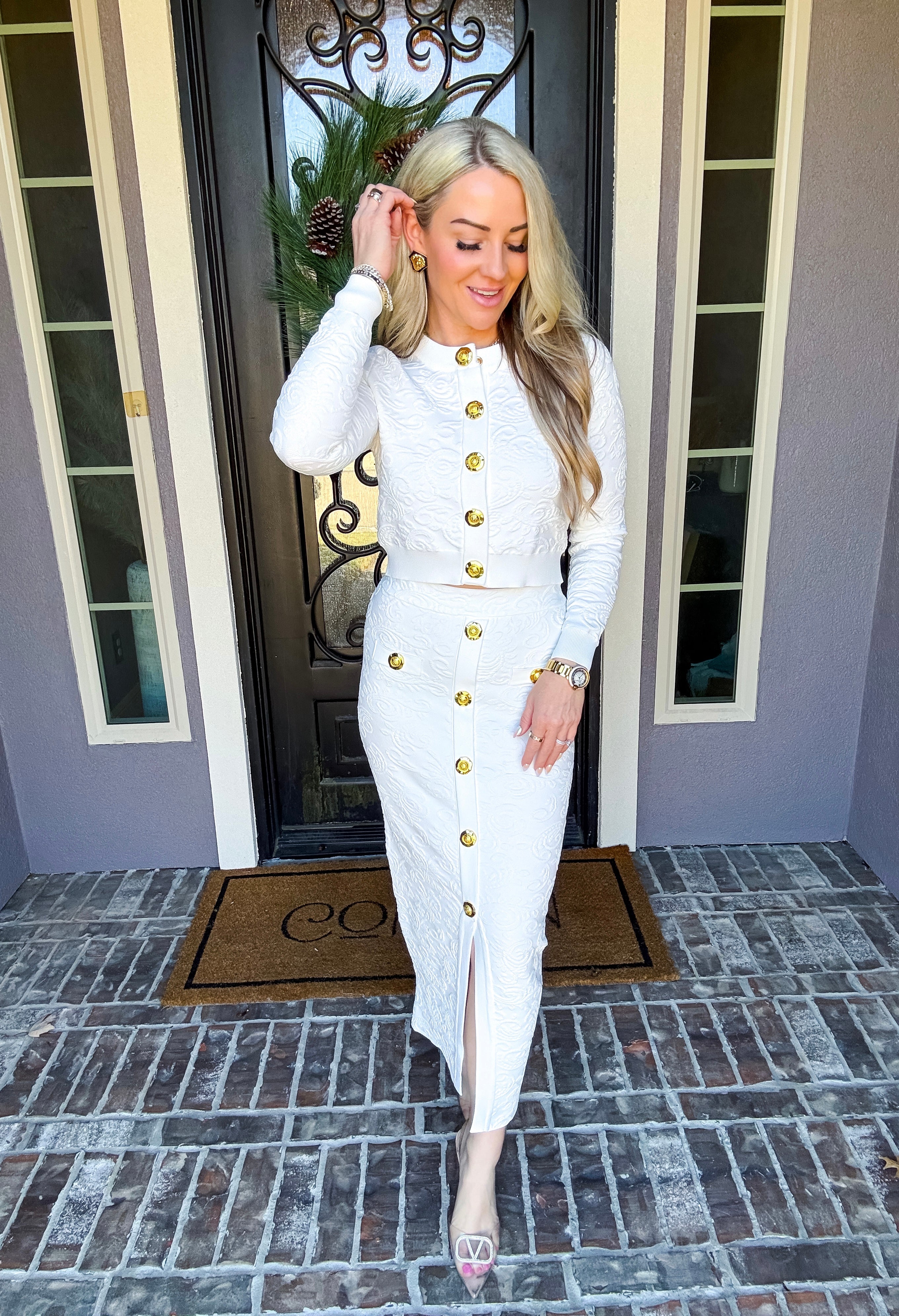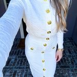 Turn heads in this sophisticated stretch skirt, where refined design details and lustrous faux gold buttons elevate every wear. The expertly crafted silhouette moves with you, offering both comfort and polished elegance. A statement piece that commands attention and delivers the compliments you deserve.