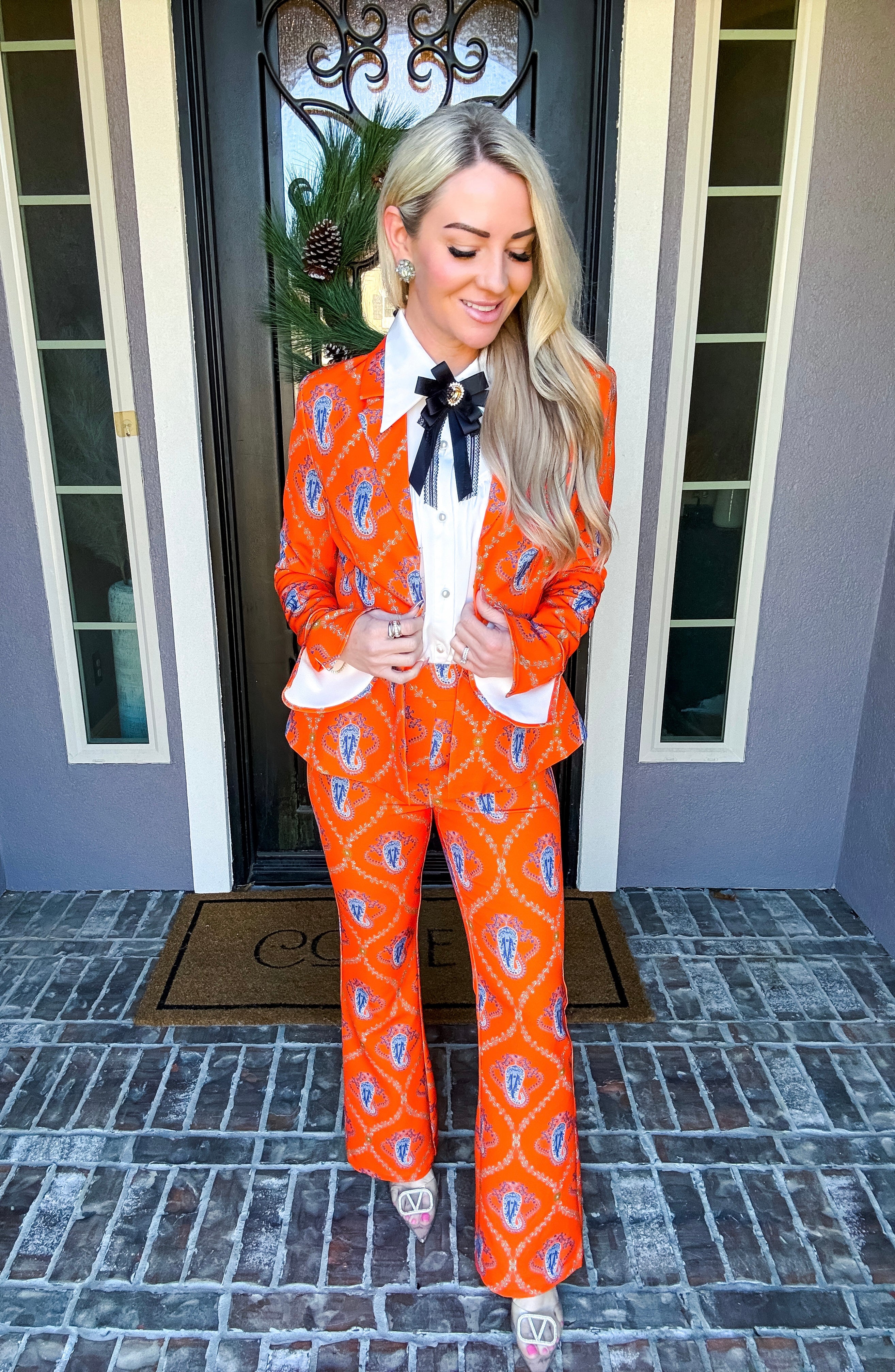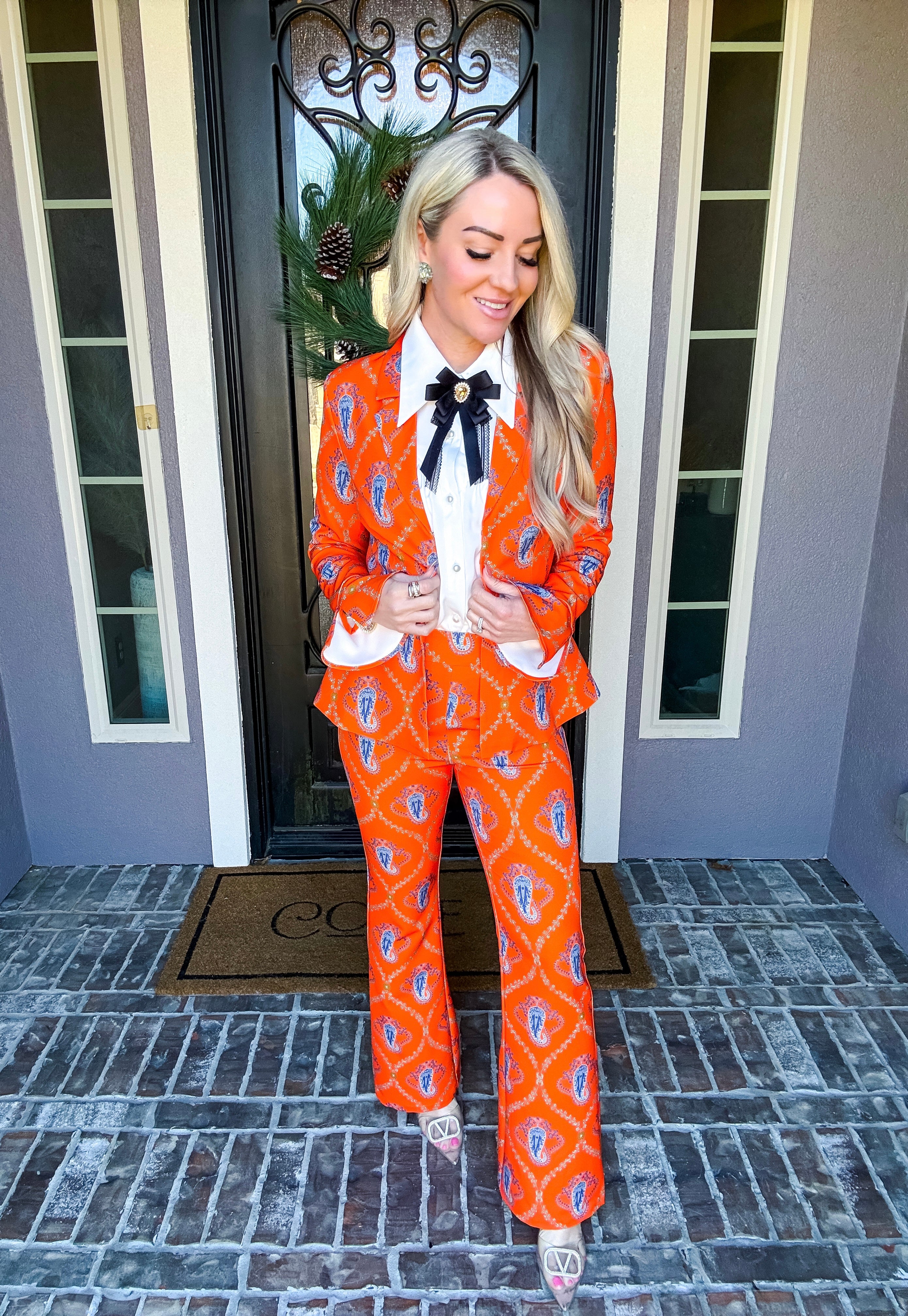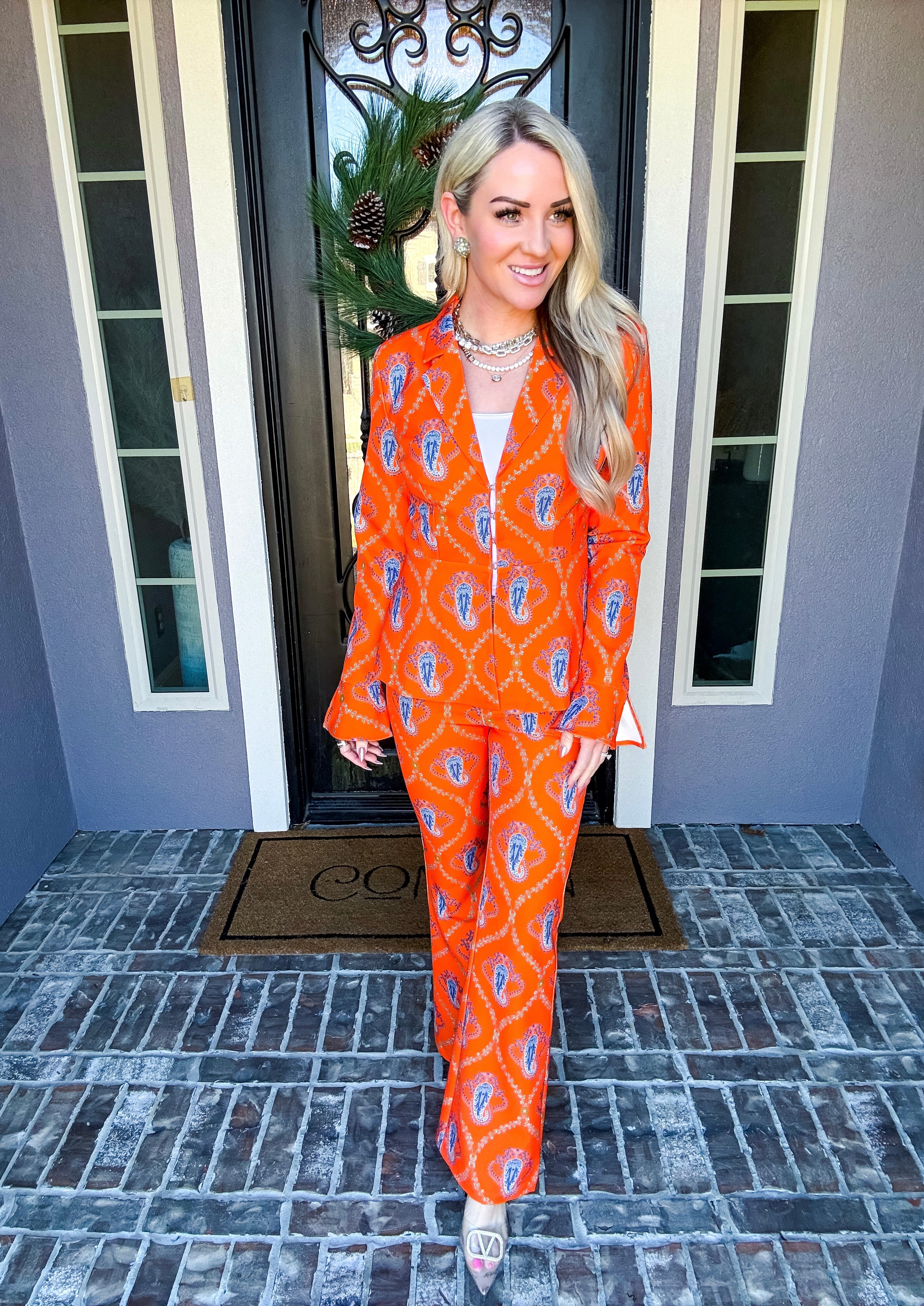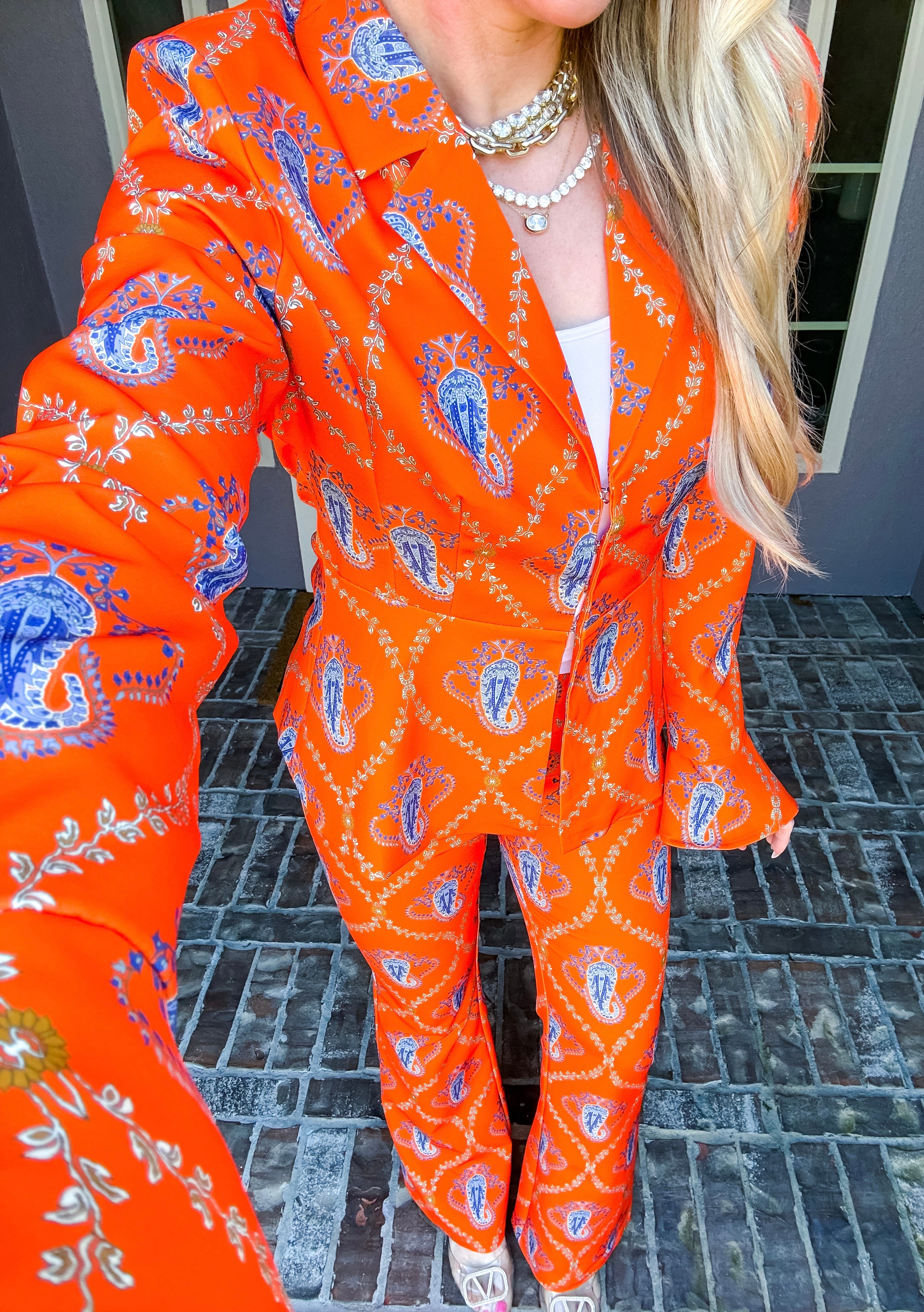 Monte Carlo Muse Paisley Trousers deliver a striking silhouette with their eye-catching paisley pattern and impeccable tailoring. Designed for the discerning dresser, these trousers feature a discreet back zip closure and a subtle flare at the hem that elongates the leg. The structured, non-stretch fabric ensures a polished drape and refined fit. Pair with the matching blazer to create a sophisticated, head-turning ensemble that commands attention.