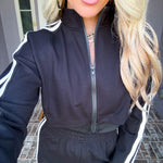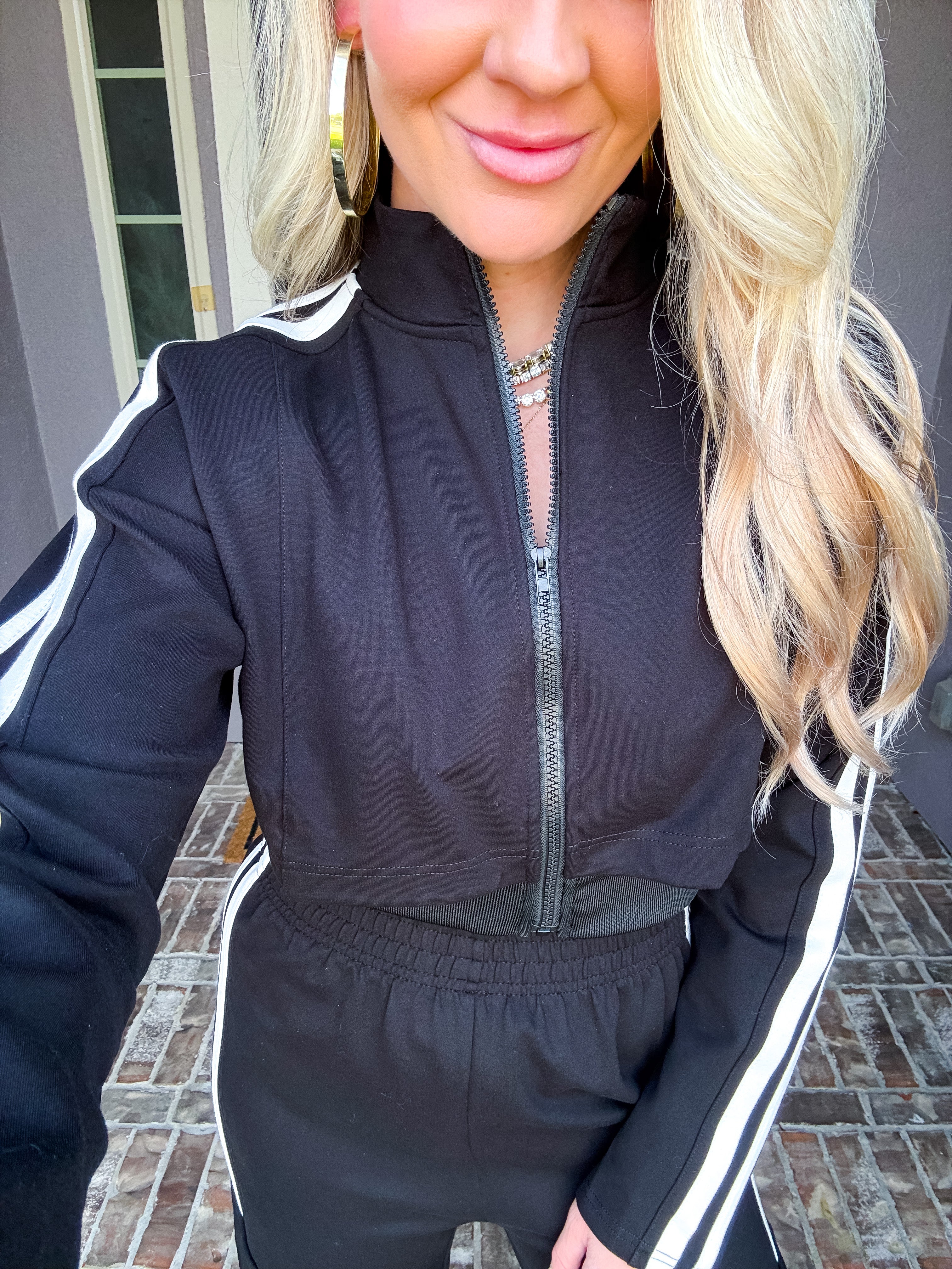 Effortlessly transition from errands to everyday moments in this stunning black track jacket. The front zip design offers quick, convenient layering while premium comfort ensures you stay relaxed throughout your day. Crafted for those who refuse to compromise between style and ease, this jacket delivers polished sophistication without sacrificing the comfort you deserve. Perfect for running around town while looking put-together.