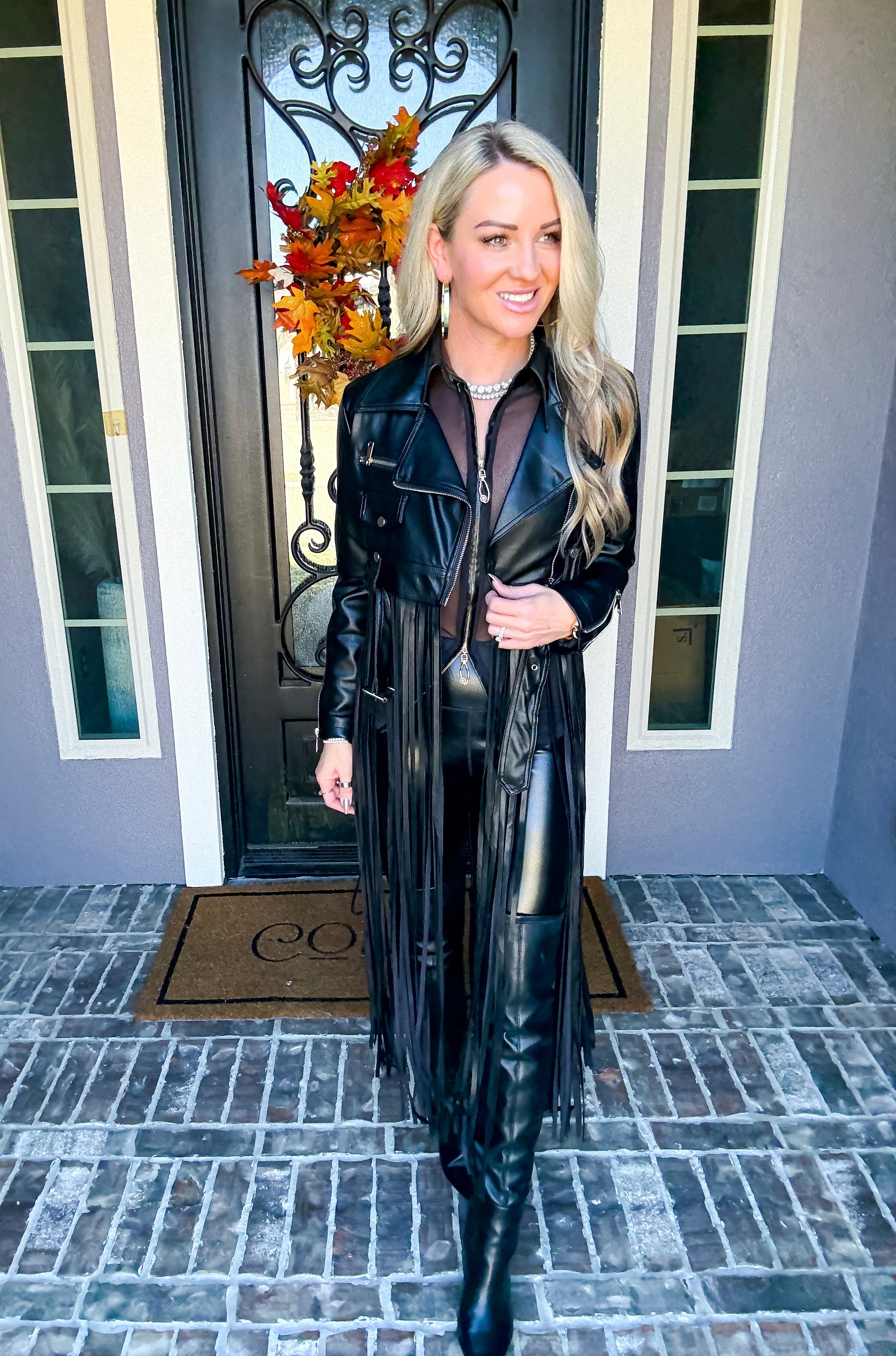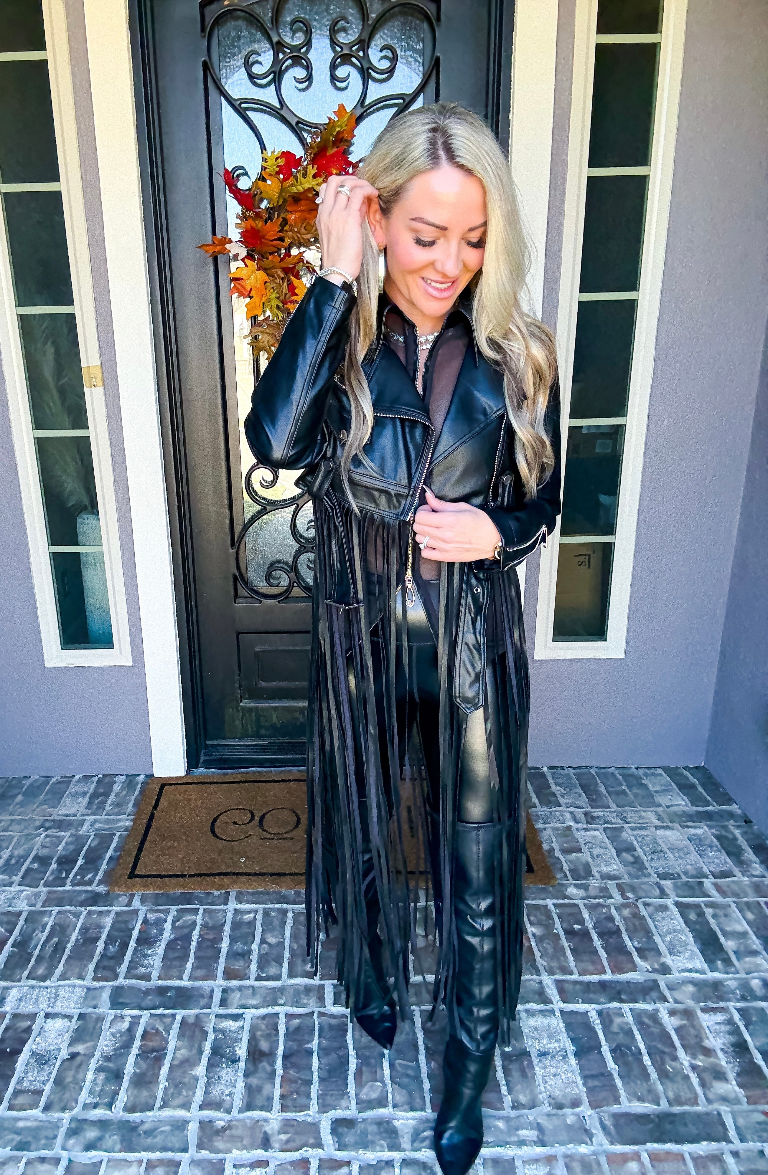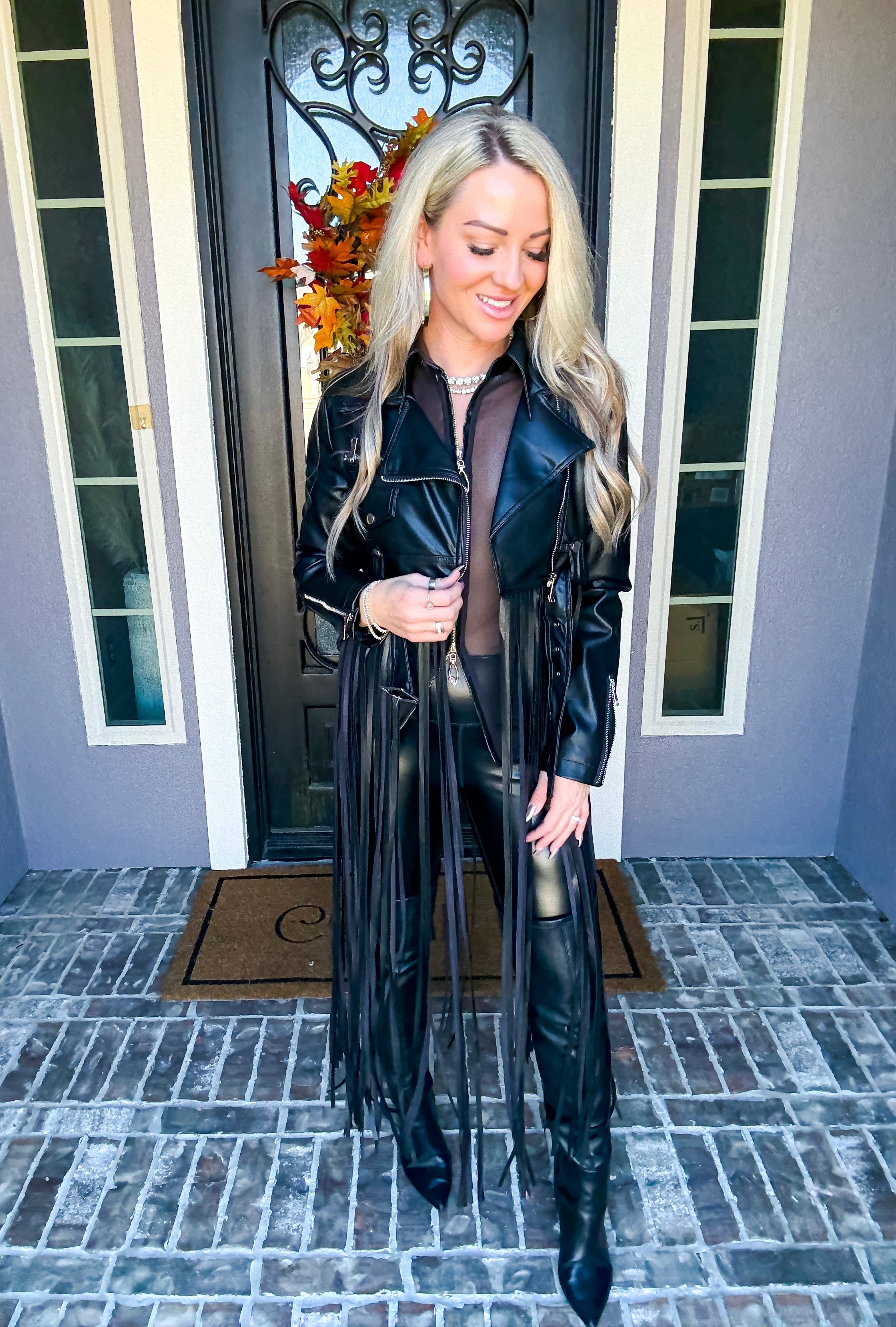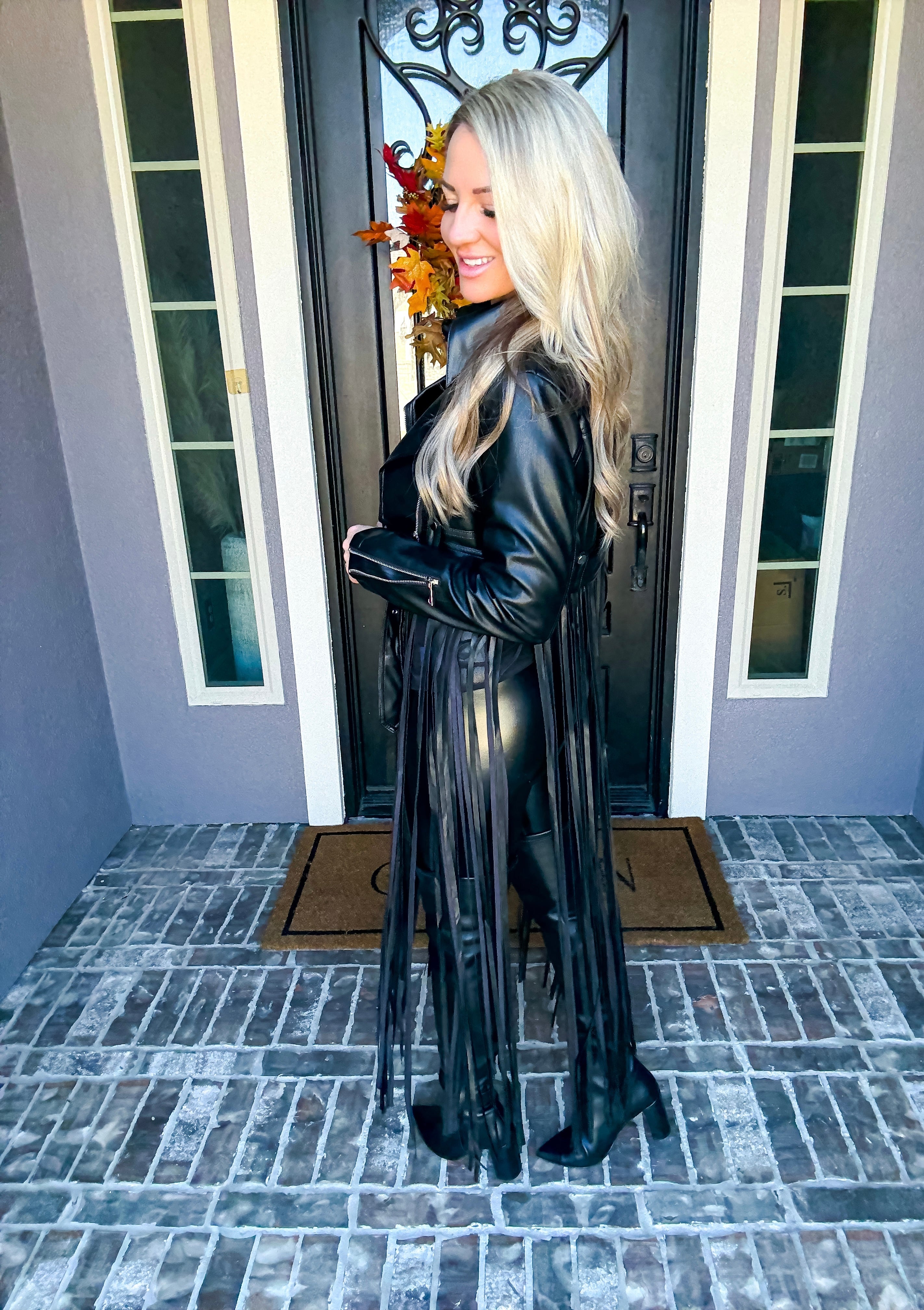 Crafted from premium vegan leather, the Runway Rebel Fringe Leather Jacket combines sustainable luxury with bold design. Its dramatic fringe cascading to the ground creates a striking silhouette, perfect for making a powerful fashion statement. This jacket delivers both ethical sophistication and standout style for those who dare to lead the trend.