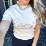 Celebrate in style with this charming rhinestone-embellished sweater top. Featuring the word "Cheers" spelled out in sparkling rhinestones, this piece combines playful elegance with everyday comfort. The stretchy, ultra-soft fabric moves with you, making it perfect for casual outings, festive gatherings, or cozy nights in. A versatile wardrobe essential that brings a touch of sparkle to any look.