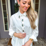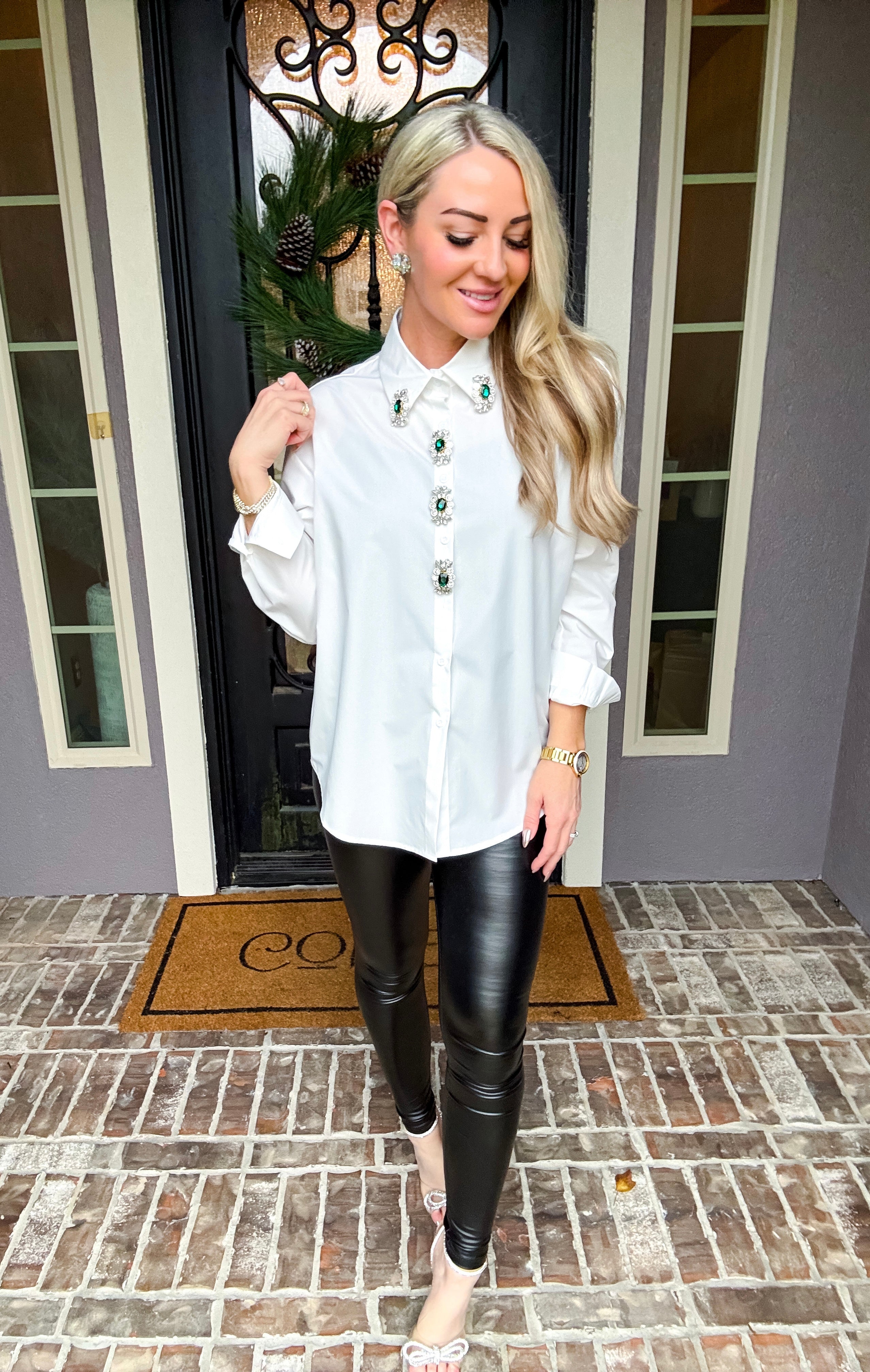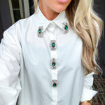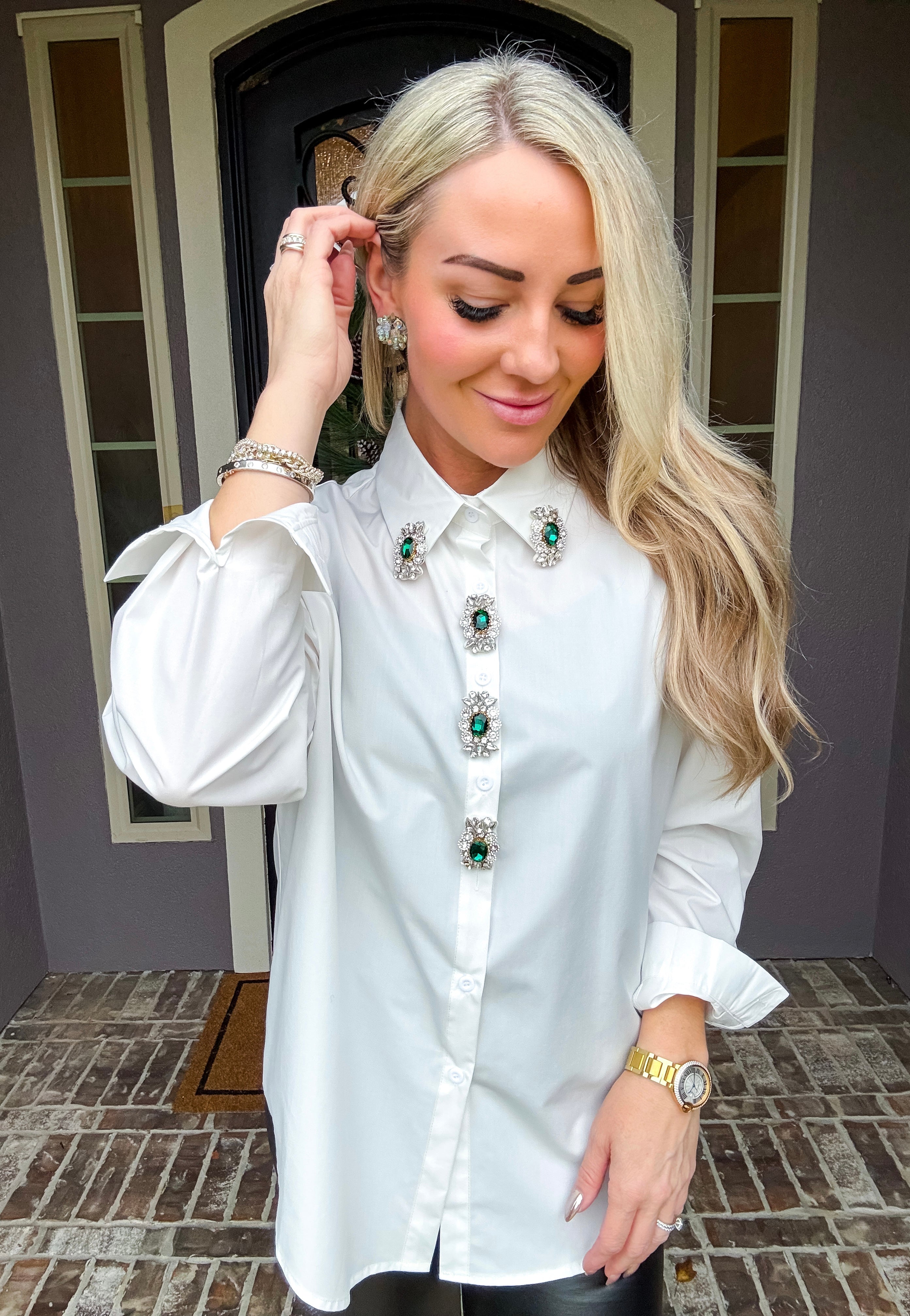 Elevate your evening wardrobe with the Crystal Eve Emerald Stone Blouse, a sophisticated piece that commands attention. Adorned with stunning emerald-inspired jewels cascading across the front, this blouse transforms a classic silhouette into a statement-making essential. Perfect for special occasions or when you want to add refined glamour to your everyday look, the intricate stone detailing catches light beautifully while maintaining an air of understated elegance. A versatile investment piece that pairs effortlessly with tailored trousers or evening skirts.