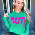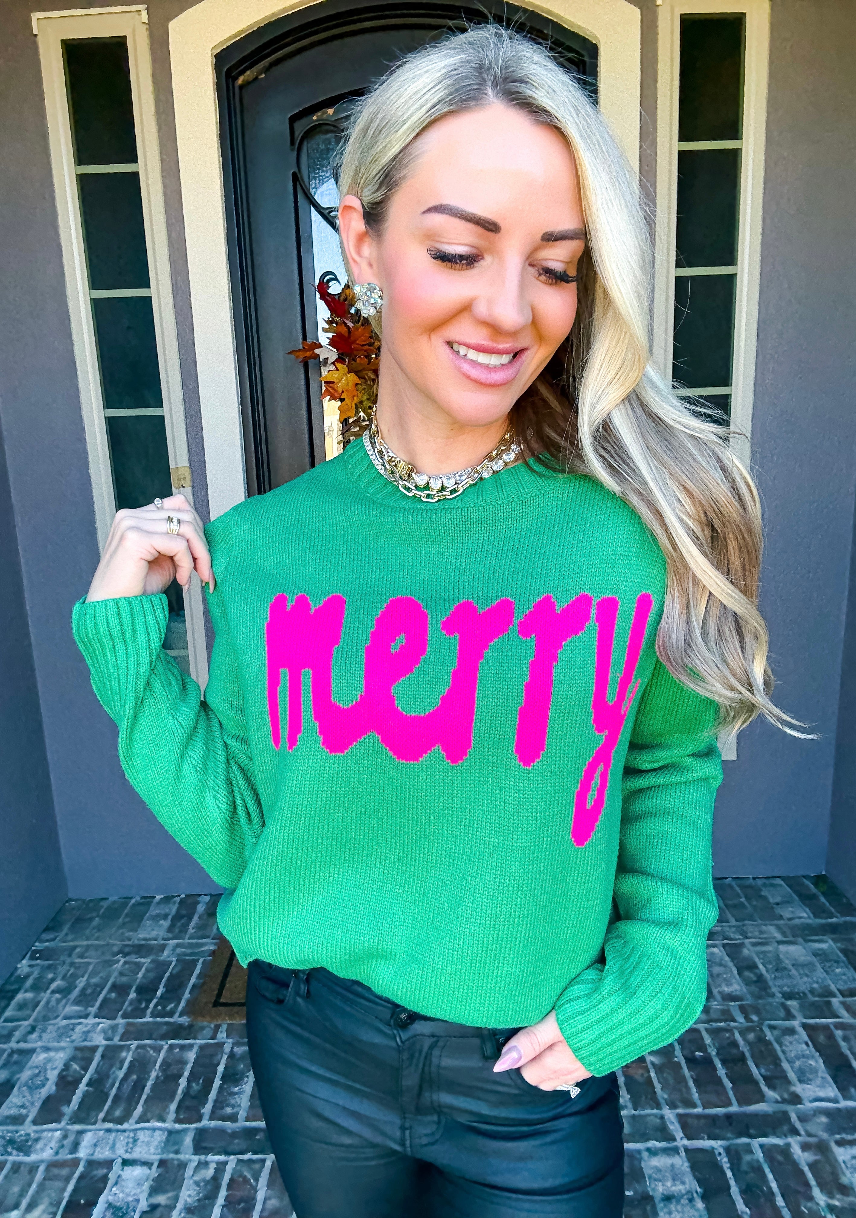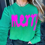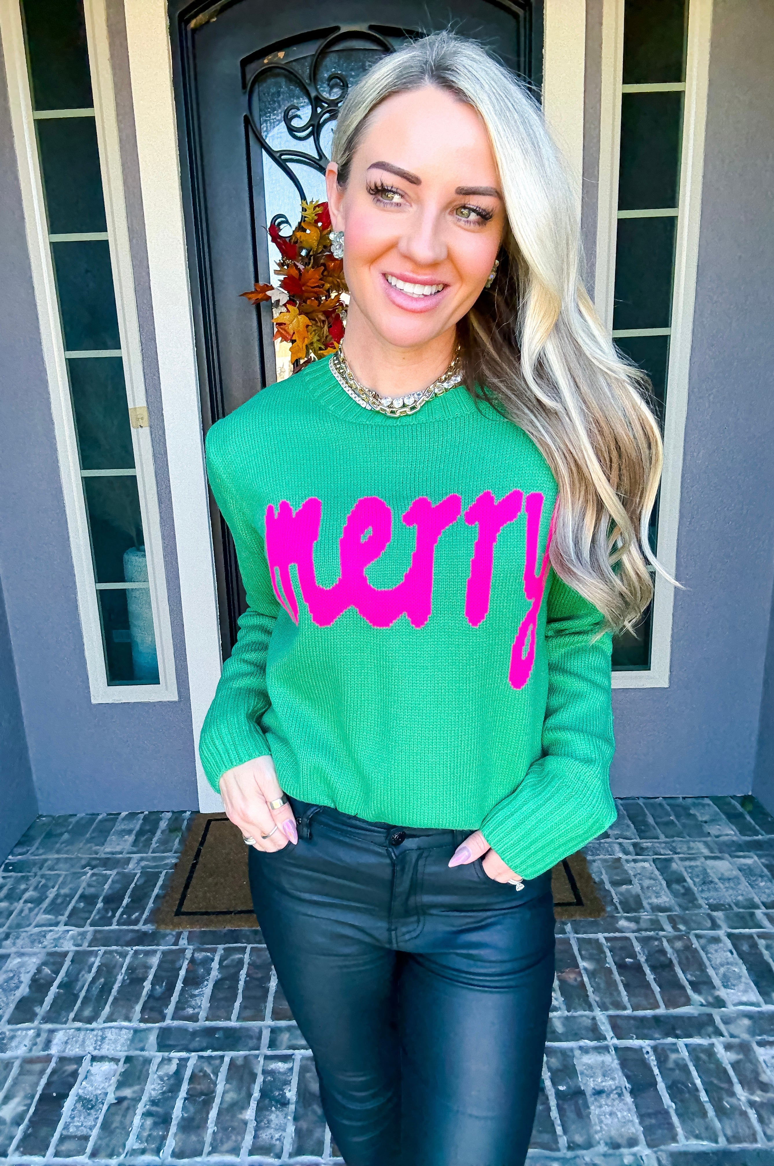Celebrate the season in style with this charming green merry sweater, a customer favorite that combines festive spirit with everyday comfort. The rich green knit serves as the perfect canvas for eye-catching pink lettering that adds a playful, modern twist to traditional holiday wear. Whether you're heading to a seasonal gathering or keeping things cozy at home, this sweater delivers warmth and personality in one adorable package. A bestseller for good reason—it's the effortless way to spread cheer while looking undeniably cute.
