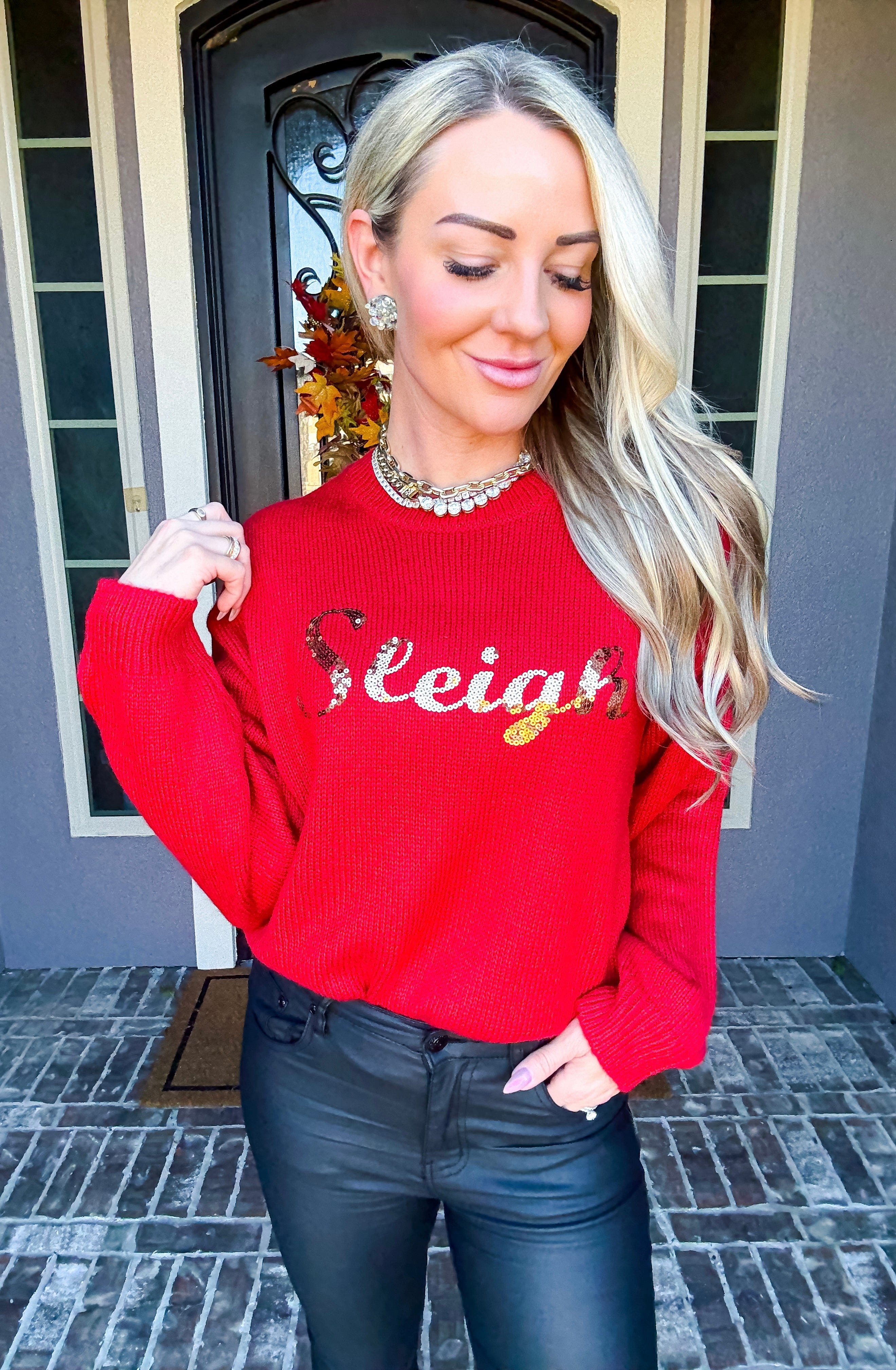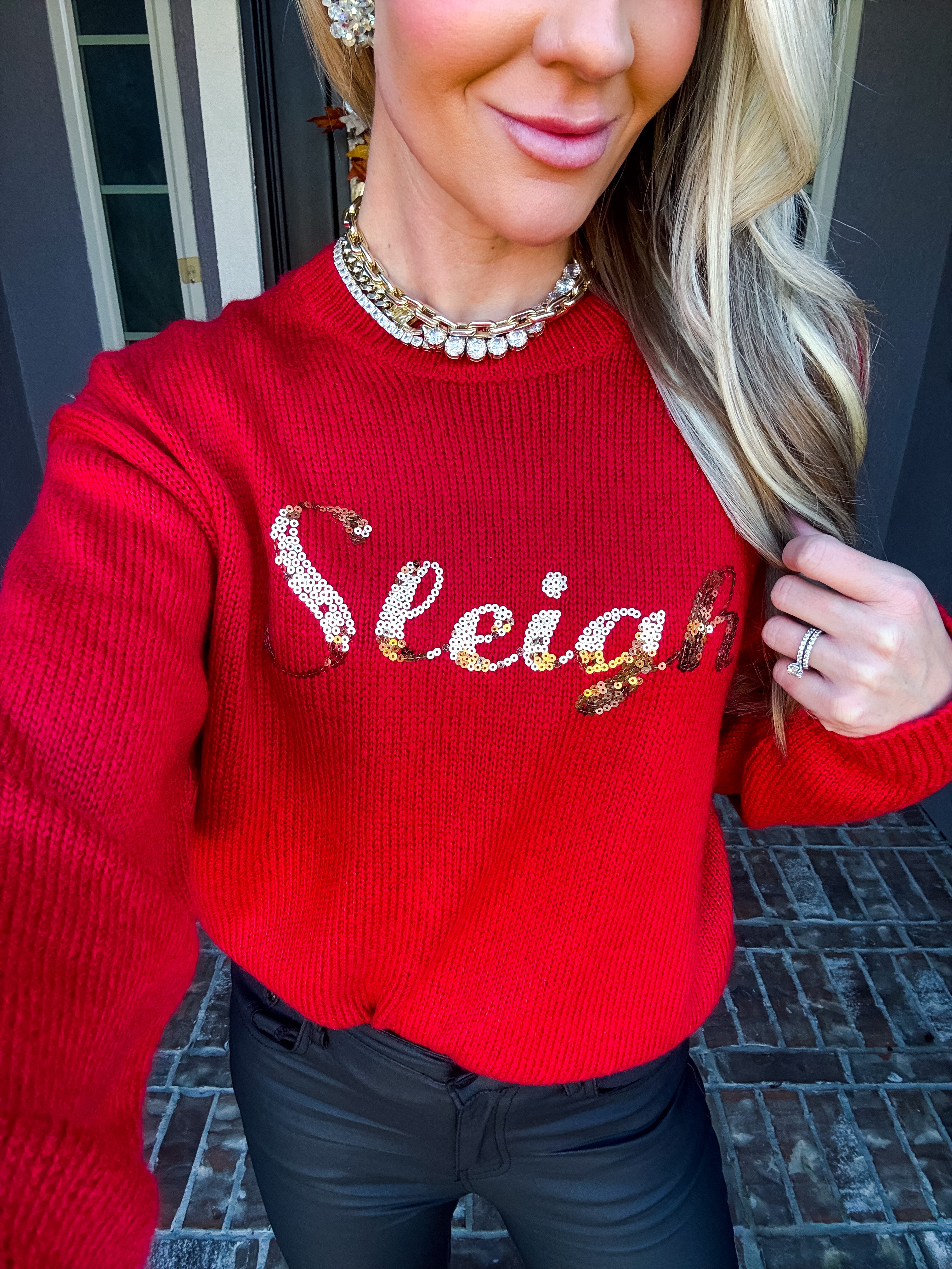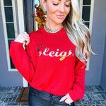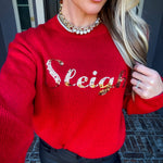 Elevate your holiday wardrobe with this striking red sweater, adorned with "SLEIGH" emblazoned in shimmering gold sequins. The eye-catching design captures the spirit of the season while maintaining sophisticated appeal. Perfect for festive gatherings, casual celebrations, or anyone seeking to add a touch of seasonal cheer to their everyday style. This sweater seamlessly blends playful holiday charm with polished elegance, making it an essential piece for the winter months ahead.