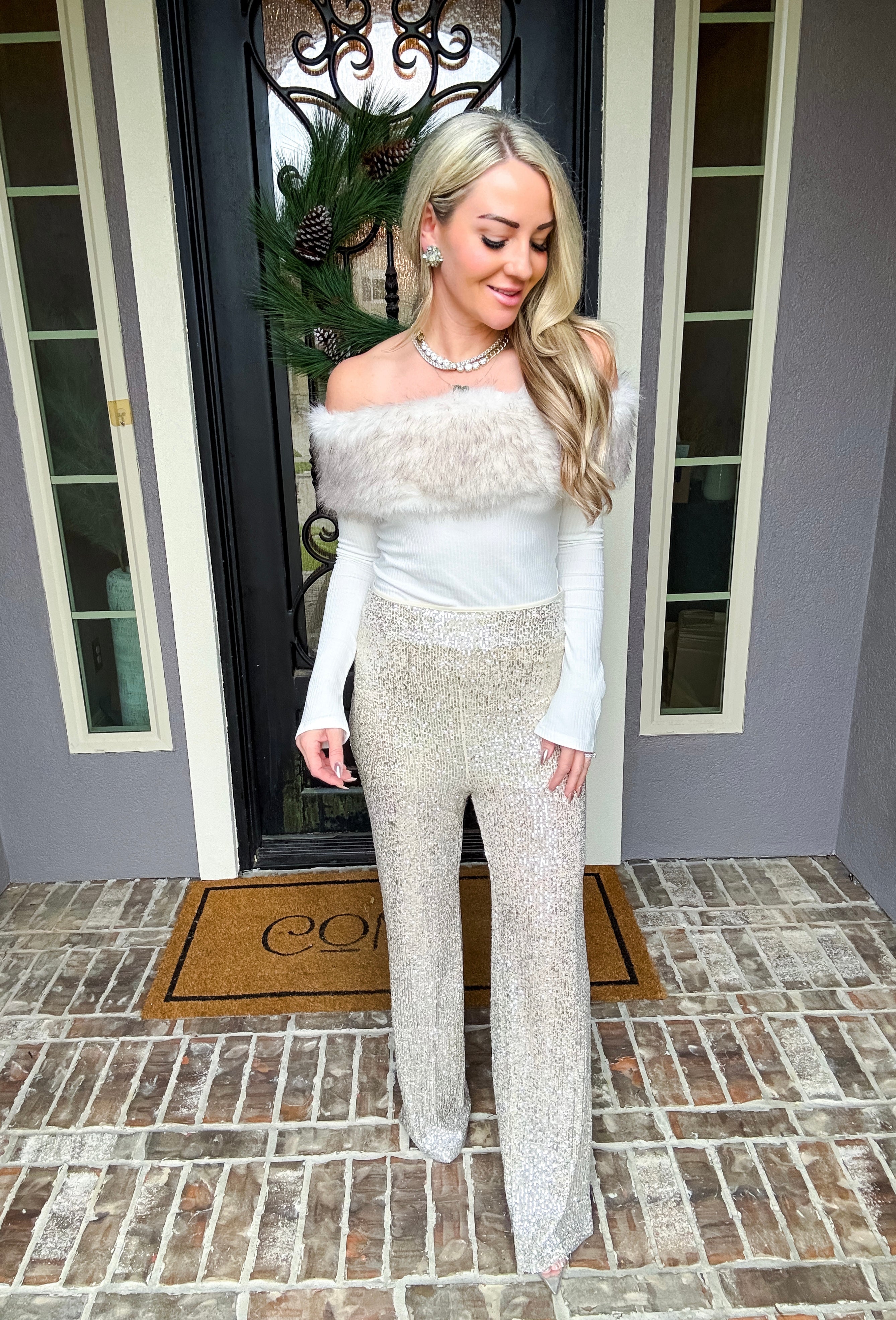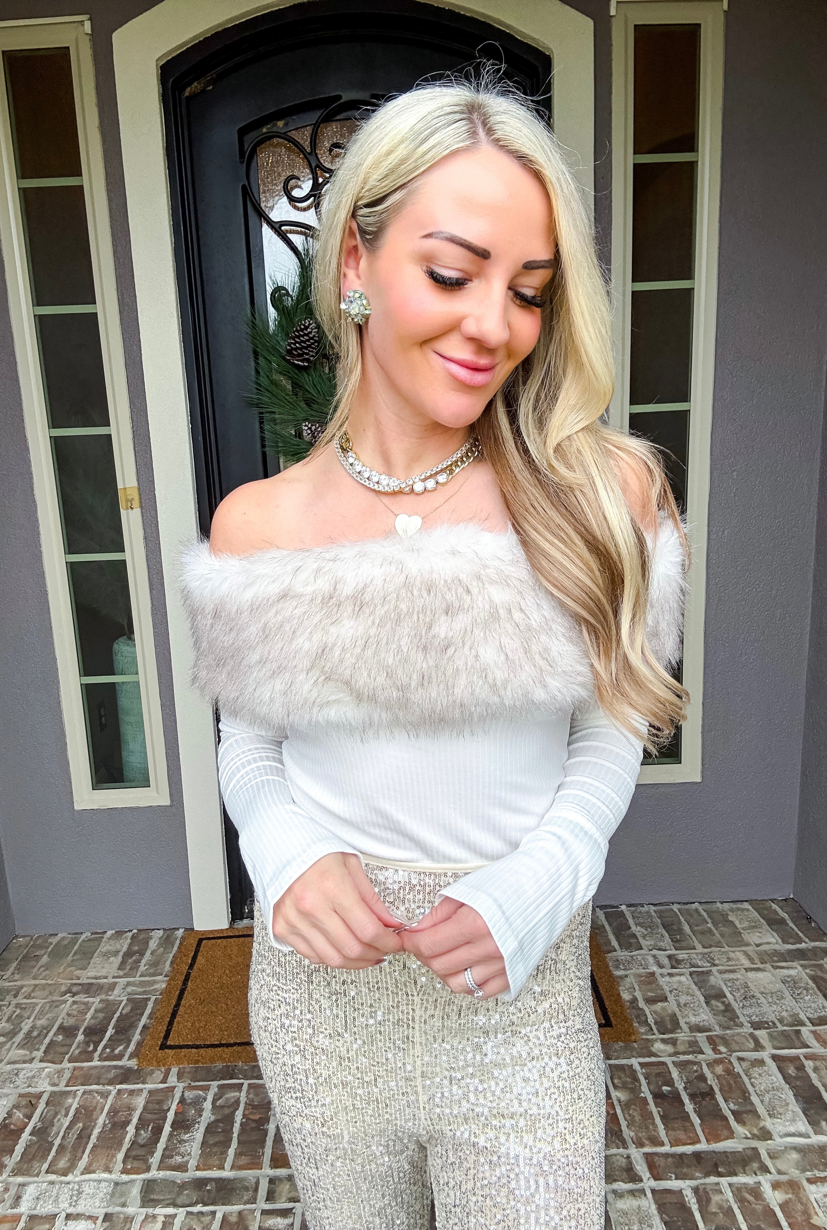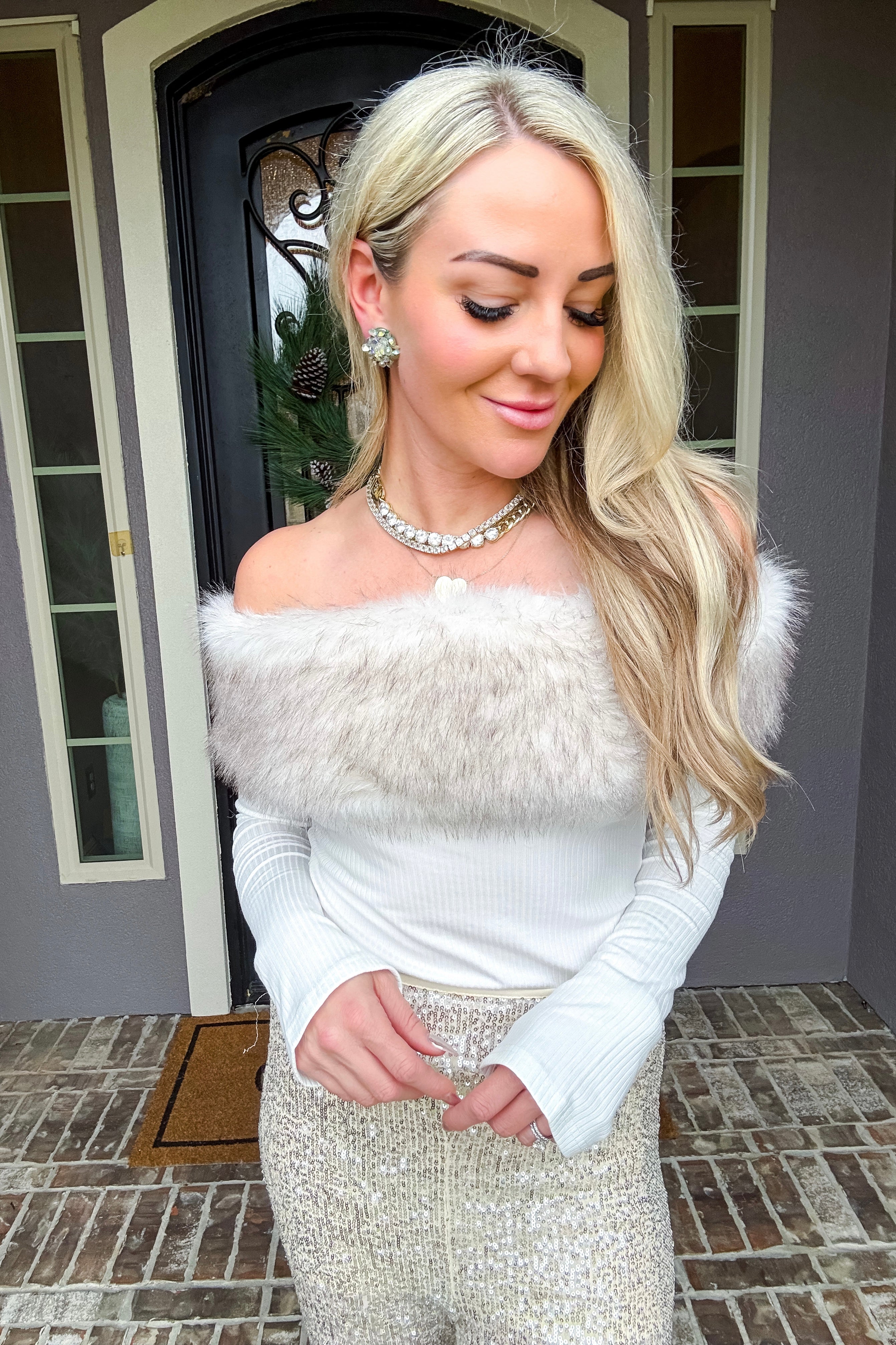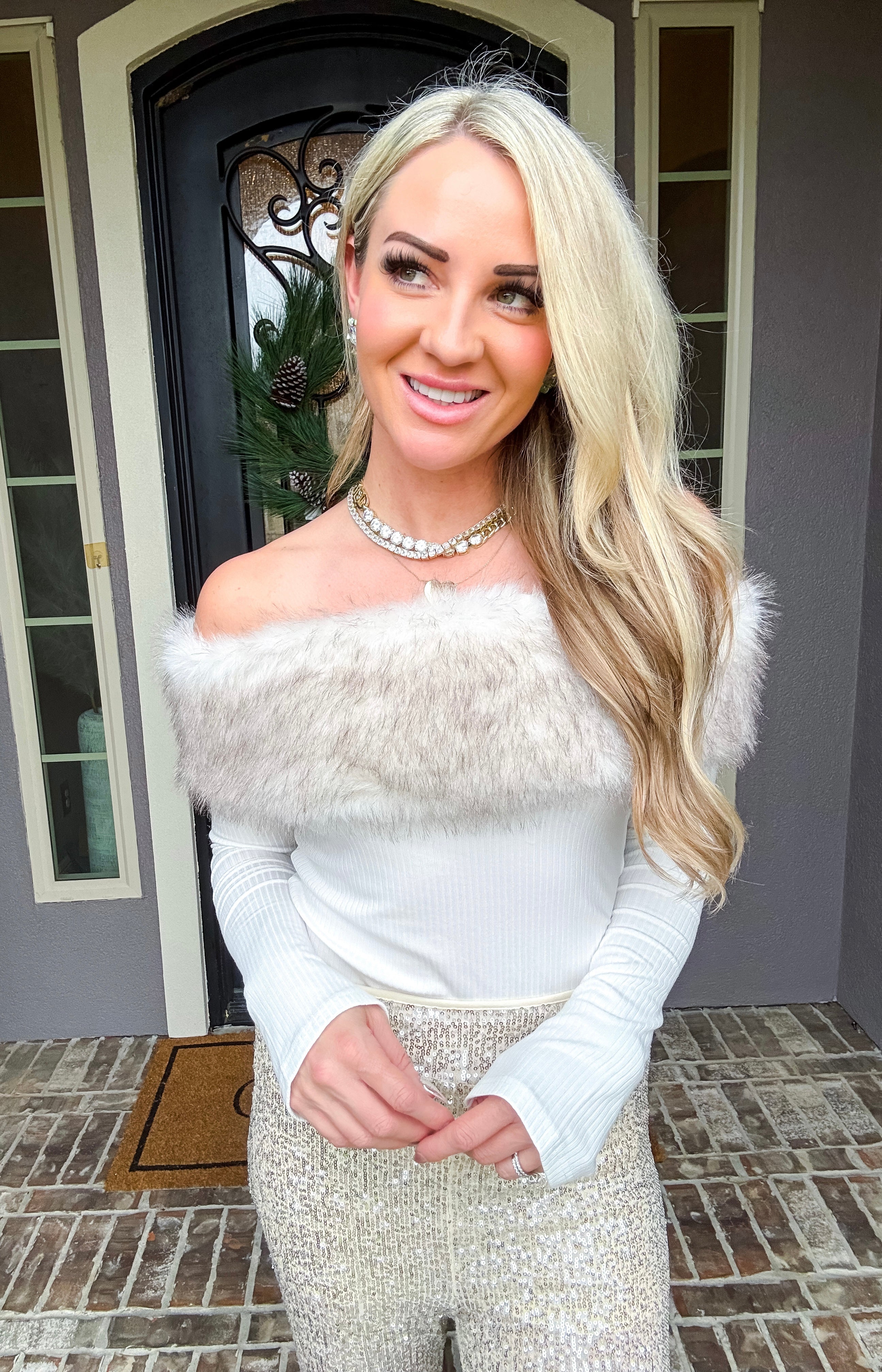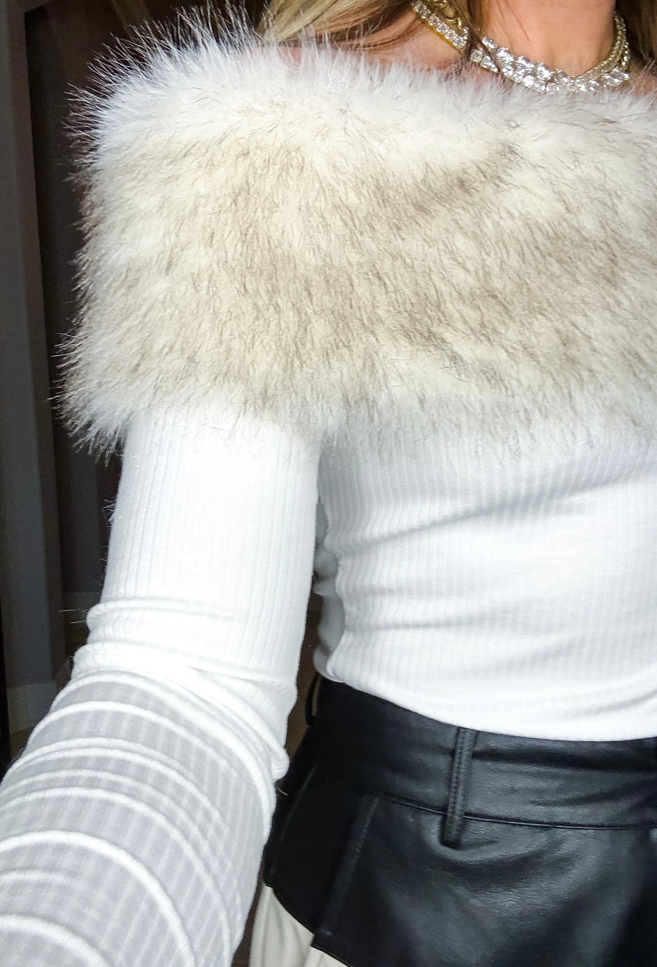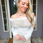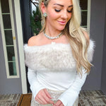 Snow Bunny Fur Detail Top Elevate your winter wardrobe with this striking asymmetrical top, designed to turn heads. The off-shoulder neckline is adorned with luxurious faux fur detailing that adds texture and sophistication. Crafted from stretchy fabric, this piece moves with you while maintaining its flattering silhouette. Perfect for holiday gatherings, nights out, or whenever you want to make a confident statement. The asymmetrical cut ensures a modern, fashion-forward look that stands apart from everyday basics.