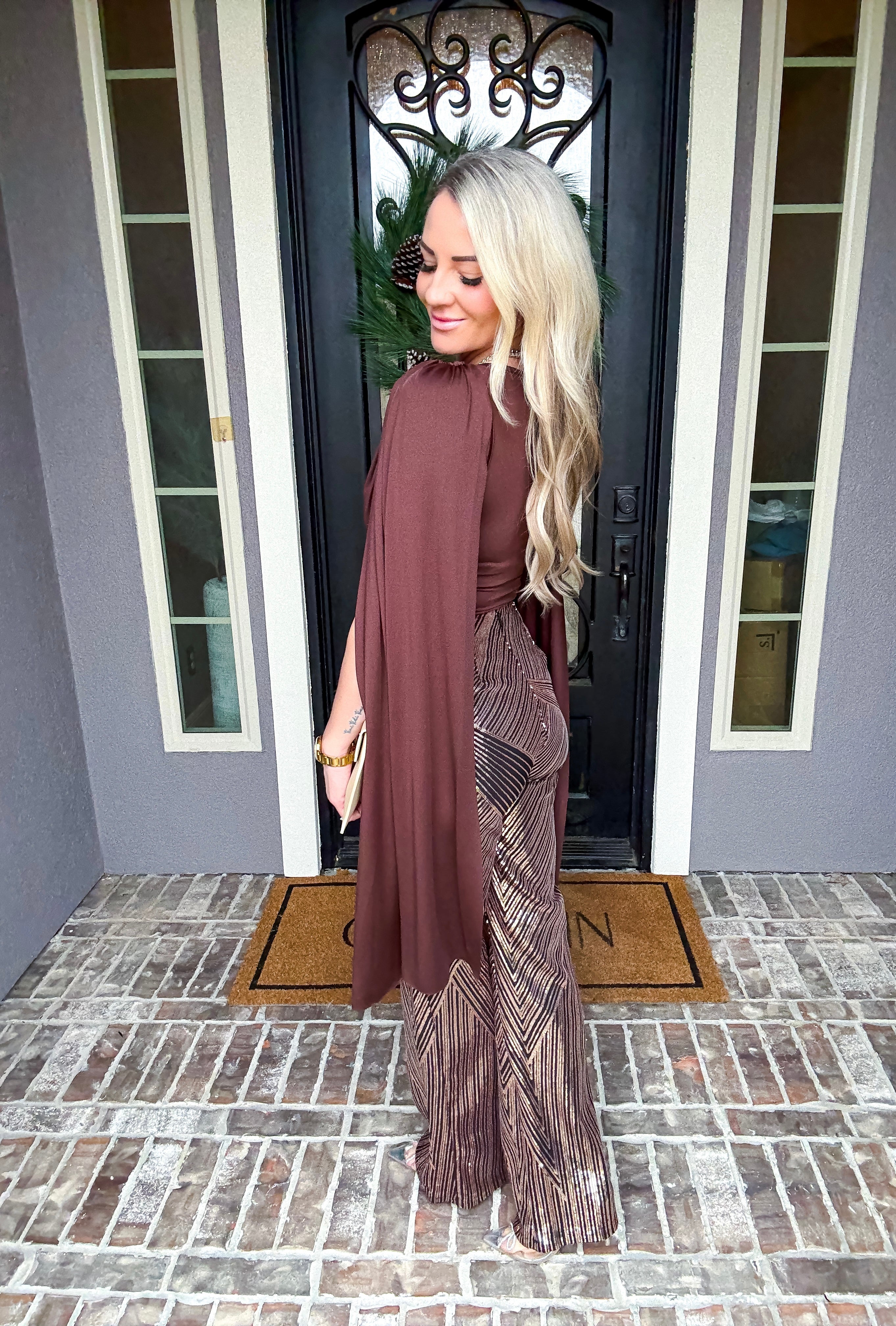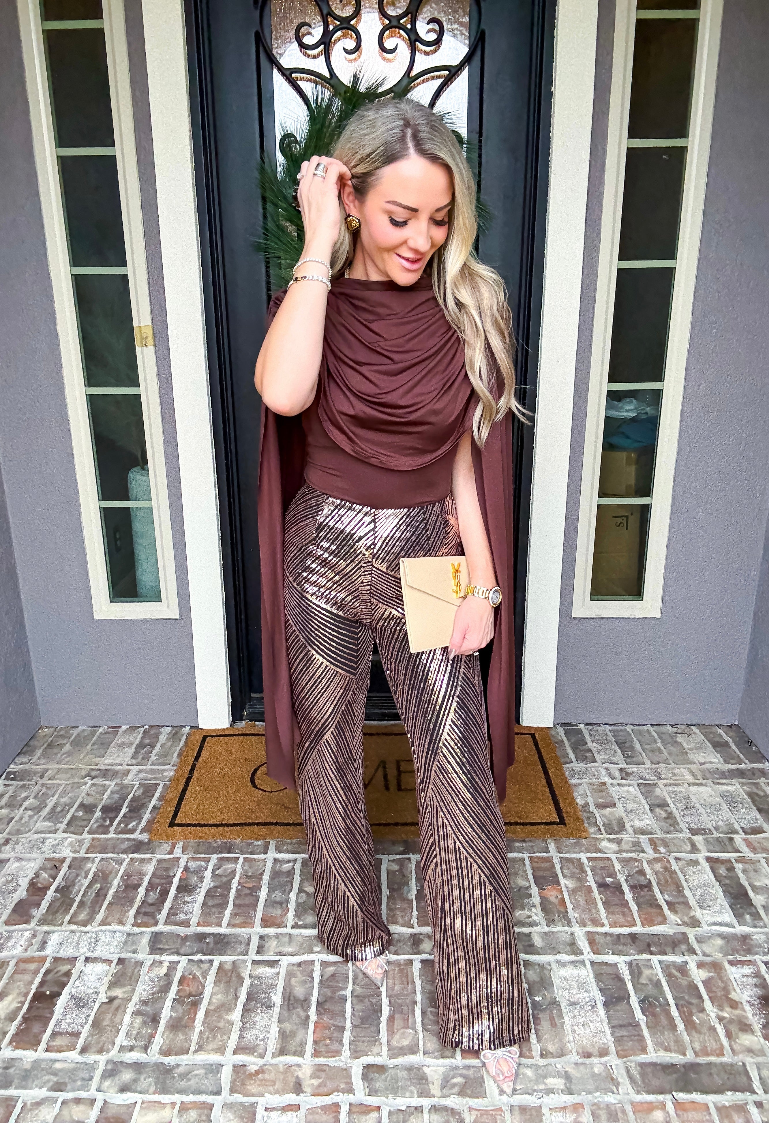 Starlit Holiday Sequin Pants deliver show-stopping glamour with all-over sequin detailing that catches light beautifully. The subtle stretch fabric ensures comfortable movement throughout the evening, while the discreet back zip provides an elegant silhouette. Designed for festive occasions and celebrations, these pants transition seamlessly from holiday parties to special events. A versatile statement piece that pairs effortlessly with simple tops to let the sequins shine.