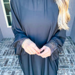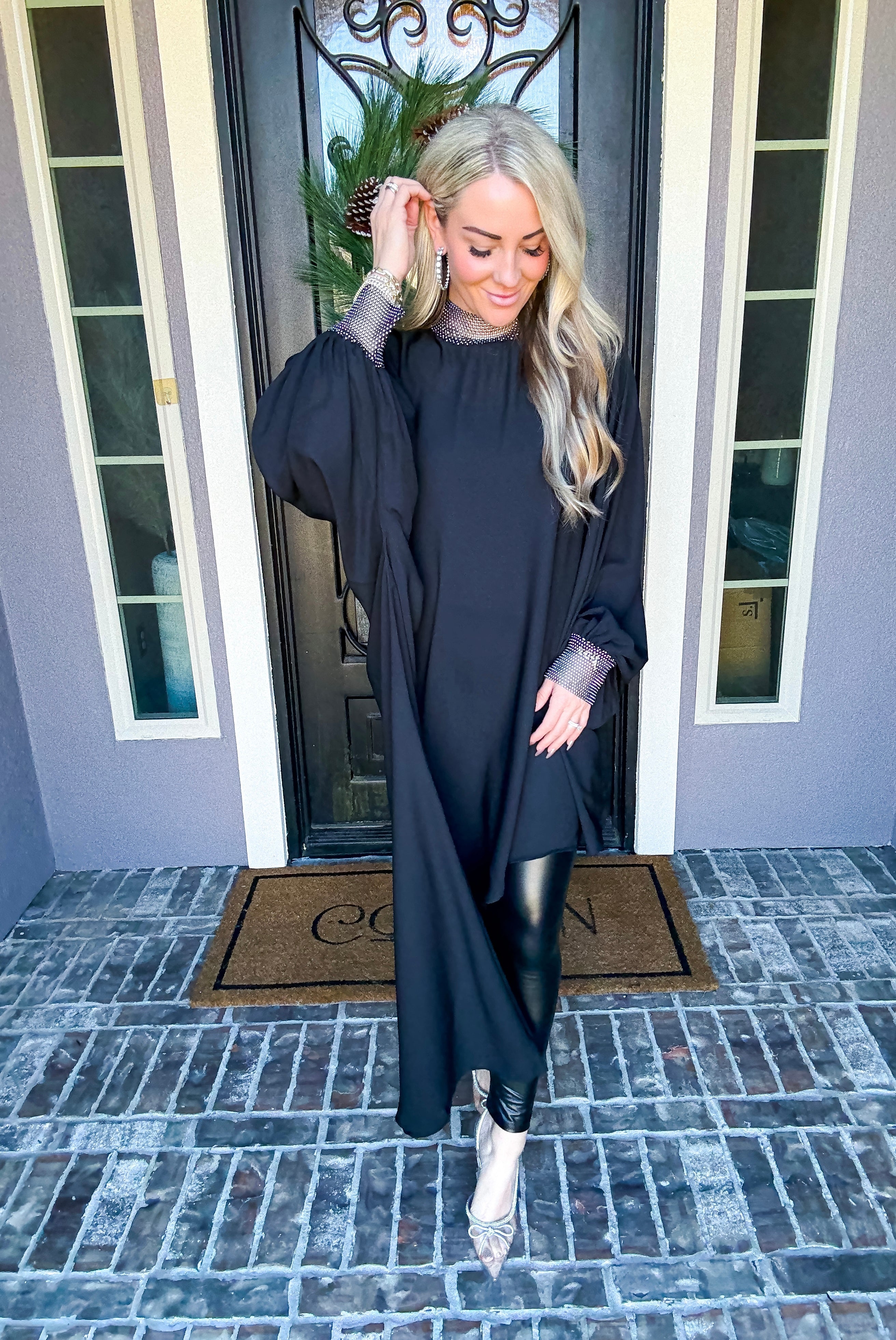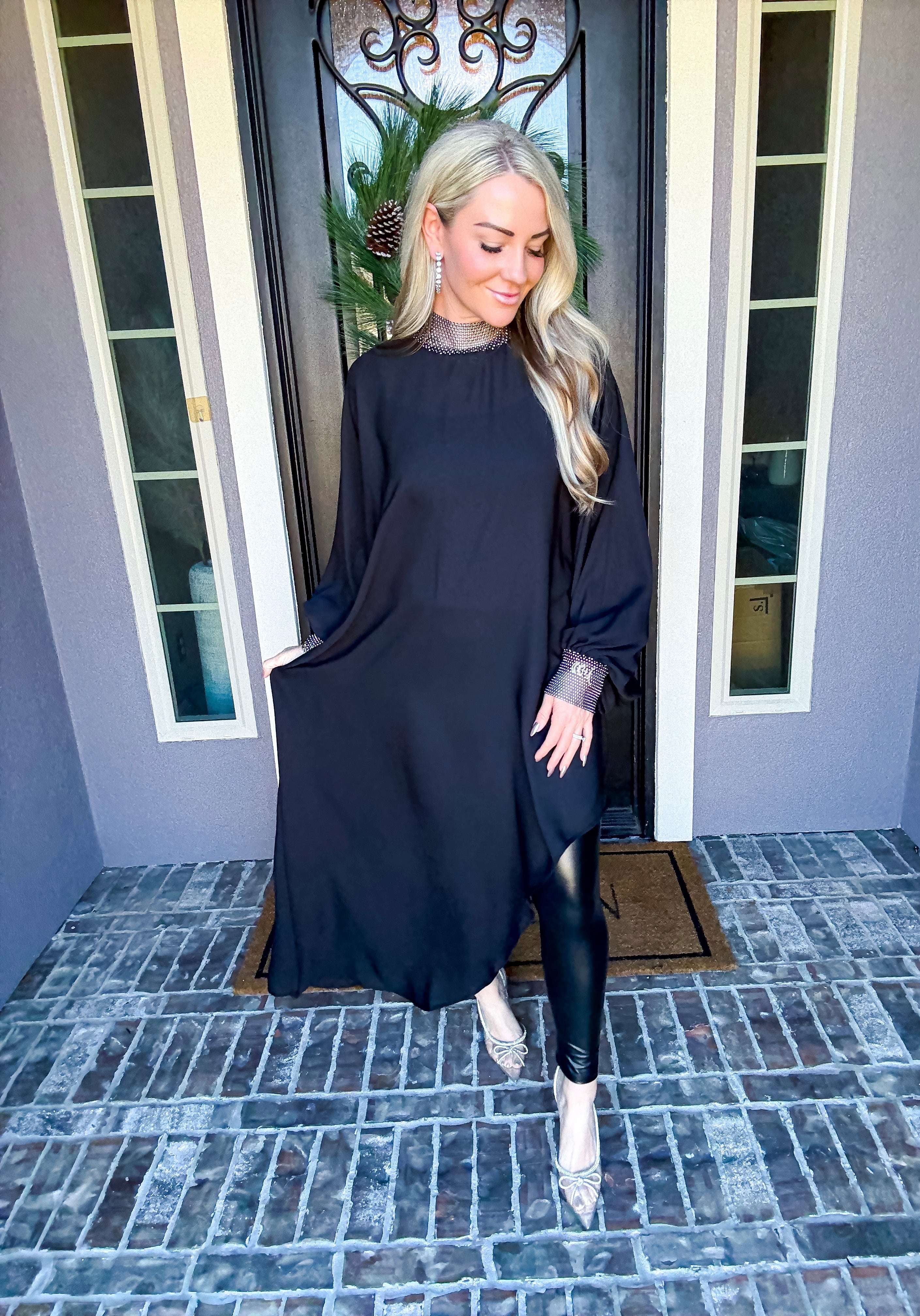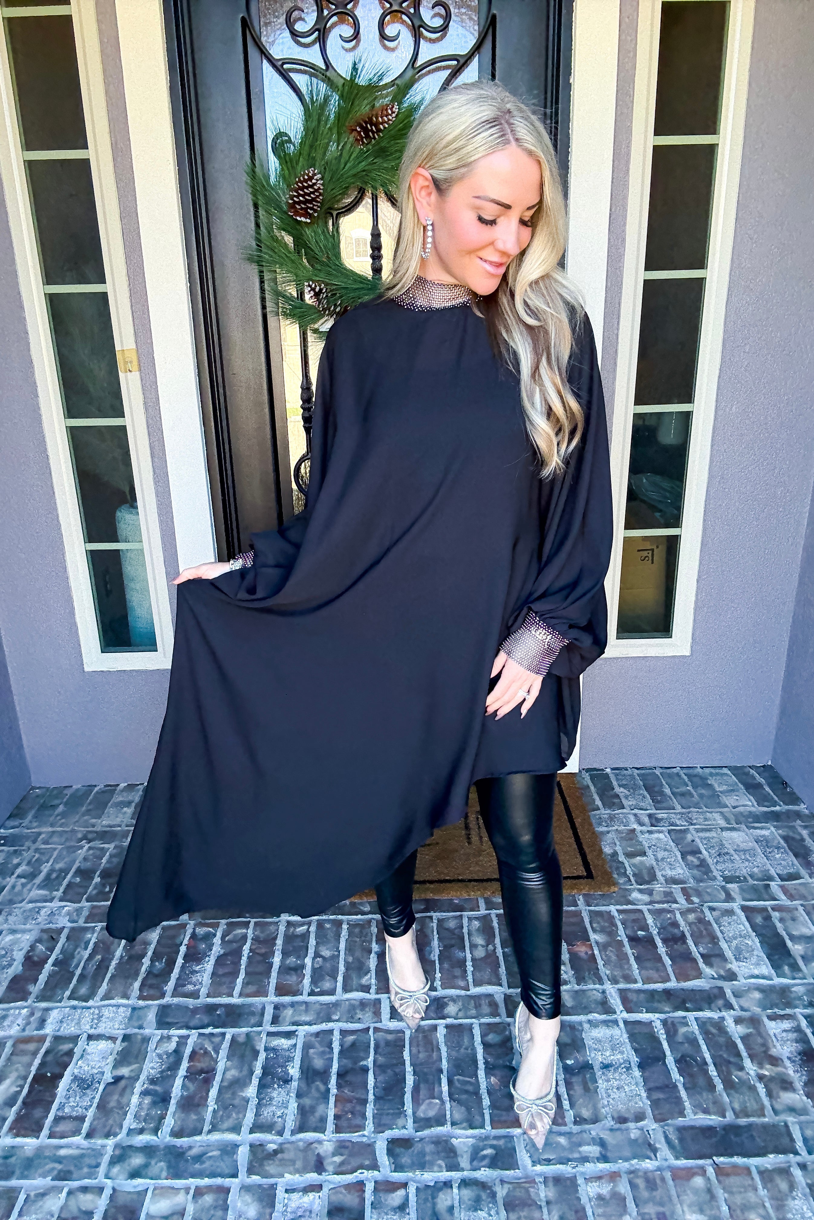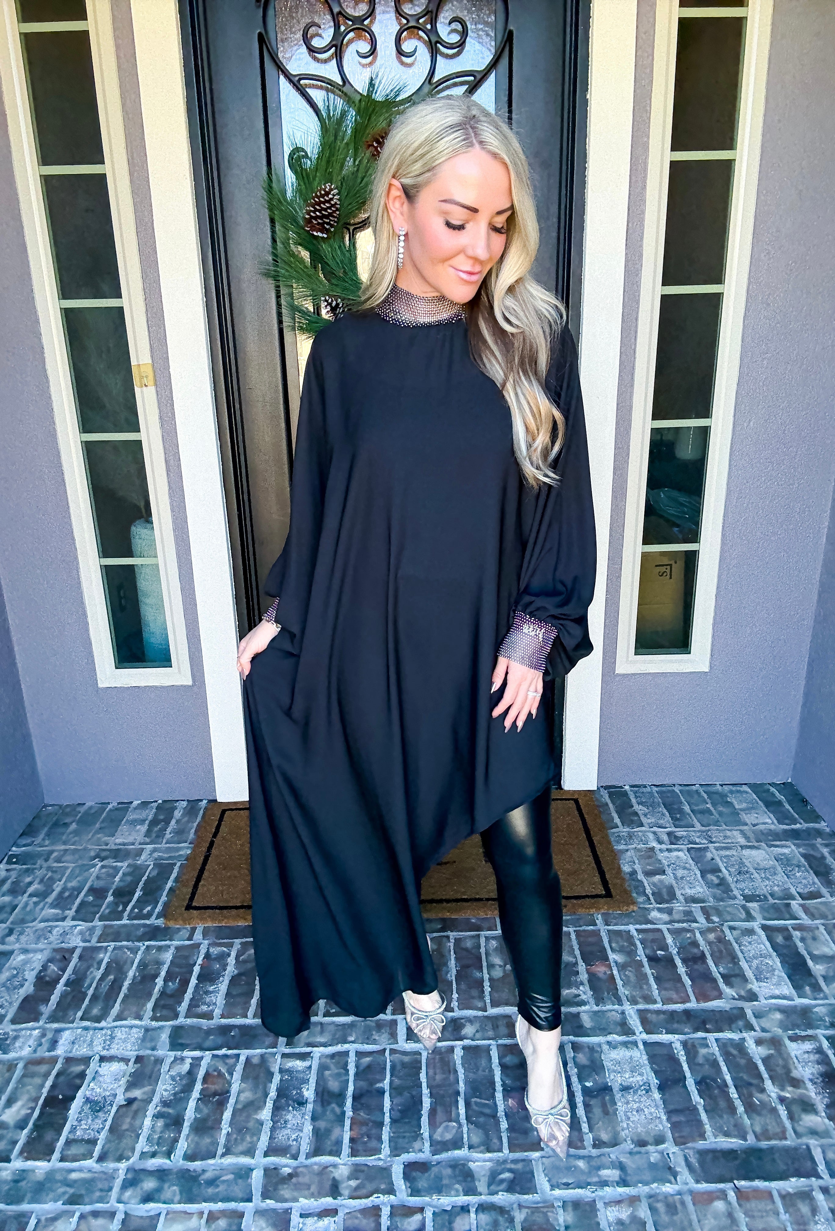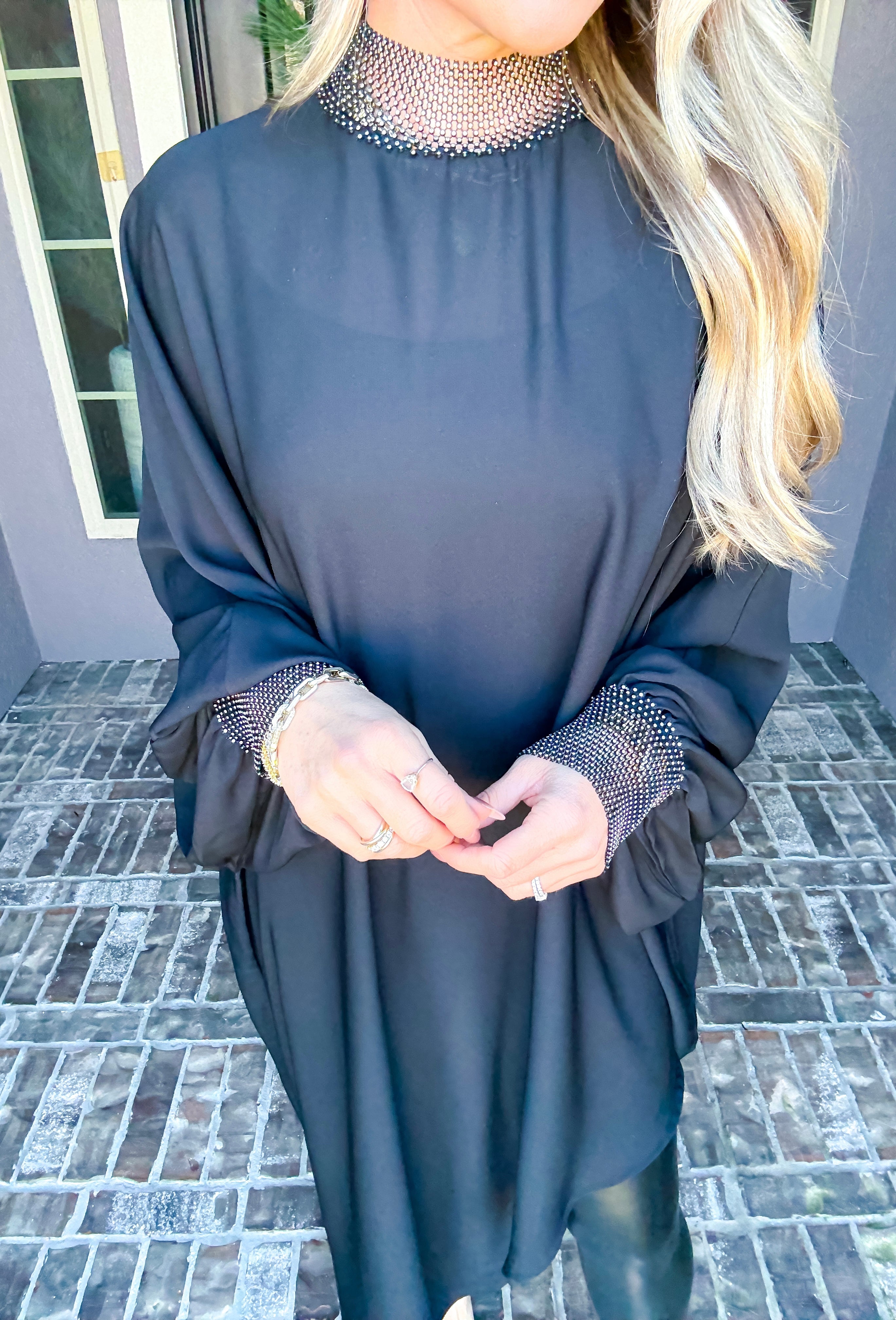 Elevate your wardrobe with this sophisticated asymmetrical top, designed for the modern woman who values both elegance and movement. The flowing silhouette drapes beautifully while jeweled embellishments at the mockneck and cuffs add a refined touch of glamour. The asymmetrical cut creates visual interest and dimension, making this piece versatile enough for elevated casual wear or polished evening occasions. A timeless investment that transitions seamlessly from day to night.