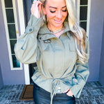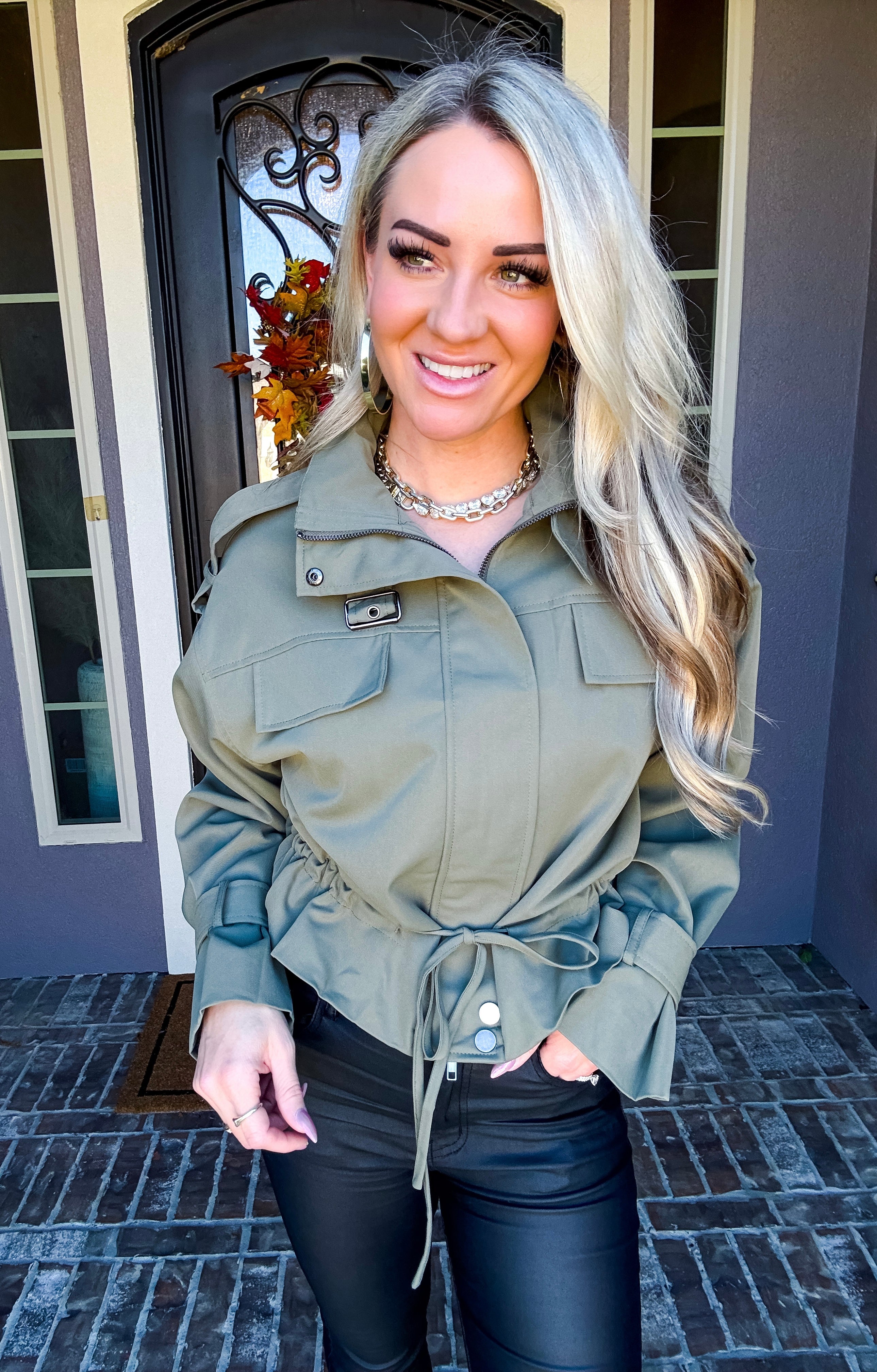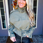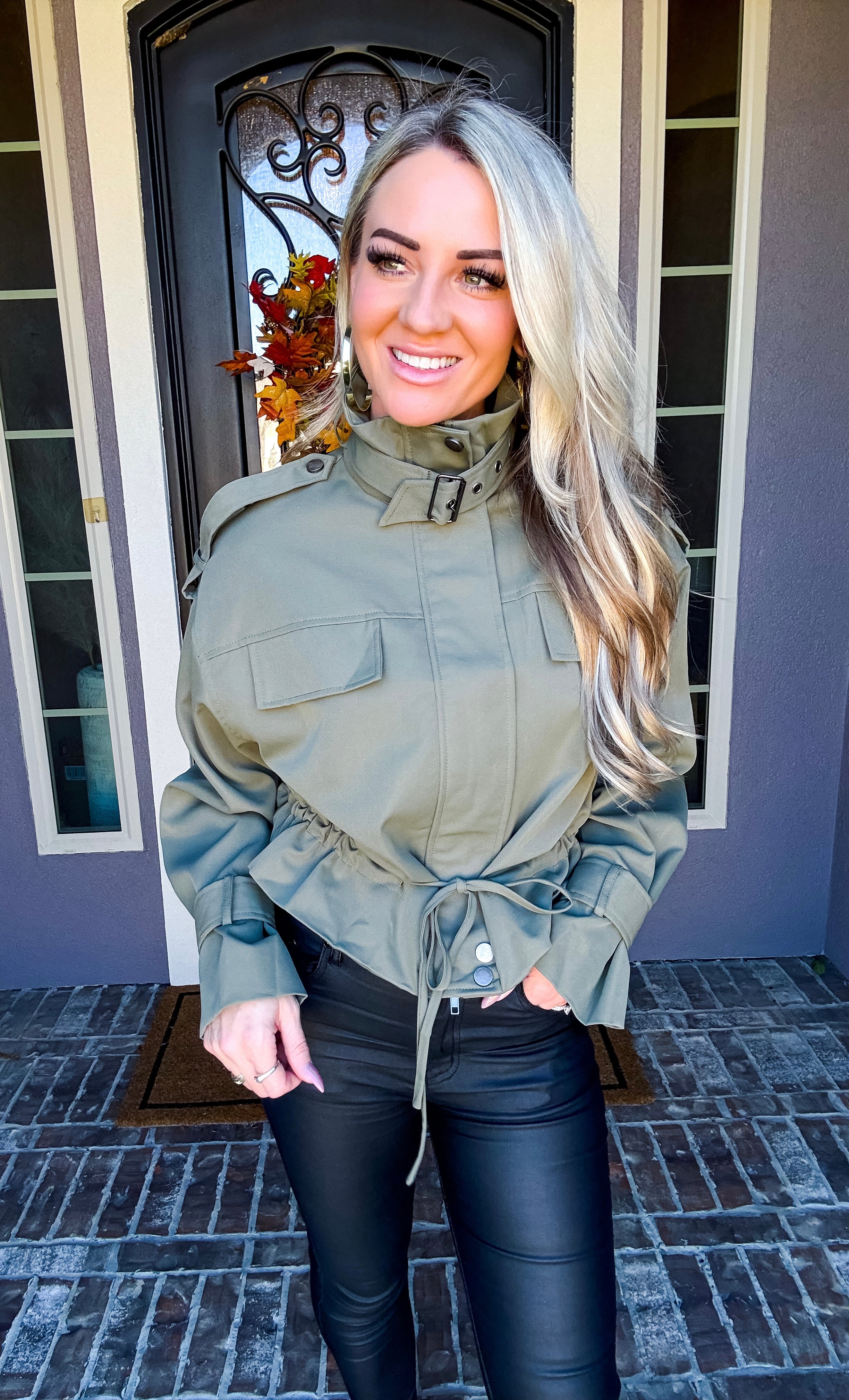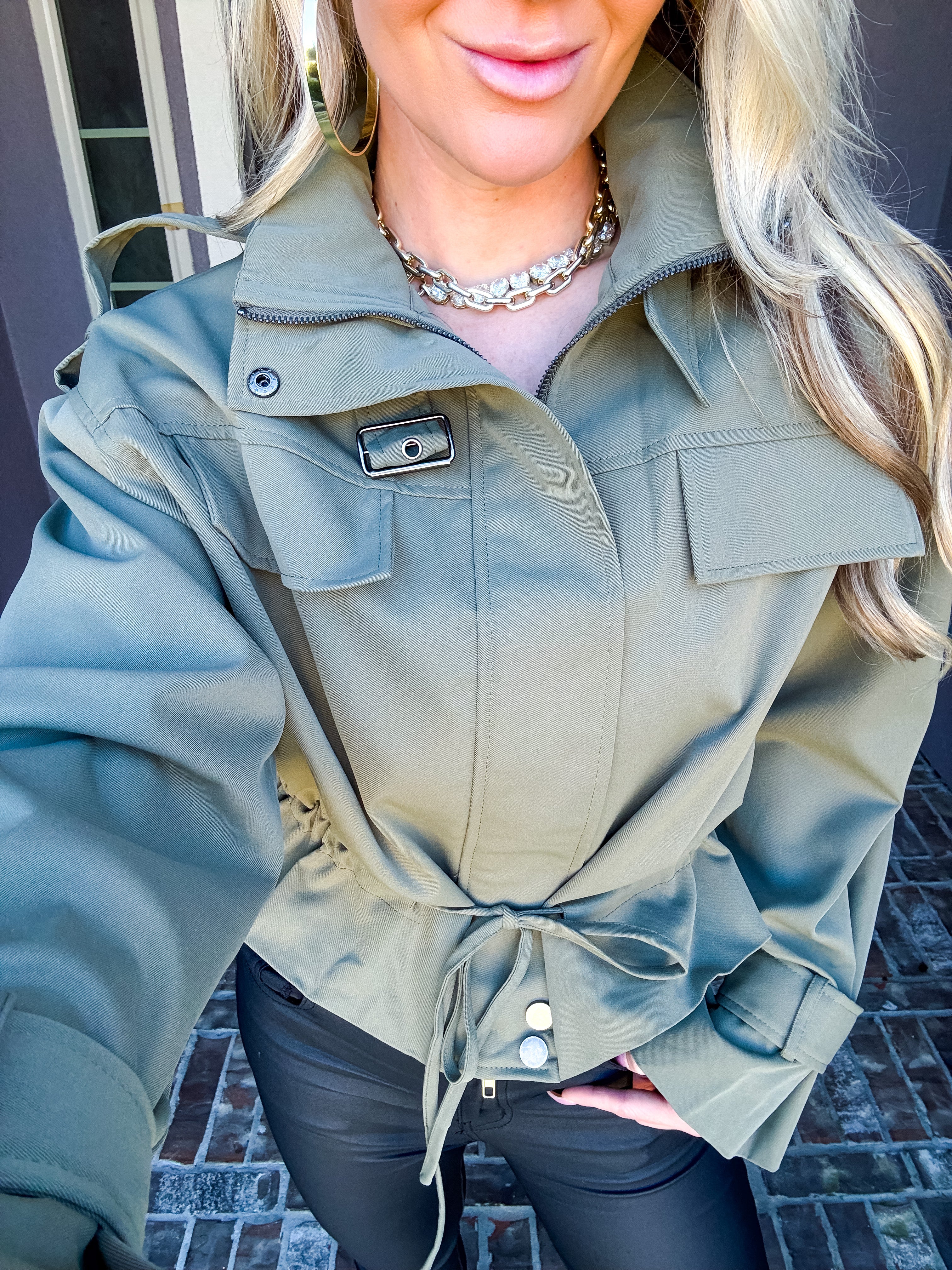 This utilitarian jacket delivers versatile styling with its innovative tie-waist design—cinch it for a flattering silhouette or leave it open for an effortless, layered look. The refined mockneck collar elevates the piece, allowing you to wear it as a standalone top or throw it over your favorite basics. Crafted with expert attention to detail, this jacket transitions seamlessly from day to night, making it an essential addition to any modern wardrobe.