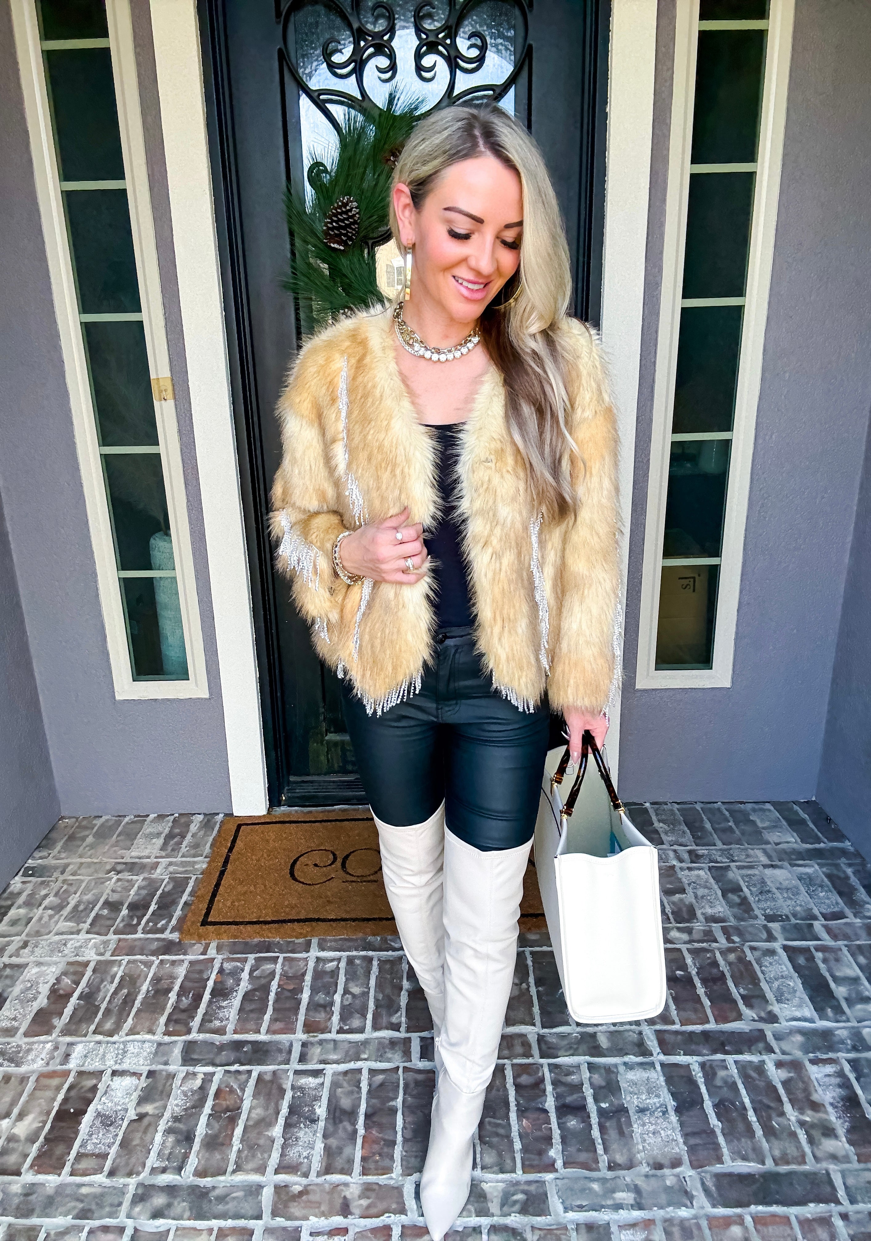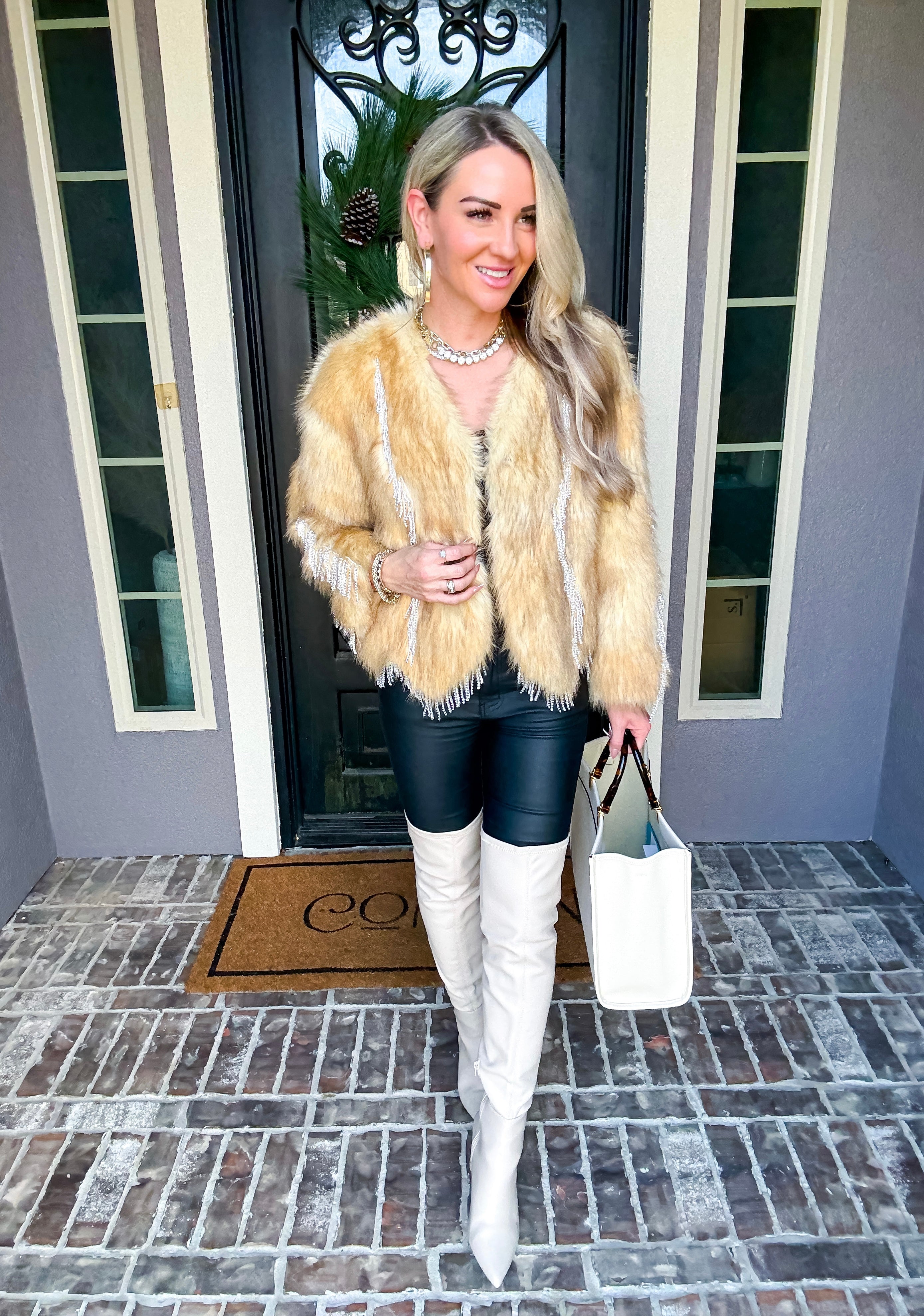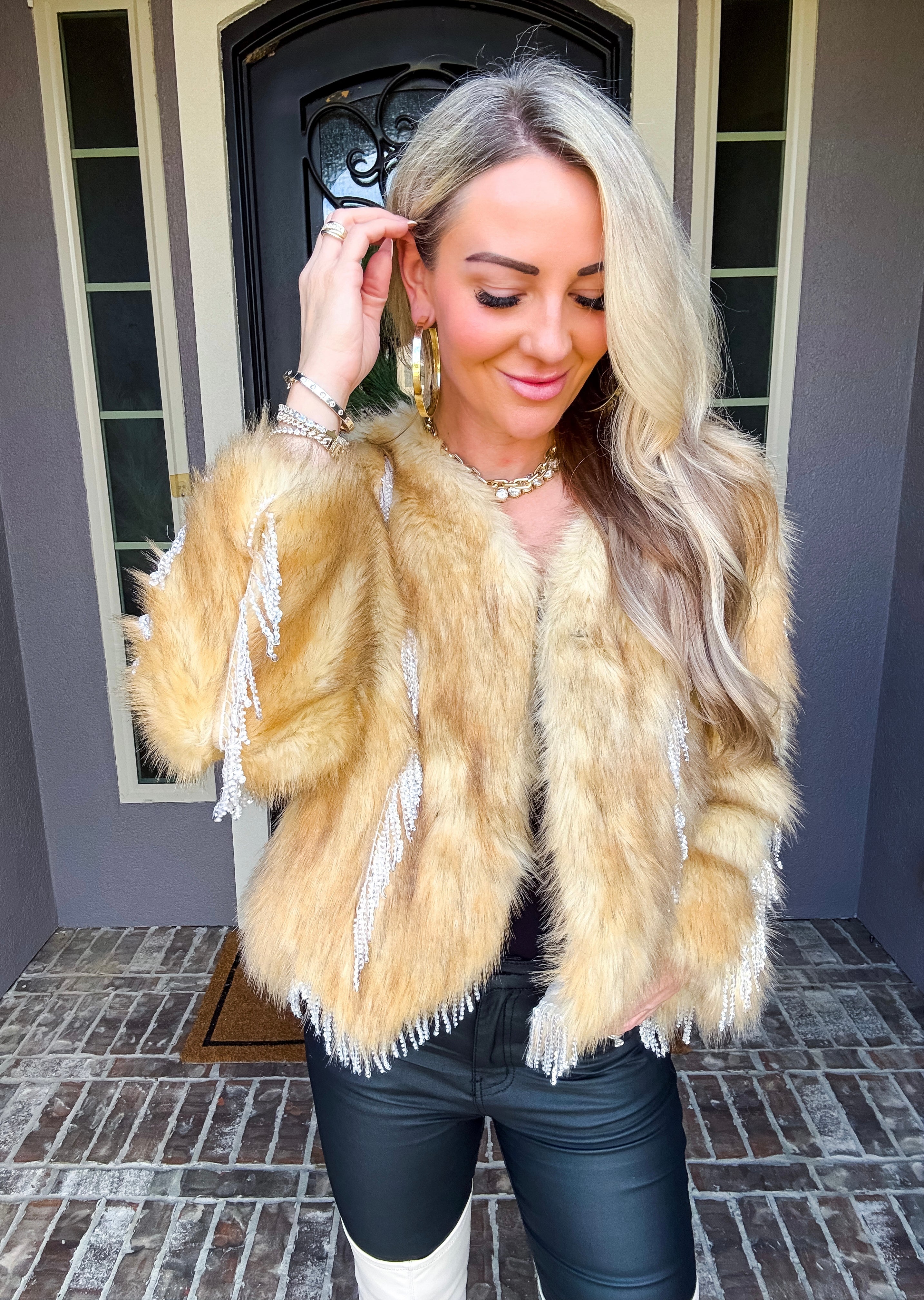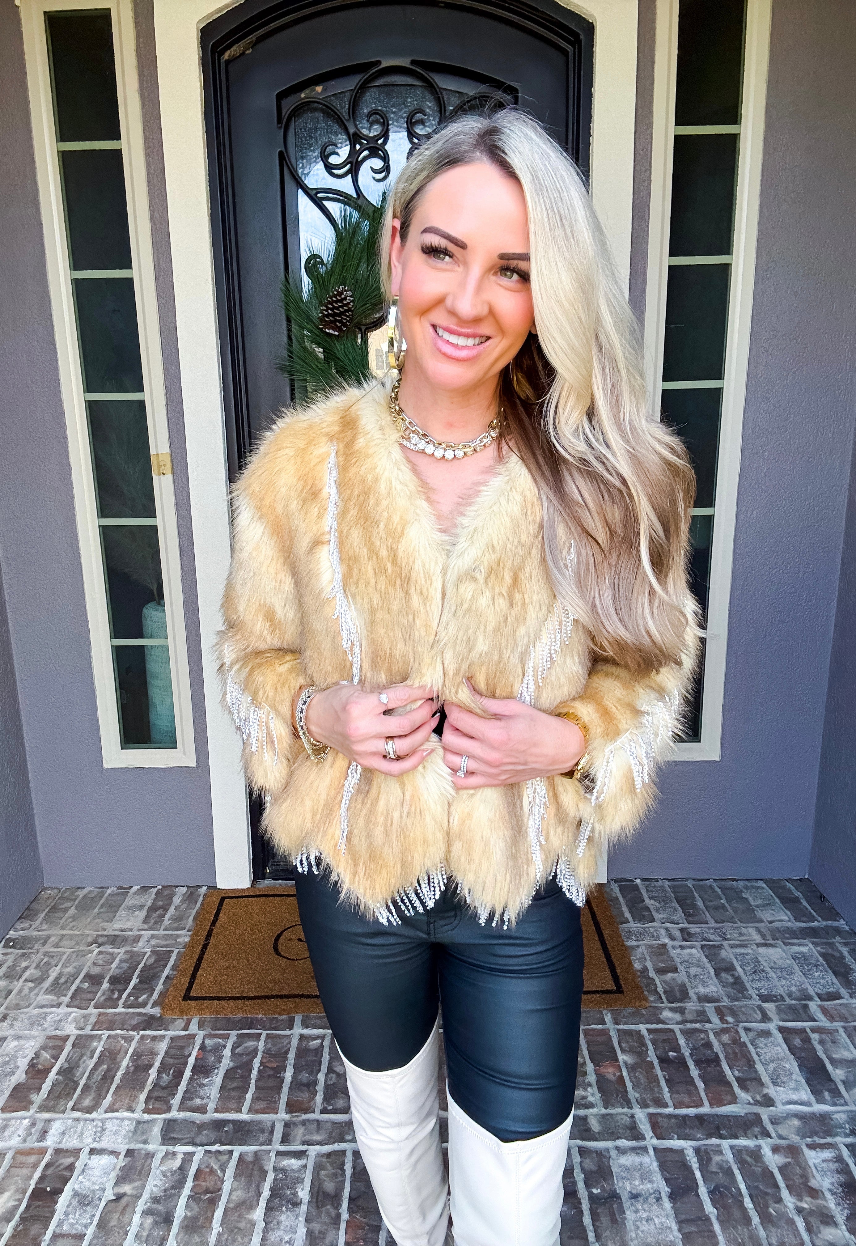 The Aspen Heiress Fur Jeweled Coat delivers red-carpet glamour with luxurious faux fur elevated by intricate jewel embellishments throughout. This one-of-a-kind piece seamlessly blends texture and sparkle, creating an undeniably statement-making silhouette. Perfect for those who refuse to compromise on sophistication, this coat transforms any occasion into a moment of pure elegance and confidence.