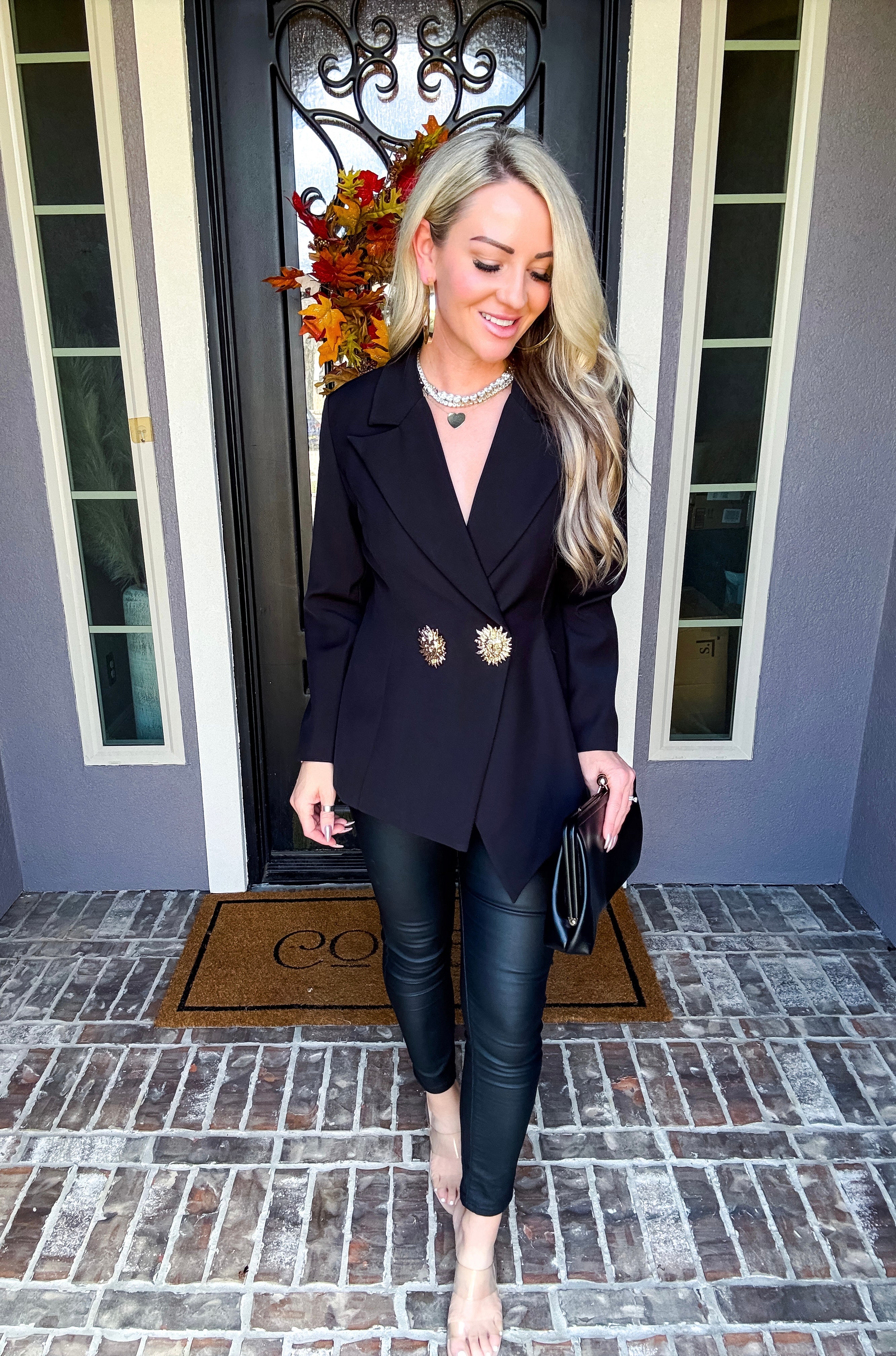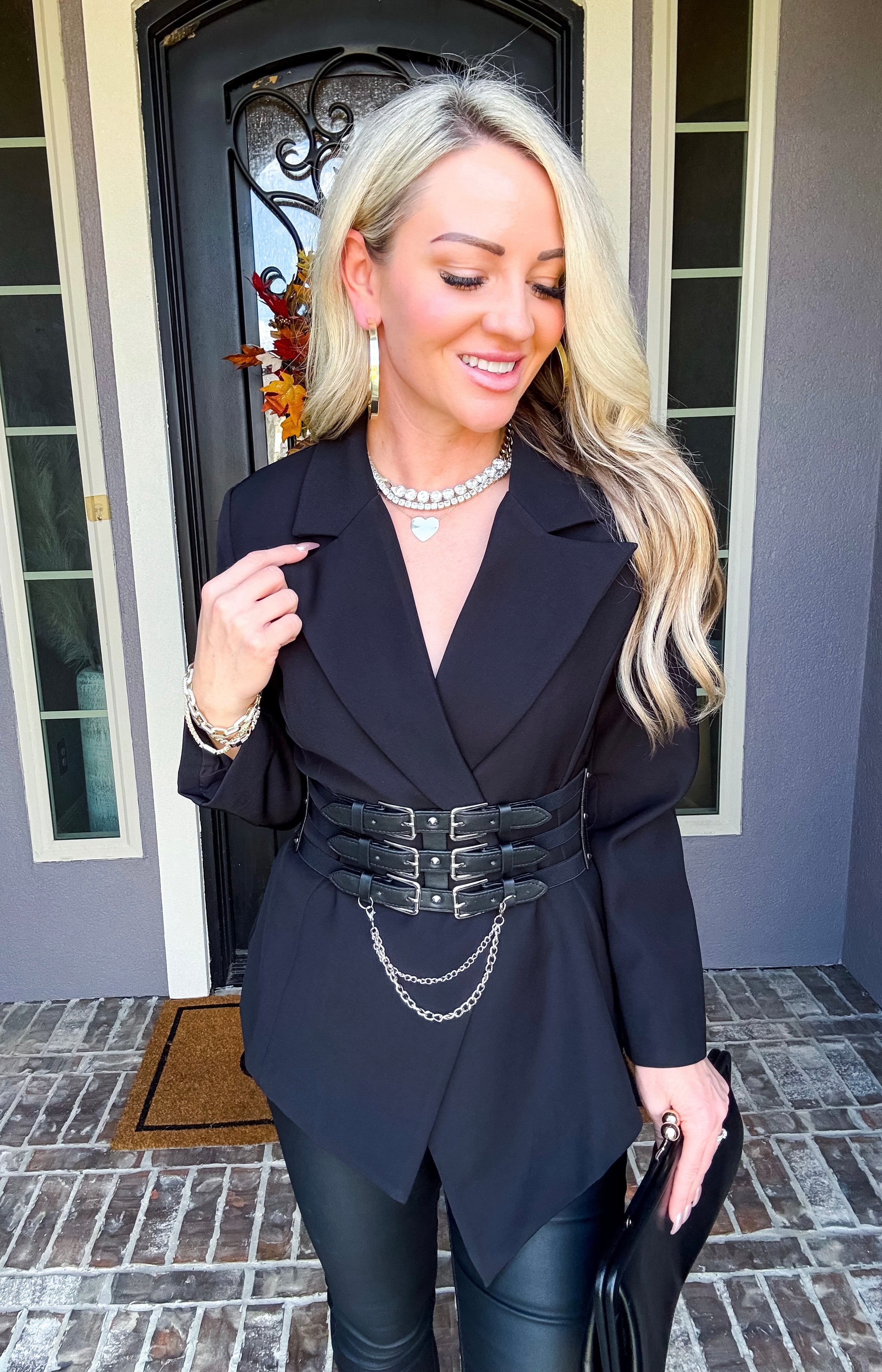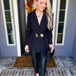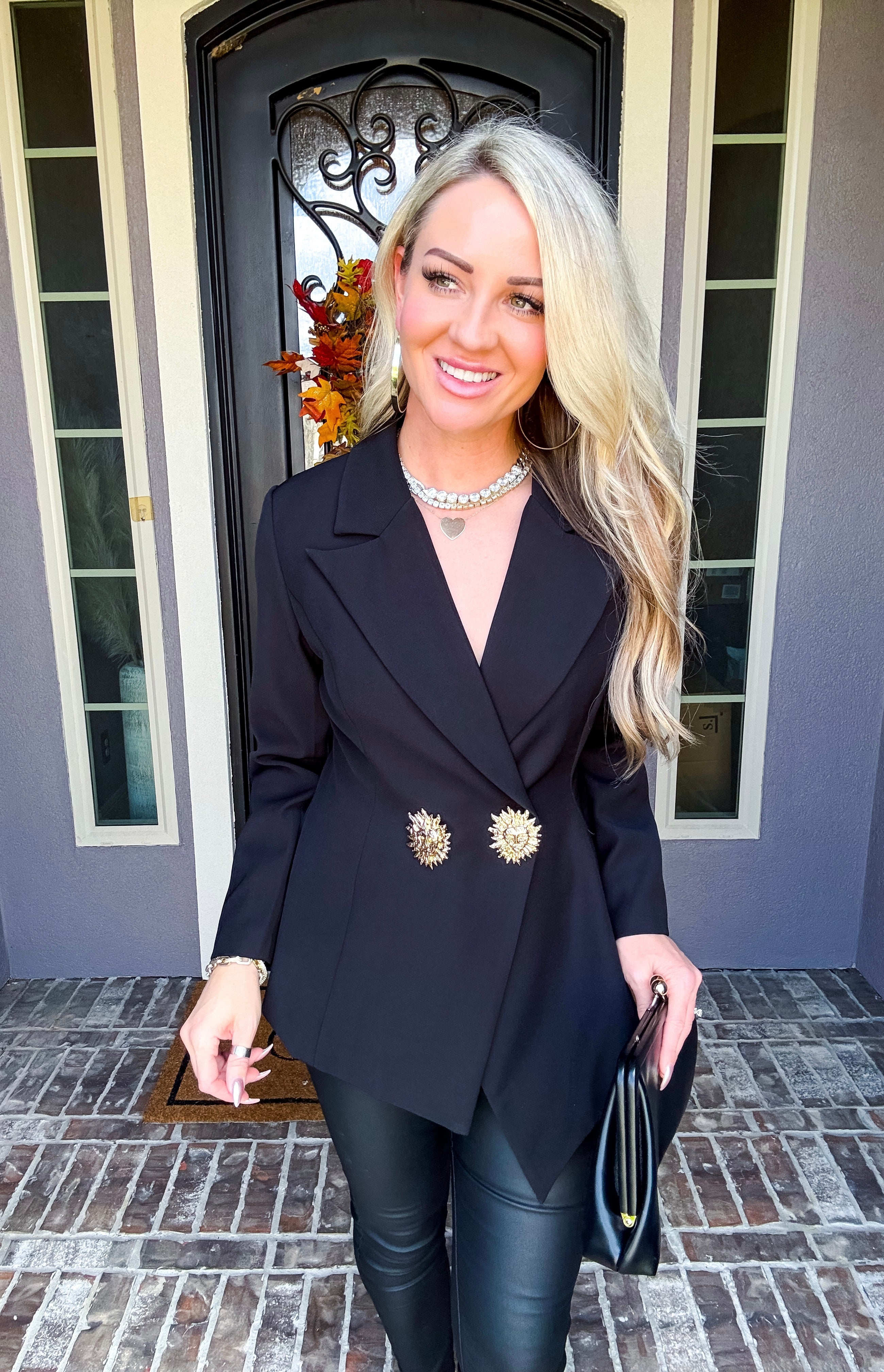 Elevate your wardrobe with the Chic Hustle Gold Button Blazer, designed with an eye-catching asymmetrical cut for a modern, stylish edge. Featuring removable gold buttons, this blazer offers versatile styling options to suit any occasion. Pair it with our Icon Statement belt to define your silhouette and complete a polished, sophisticated look. Perfect for making a confident impression, this blazer blends contemporary design with functional elegance.