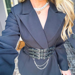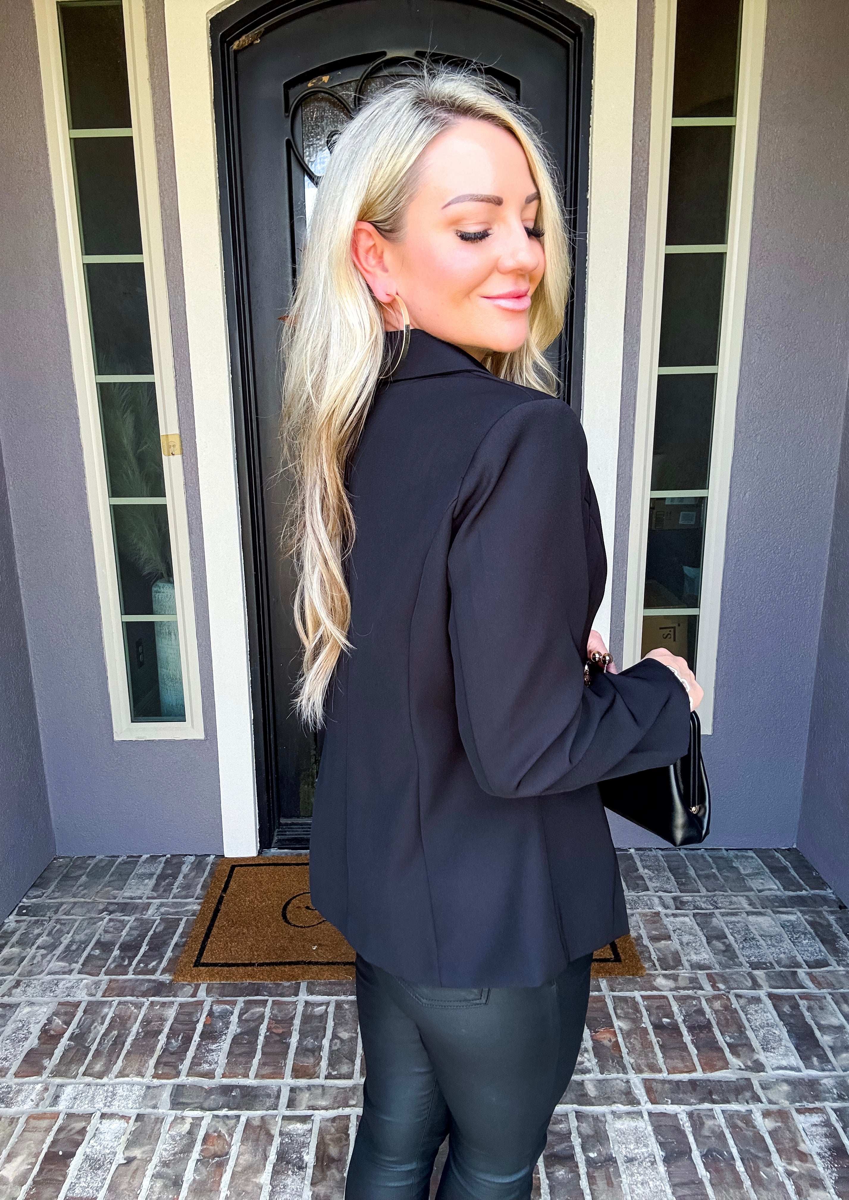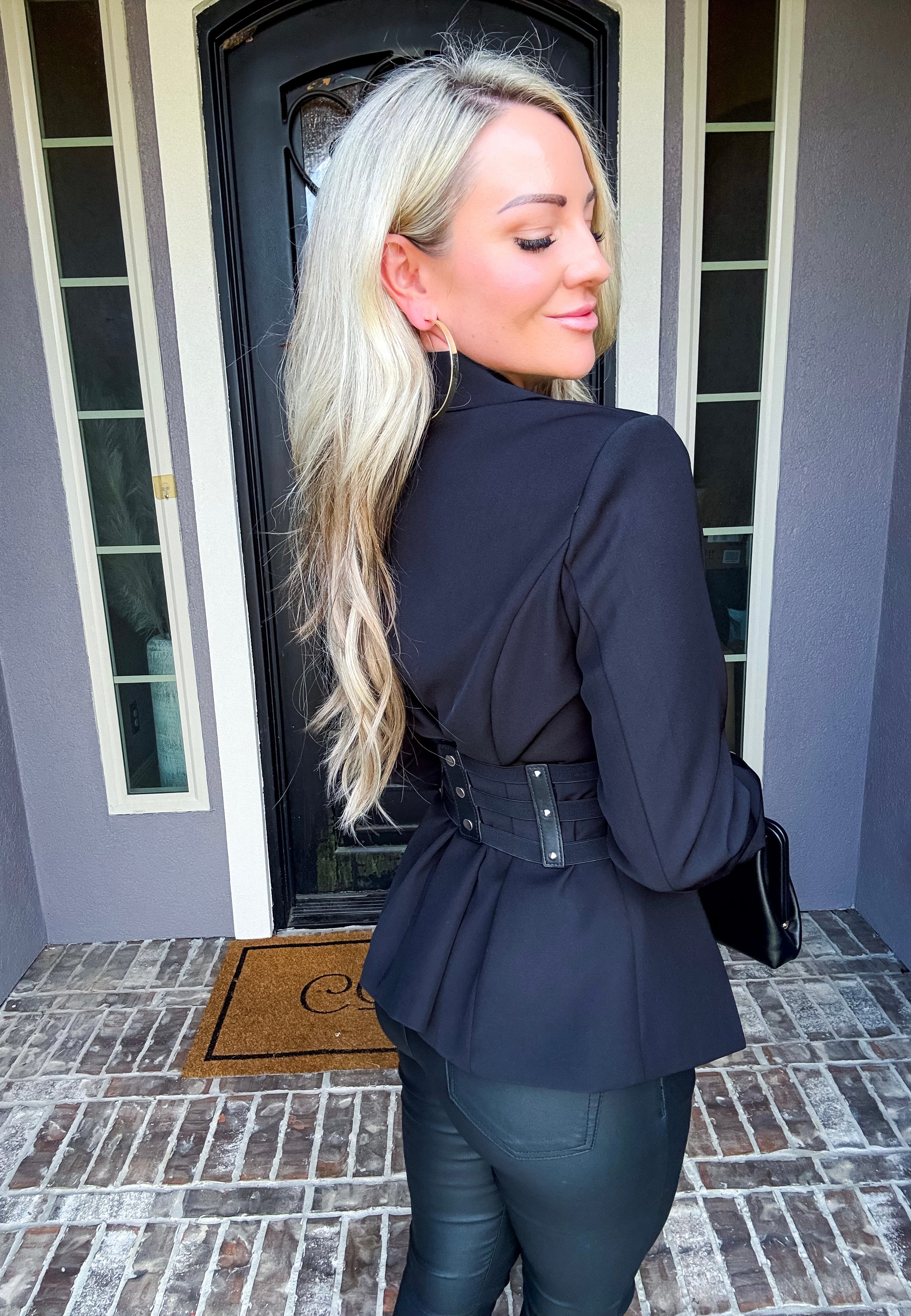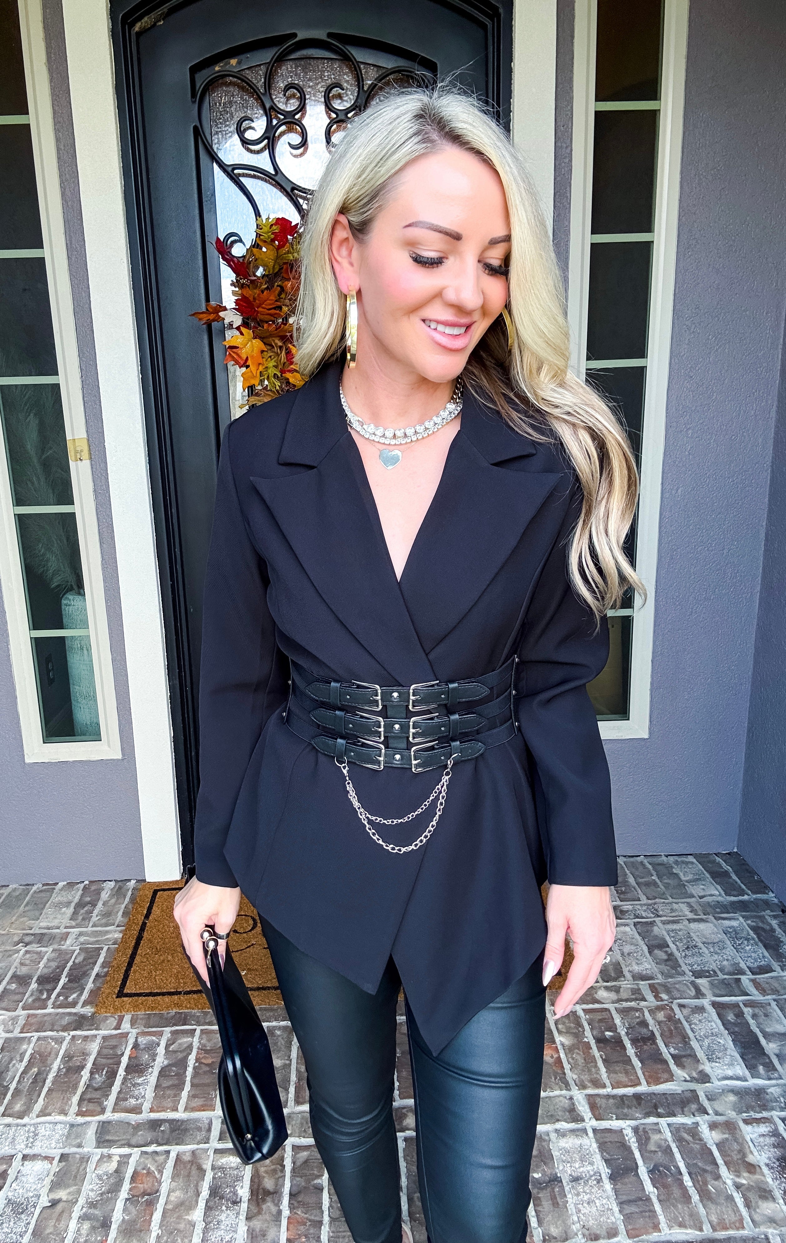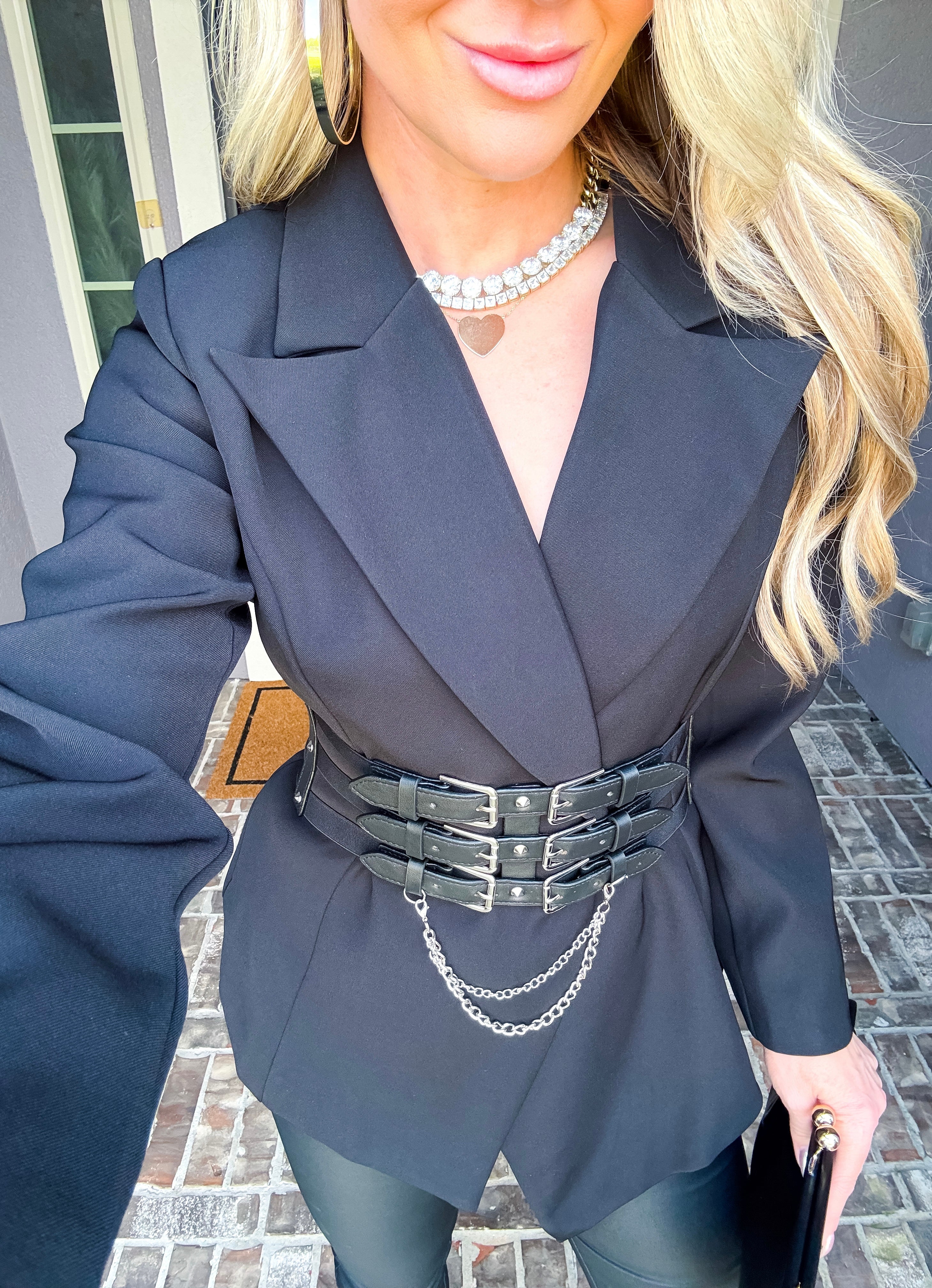 Elevate your wardrobe with the Chic Hustle Gold Button Blazer, designed with an eye-catching asymmetrical cut for a modern, stylish edge. Featuring removable gold buttons, this blazer offers versatile styling options to suit any occasion. Pair it with our Icon Statement belt to define your silhouette and complete a polished, sophisticated look. Perfect for making a confident impression, this blazer blends contemporary design with functional elegance.
