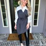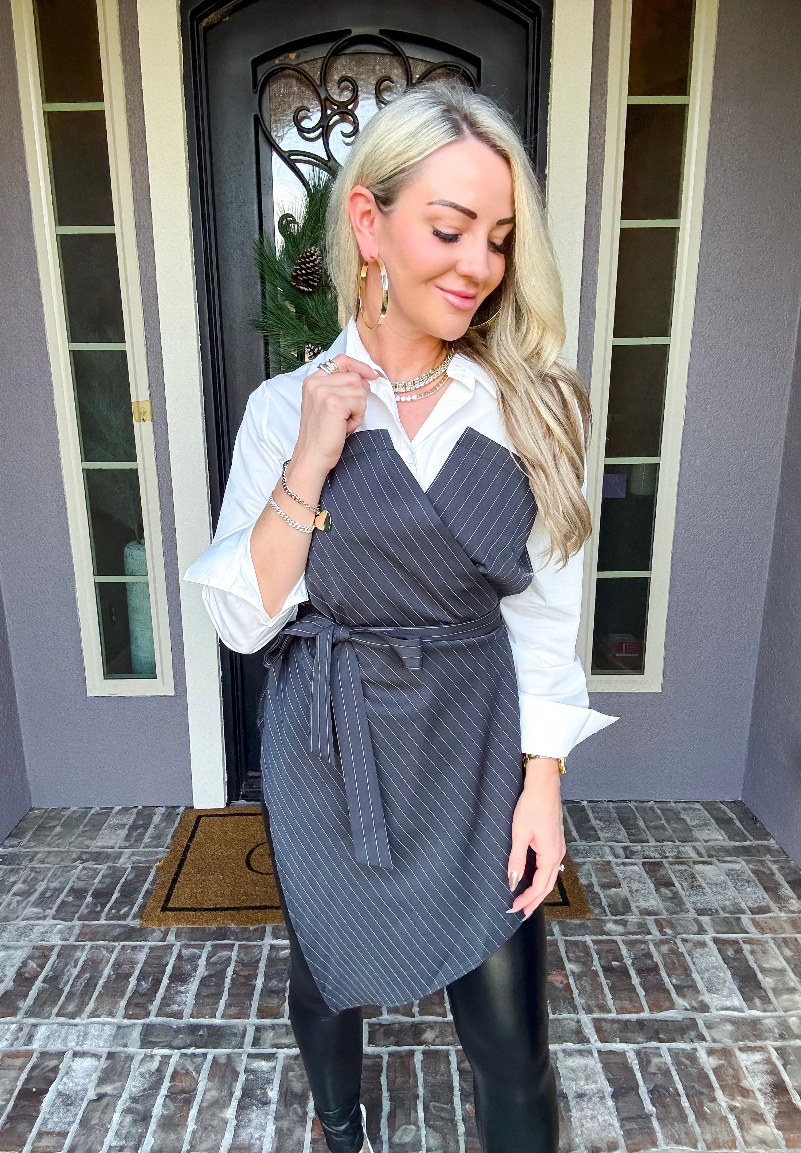 The City Crush Pinstripe Wrap Blouse redefines contemporary elegance with its daring asymmetrical silhouette. This high-fashion piece features a dramatically low front and elevated back, creating an unexpected visual narrative that commands attention. The classic pinstripe pattern grounds the design in timeless sophistication, while the included belt allows you to sculpt and define your waist with precision. Perfect for those who aren't afraid to make a statement—this blouse elevates any wardrobe with refined, modern edge.
