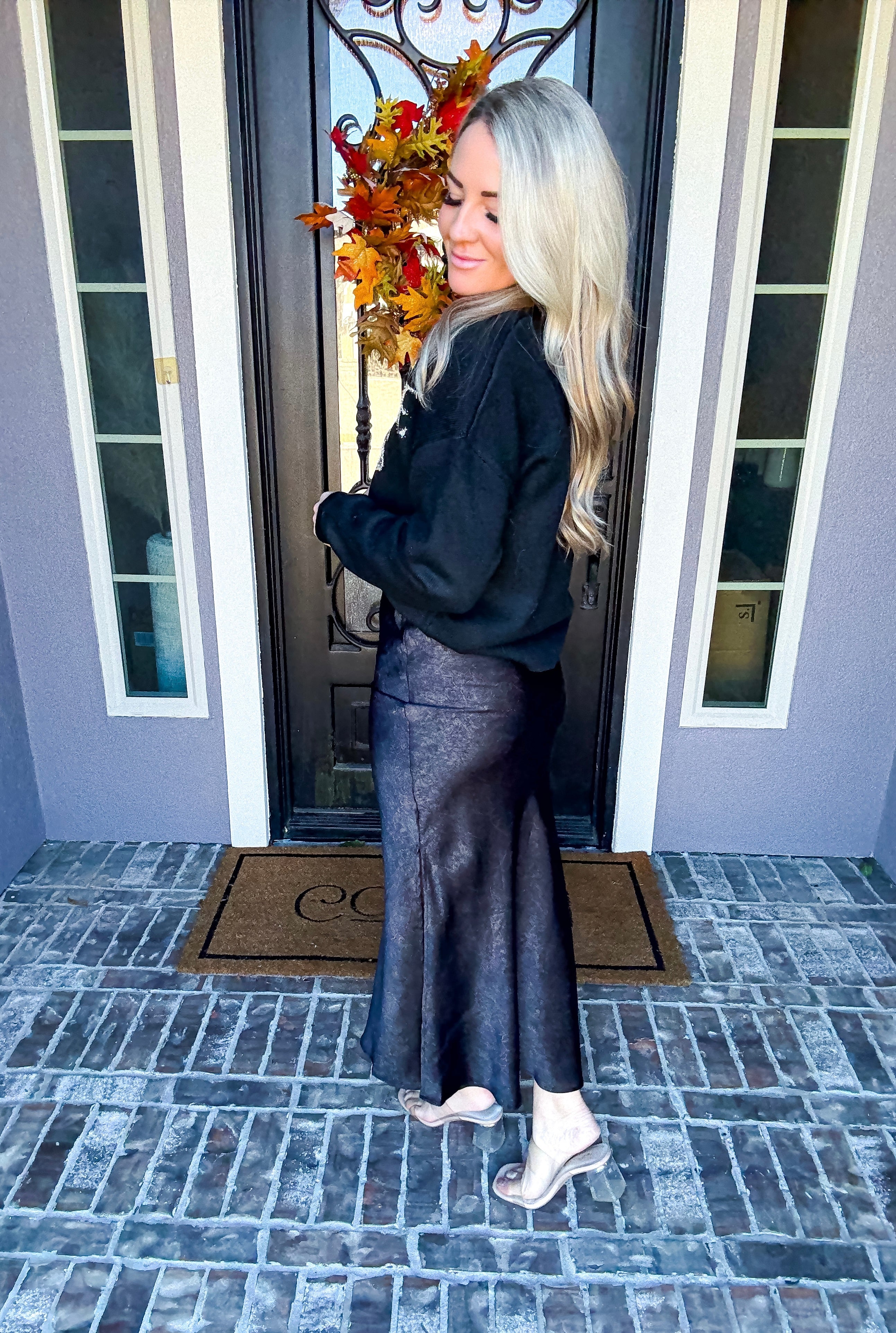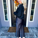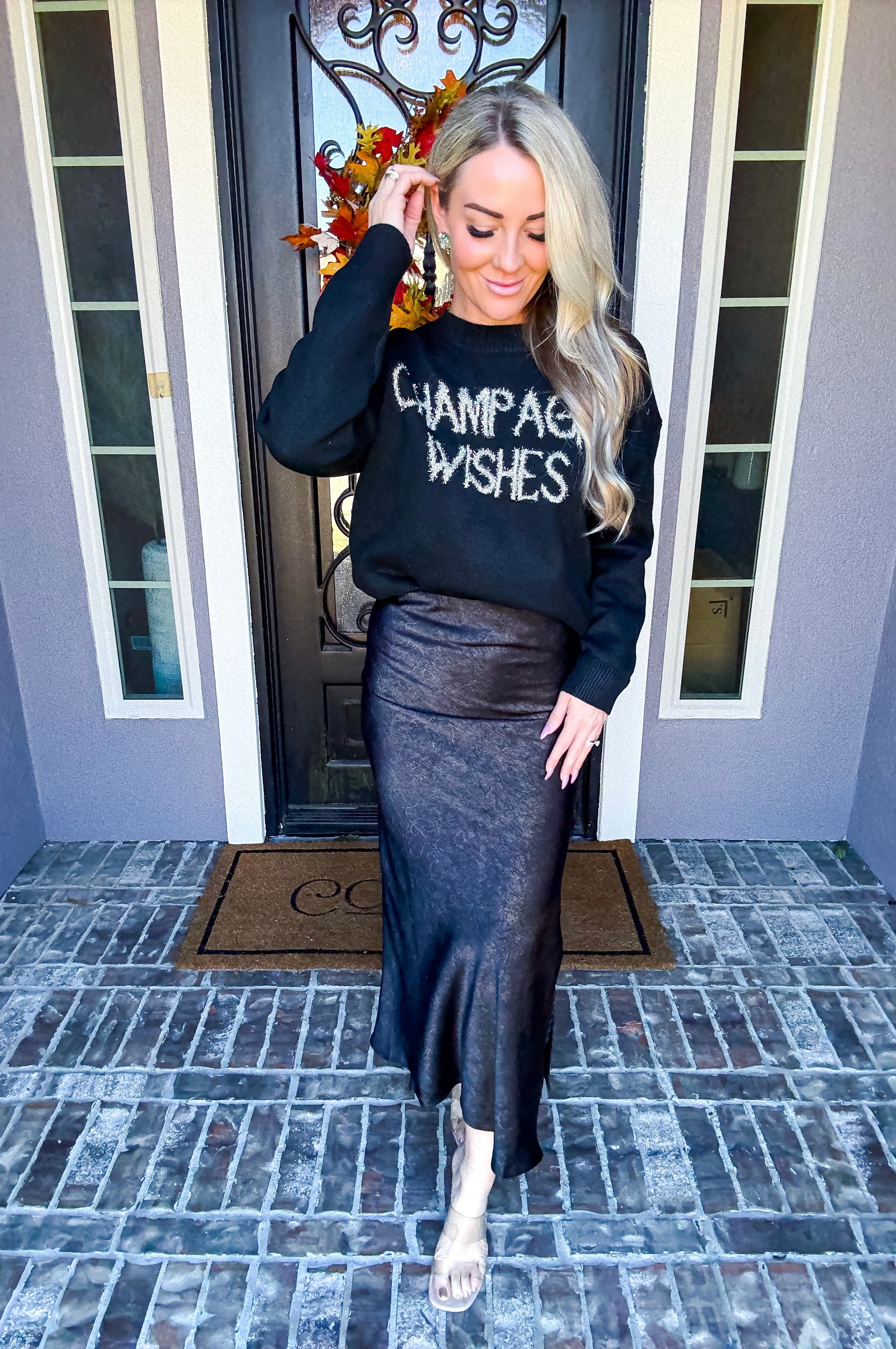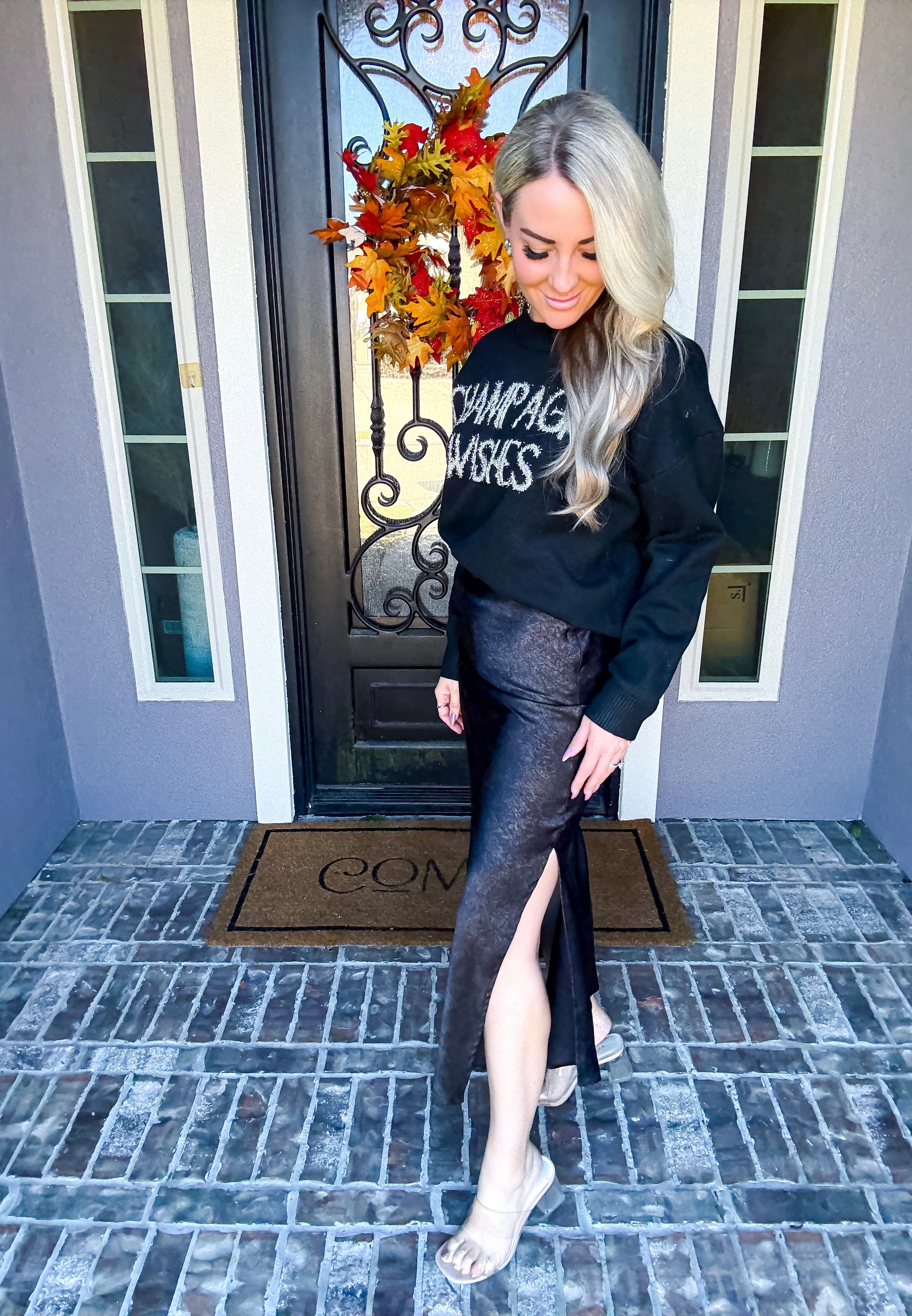 The Glam Society Shimmer Skirt delivers sophisticated style with practical comfort. Featuring a stretchy waistband for all-day wearability, this skirt combines elegance with ease of dressing thanks to its convenient side zip closure. A tasteful slit on one side adds movement and dimension, while shimmering details throughout create an eye-catching finish perfect for evening events or elevated occasions. A versatile piece that transitions effortlessly from day to night.