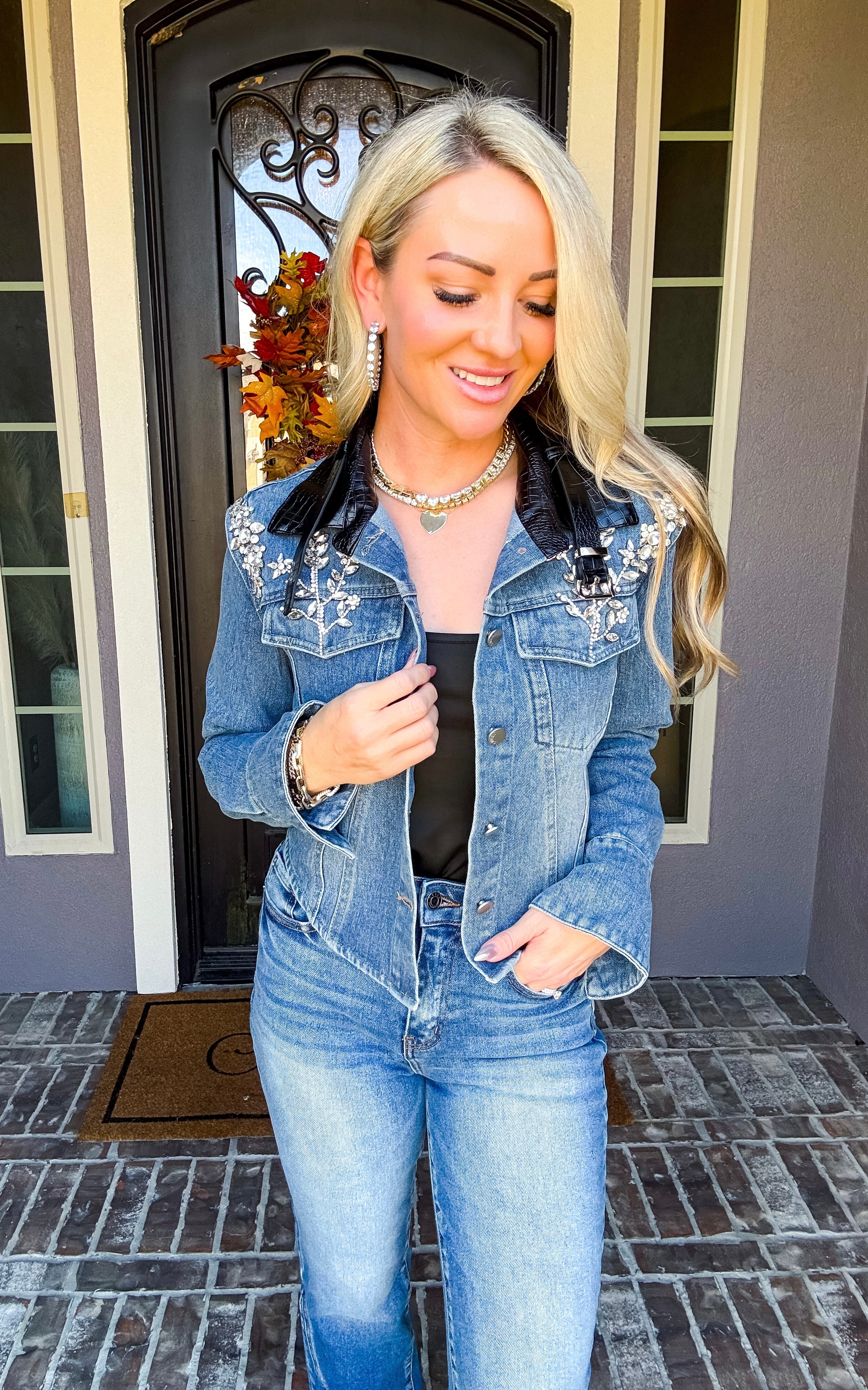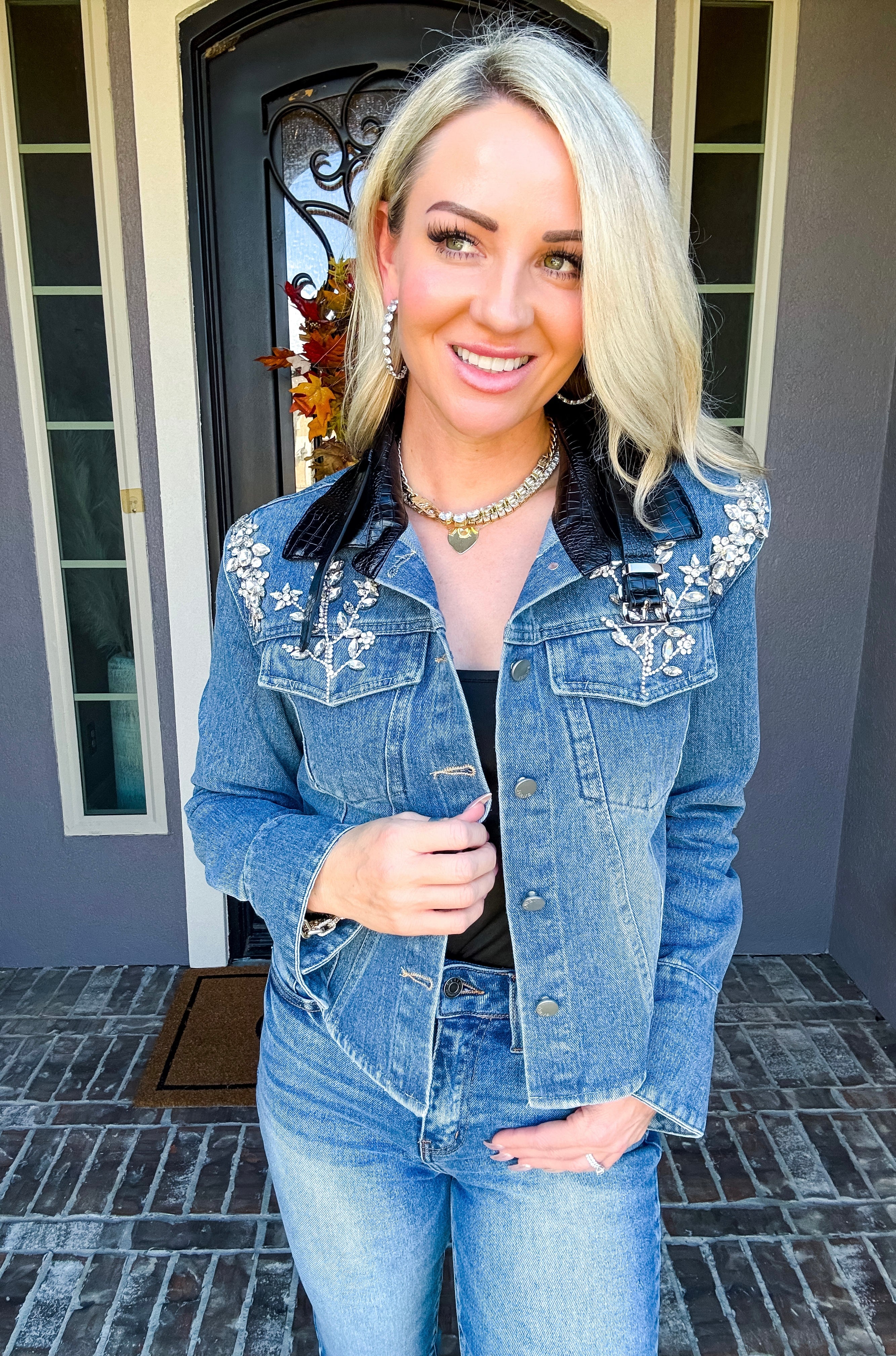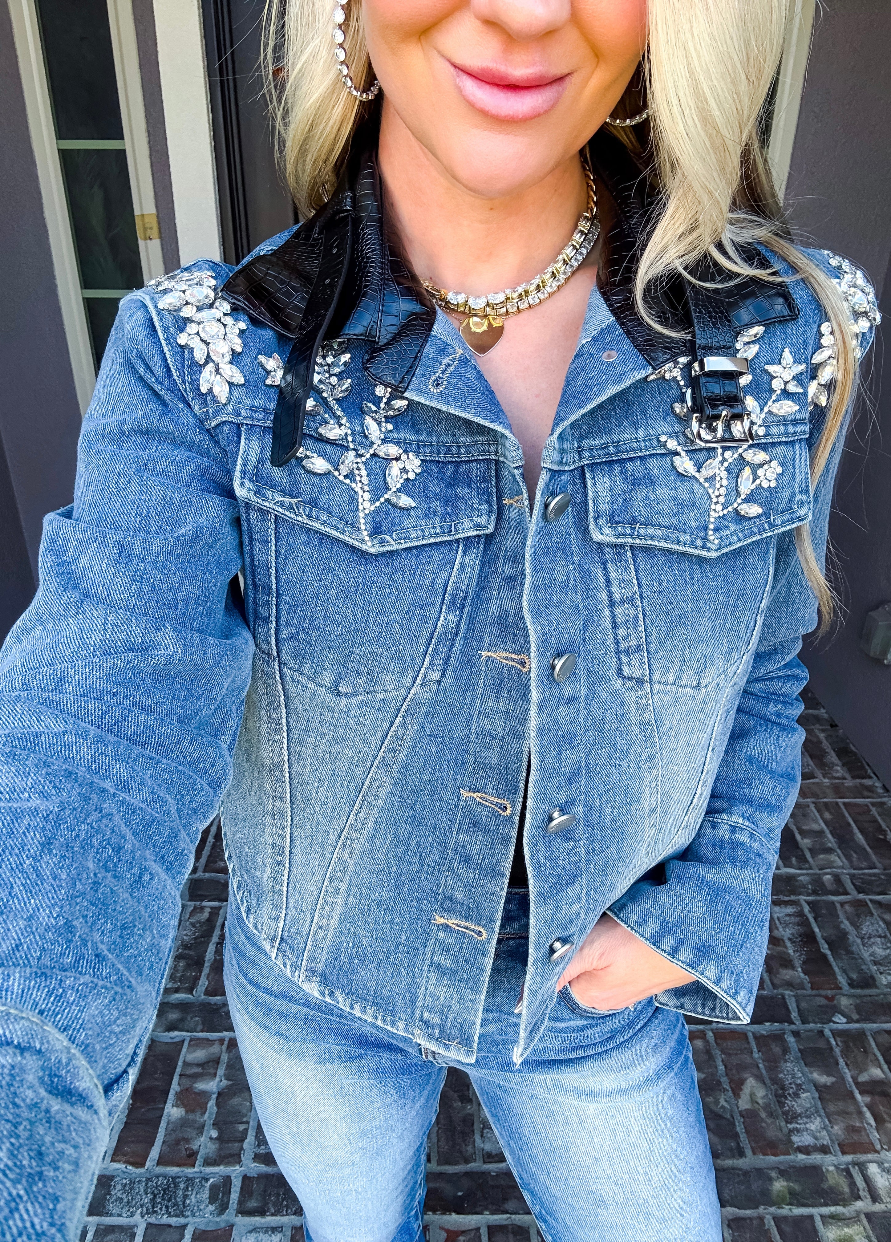 Elevate your wardrobe with the Haute Rebel Jeweled Denim Jacket, featuring stunning jewels adorning each shoulder for an eye-catching finish. The faux leather collar adds a sleek contrast, while flared cuffs bring a sophisticated edge to the classic denim silhouette. This jacket effortlessly combines bold details with refined tailoring for a truly gorgeous statement piece.