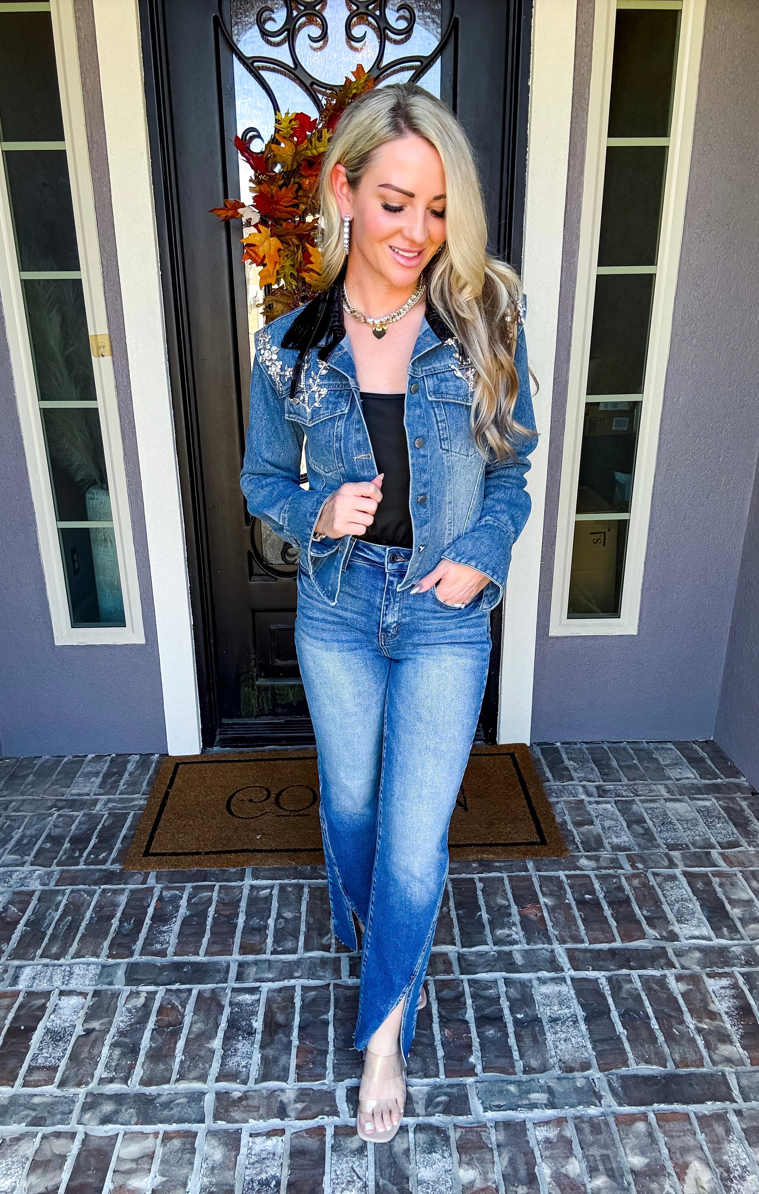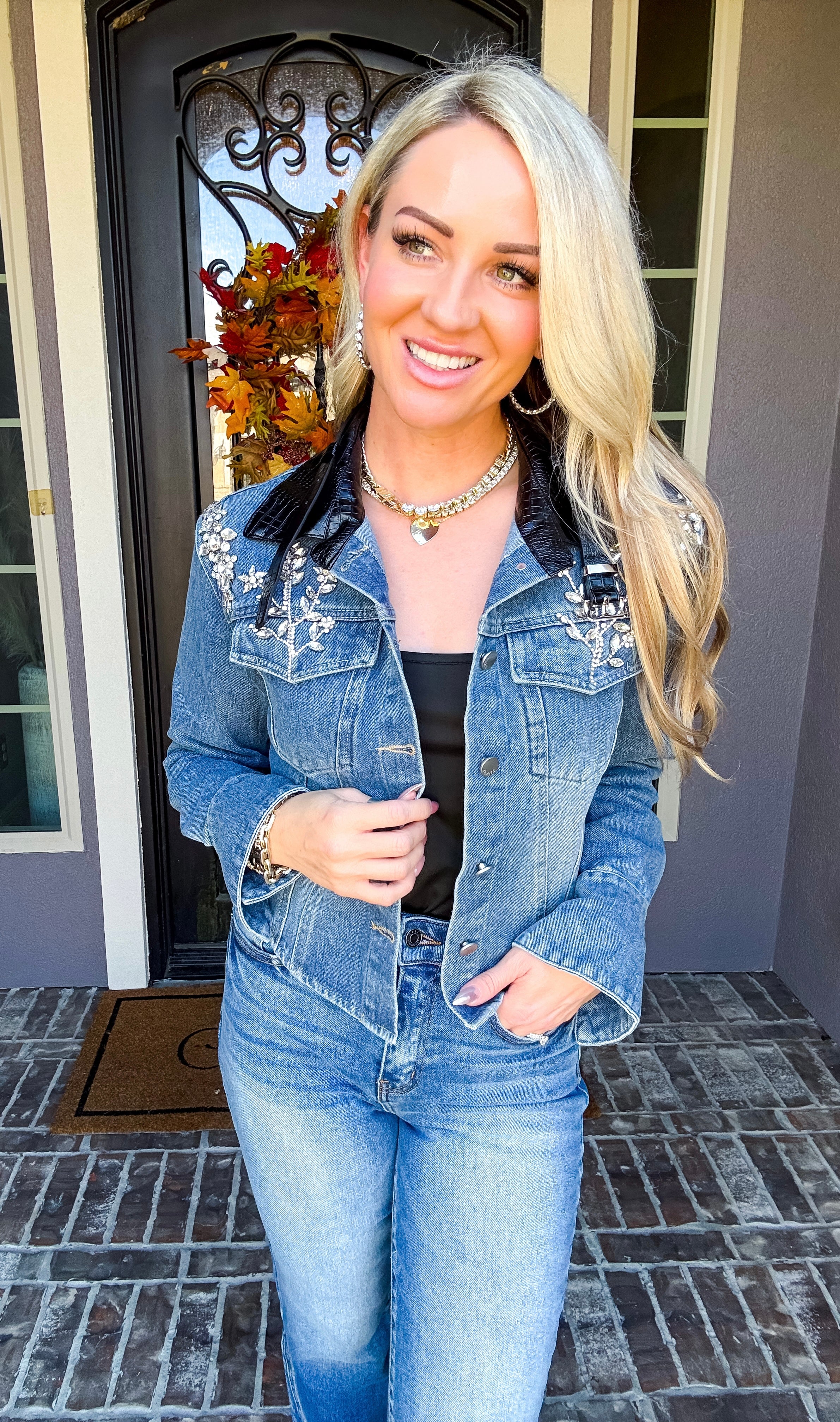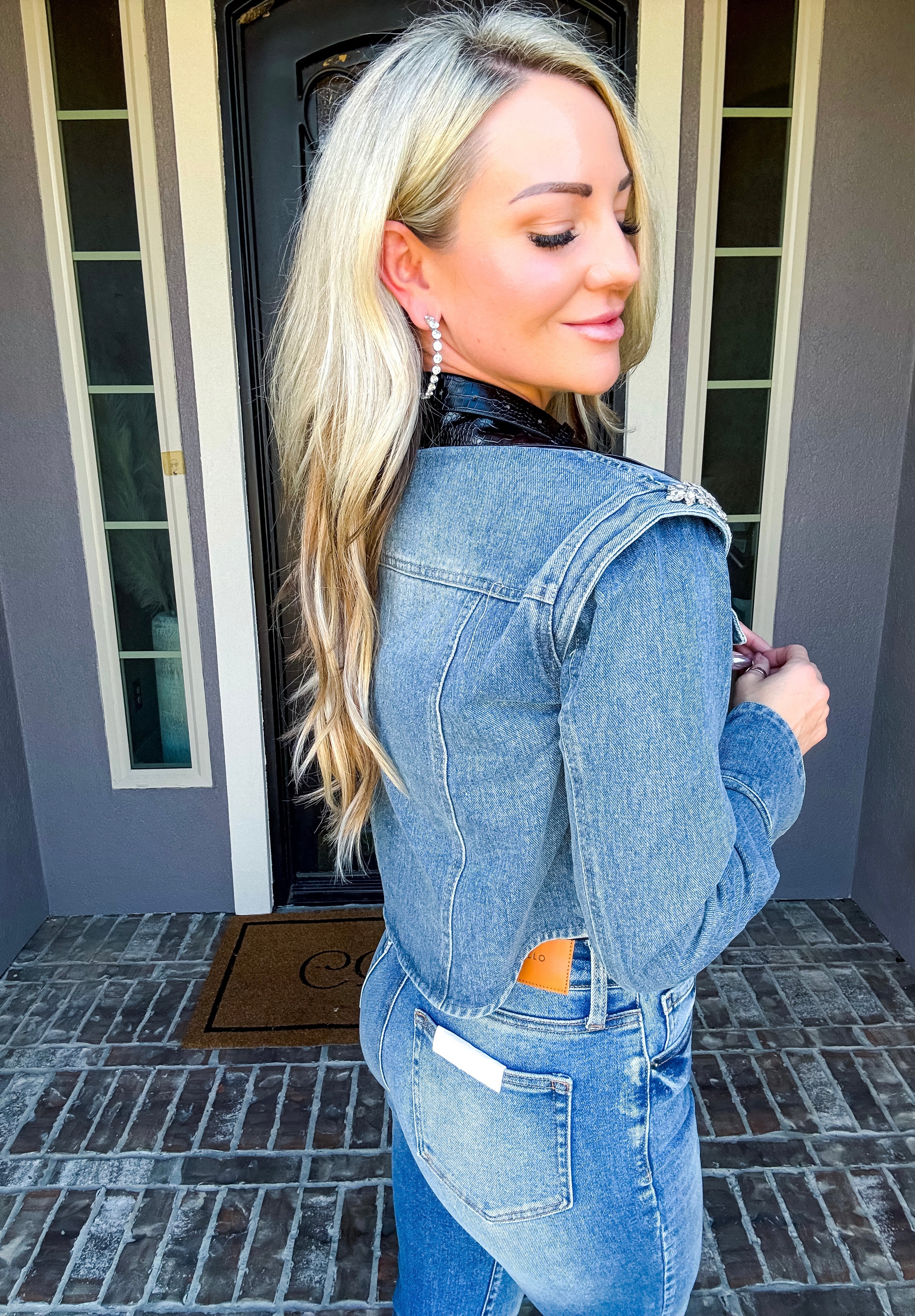 Elevate your wardrobe with the Haute Rebel Jeweled Denim Jacket, featuring stunning jewels adorning each shoulder for an eye-catching finish. The faux leather collar adds a sleek contrast, while flared cuffs bring a sophisticated edge to the classic denim silhouette. This jacket effortlessly combines bold details with refined tailoring for a truly gorgeous statement piece.