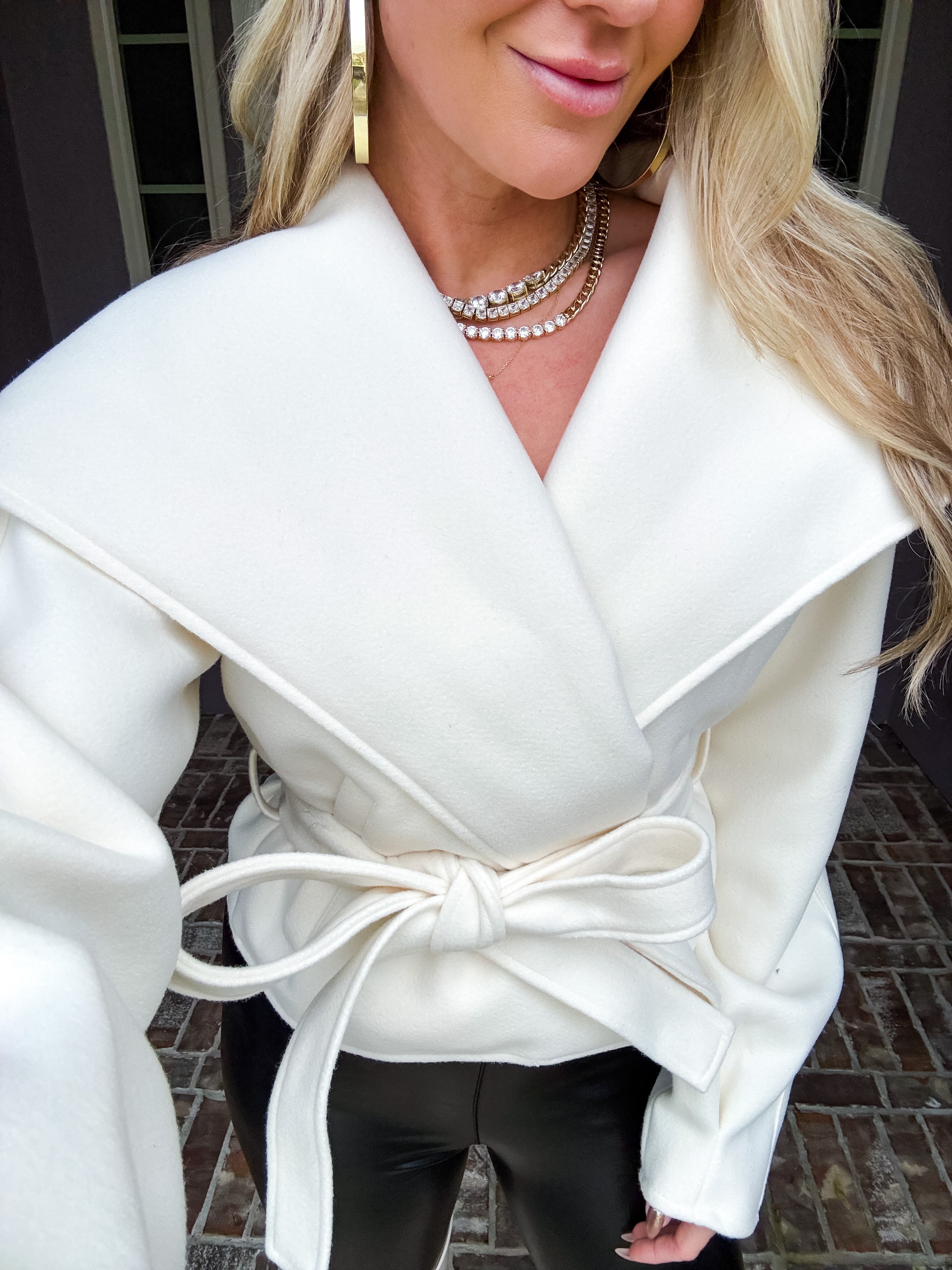 The NYC Studio Belted Jacket in ivory combines architectural tailoring with effortless sophistication. An exaggerated collar frames the neckline with dramatic flair, while a cinched waist belt defines your silhouette and creates a flattering, intentional shape. Crafted for the discerning dresser, this versatile layer transitions seamlessly from boardroom to evening, delivering polished elegance with every wear.