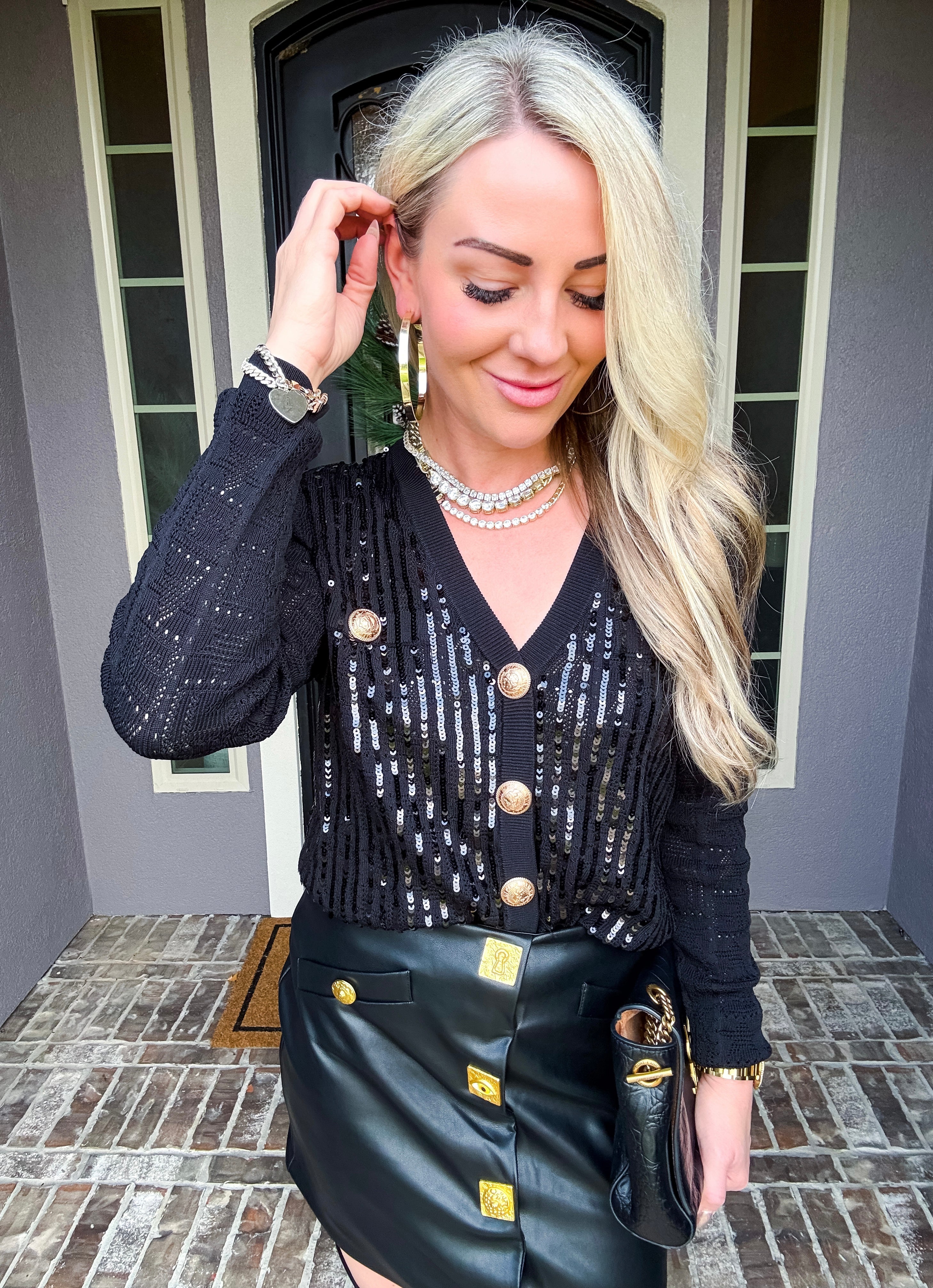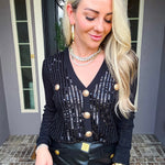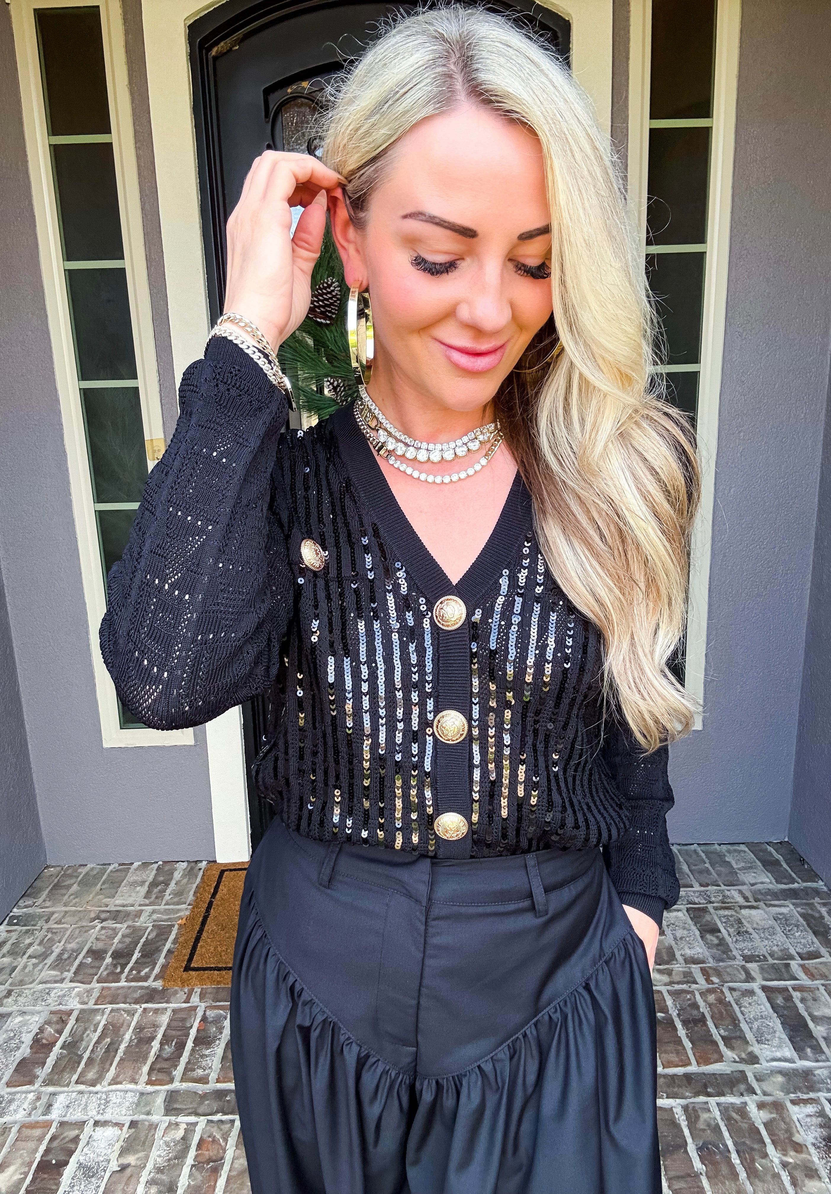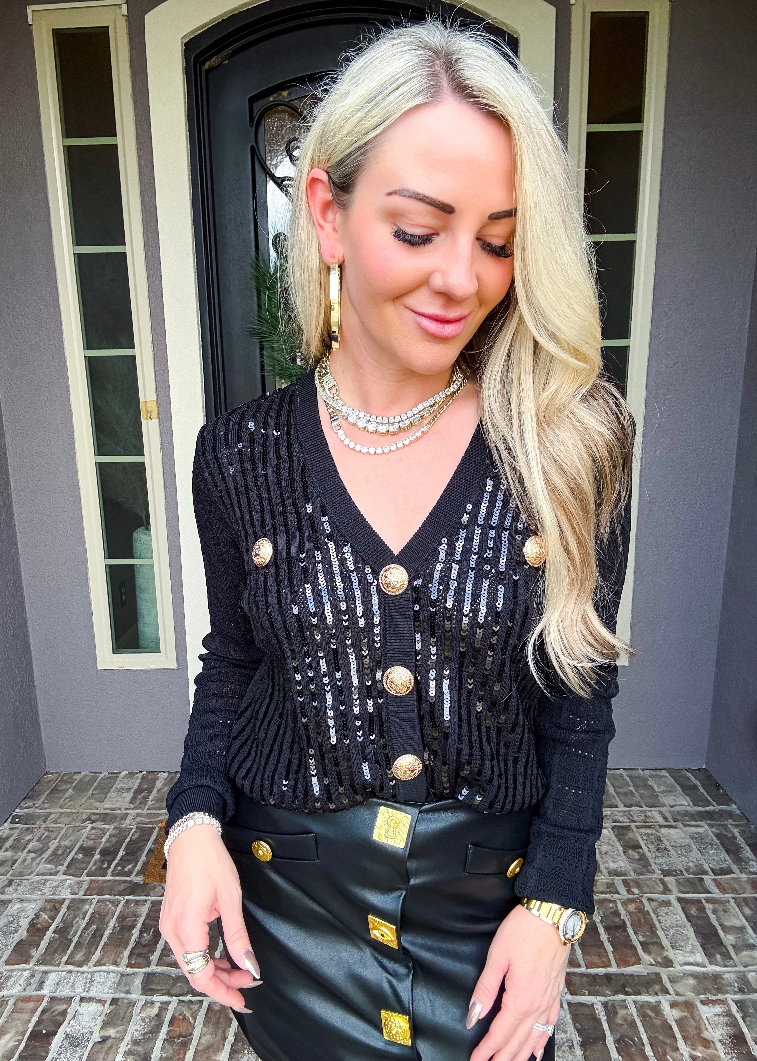 Elevate your evening wardrobe with the Rich Behavior Sequin Cardigan, a statement piece designed to turn heads. The front showcases shimmering sequins that catch the light beautifully, while luxurious gold snap buttons add refined sophistication. Crafted from stretchy material, this cardigan offers comfortable movement without sacrificing style. Perfect for layering over dresses or pairing with tailored pieces, it delivers the polished glamour that commands attention at any occasion.