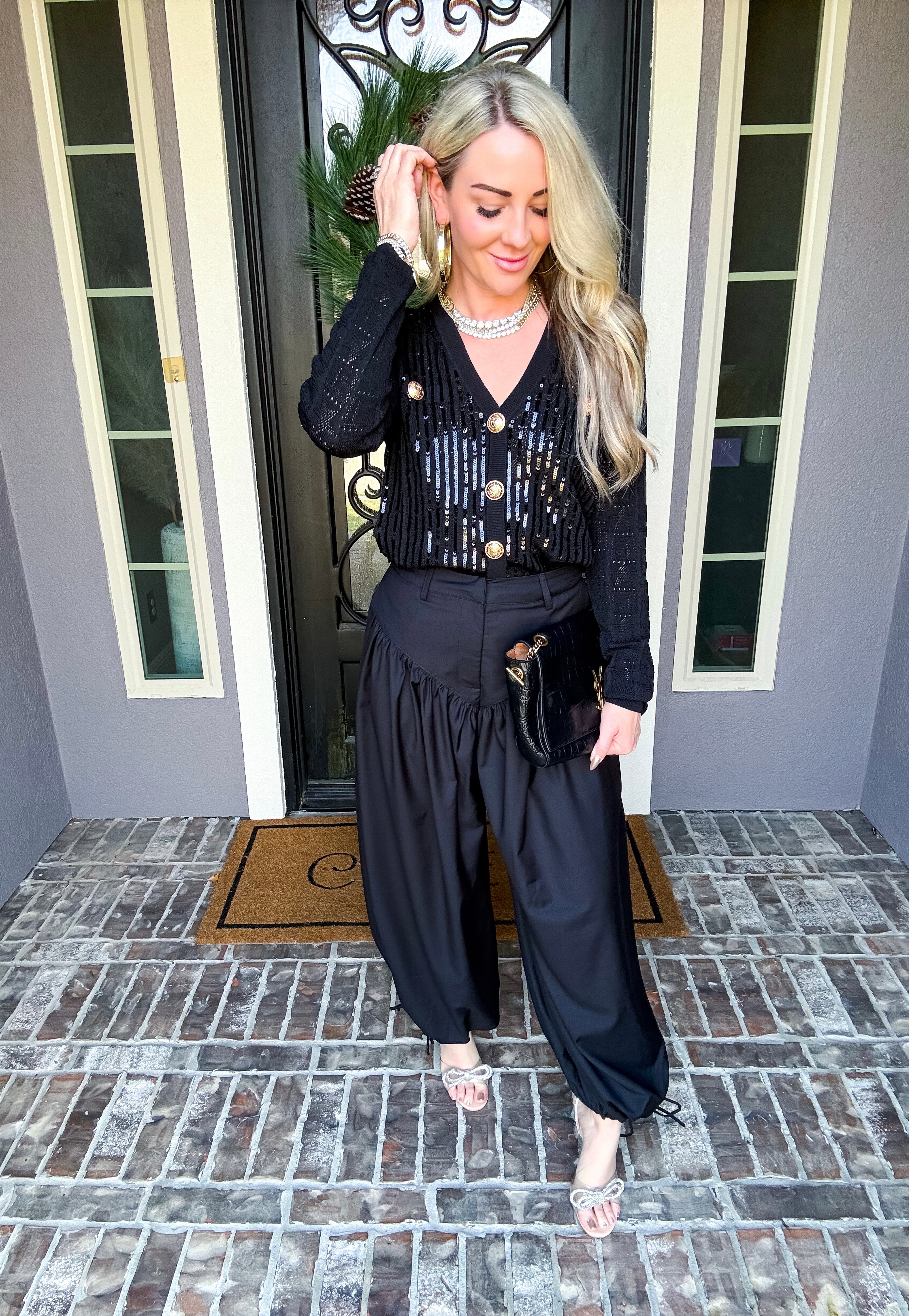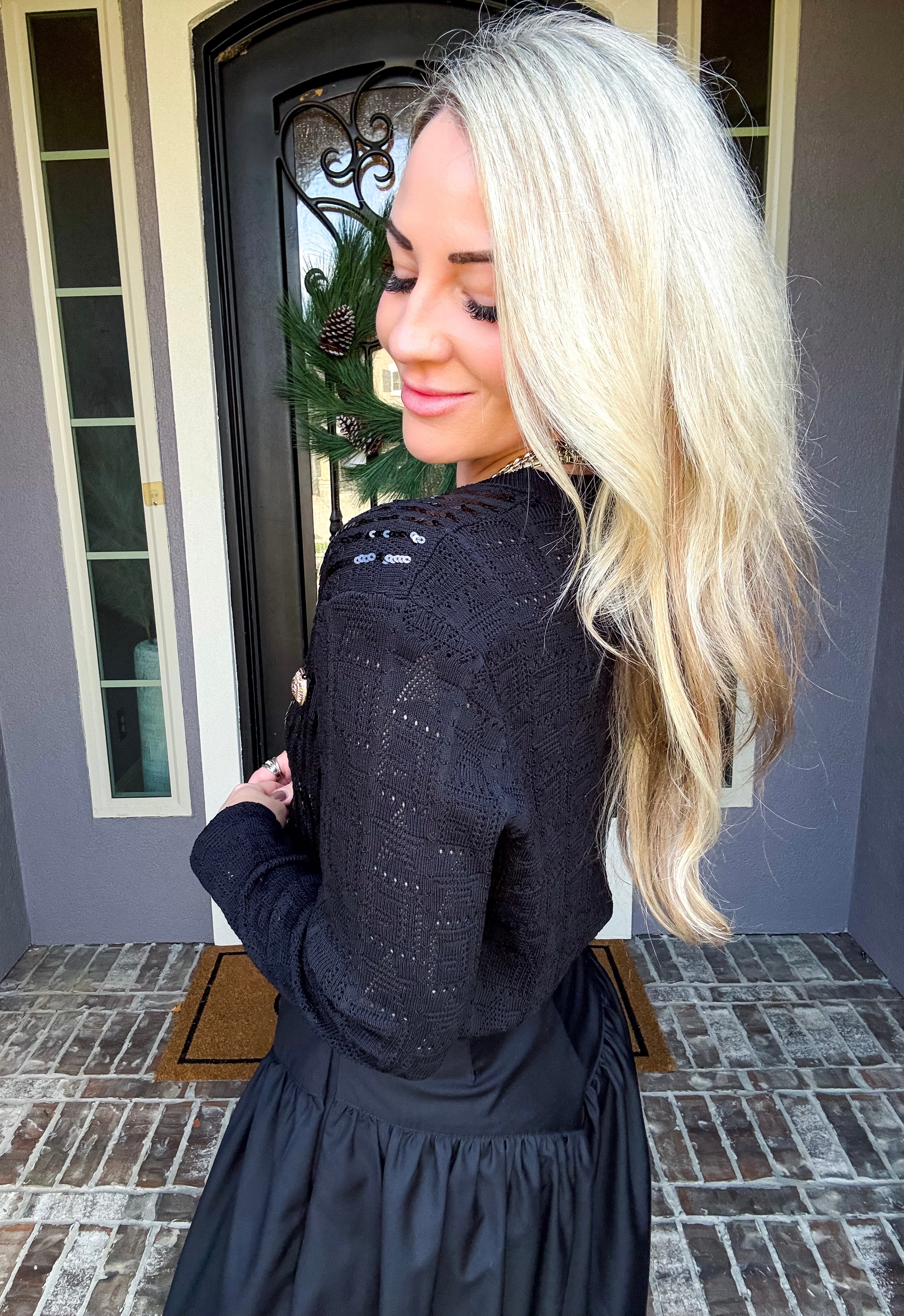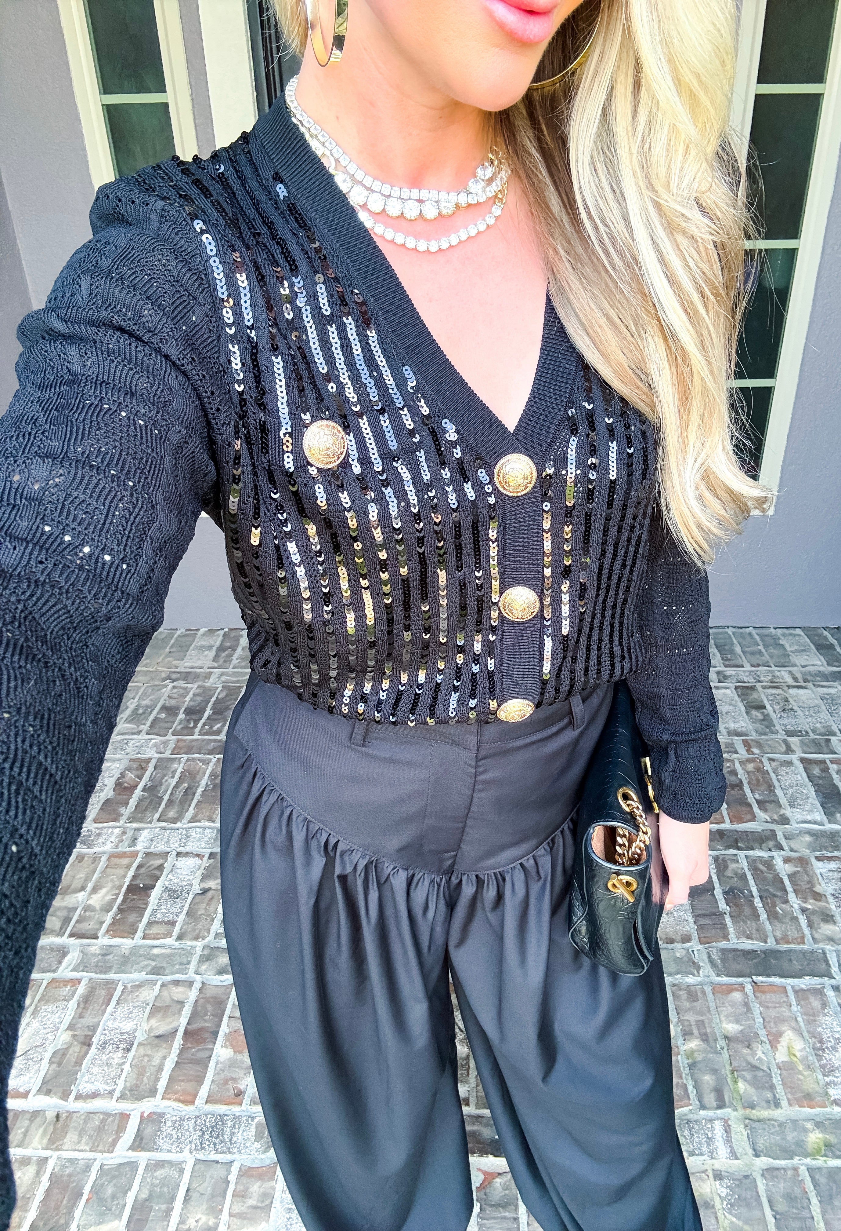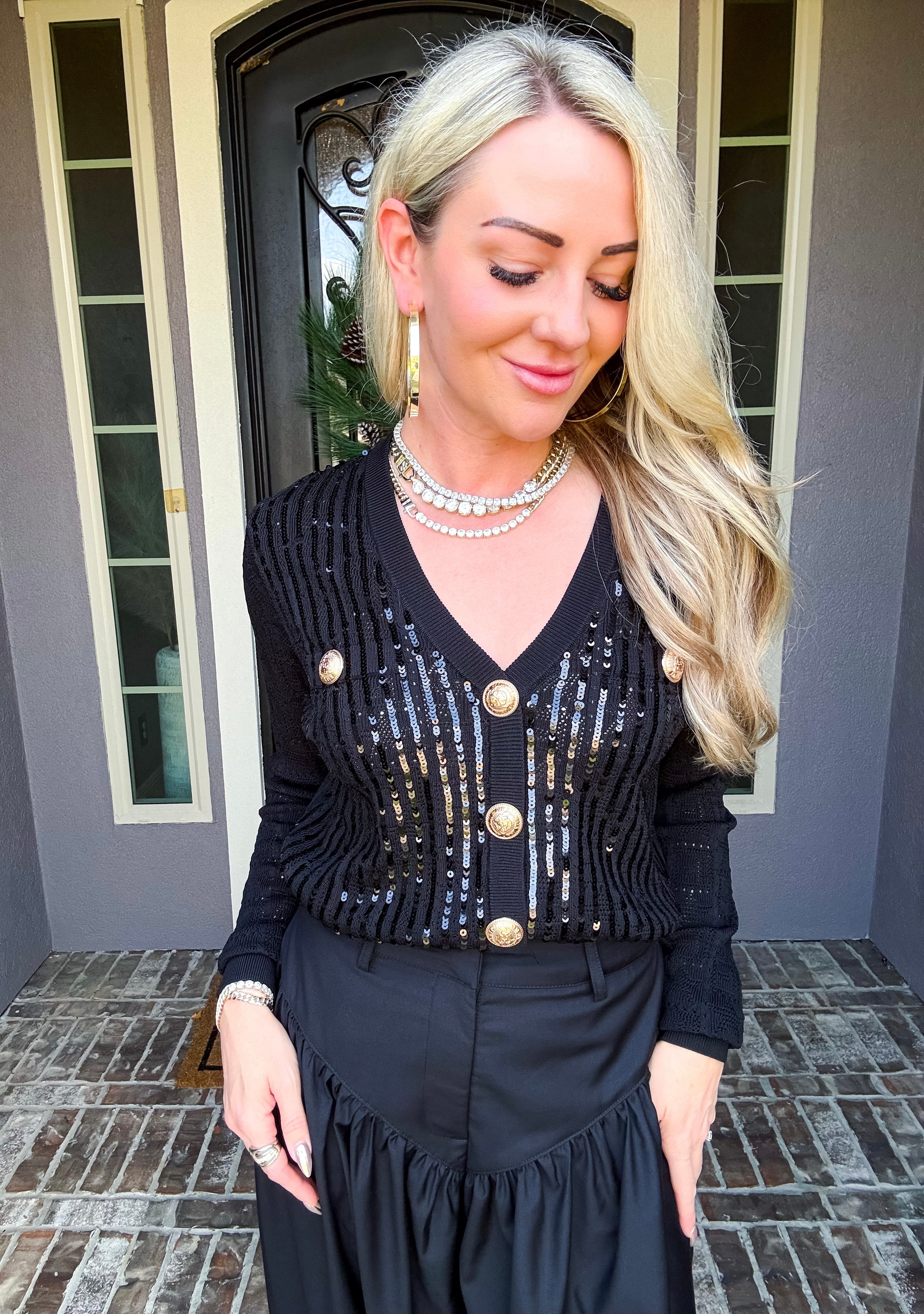 Elevate your evening wardrobe with the Rich Behavior Sequin Cardigan, a statement piece designed to turn heads. The front showcases shimmering sequins that catch the light beautifully, while luxurious gold snap buttons add refined sophistication. Crafted from stretchy material, this cardigan offers comfortable movement without sacrificing style. Perfect for layering over dresses or pairing with tailored pieces, it delivers the polished glamour that commands attention at any occasion.