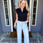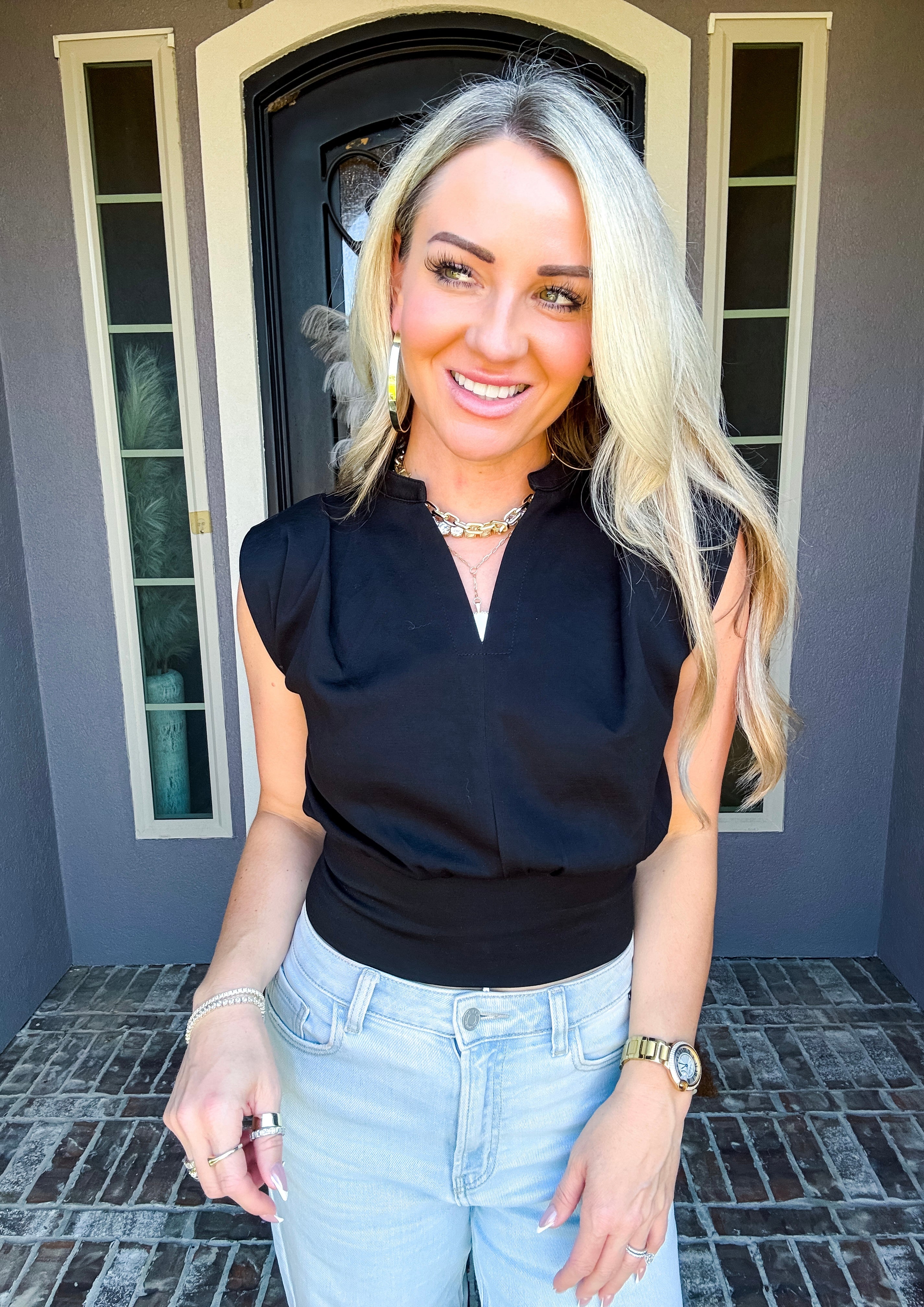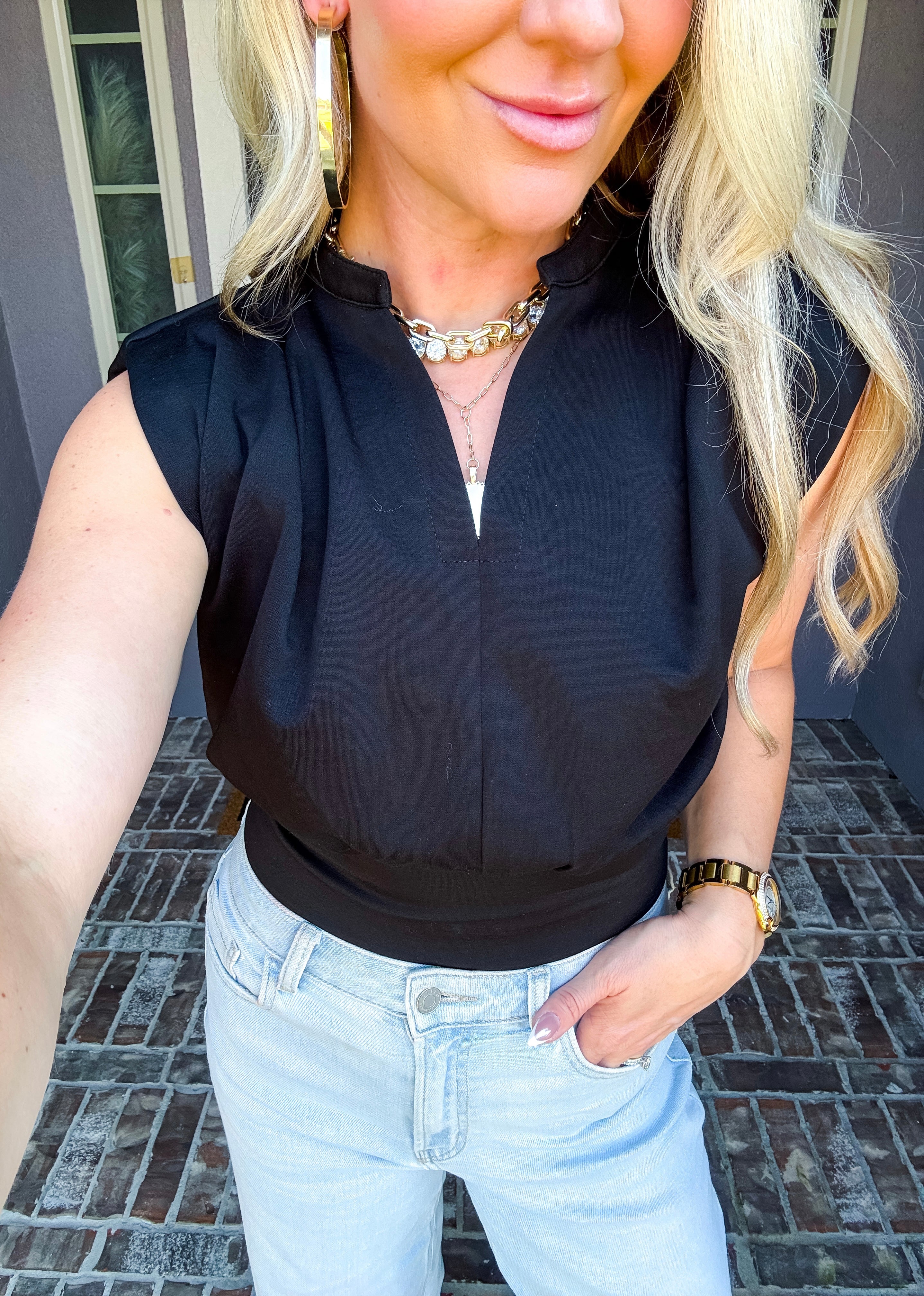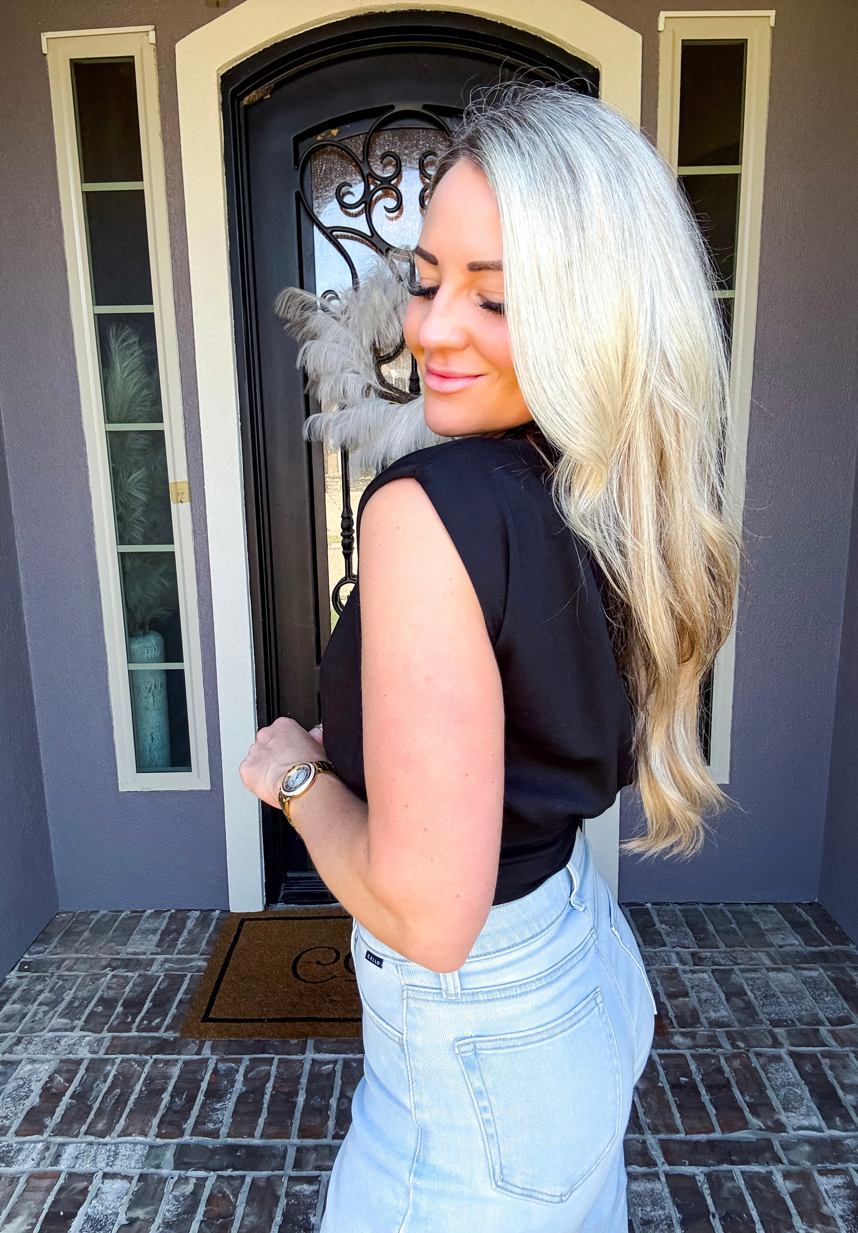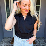 Great staple piece that pairs with every pair of bottoms in your closet! Fitted at waist, V-Neck and features a small shoulder pad to give you structure!