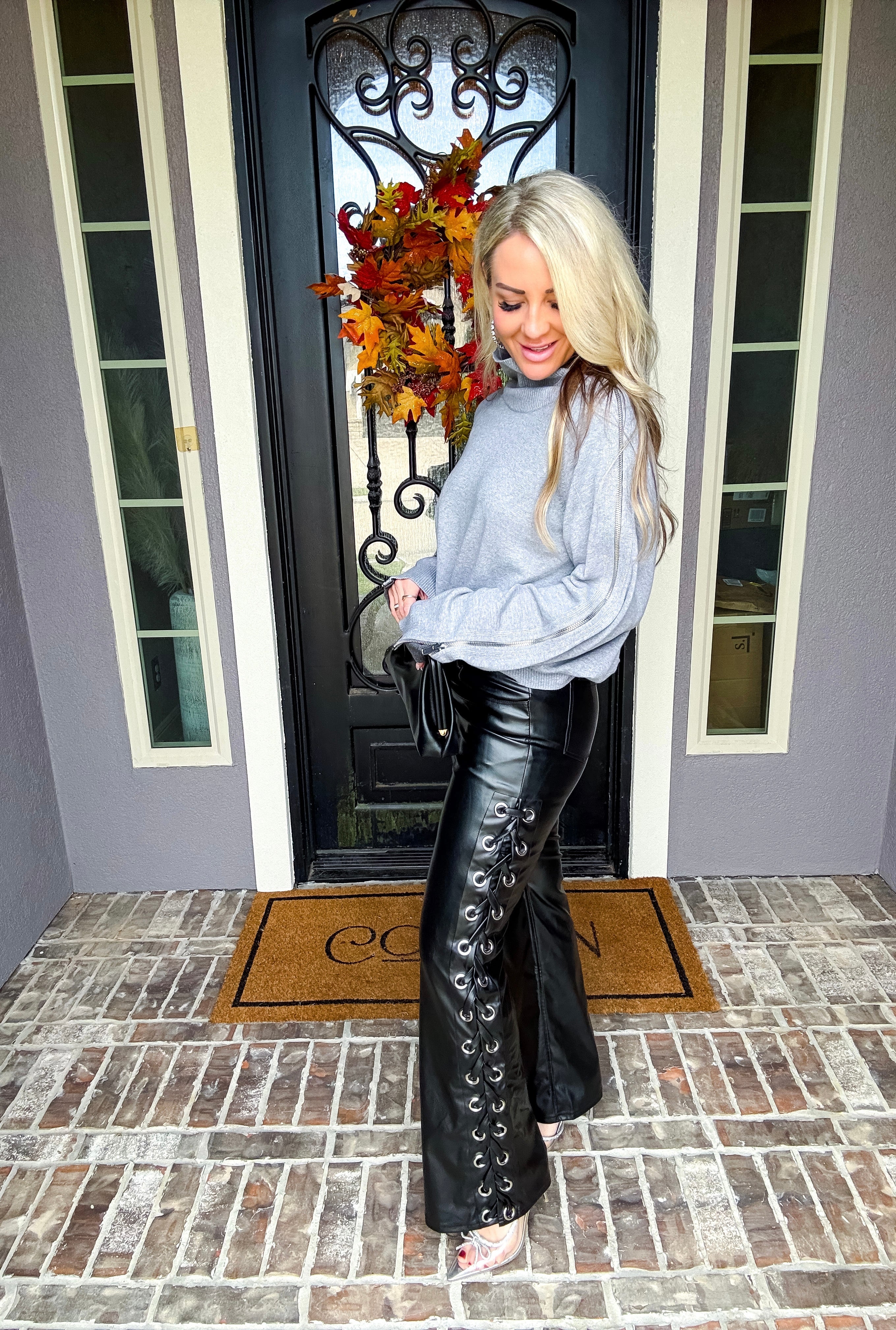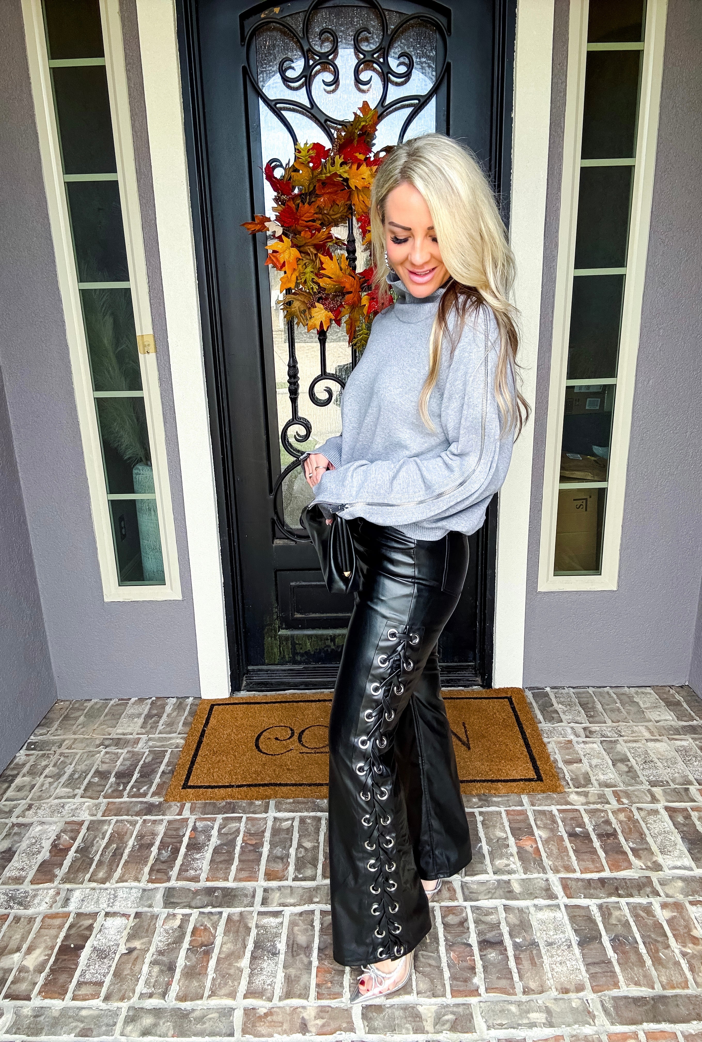 City Siren Leather Pants combine the sleek look of vegan leather with comfortable stretch fabric, ensuring a perfect fit and ease of movement. The standout lace-up sides add a bold, fashionable detail that elevates your fall and winter wardrobe. Designed for style and versatility, these pants offer both edgy appeal and practical comfort for cooler seasons.
