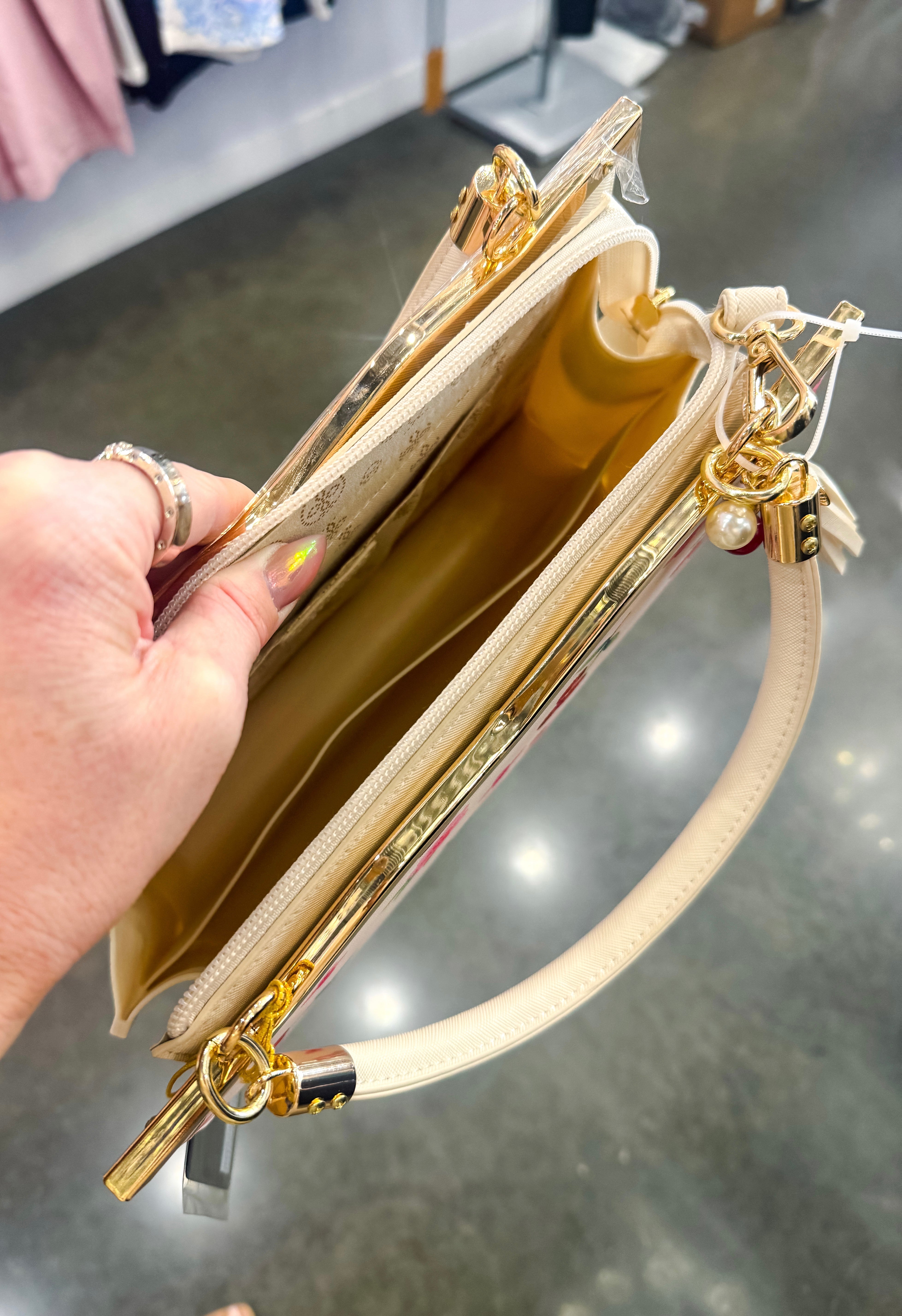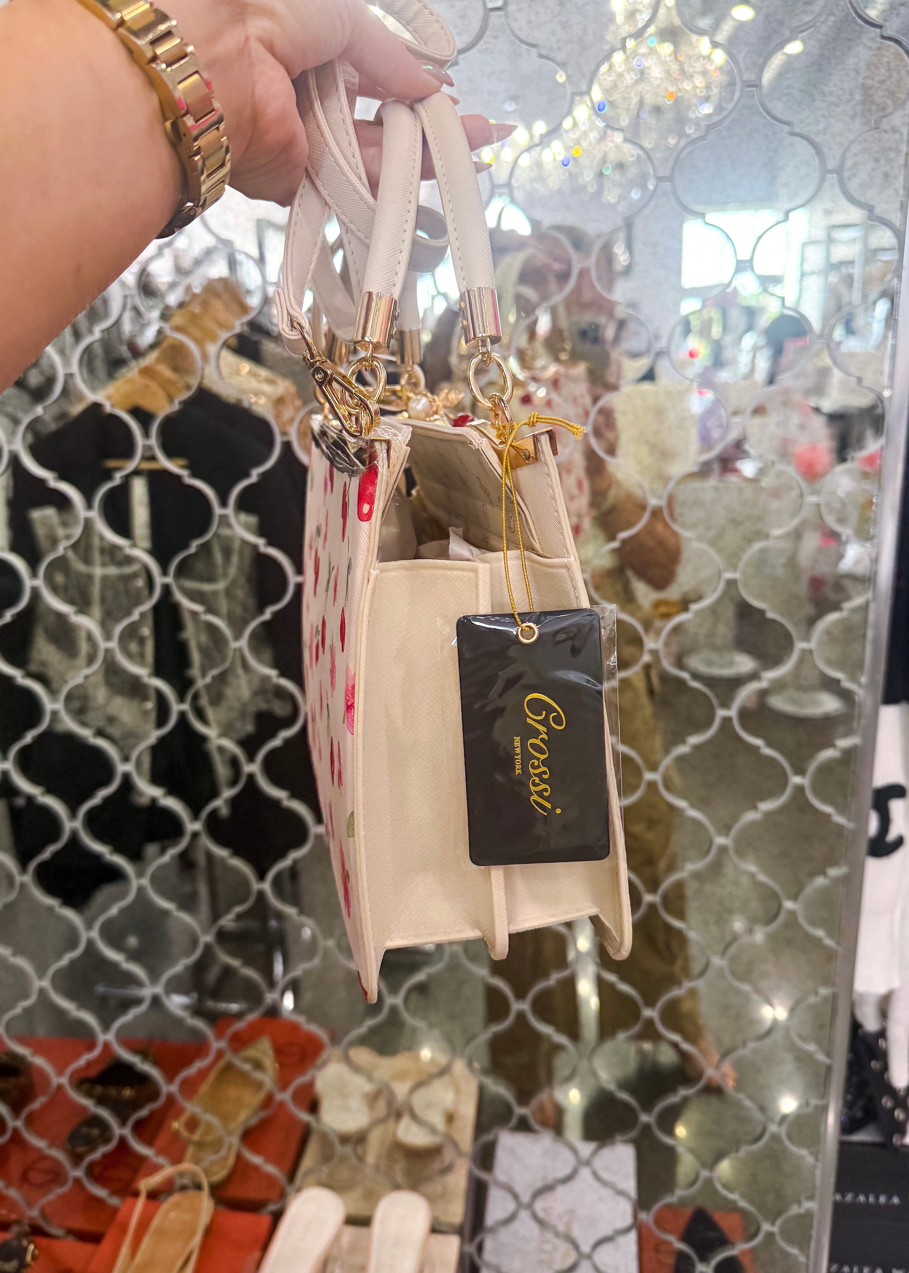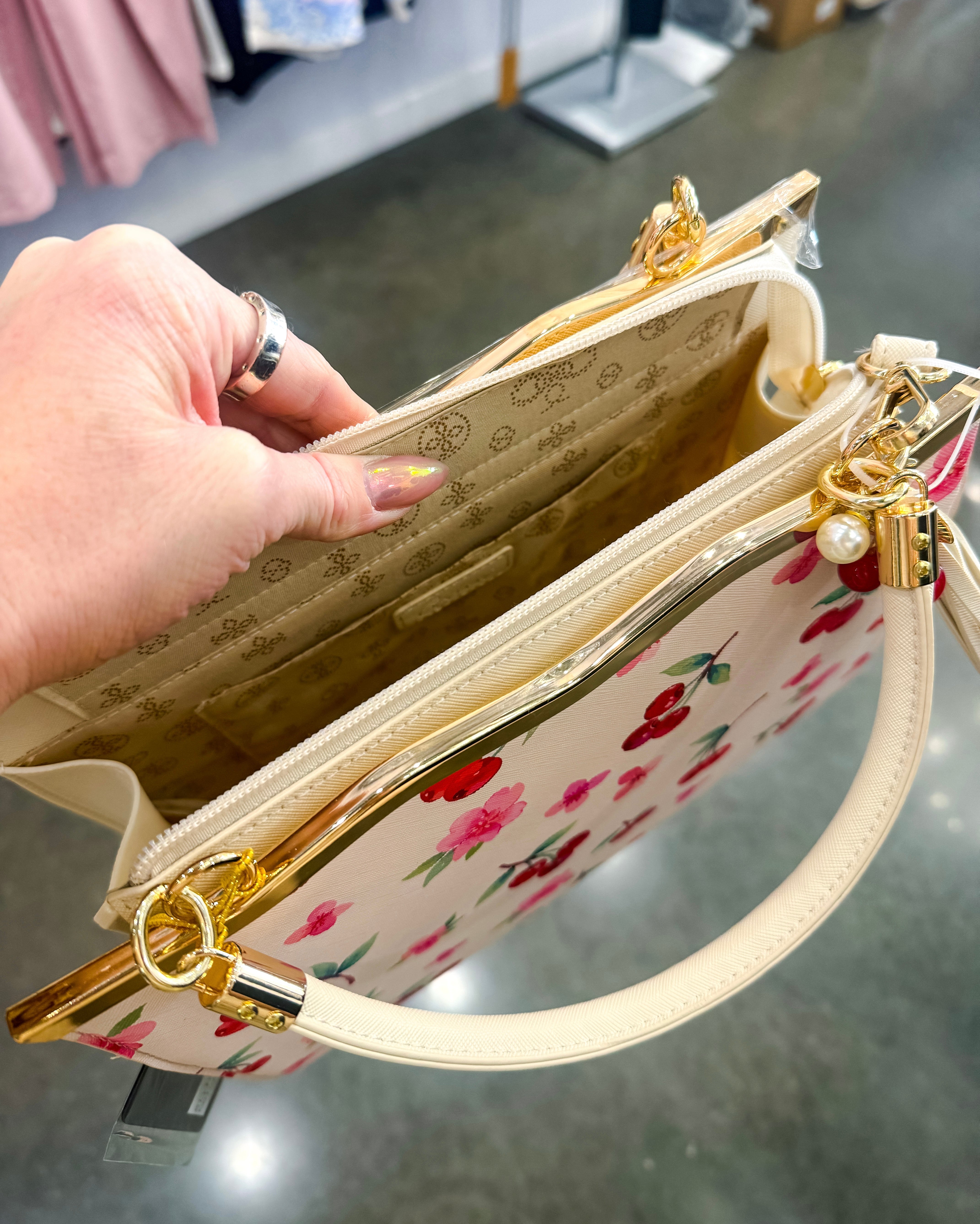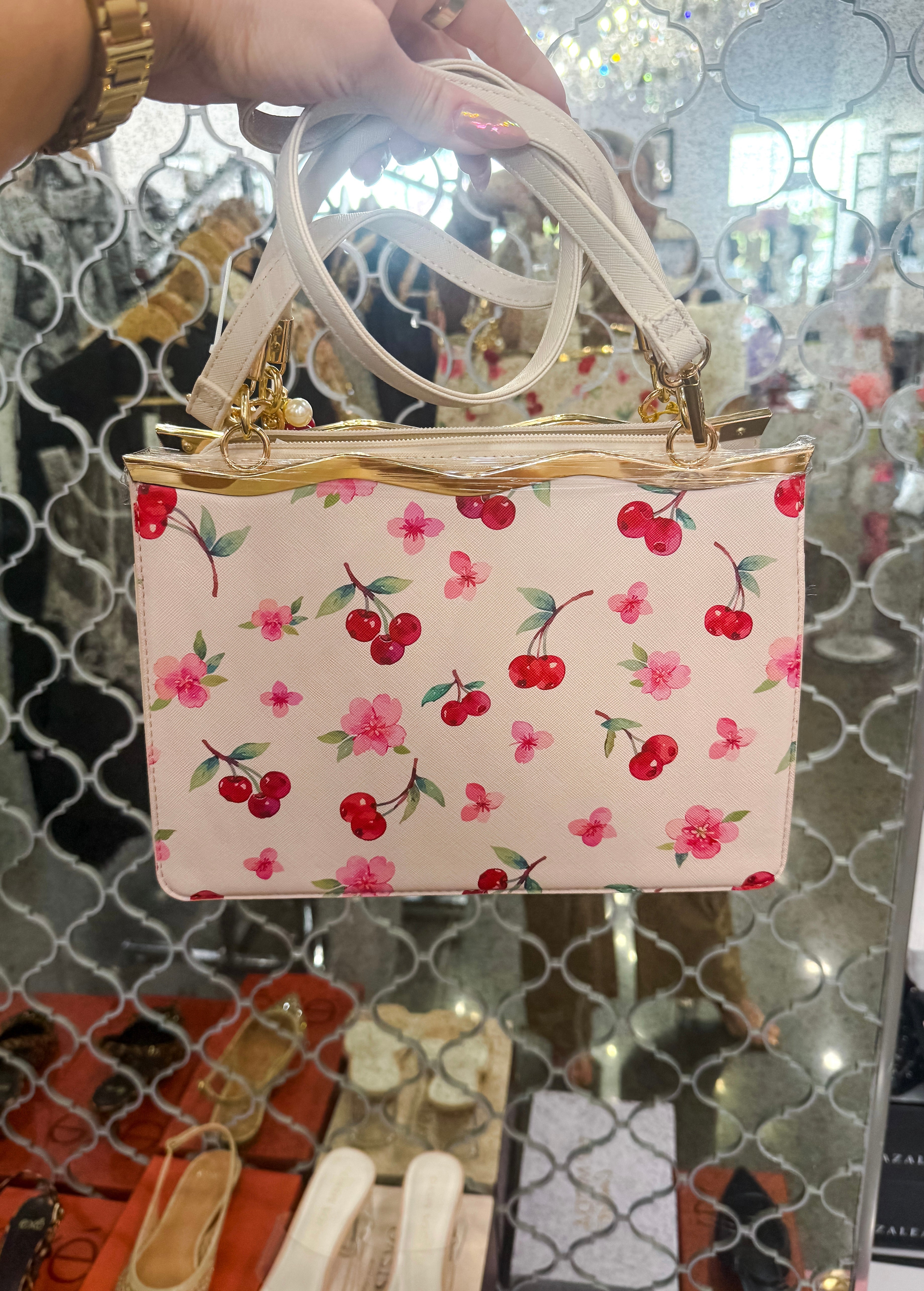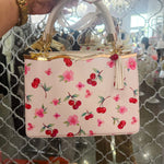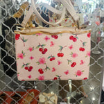 The Miranda Cherry Purse is a stunning structured handbag featuring an enchanting cherry and flower pattern that adorns both the front and back. Crafted for versatility, this beauty transitions effortlessly from a crossbody style to a traditional handbag, making it the perfect companion for any occasion. The structured silhouette provides a polished, put-together look while maintaining practical functionality. Whether you're heading to brunch, running errands, or stepping out for an evening, The Miranda delivers timeless elegance with a charming botanical touch.