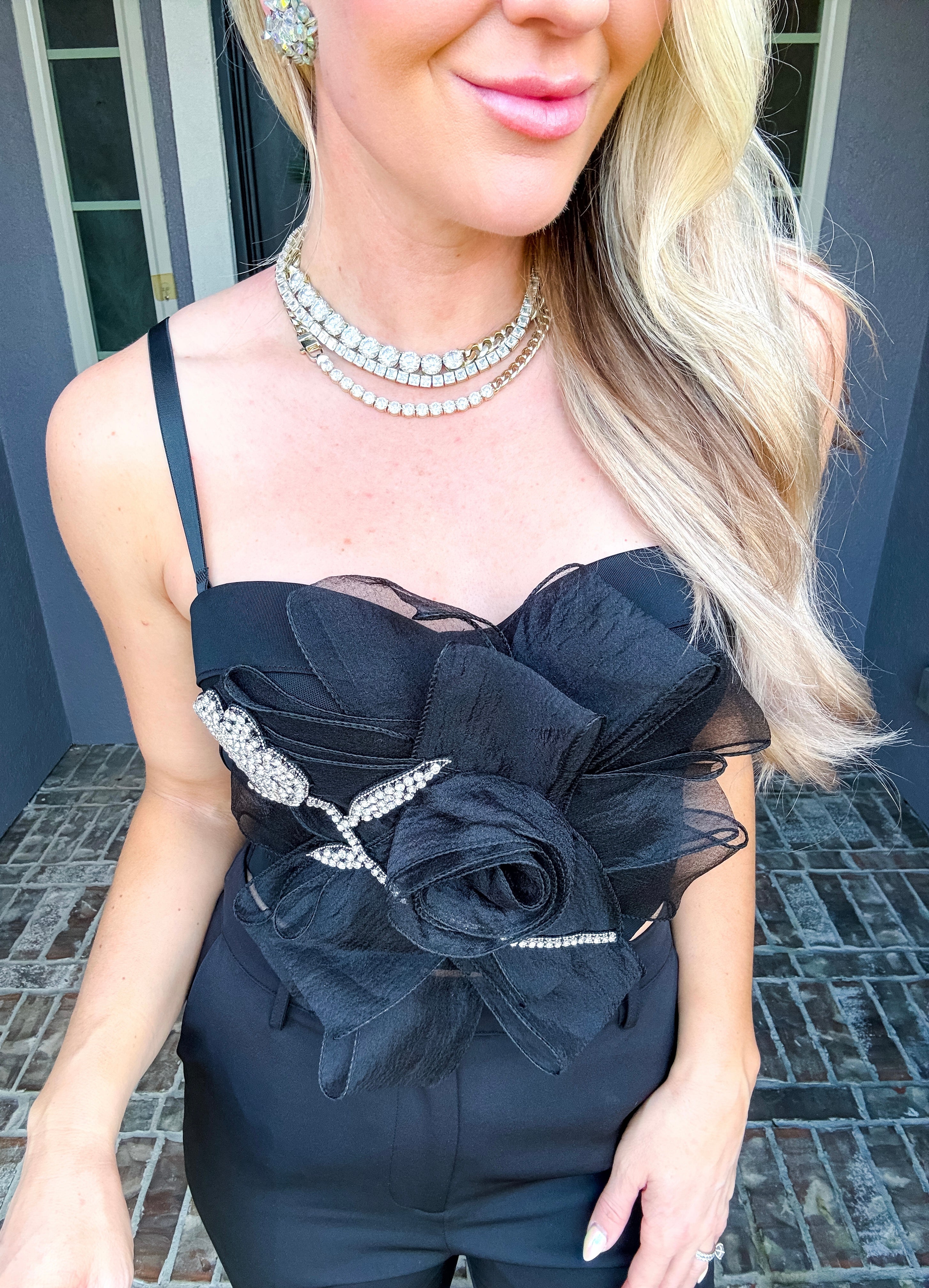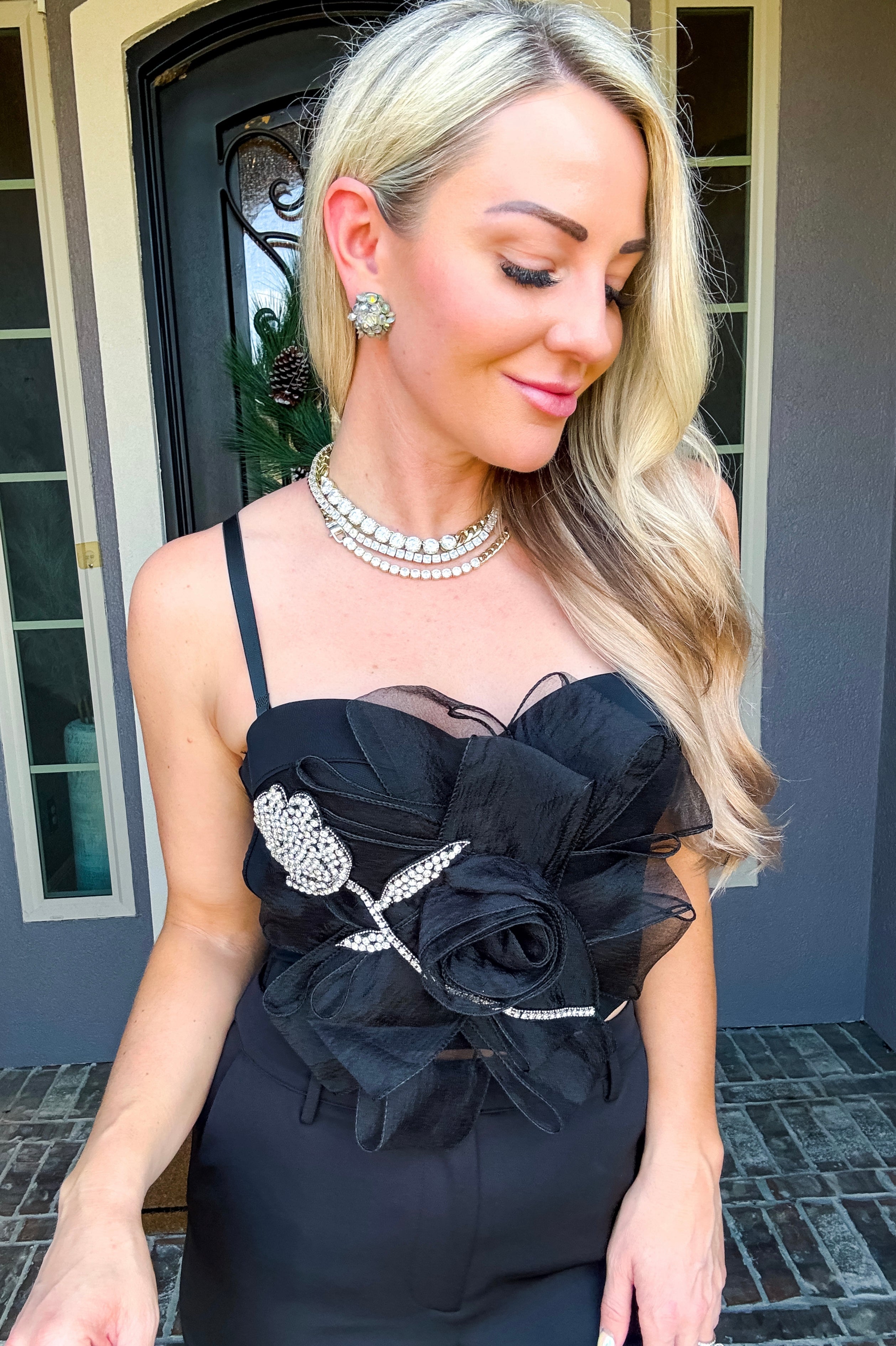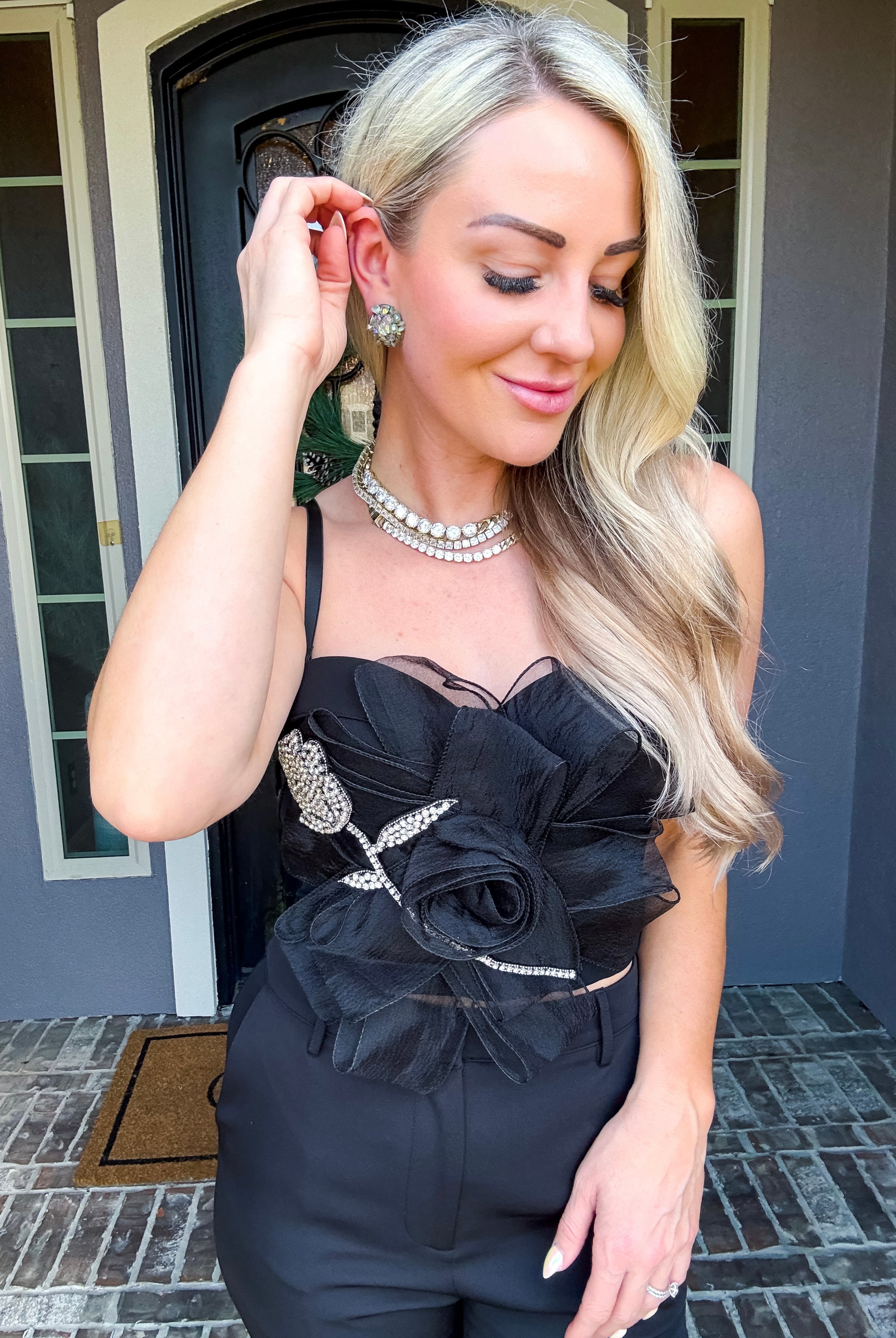 Elevate your wardrobe with this stunning black top featuring an intricate 3D flower design and a gorgeous jeweled rose detail. Versatile and eye-catching, it transitions effortlessly from casual to polished—pair it with jeans for a relaxed look or style it with trousers for an elegant evening out. A statement piece that works as hard as you do.