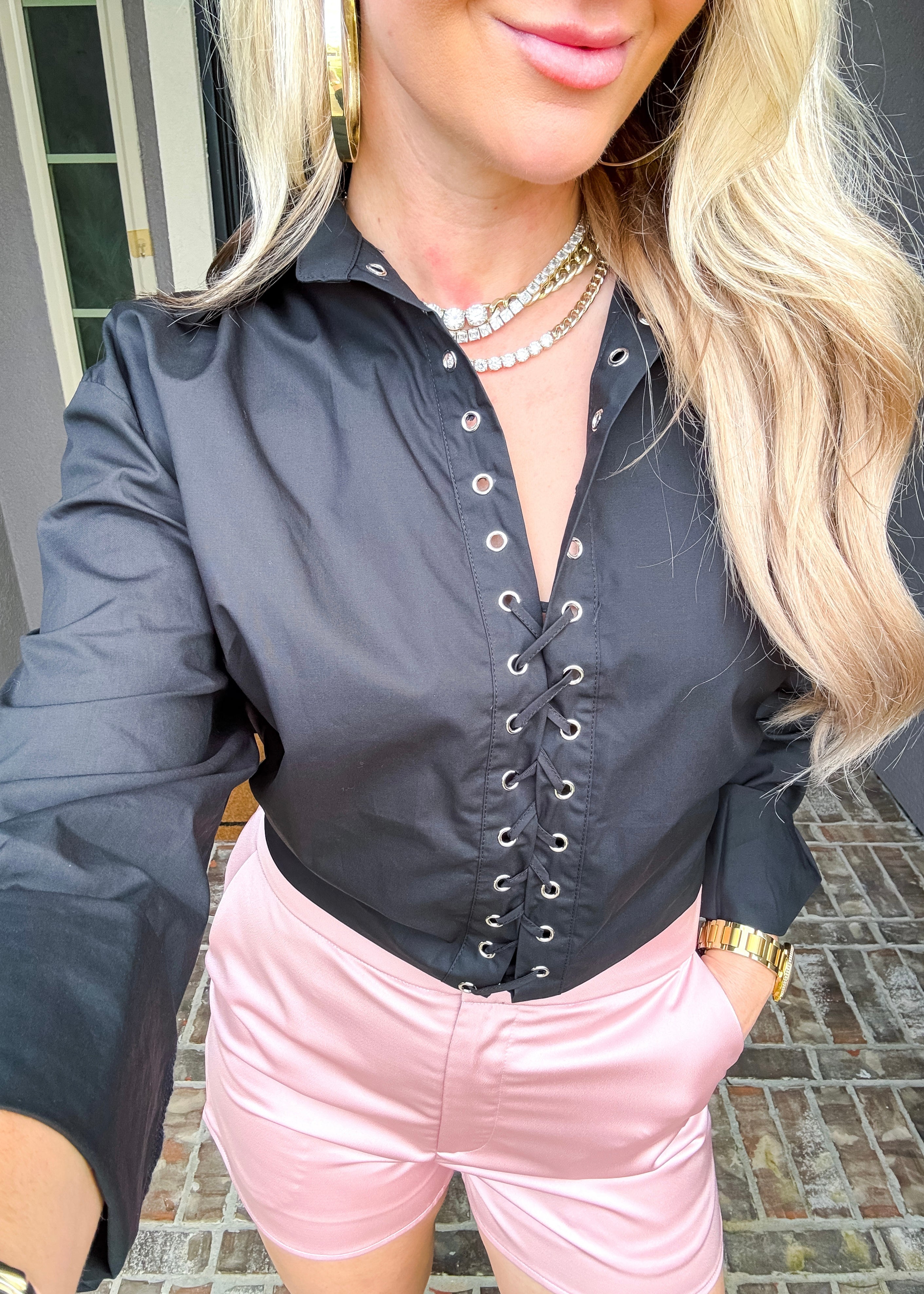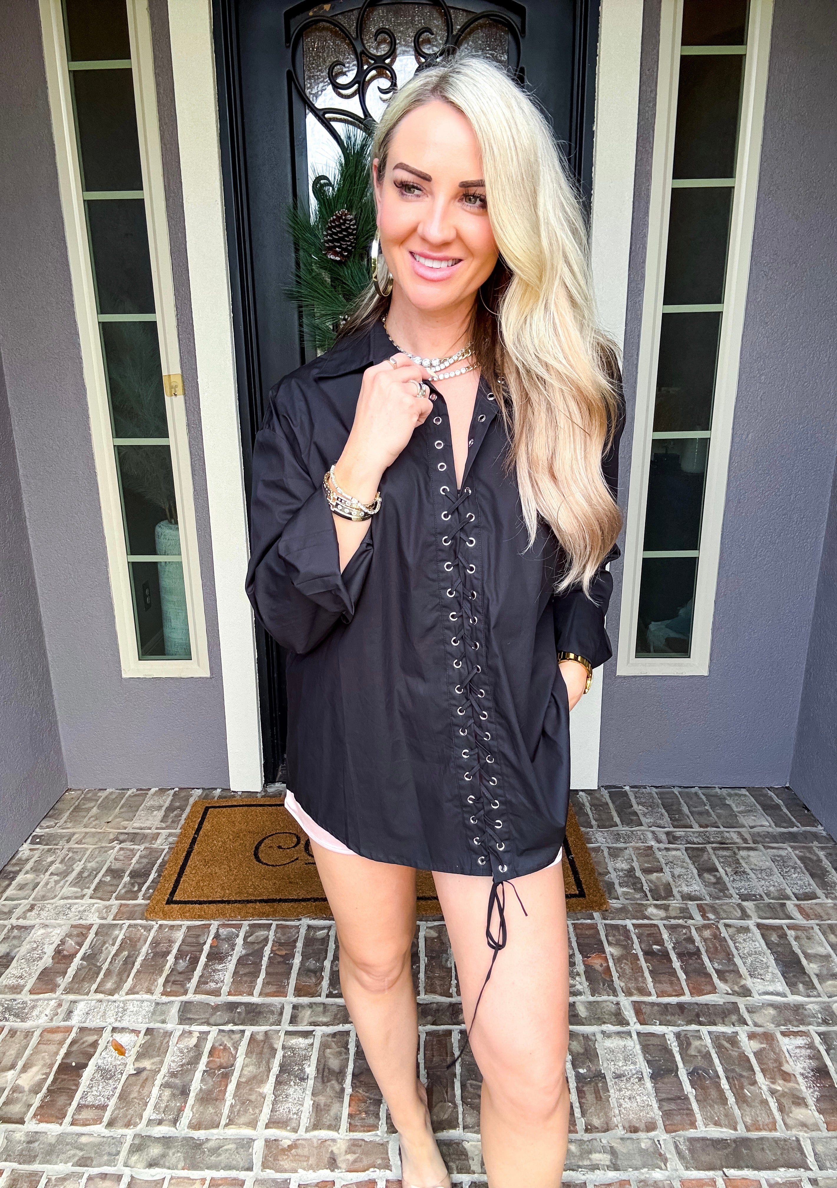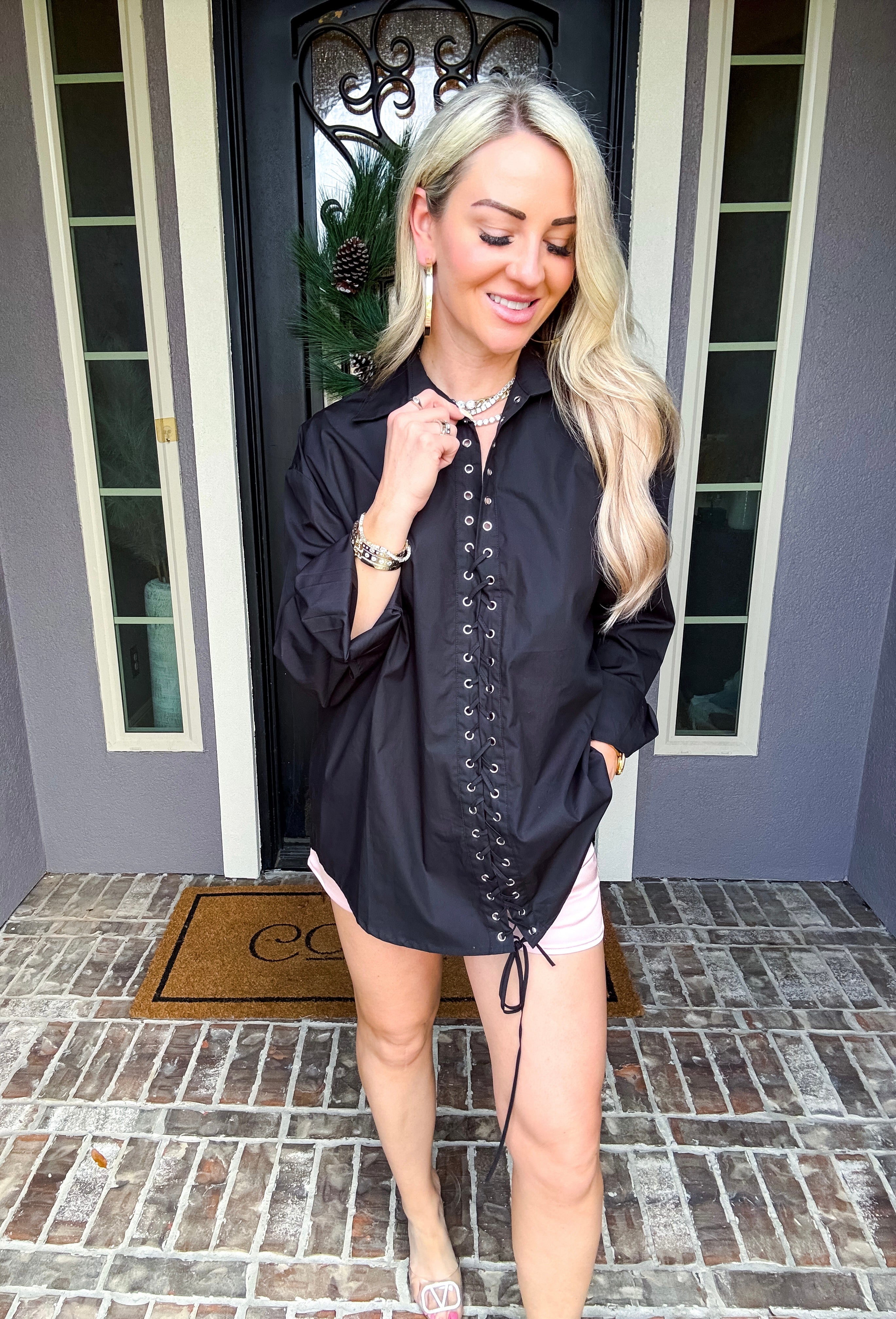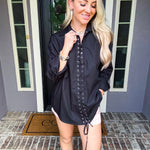 Elevate your wardrobe with this stunning collared blouse featuring delicate lace-up front detailing. The extended length provides flattering coverage while the classic collar adds polish to any outfit. Perfect for layering or wearing solo, this versatile piece transitions seamlessly from office to evening wear. The front lacing creates an adjustable fit and eye-catching visual interest that sets it apart from everyday basics.