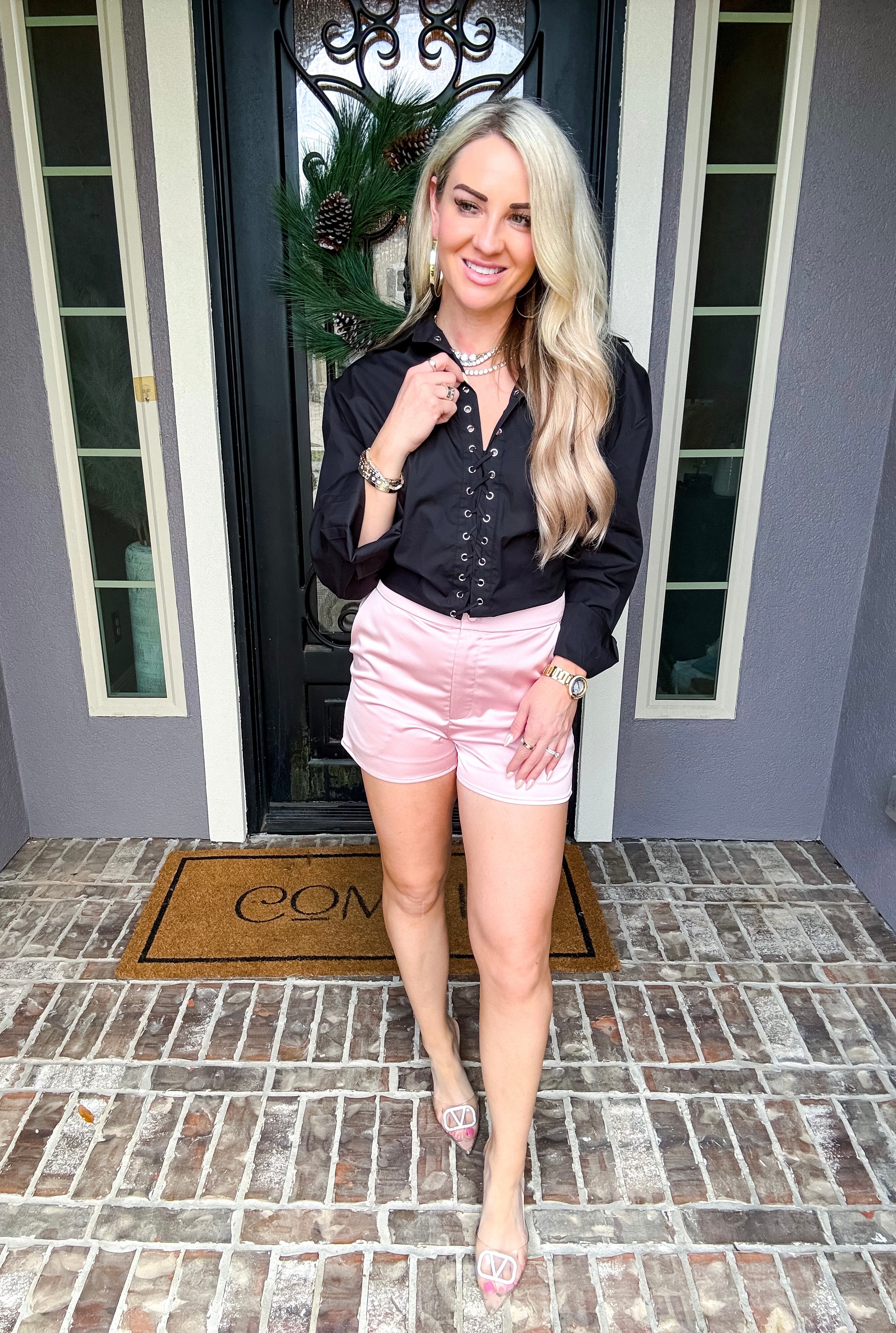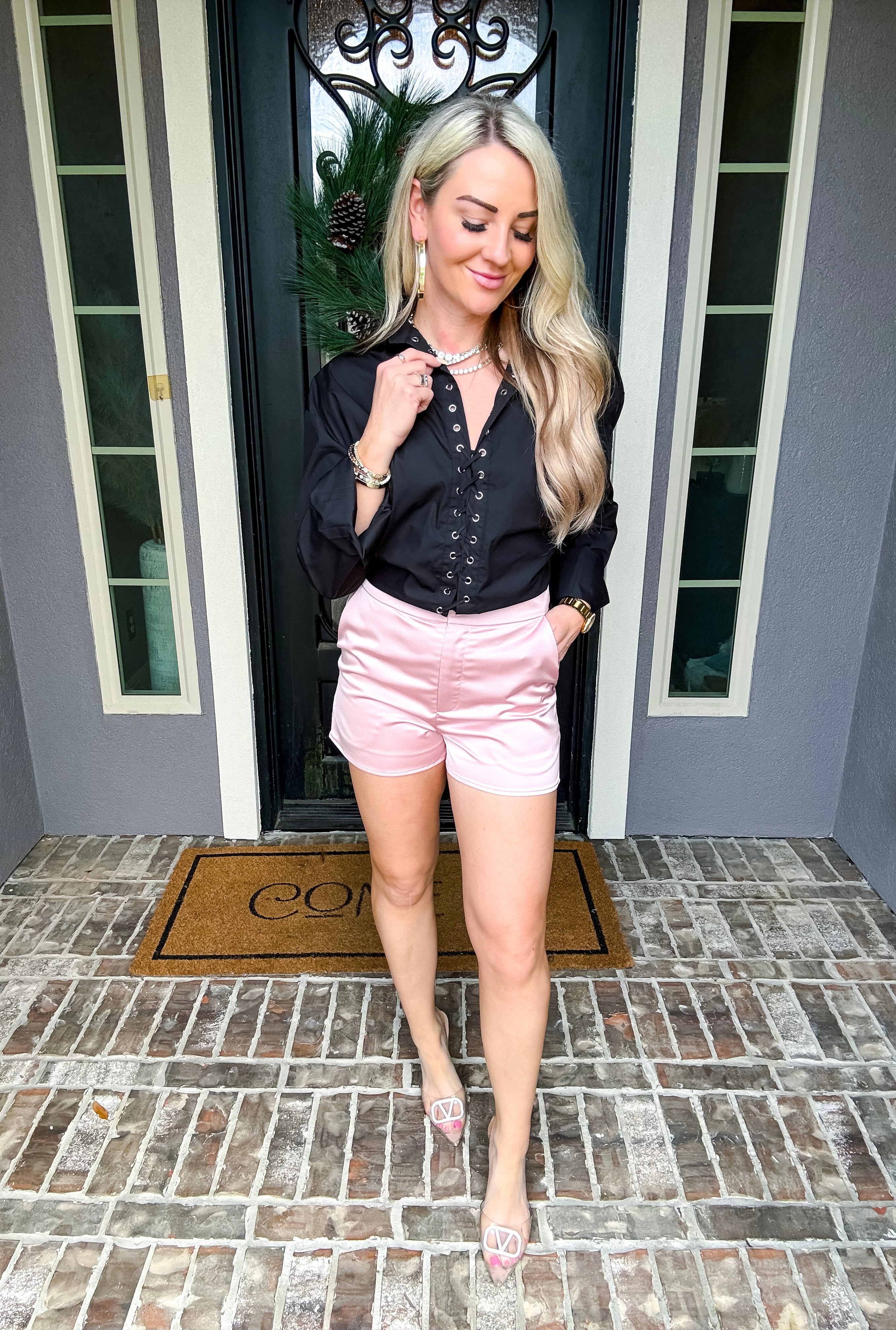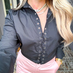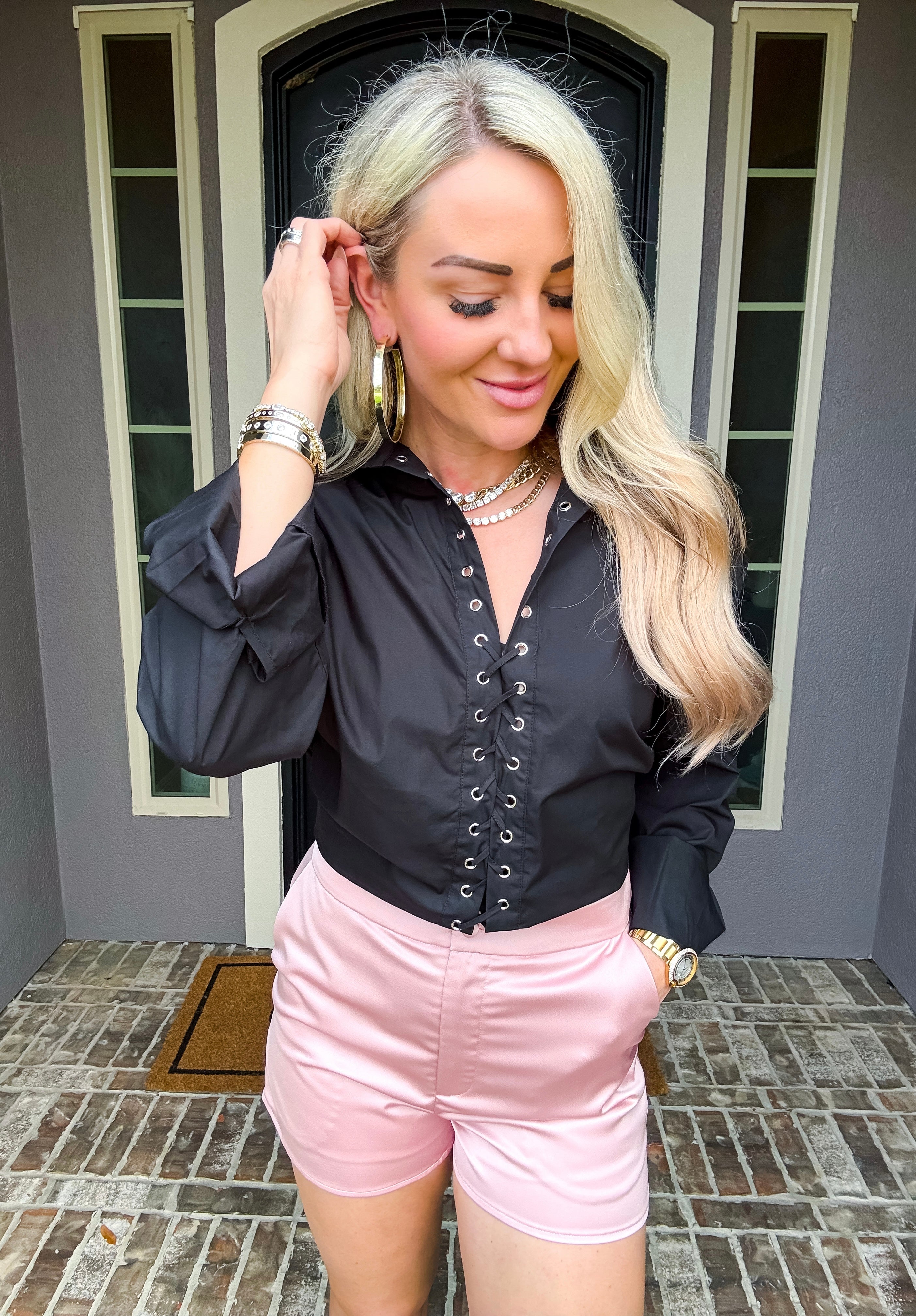 Elevate your wardrobe with this stunning collared blouse featuring delicate lace-up front detailing. The extended length provides flattering coverage while the classic collar adds polish to any outfit. Perfect for layering or wearing solo, this versatile piece transitions seamlessly from office to evening wear. The front lacing creates an adjustable fit and eye-catching visual interest that sets it apart from everyday basics.