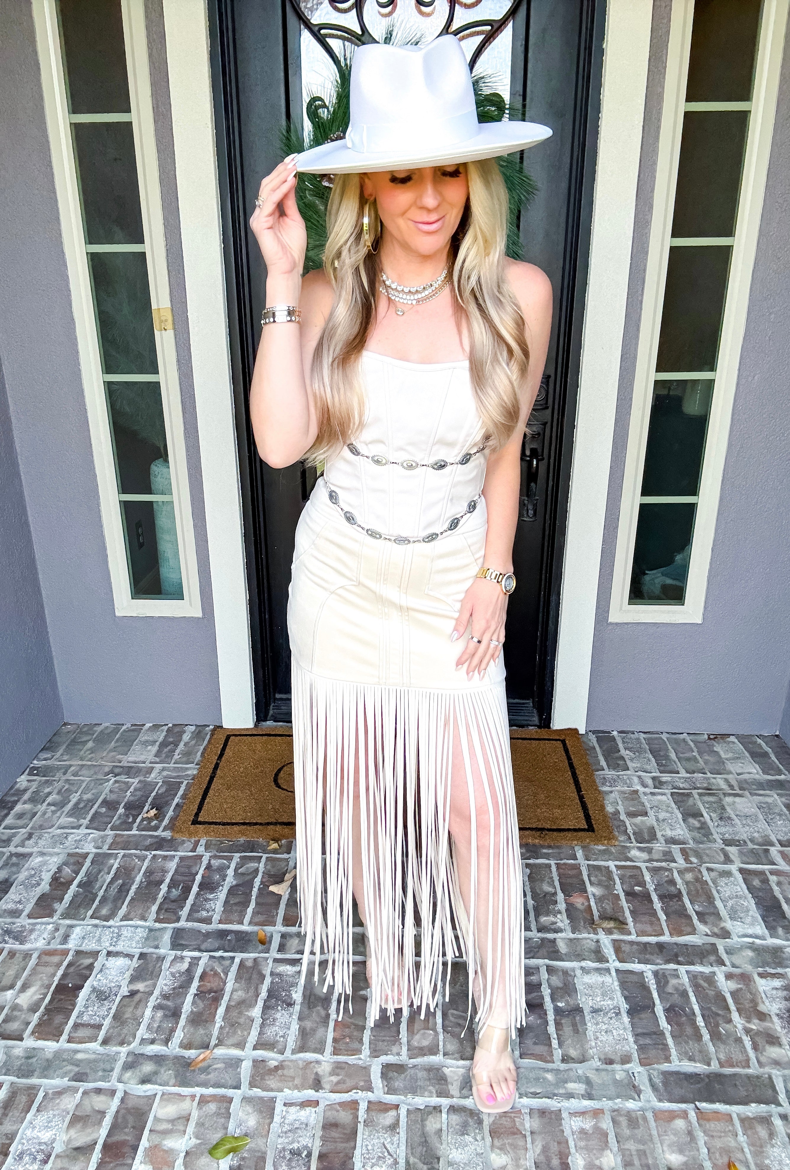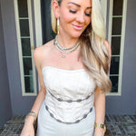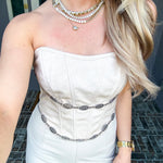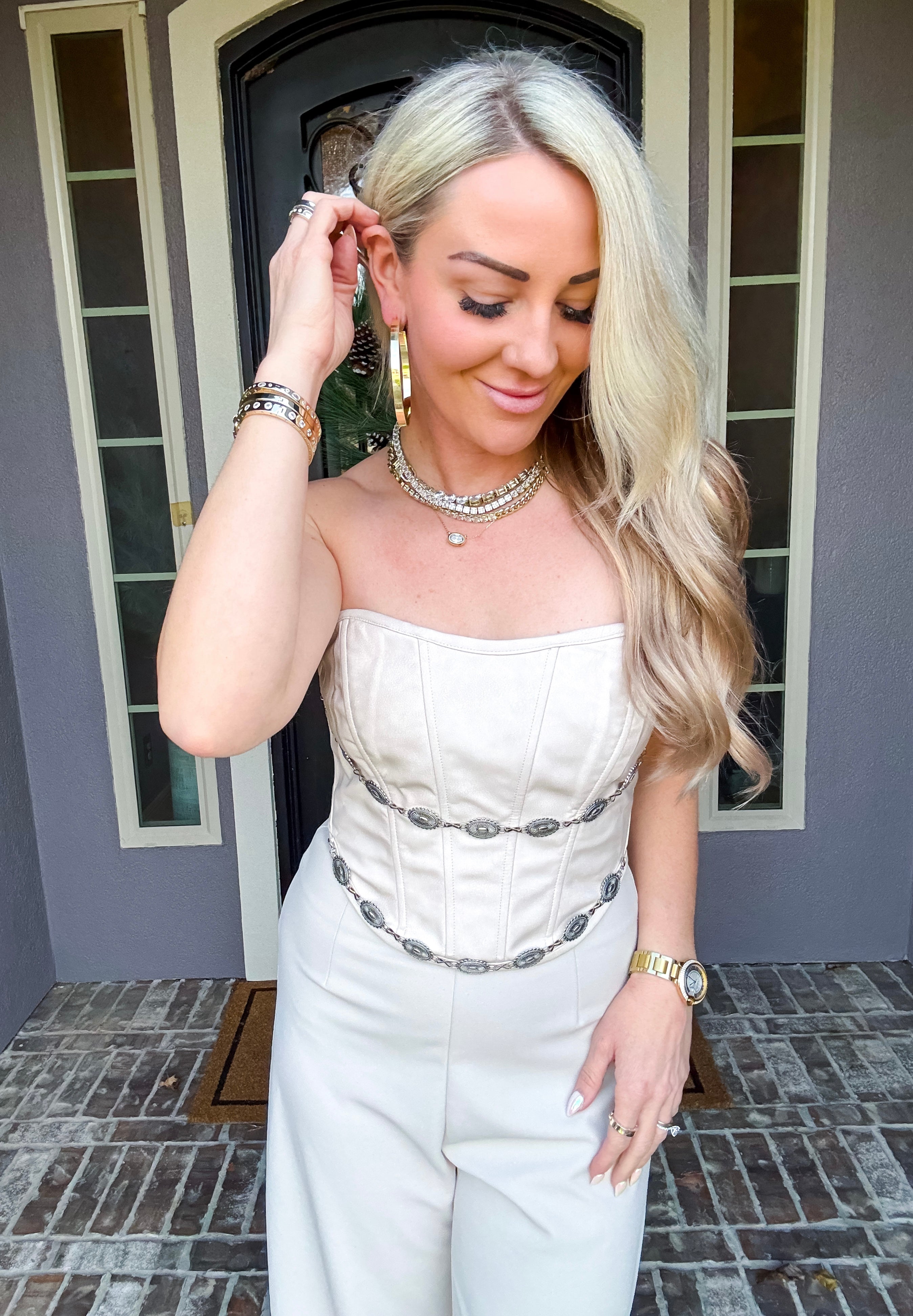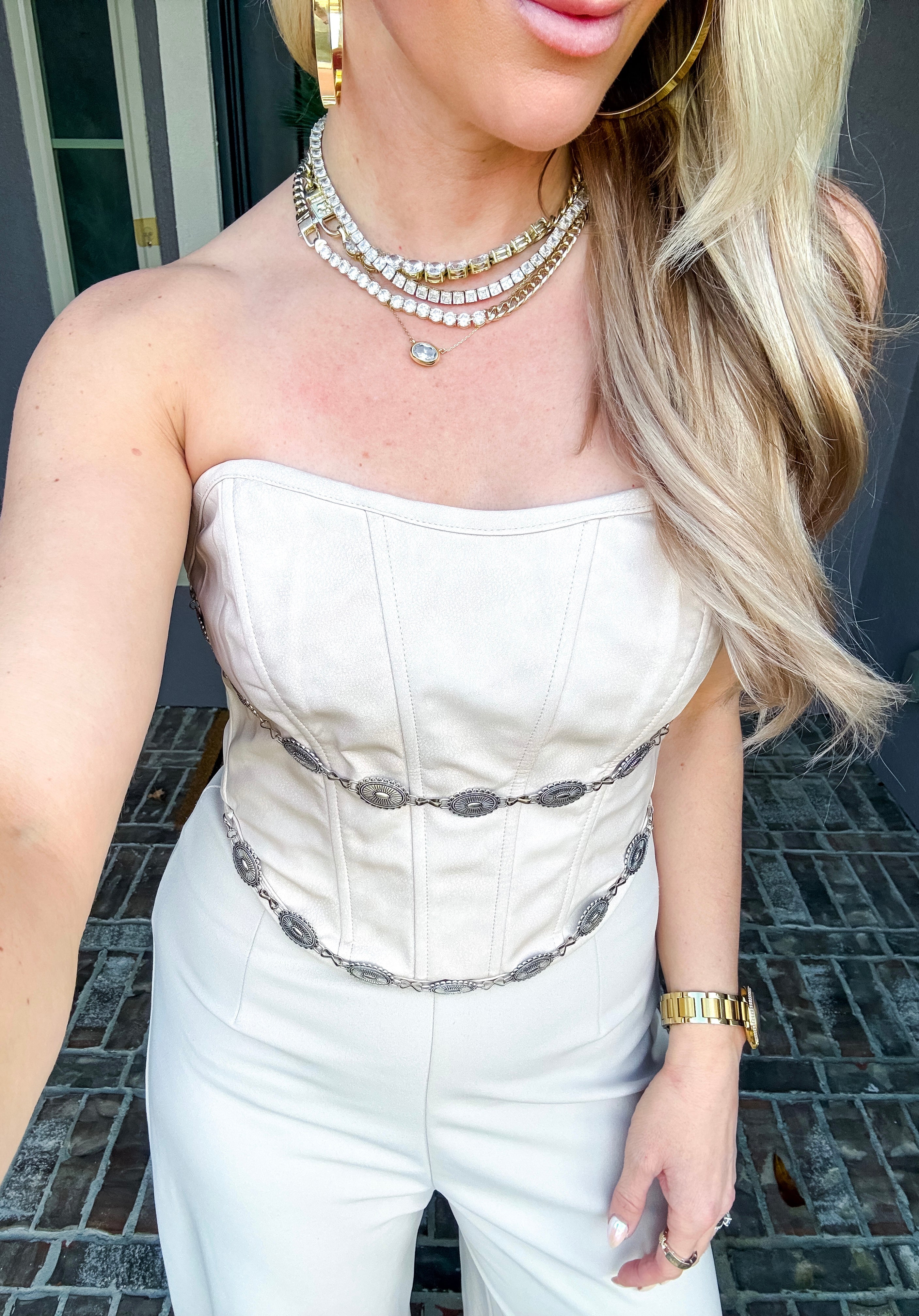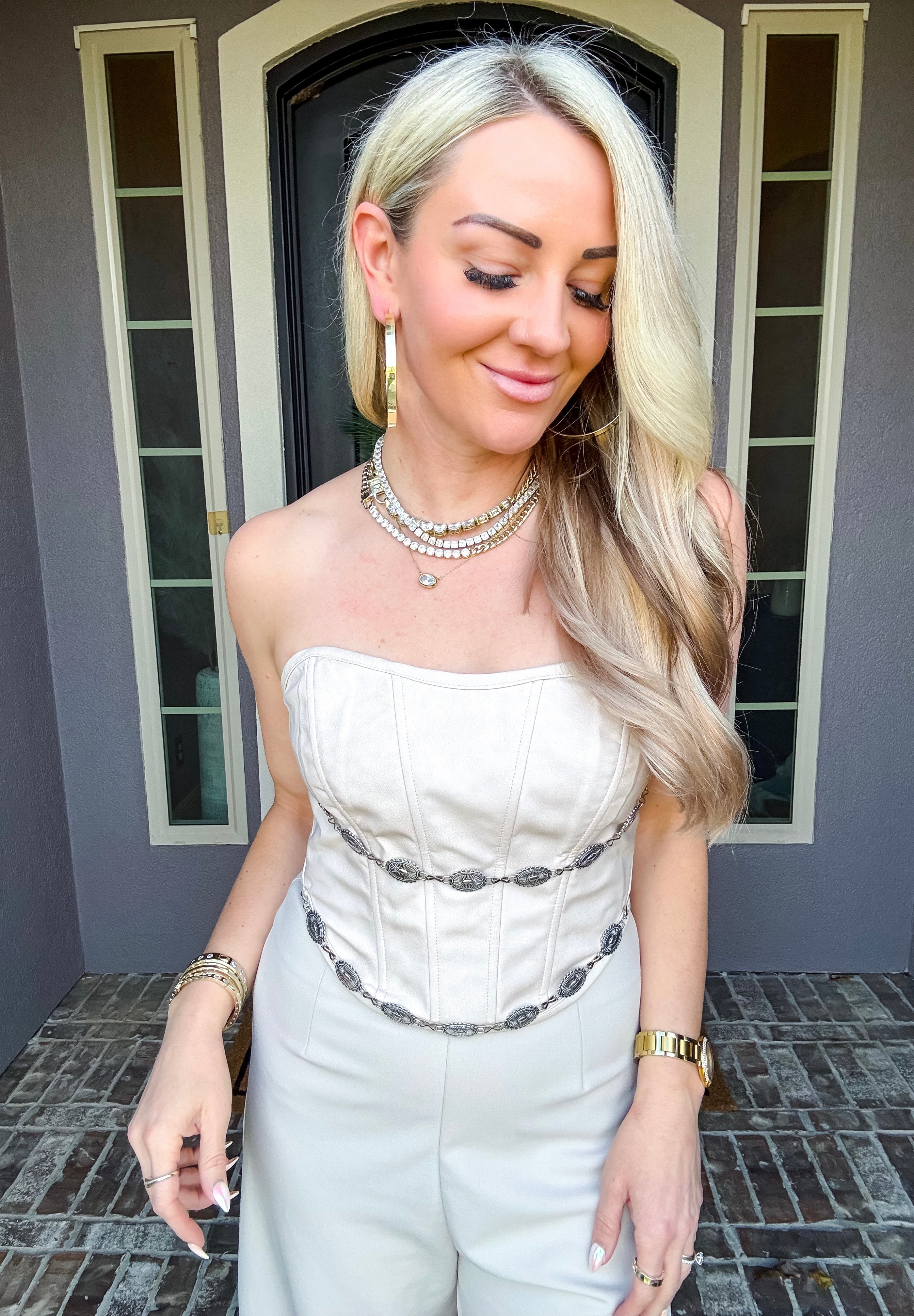 Elevate your wardrobe with this stunning Western Socialite Leather Corset Top. Crafted with premium leather and adorned with eye-catching silver statement pieces, this piece combines bold western-inspired style with sophisticated elegance. The structured corset design flatters your silhouette while the metallic accents add a touch of glamour perfect for nights out or special occasions. A versatile statement piece that transitions effortlessly from casual to dressed-up looks.