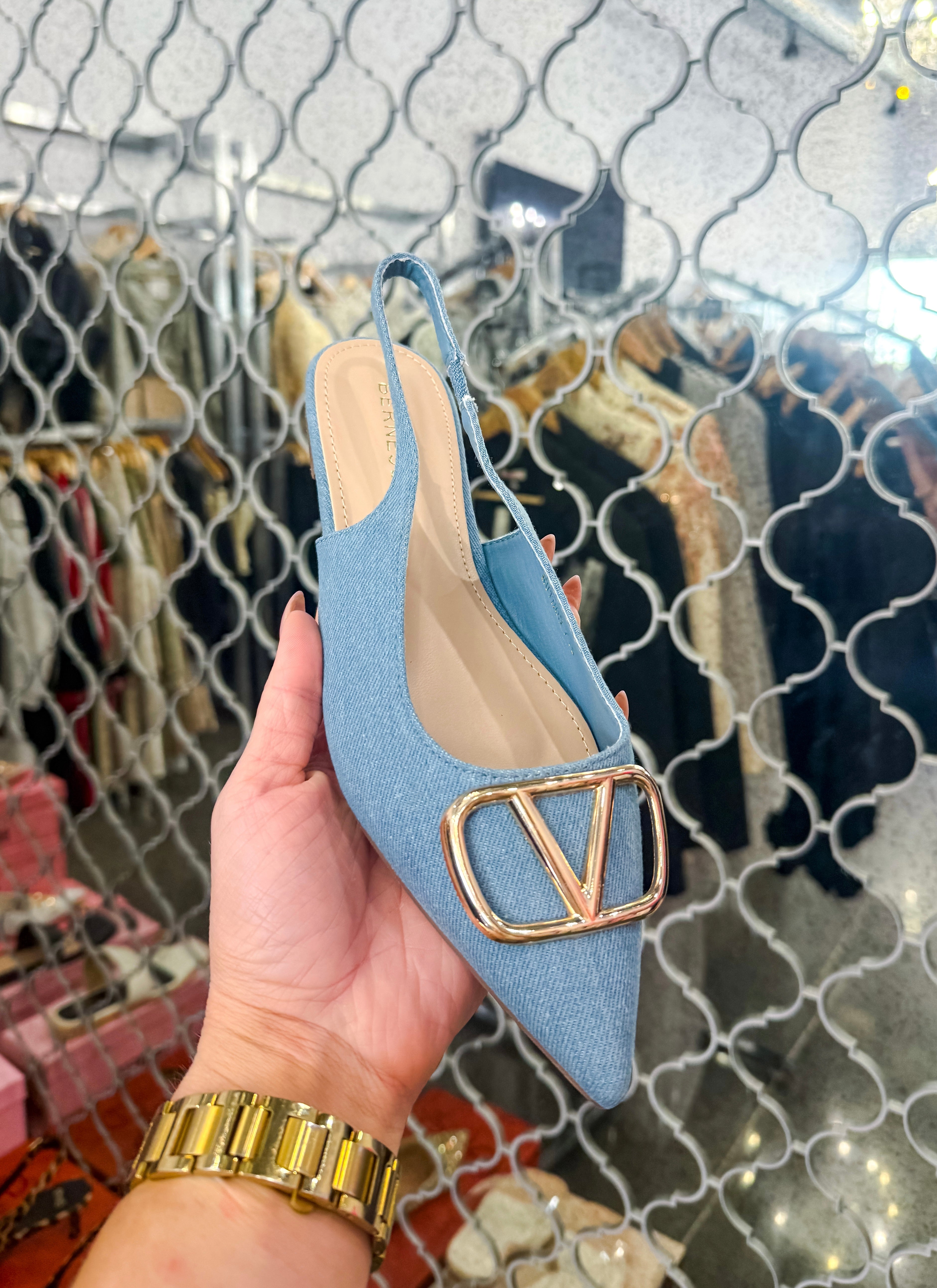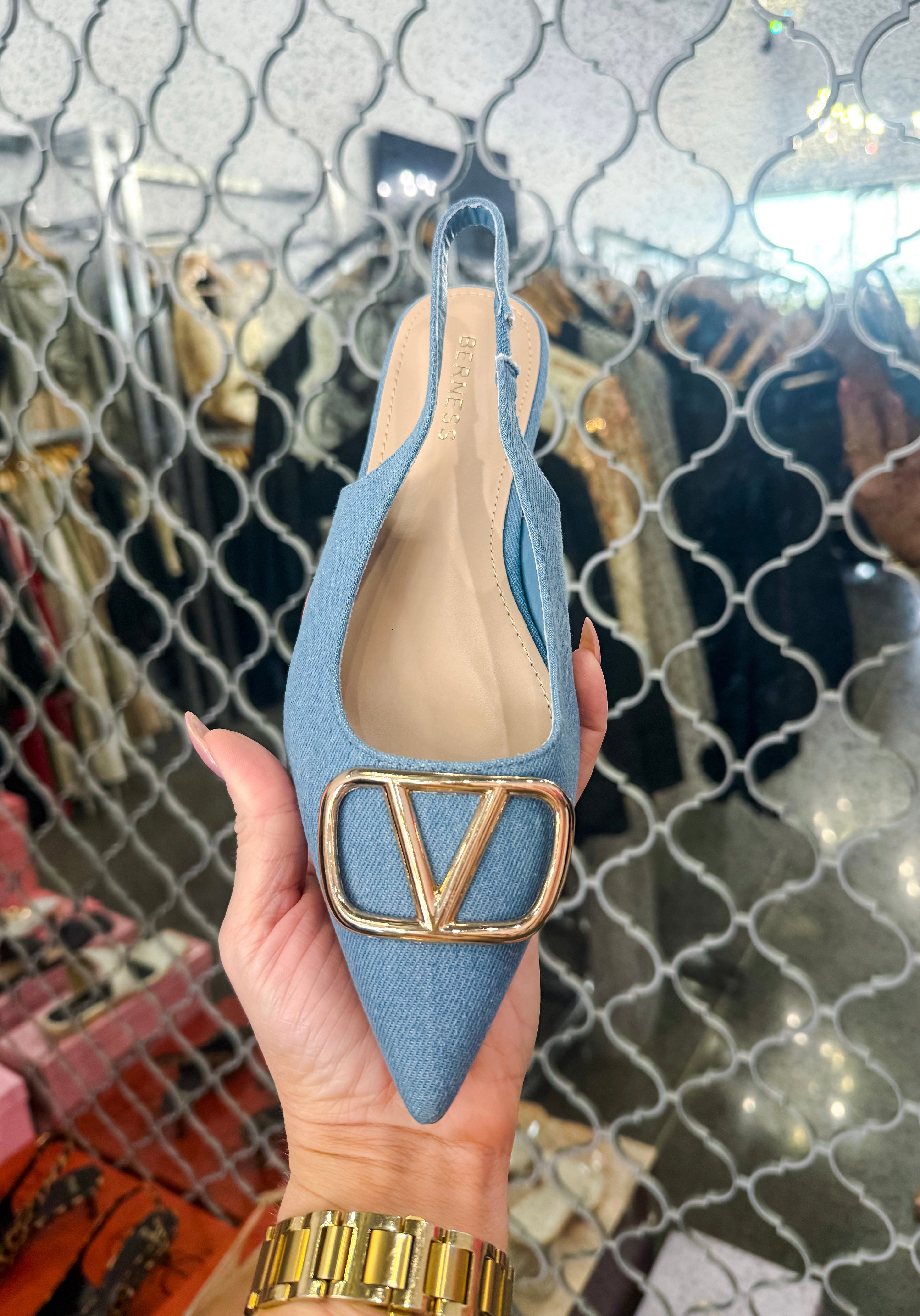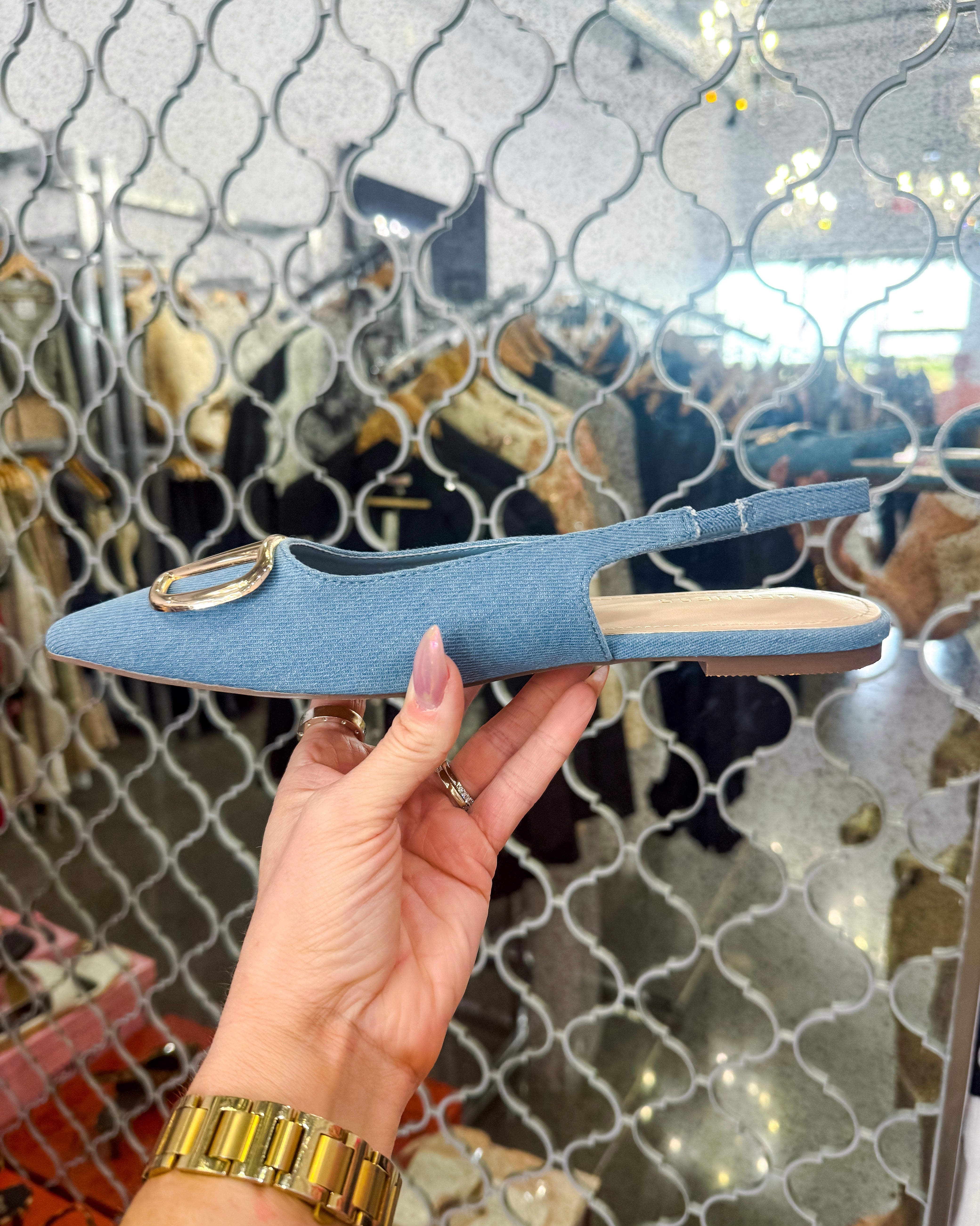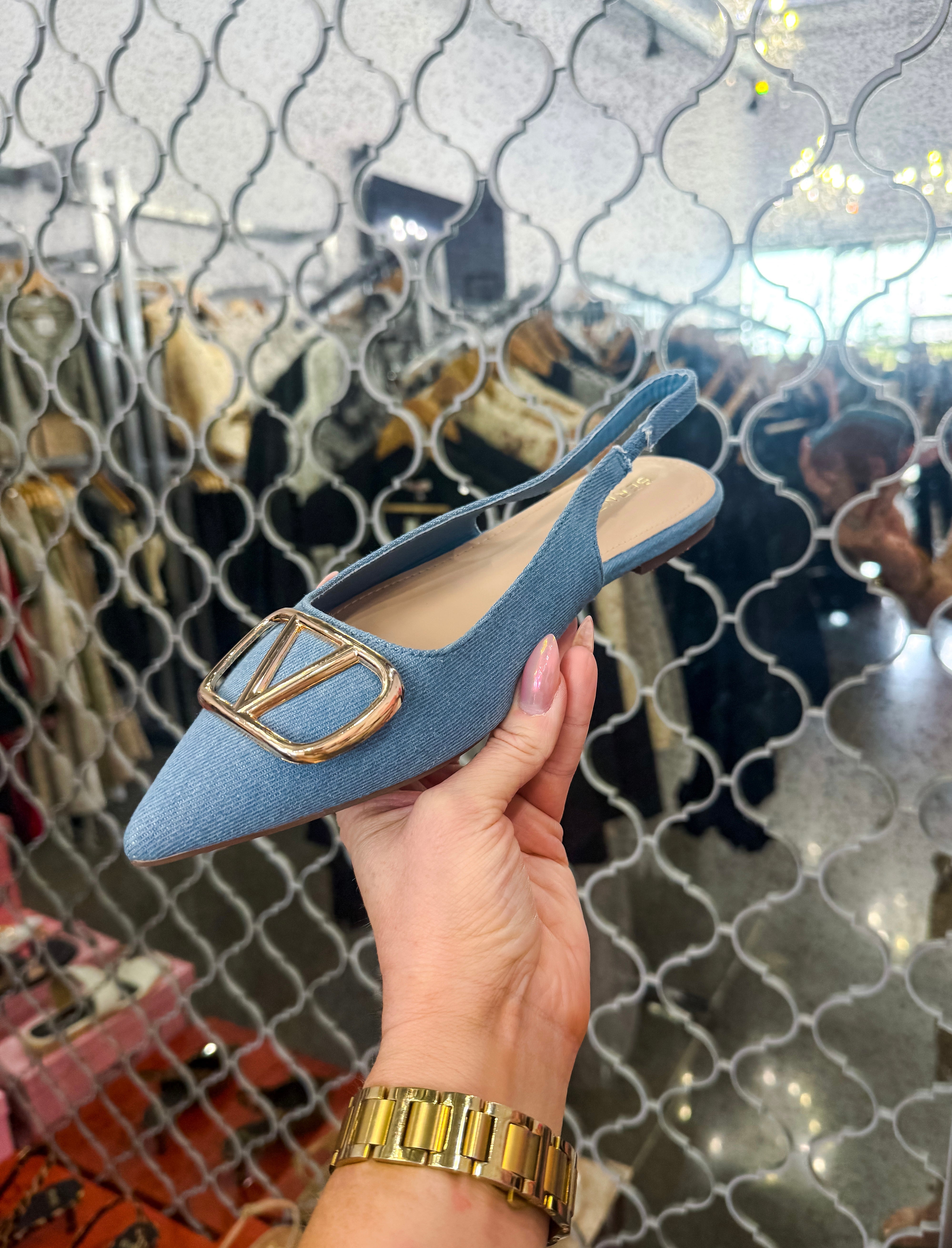 The Hampton Denim Flat brings effortless elegance to your everyday wardrobe. Crafted in rich denim, this versatile flat features a striking gold V detail on the toe that adds a touch of sophistication and glamour. Perfect for pairing with jeans, dresses, or skirts, The Hampton transitions seamlessly from day to night. The comfortable flat sole keeps you feeling great whether you're running errands or heading out for an evening. A stunning piece that proves style doesn't require heels.