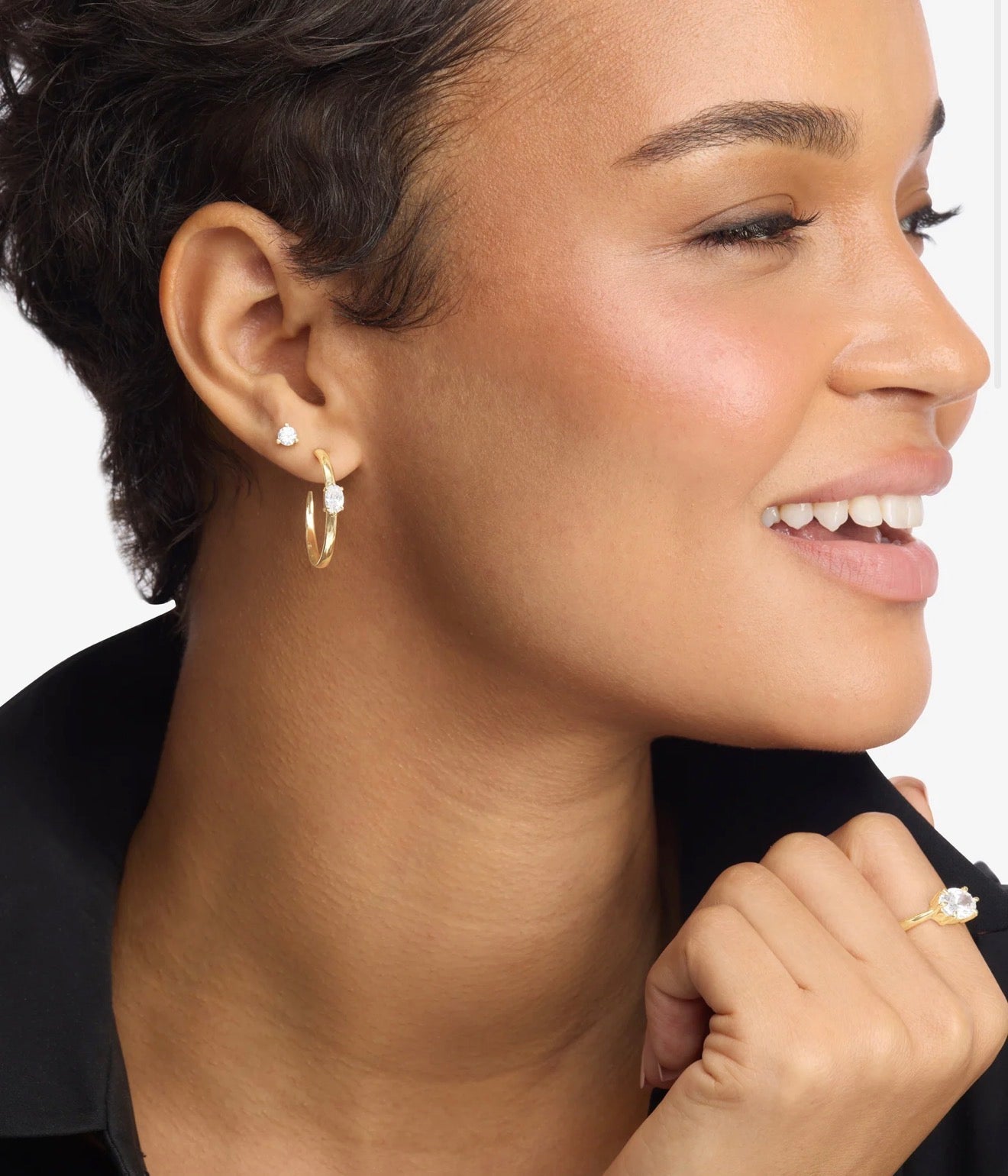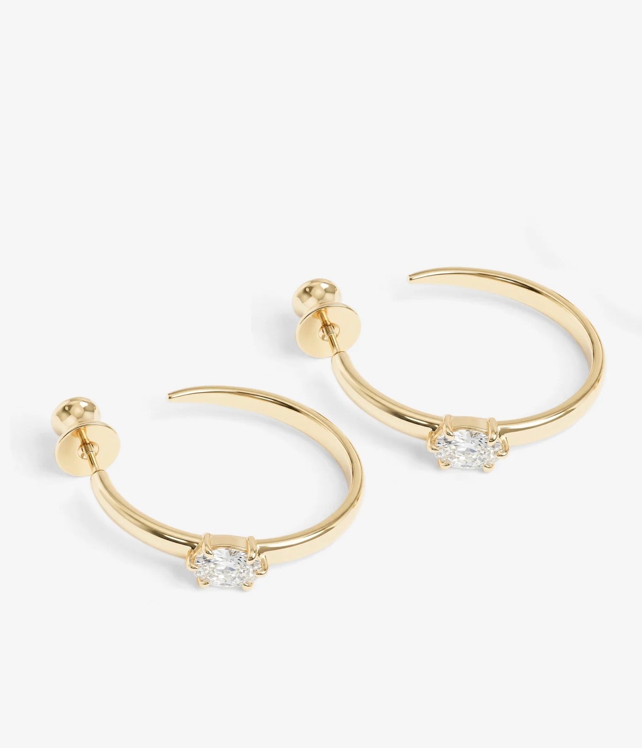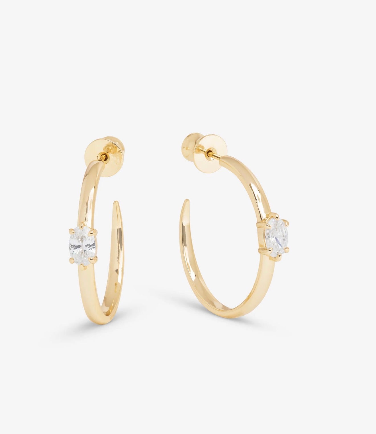 A modern take on a classic hoop. Sculpted with an oval solitaire and finished with a subtle pointed tip at the curve, this 1” silhouette balances softness with edge. Clean, polished, and designed for everyday wear.