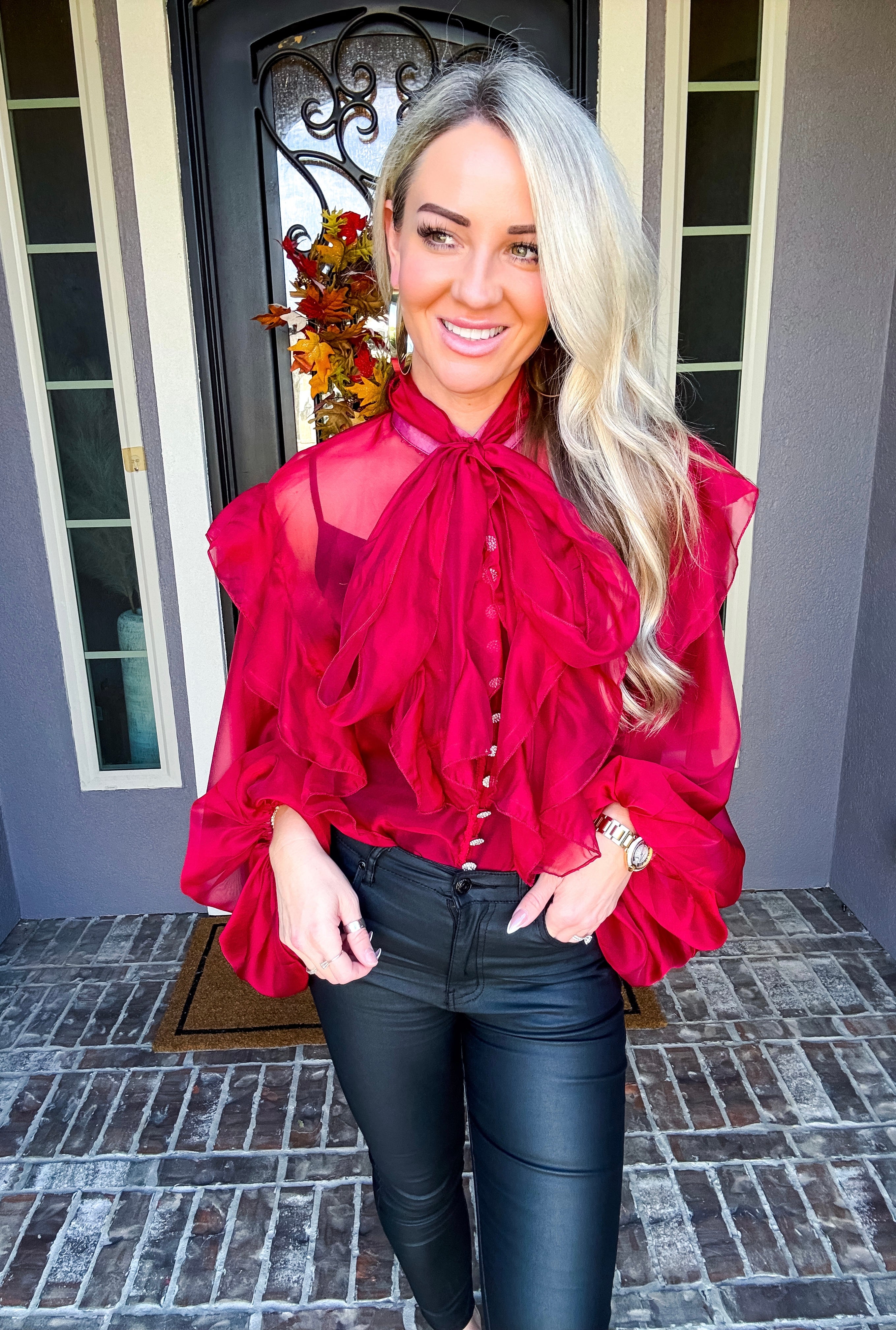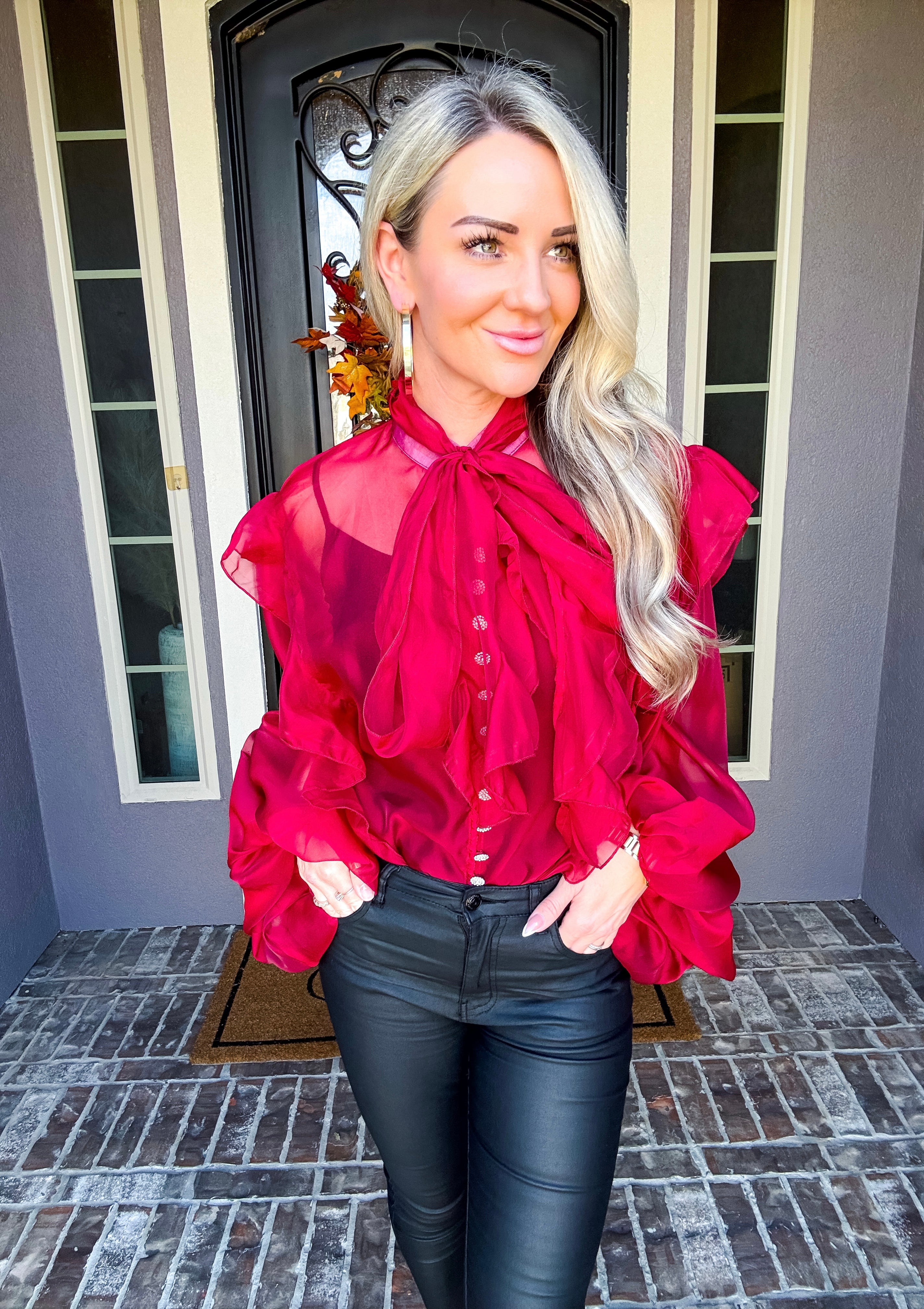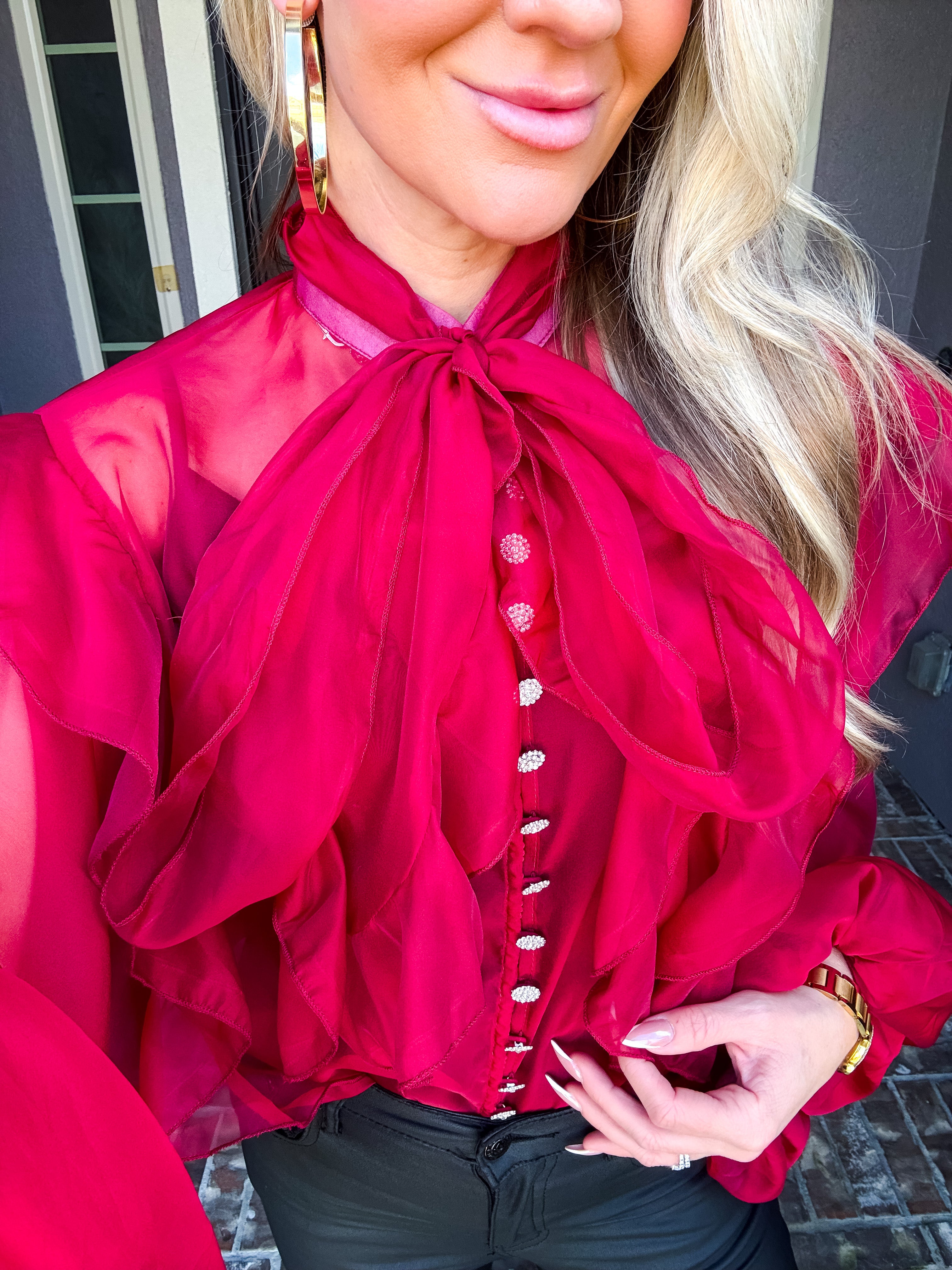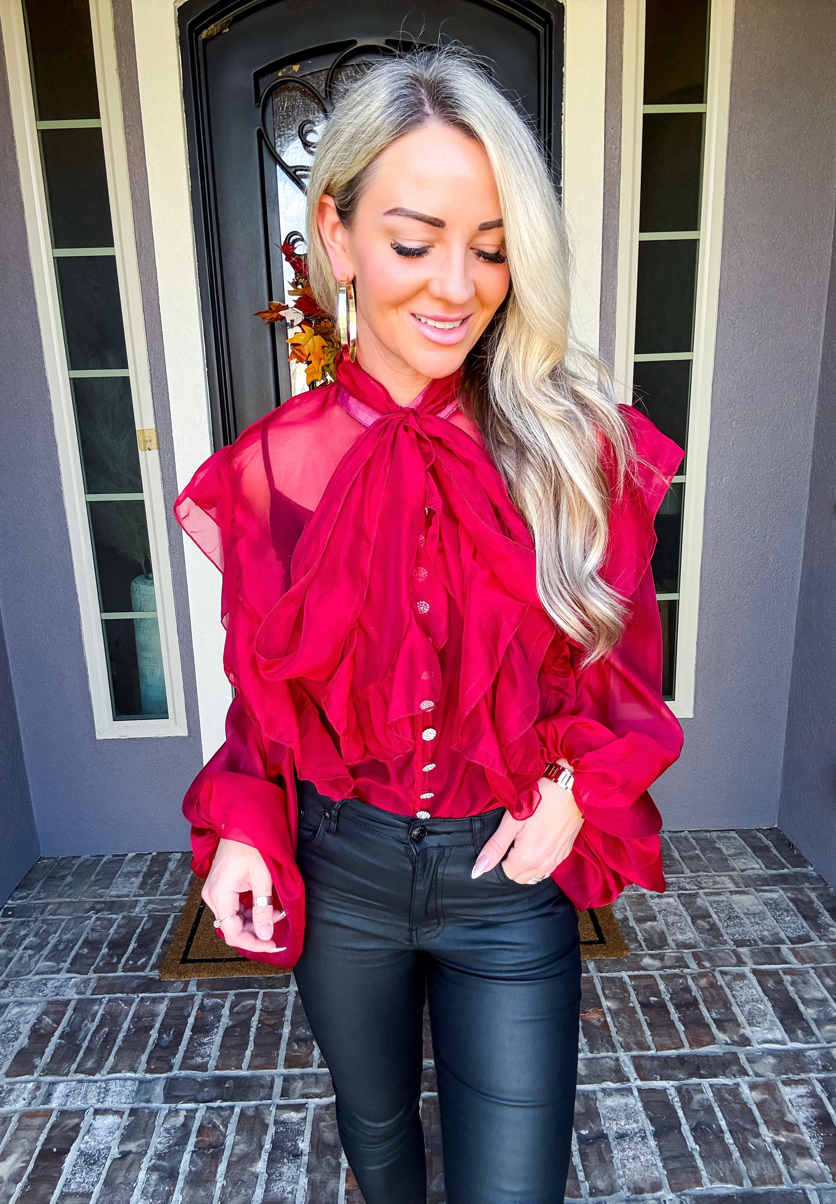 Elevate your wardrobe with the Crimson Affair Ruffle Blouse, a sophisticated piece that commands attention. This stunning red blouse showcases a removable ruffle tie at the neckline, allowing you to customize your look for any occasion. Exquisite jeweled buttons add a touch of luxury and refinement, while voluminous balloon sleeves create an elegant silhouette. Versatile and polished, this blouse transitions seamlessly from professional settings to evening events.