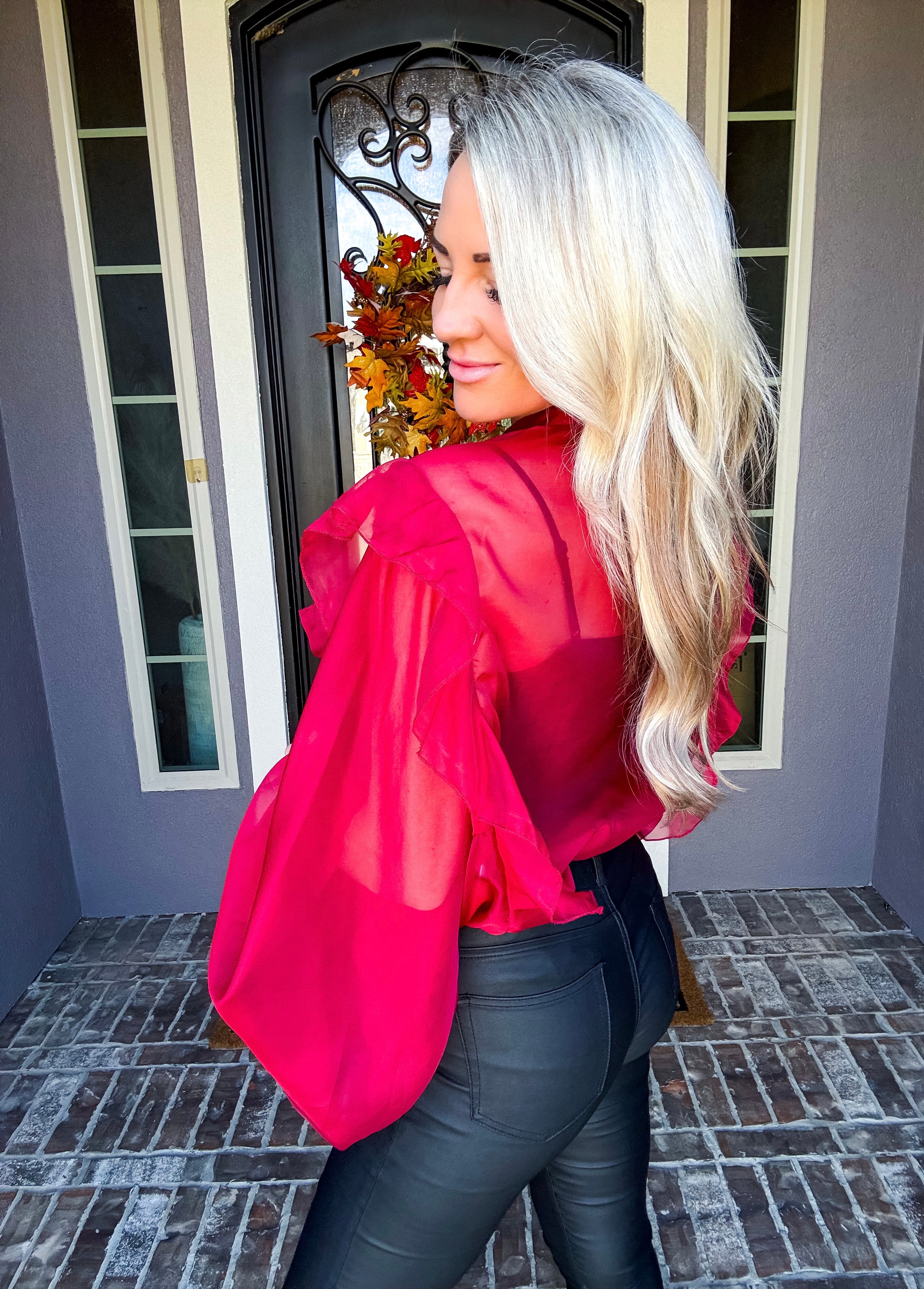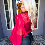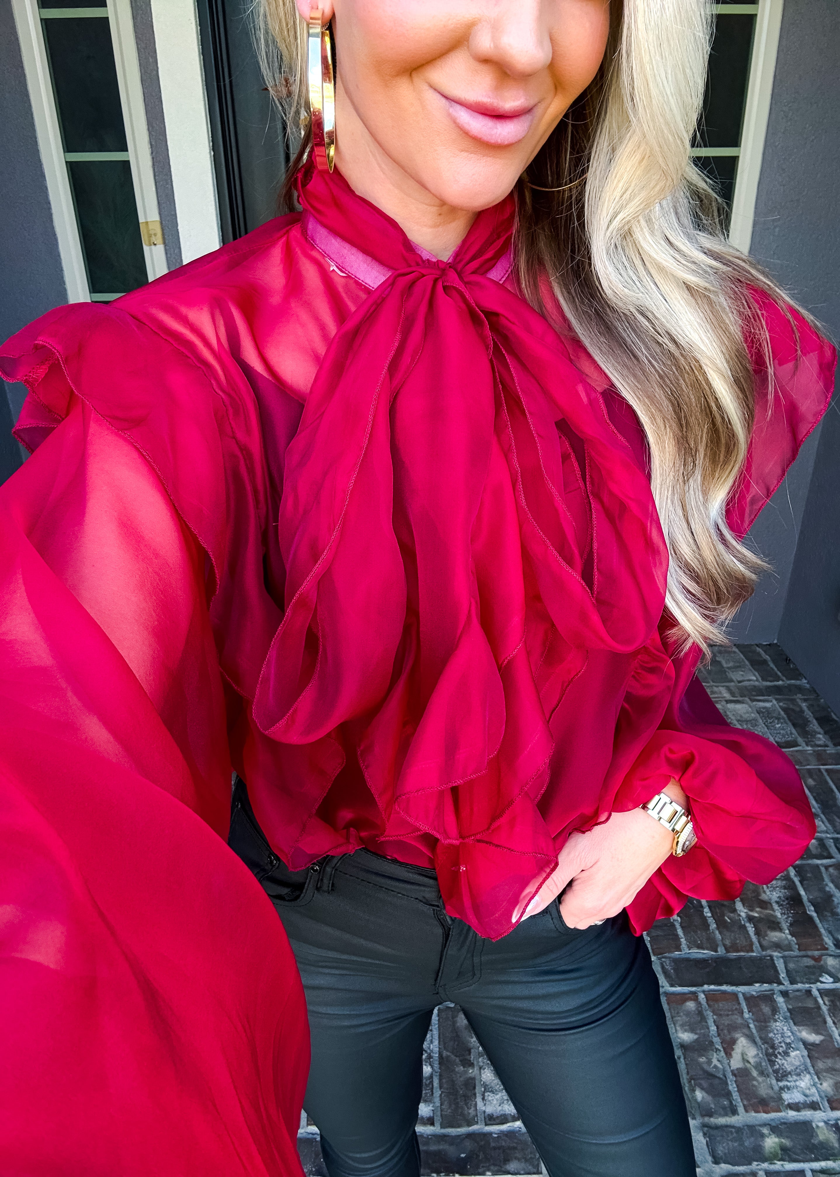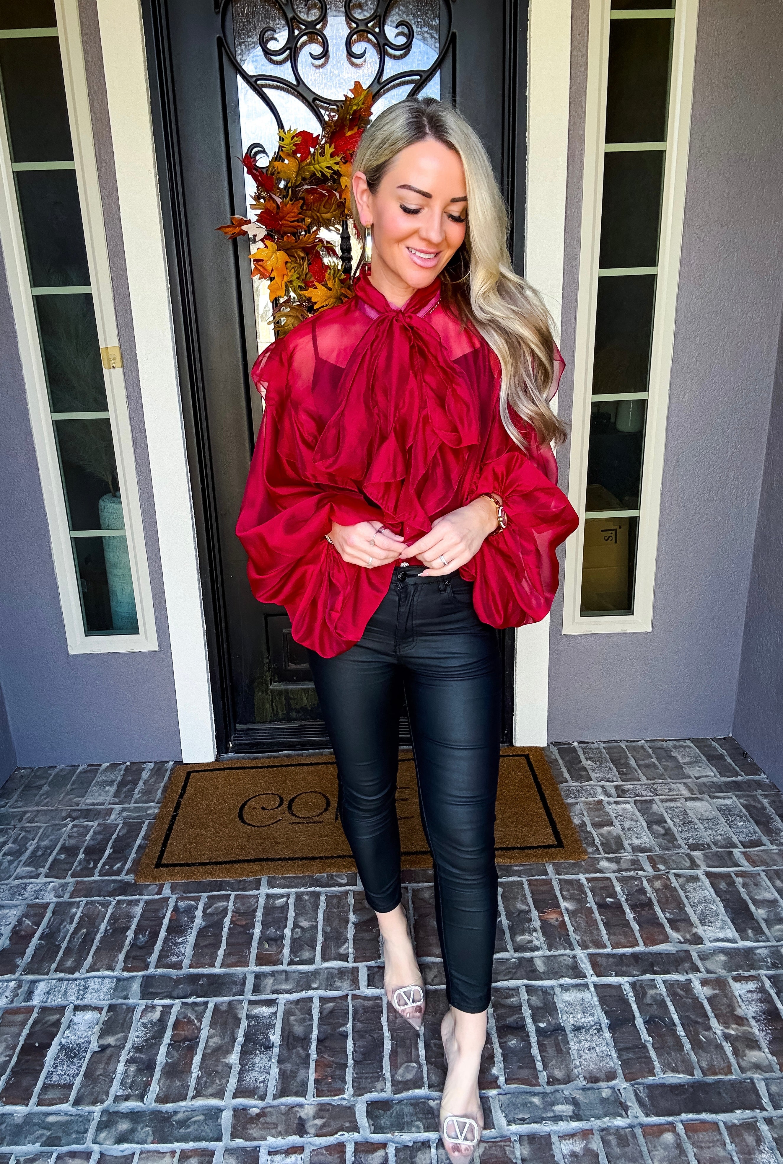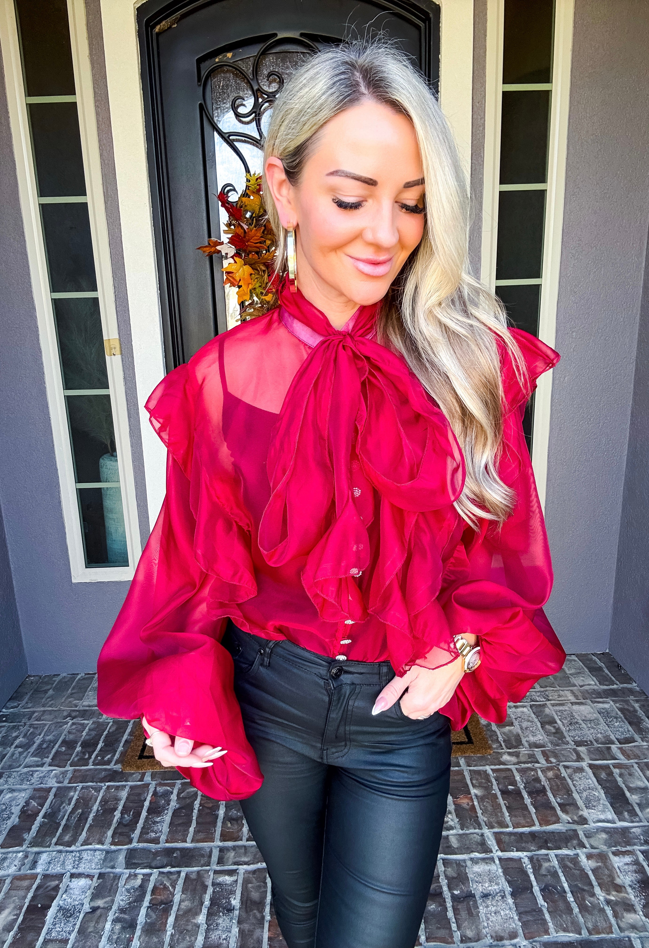 Elevate your wardrobe with the Crimson Affair Ruffle Blouse, a sophisticated piece that commands attention. This stunning red blouse showcases a removable ruffle tie at the neckline, allowing you to customize your look for any occasion. Exquisite jeweled buttons add a touch of luxury and refinement, while voluminous balloon sleeves create an elegant silhouette. Versatile and polished, this blouse transitions seamlessly from professional settings to evening events.