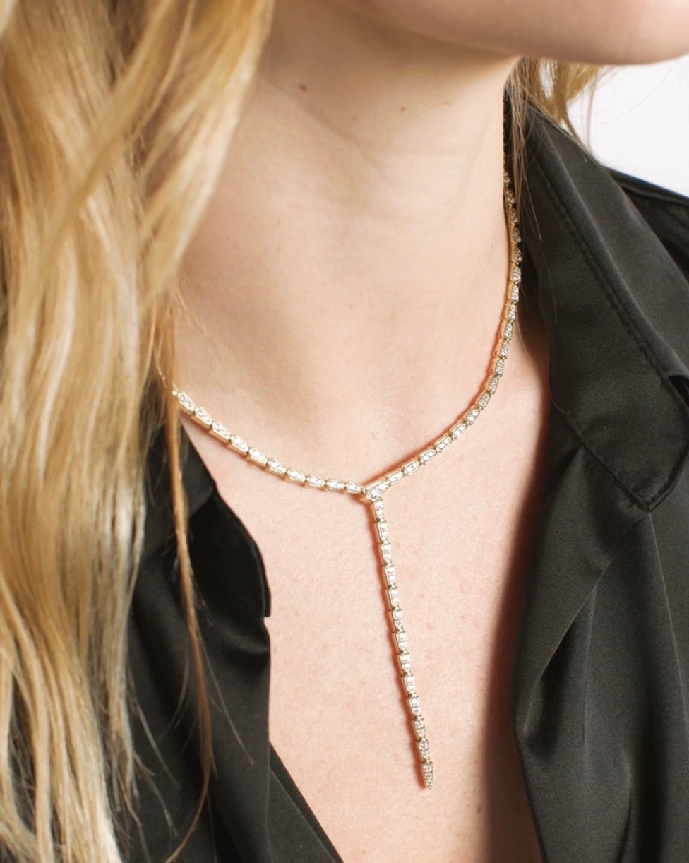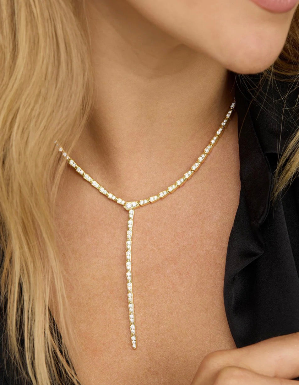 Sleek, striking, and dangerously good. With it's snake-like links and dazzling pavé finish the Pavé Serpent Lariat Necklace is just a little dangerous. Whether you're going low-cut or low-key, it bites… in a good way