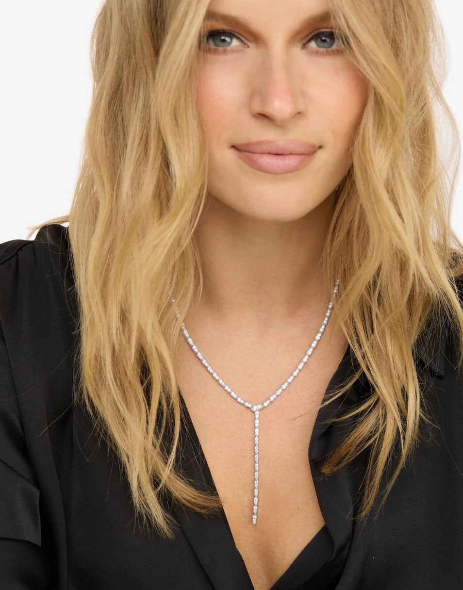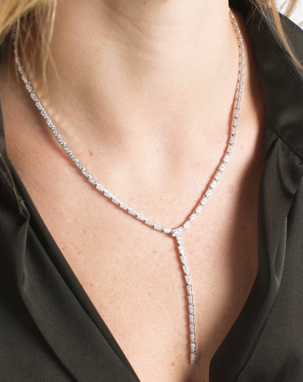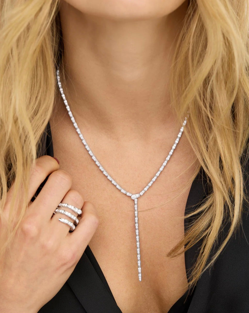 Sleek, striking, and dangerously good. With it's snake-like links and dazzling pavé finish the Pavé Serpent Lariat Necklace is just a little dangerous. Whether you're going low-cut or low-key, it bites… in a good way