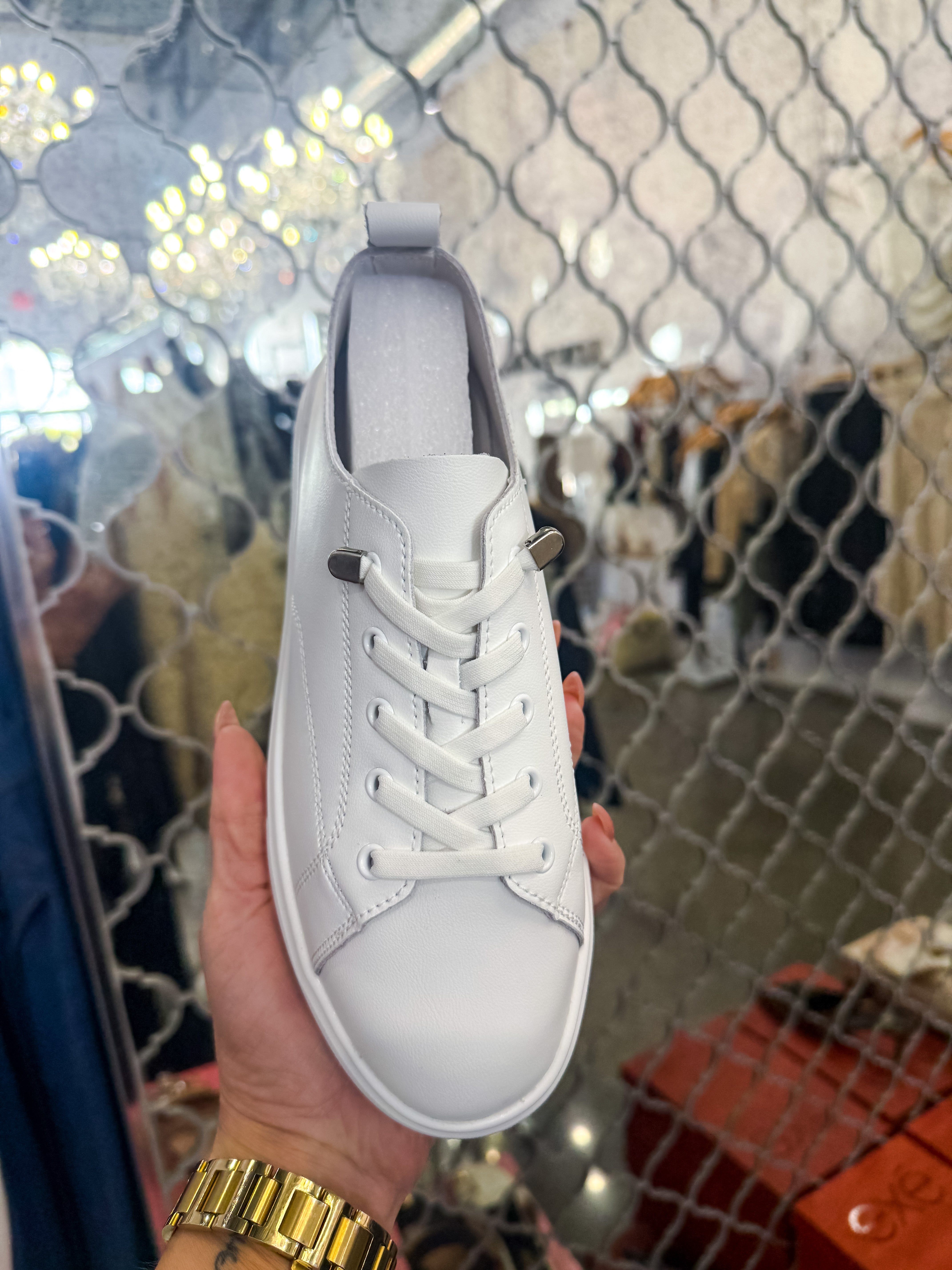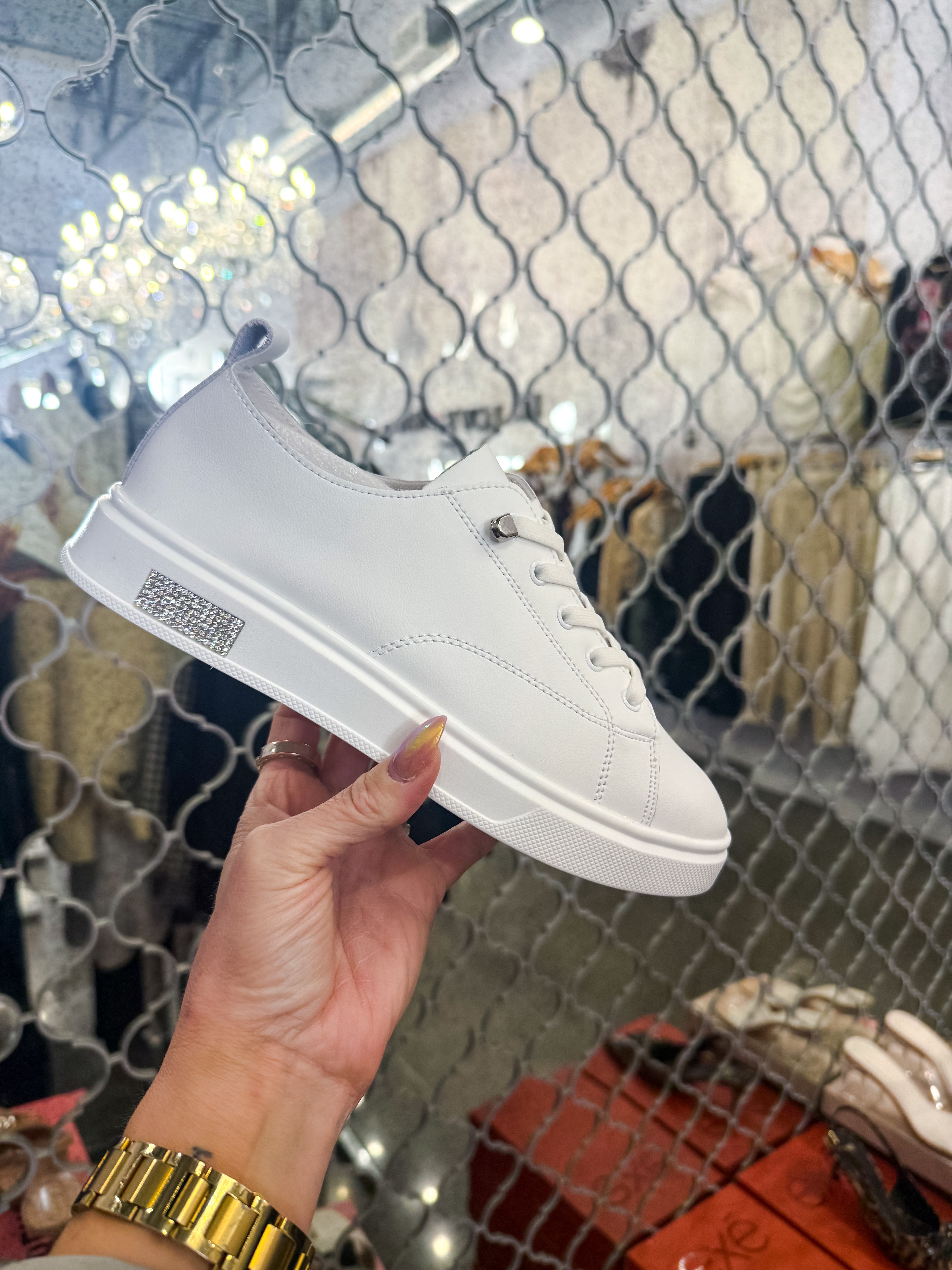 Step into timeless style with the Legacy Jeweled Sneaker. This classic white leather sneaker reimagines the iconic silhouette with an unexpected touch of glamour—a stunning jewel detail adorns the sole, catching light with every step. Perfect for those who appreciate understated elegance with a hint of sparkle, it's the ideal blend of everyday comfort and subtle sophistication.