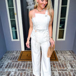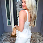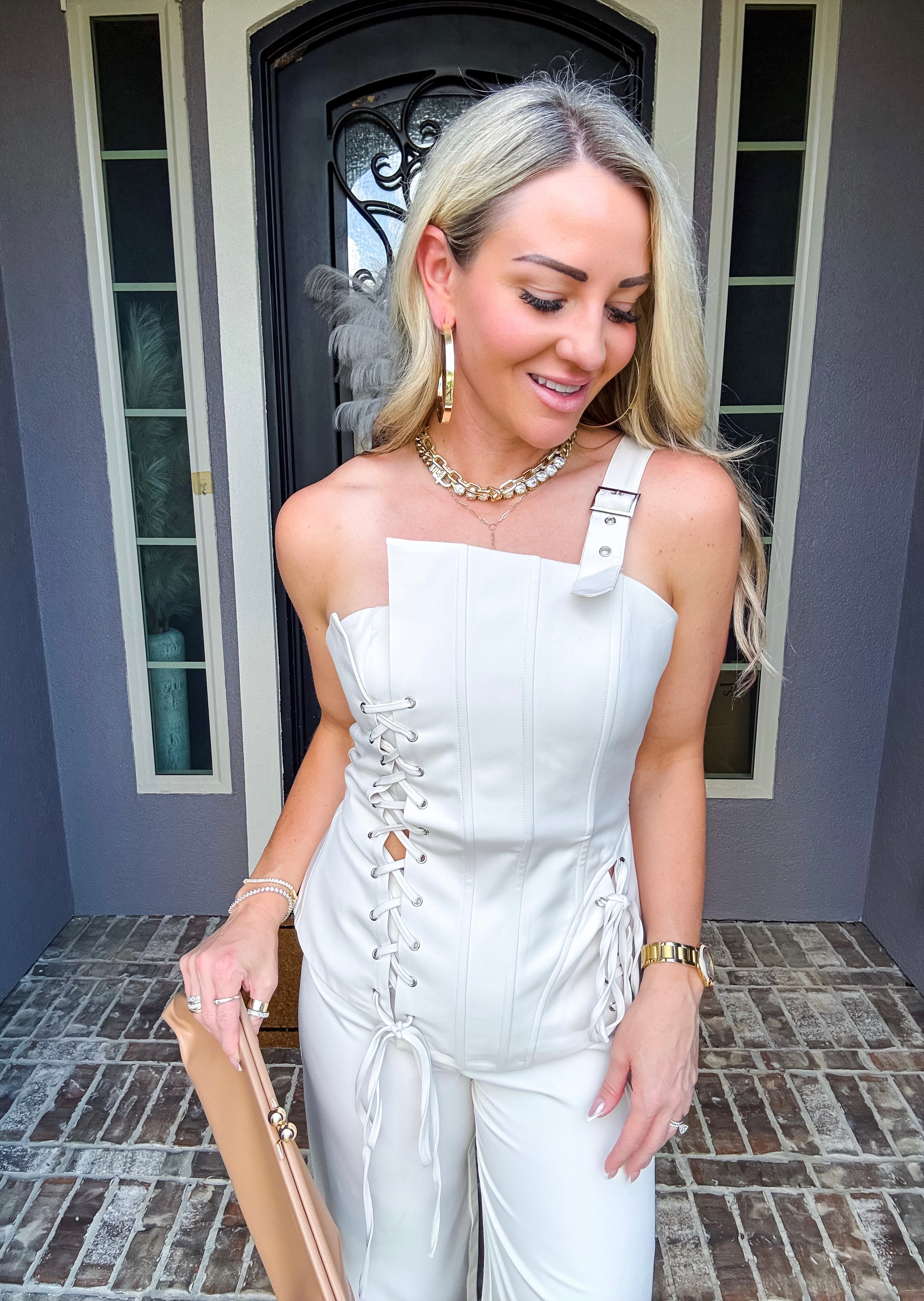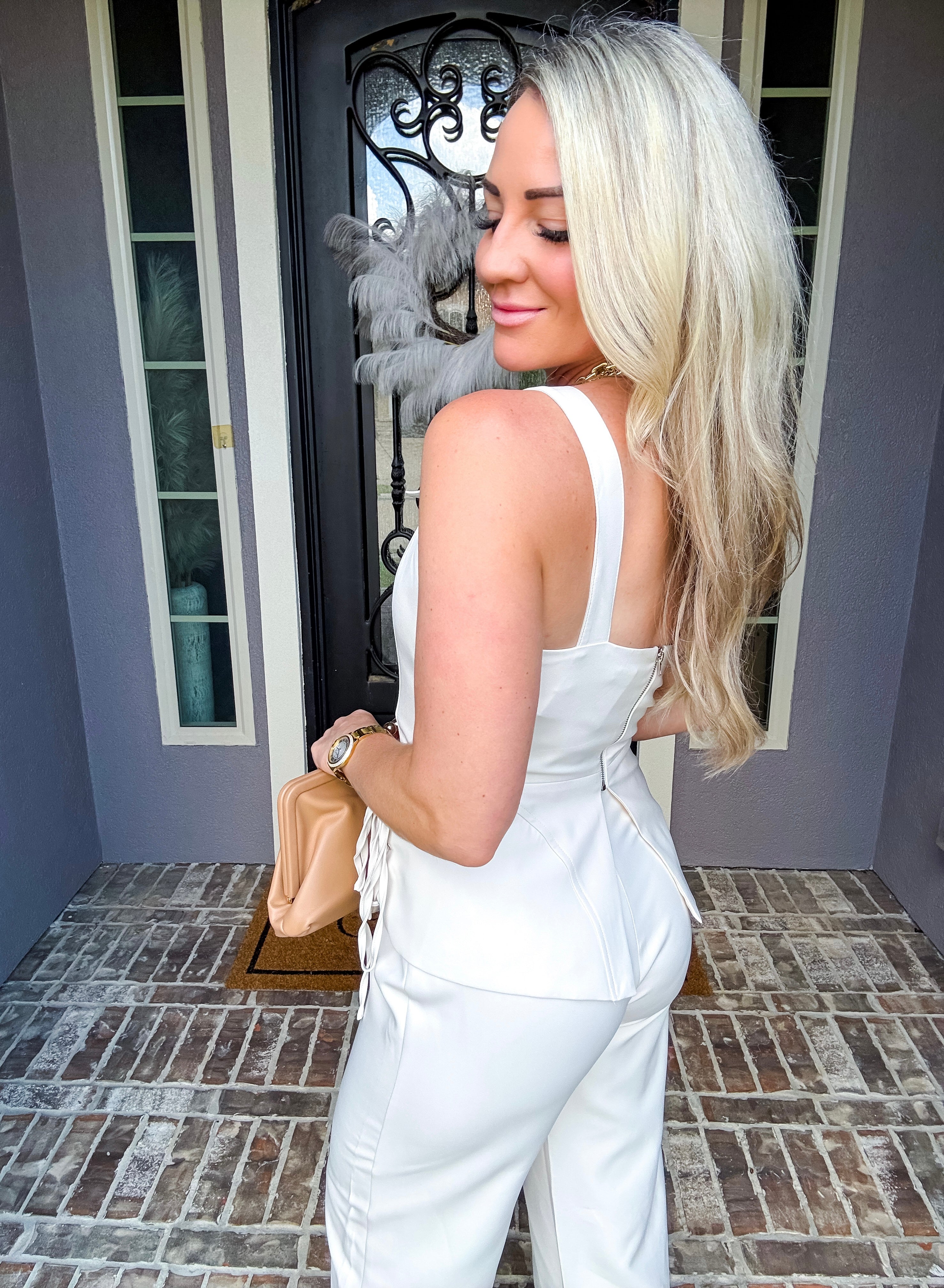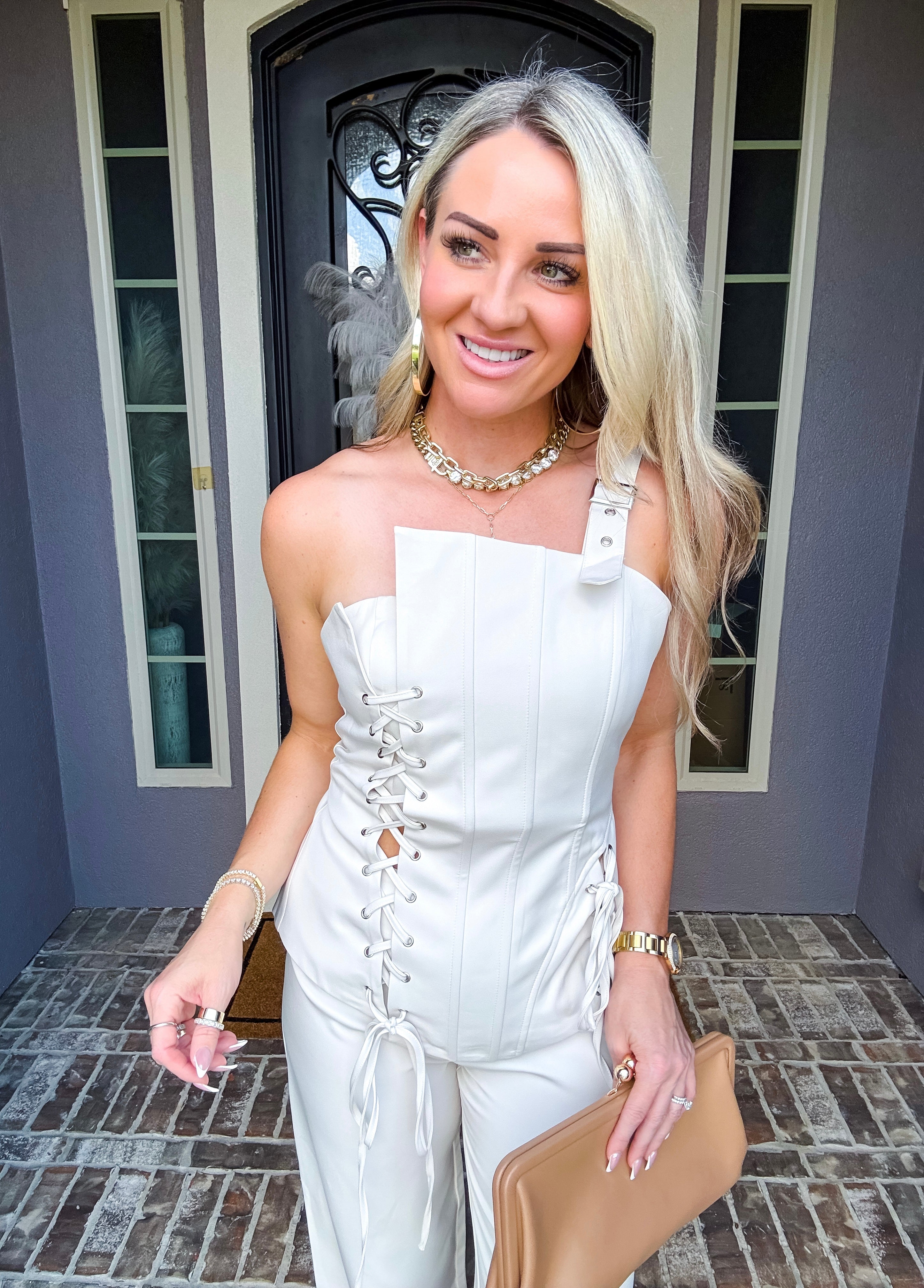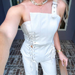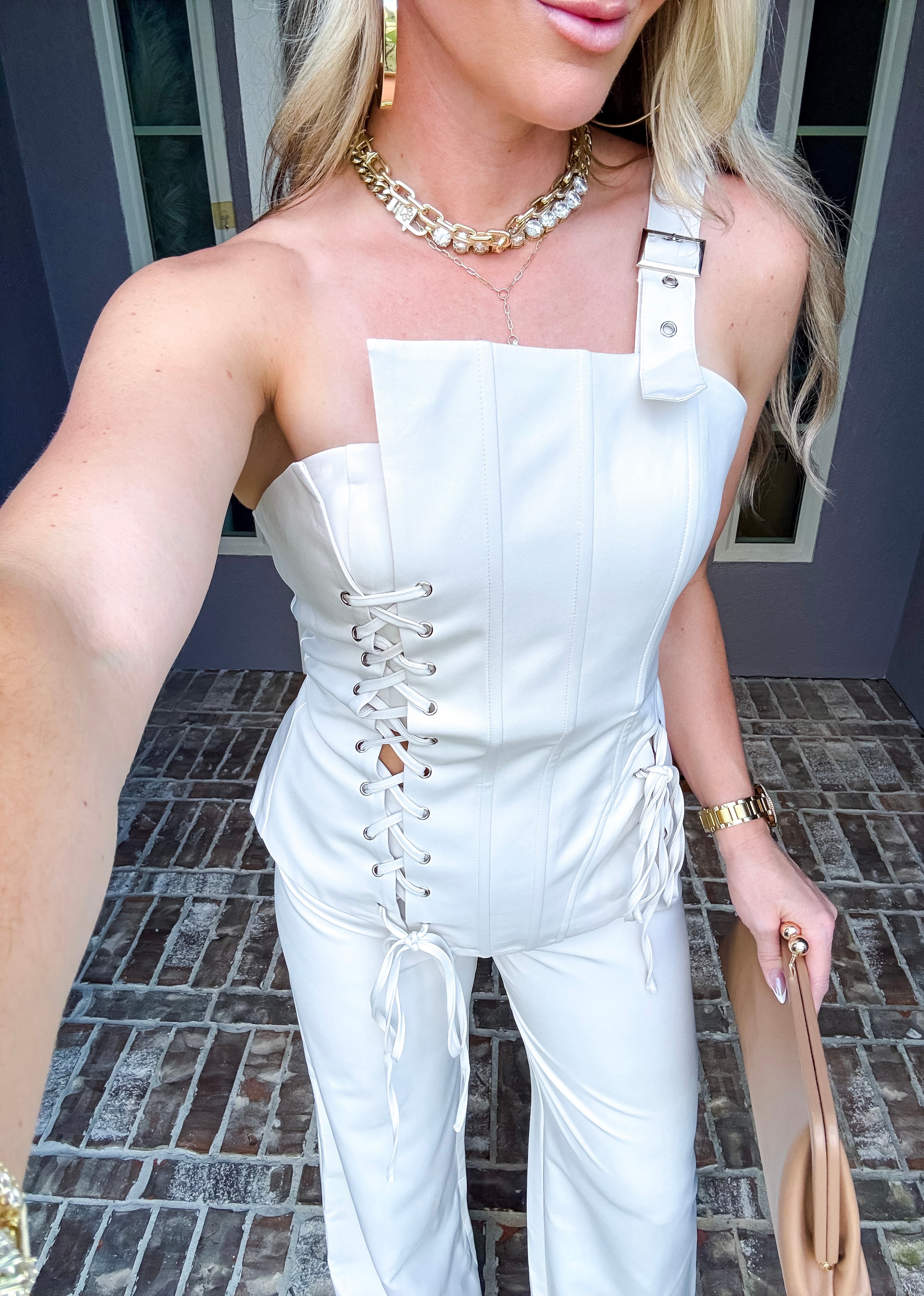 The Monaco Days One Shoulder Top features elegant lace-up details on each side, adding a captivating touch to its sleek design. With a single shoulder strap and a back zipper, it offers a tailored fit without stretch for a structured silhouette. Perfect for casual wear or paired with the Monaco Days trousers, this top combines sophistication and versatility for effortlessly polished looks.