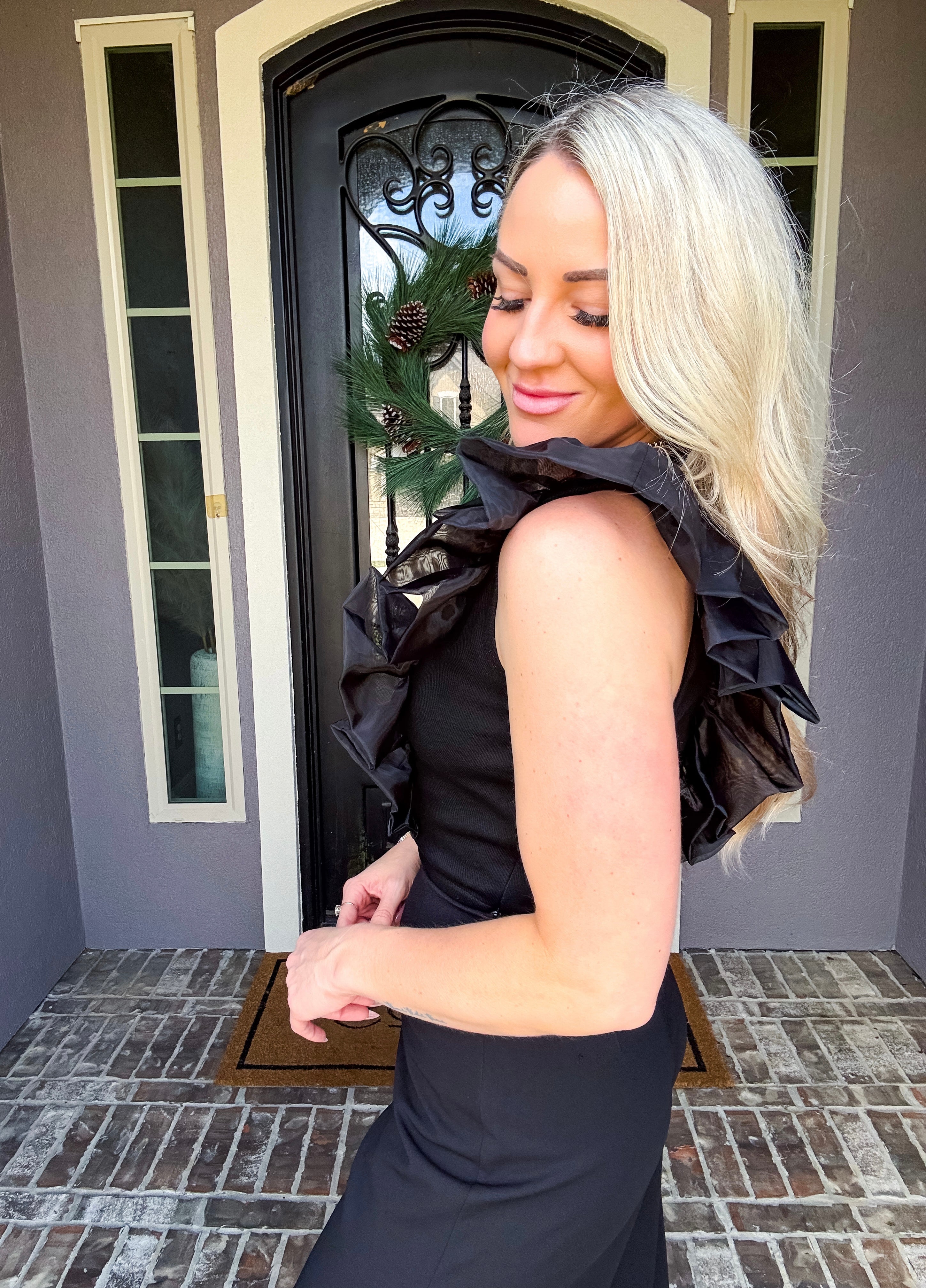 Elevate your wardrobe with this stunning ruffle top that combines elegance with everyday comfort. The delicate ruffles add a touch of sophistication and movement, while the convenient side zipper makes dressing effortless. Crafted with exceptional stretch fabric, this top moves with you for all-day comfort without compromising its polished silhouette. The timeless black hue pairs seamlessly with any outfit, ensuring you'll receive compliments wherever you go. Perfect for those who refuse to settle for ordinary—this is the piece that makes you feel confident, chic, and undeniably stylish.