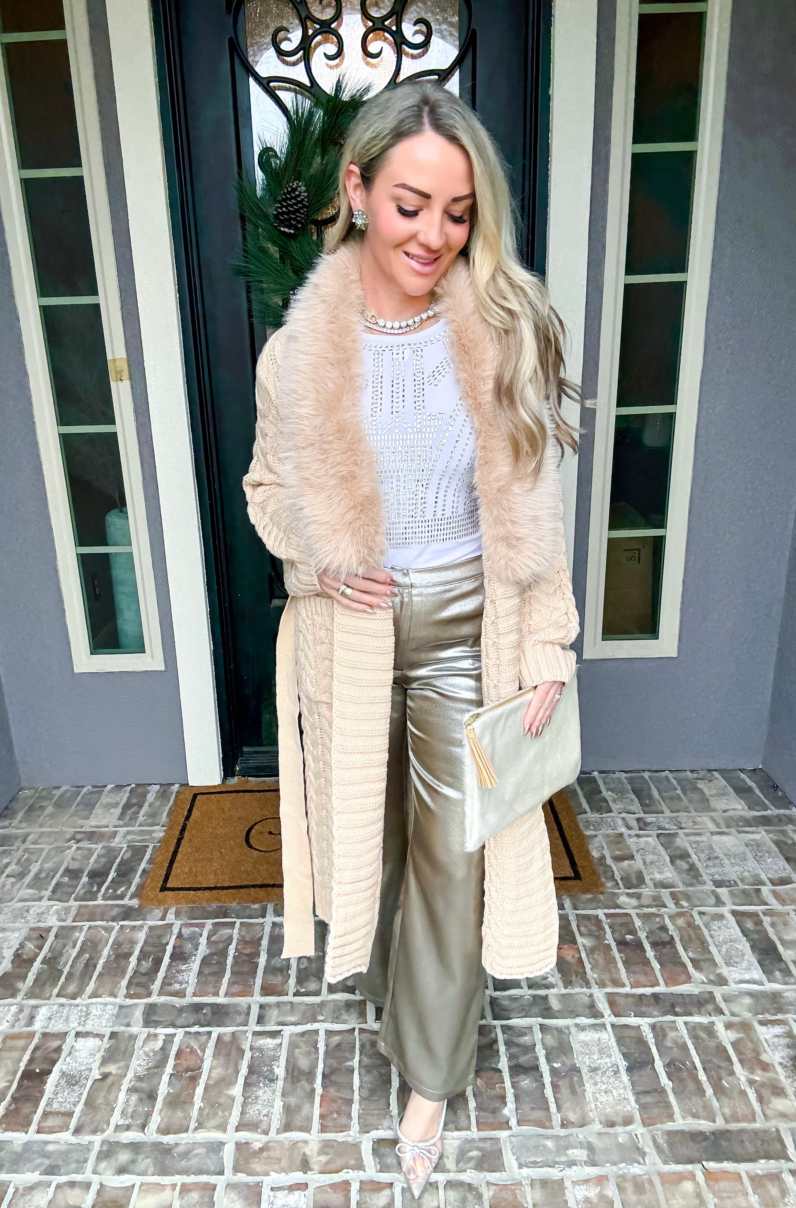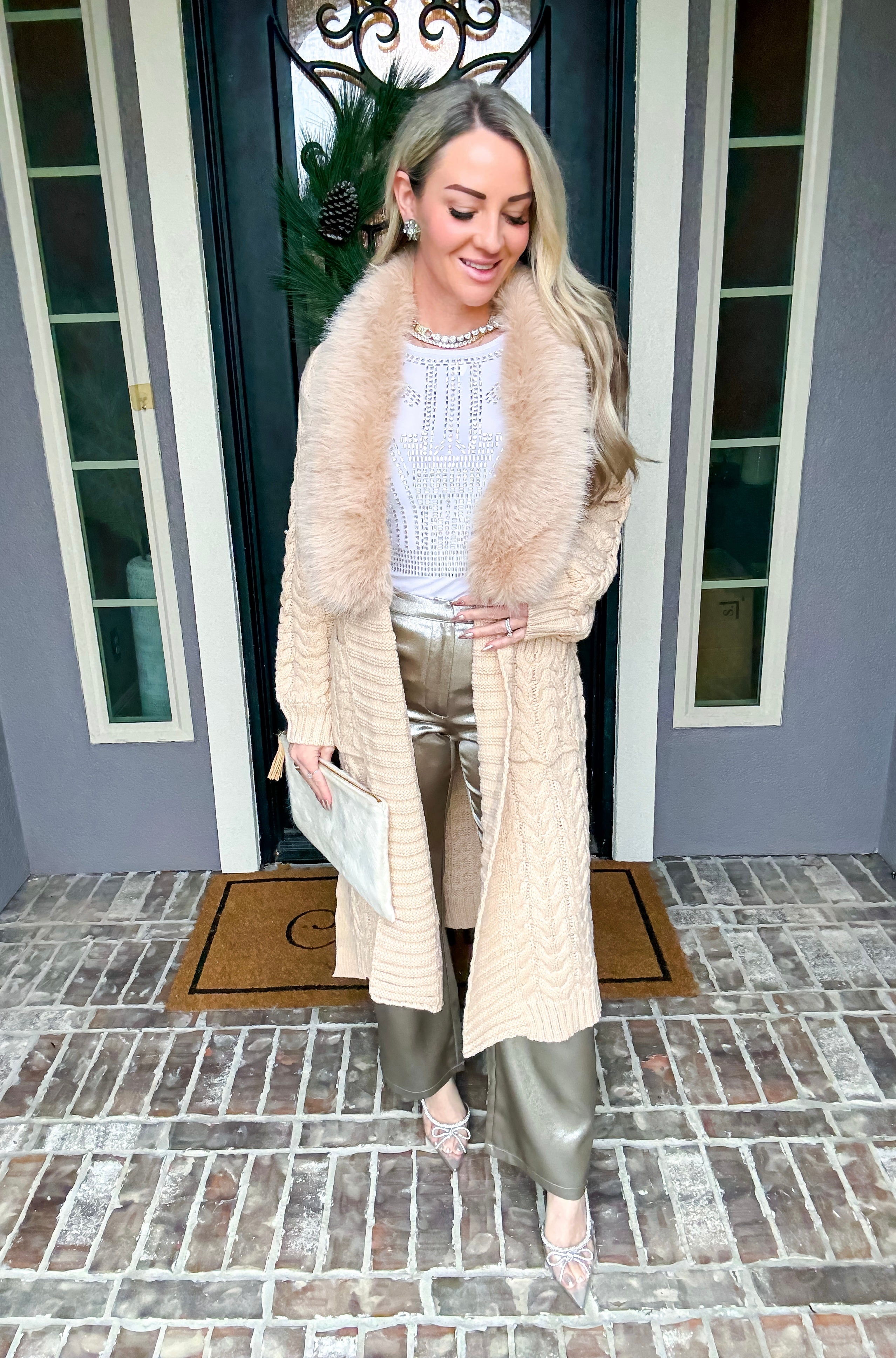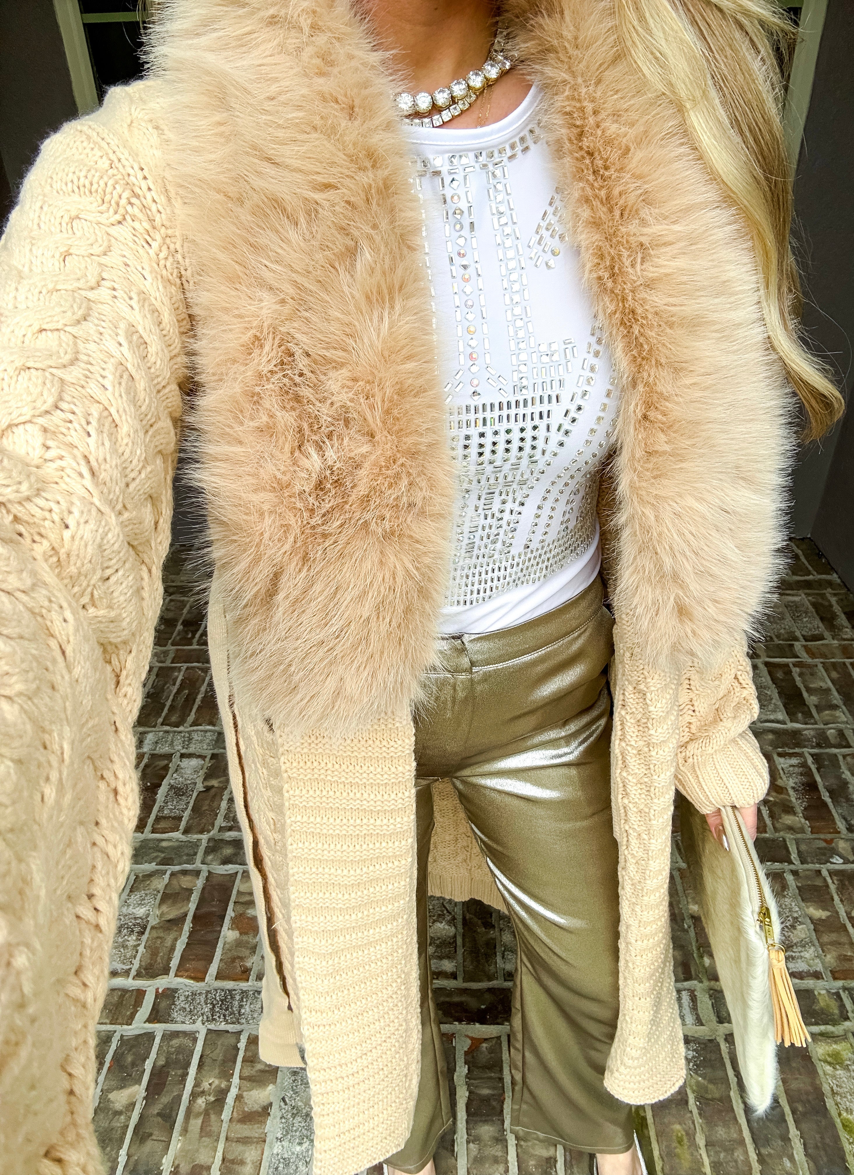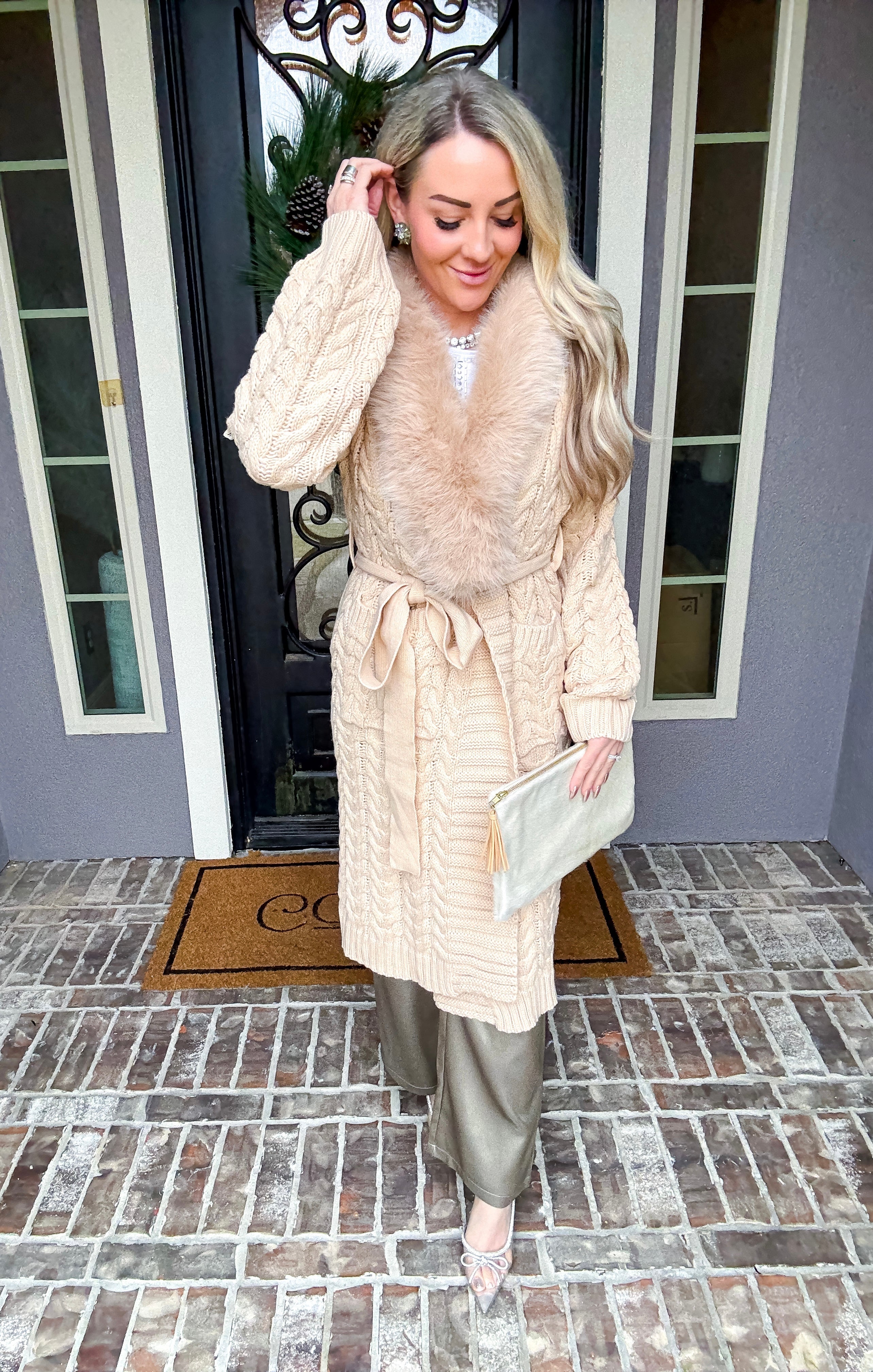 Elevate your layering game with this sophisticated fur-trimmed cardigan that effortlessly transitions from polished to relaxed. Luxurious fur detailing frames the collar, adding an instant touch of elegance and warmth. The adjustable waist tie allows you to cinch for a refined silhouette or leave undone for an effortlessly cool, oversized aesthetic. Perfect for layering over dresses, tees, or worn solo as a statement piece. A versatile essential that delivers both comfort and undeniable style.