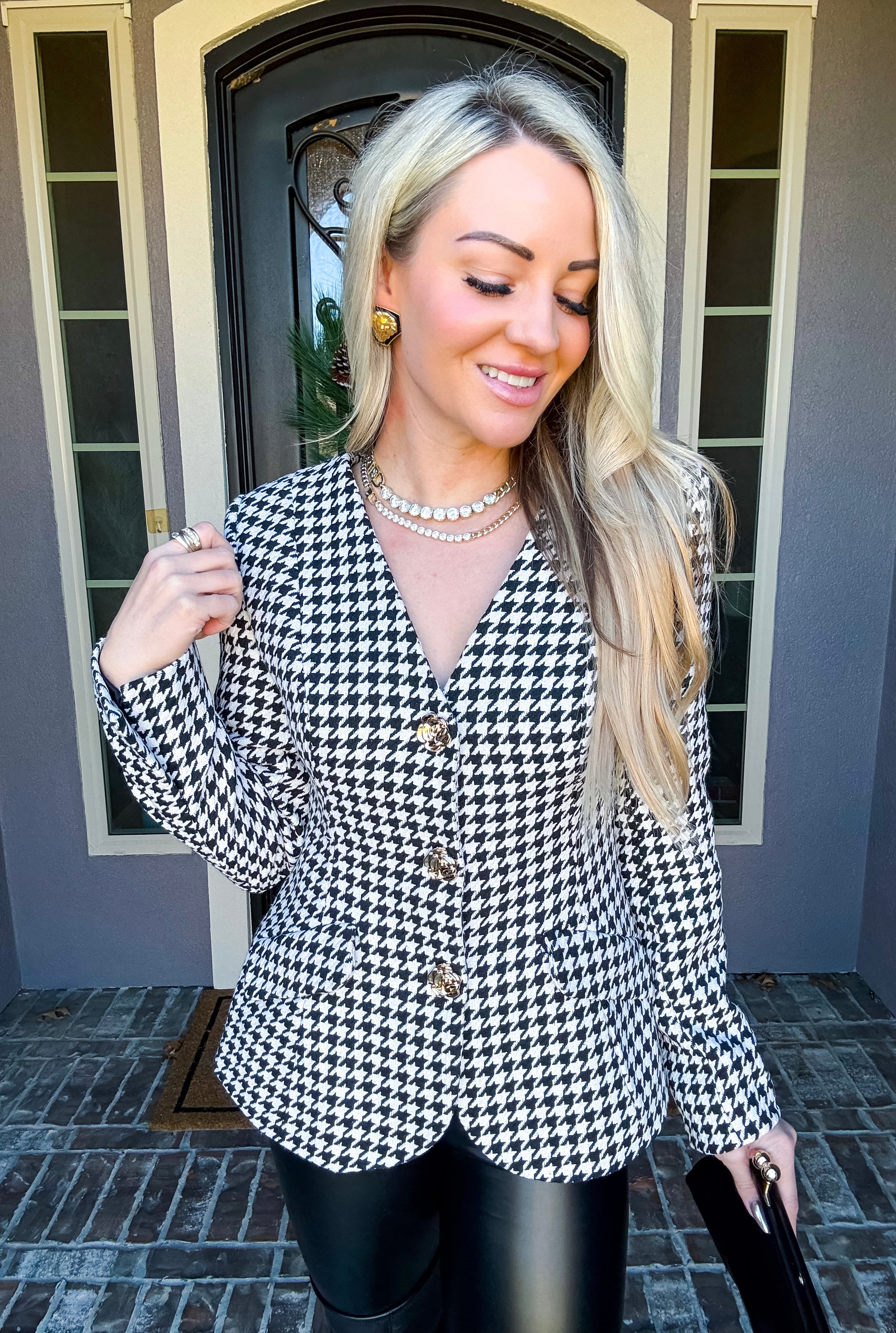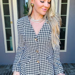 Elevate your professional wardrobe with this striking houndstooth blazer, expertly tailored for a refined silhouette. The fitted waist creates a flattering contour, while the peplum hem adds contemporary flair and movement. Polished gold rose snap buttons provide both functional closure and a luxe finishing touch. Perfect for boardroom meetings, client presentations, or elevated weekend styling, this piece seamlessly transitions from office to evening occasions with understated sophistication.