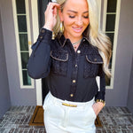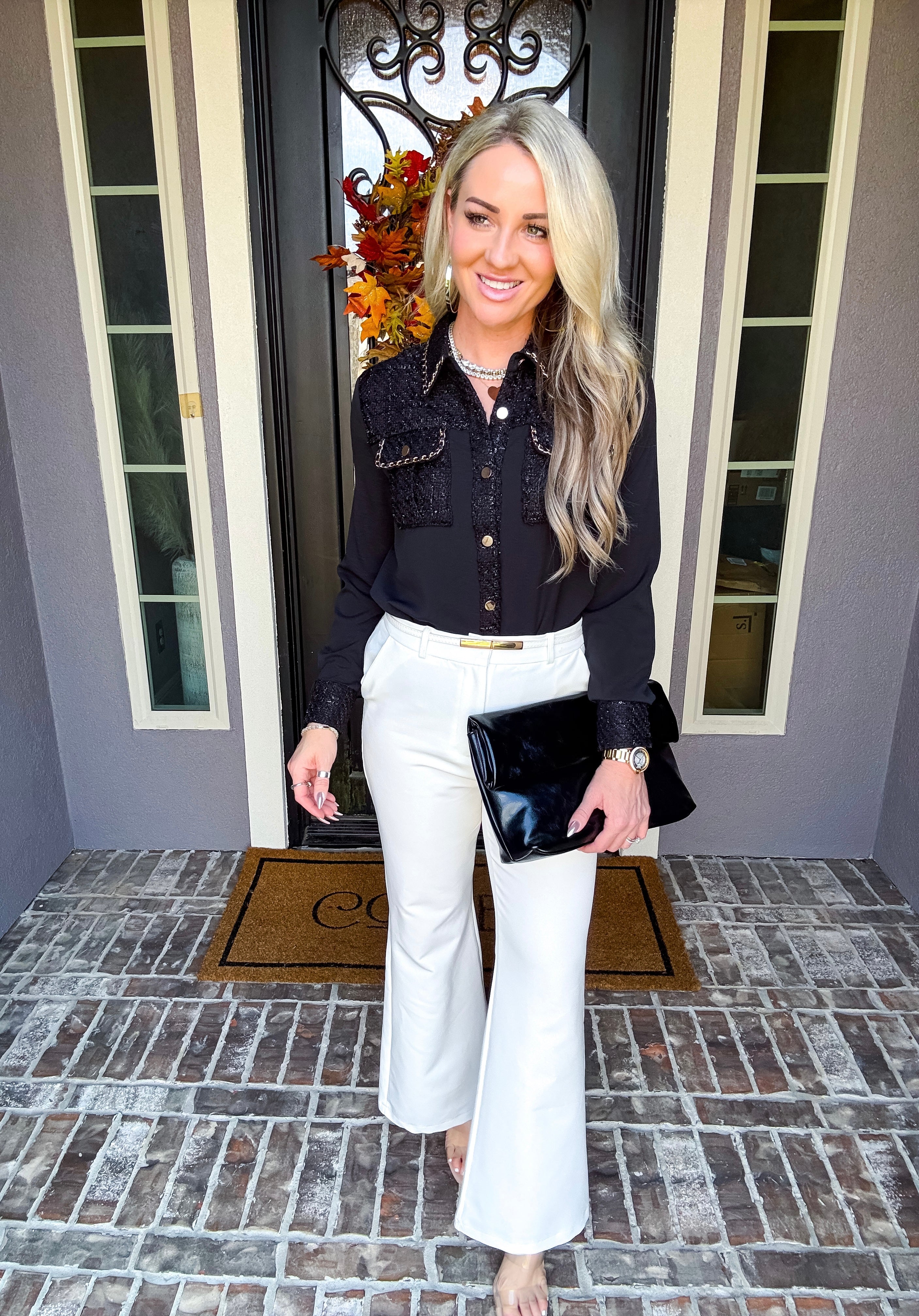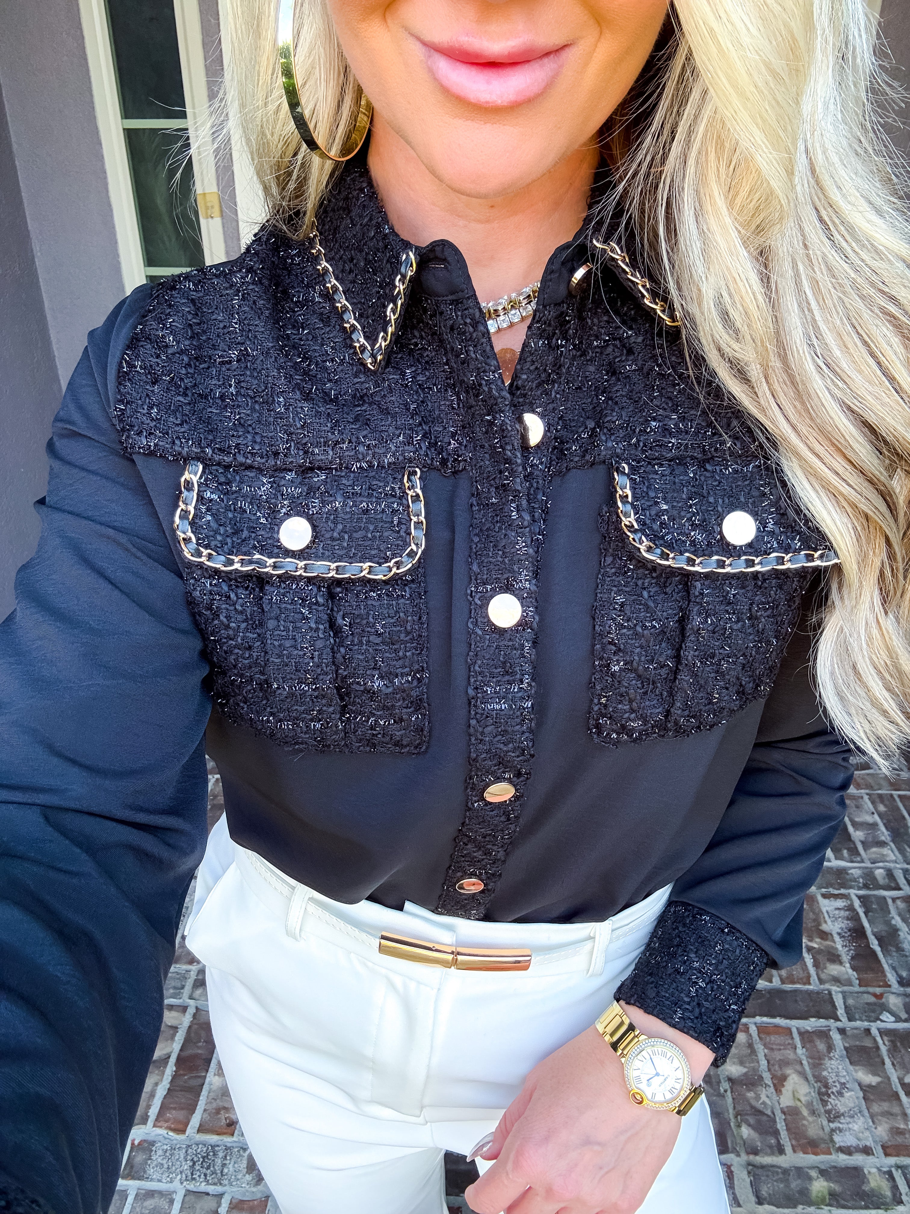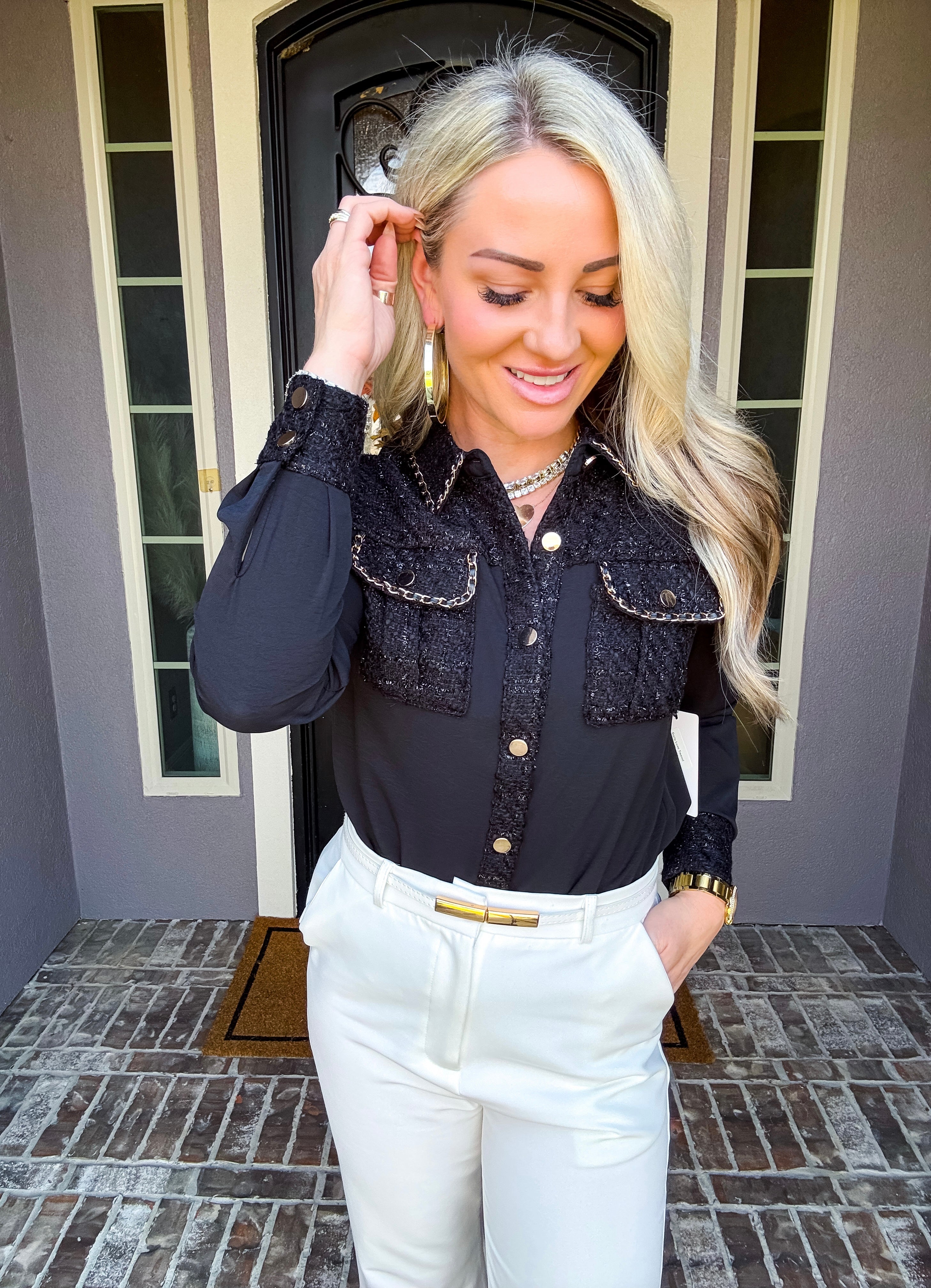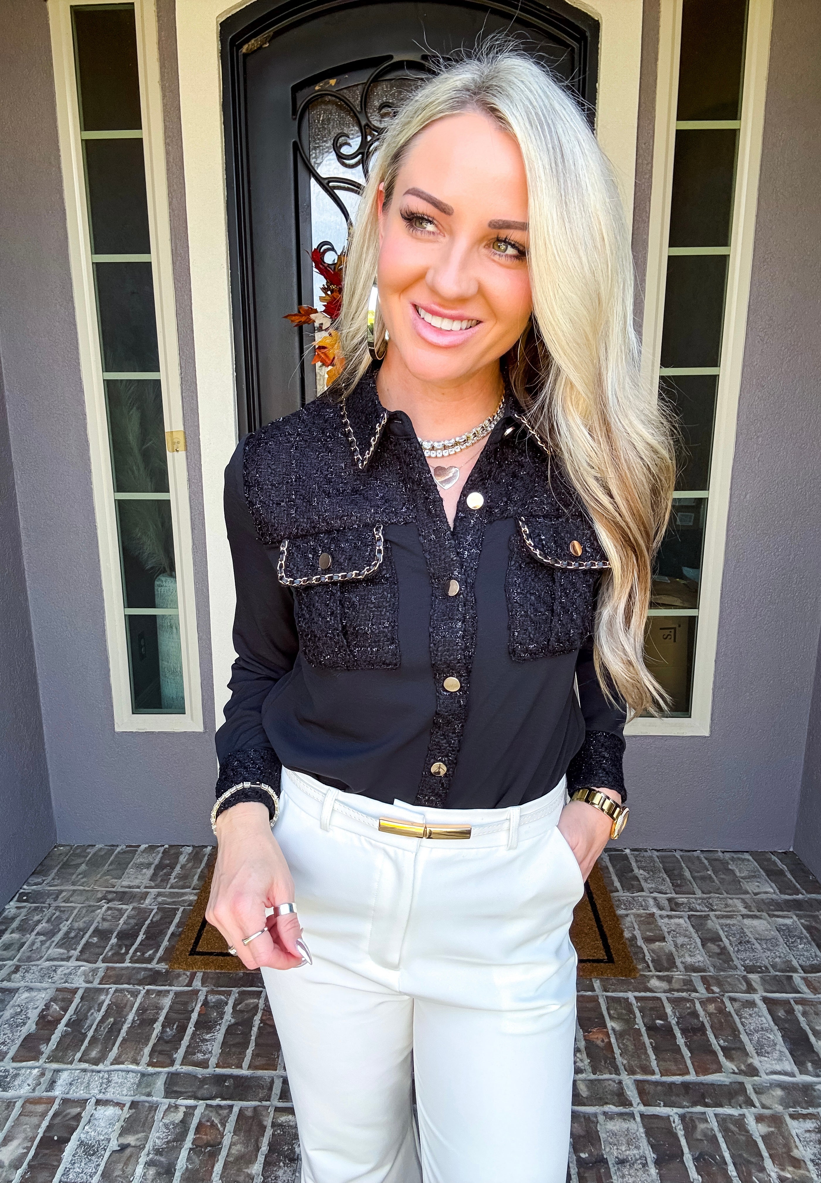 Elevate your wardrobe with the Daily Luxe Tweed Pocket Blouse, meticulously designed to combine classic texture with modern elegance. Featuring distinctive tweed pockets and a matching collar, this blouse adds refined detail and structure to your everyday look. Crafted for both comfort and style, it pairs seamlessly with tailored pants or skirts, making it a versatile choice for professional or casual settings.