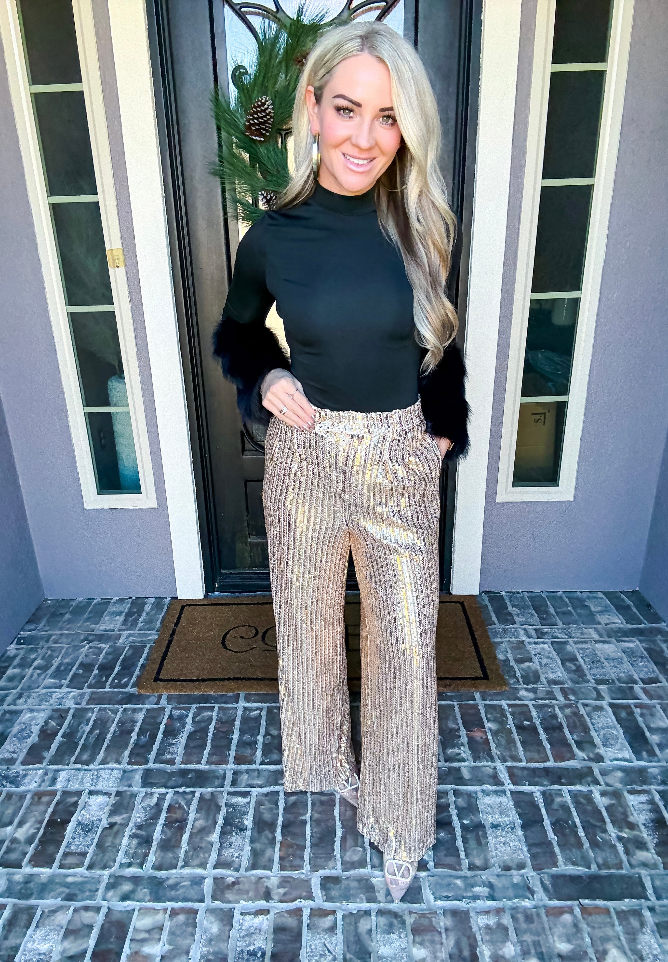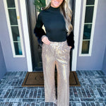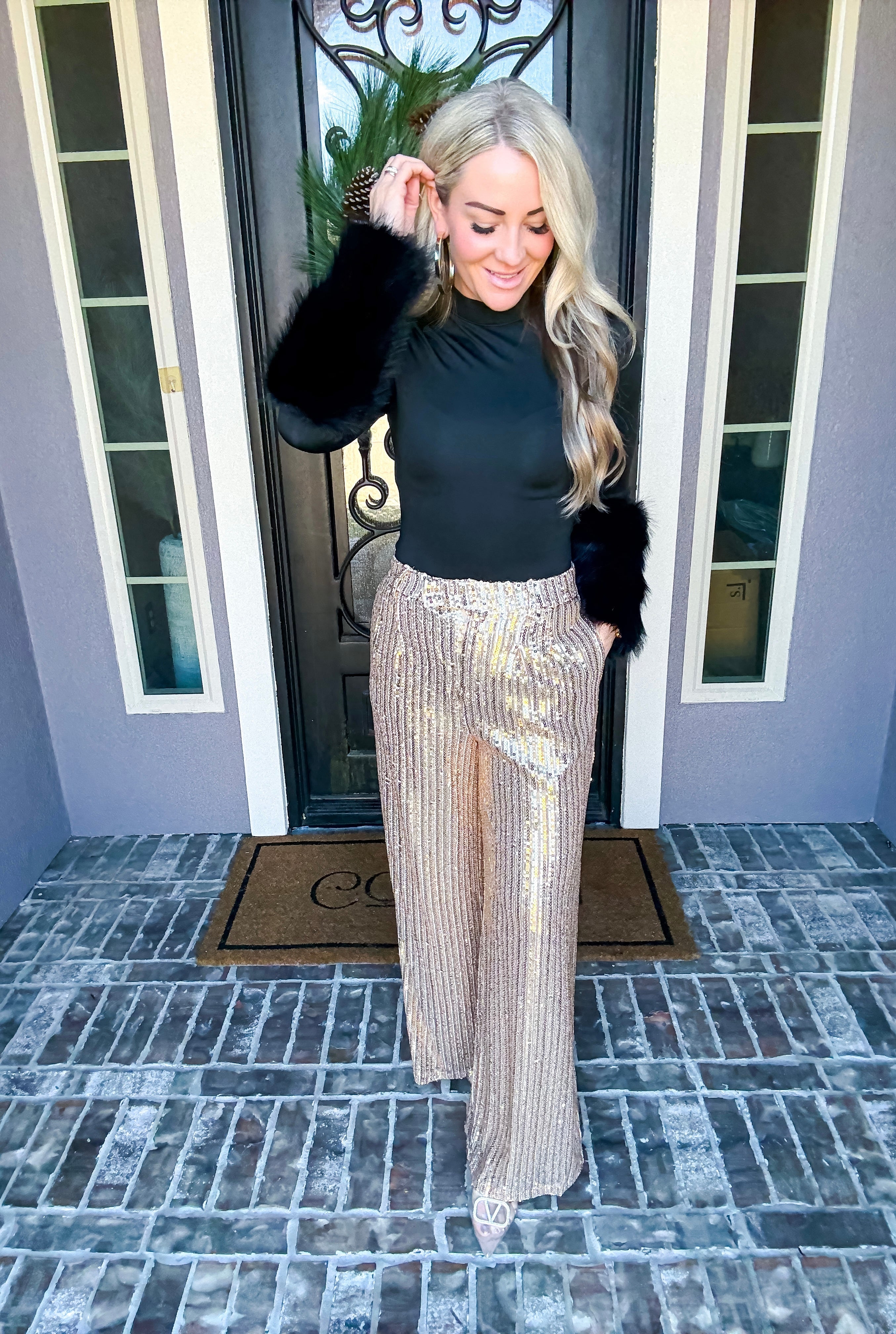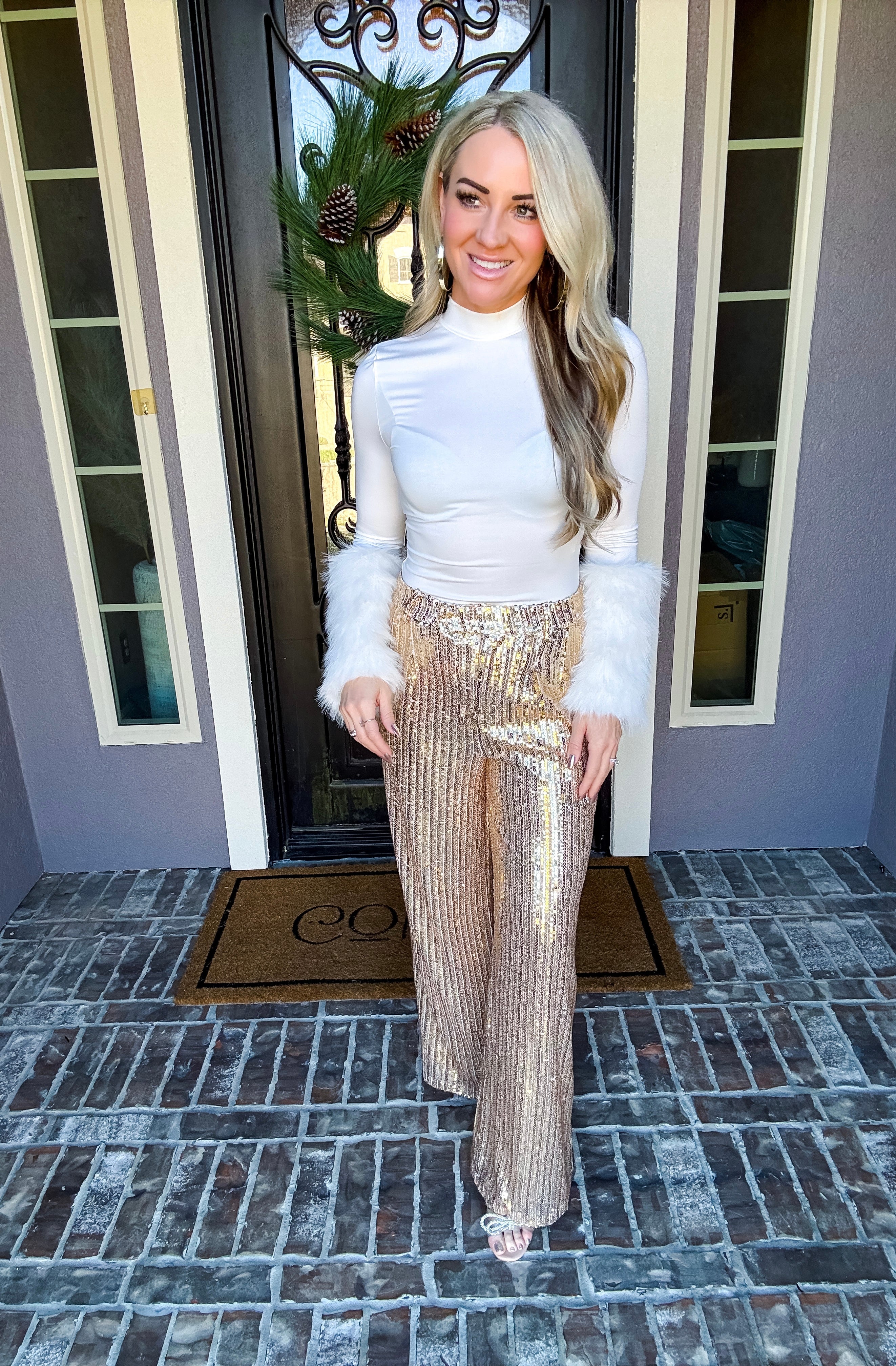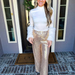 Champagne Shimmer Sequin Pants Elevate your holiday and New Year's Eve celebrations with these stunning sequin pants. Crafted with shimmering champagne-toned sequins, they deliver eye-catching glamour for any festive occasion. The convenient front zip closure ensures easy dressing and a polished silhouette. Perfect for parties, cocktail events, and memorable nights out, these pants combine sophisticated sparkle with practical design for confident, head-turning style.