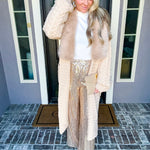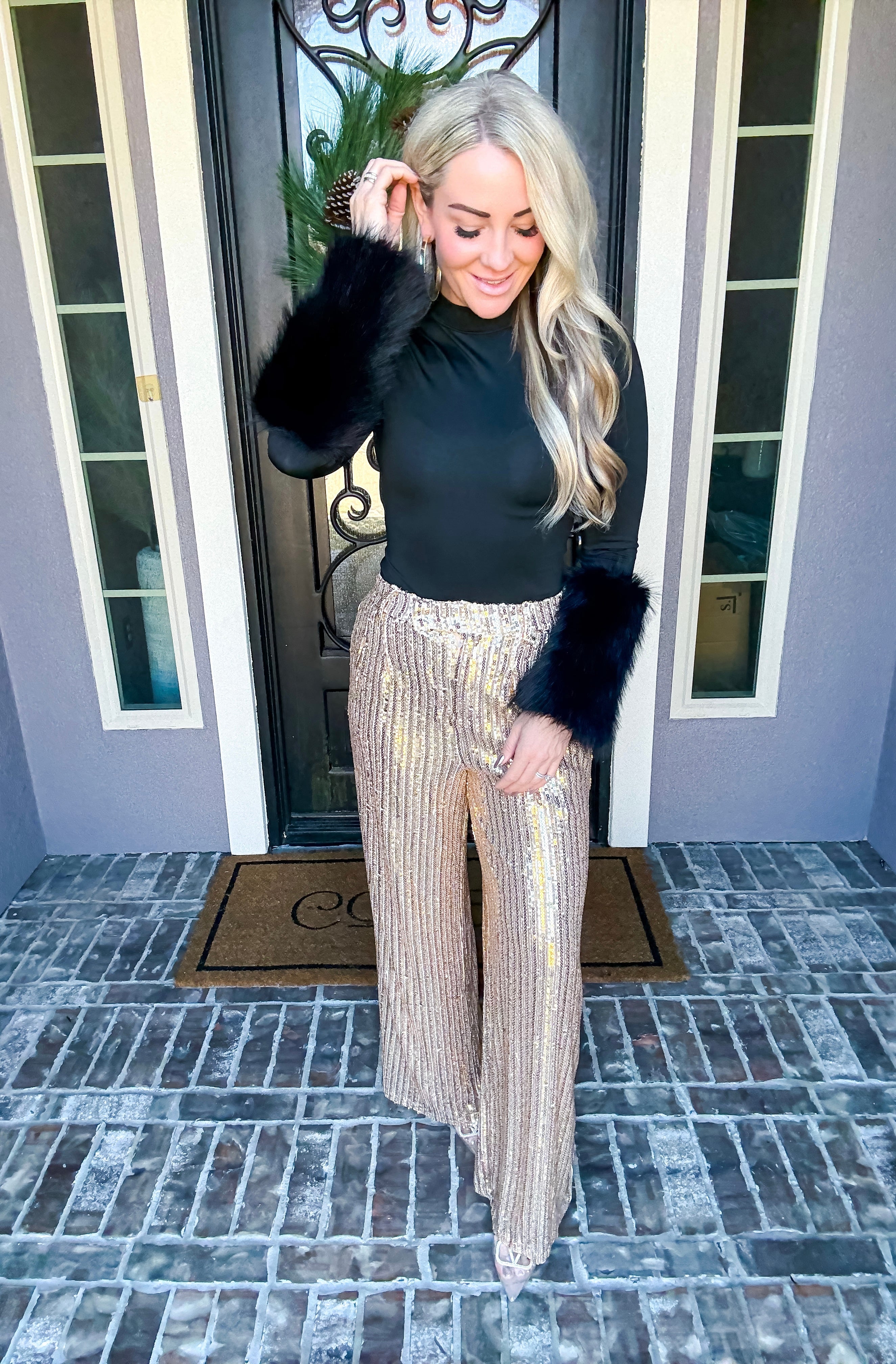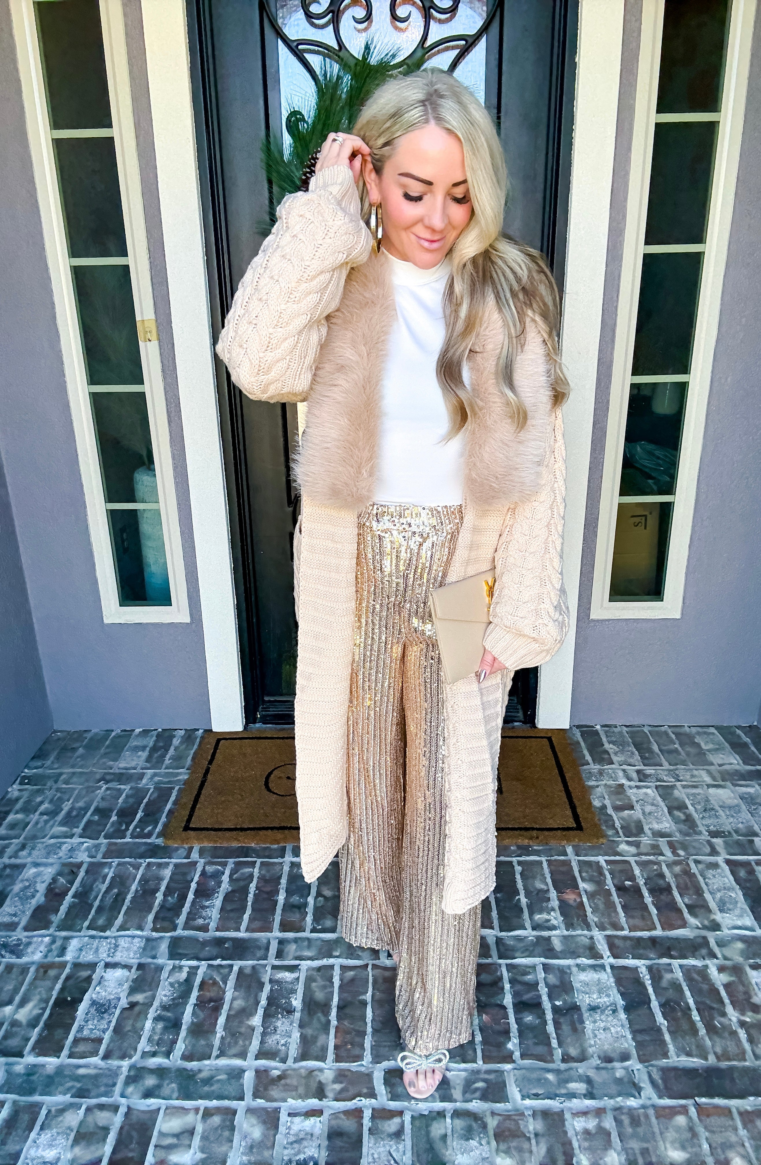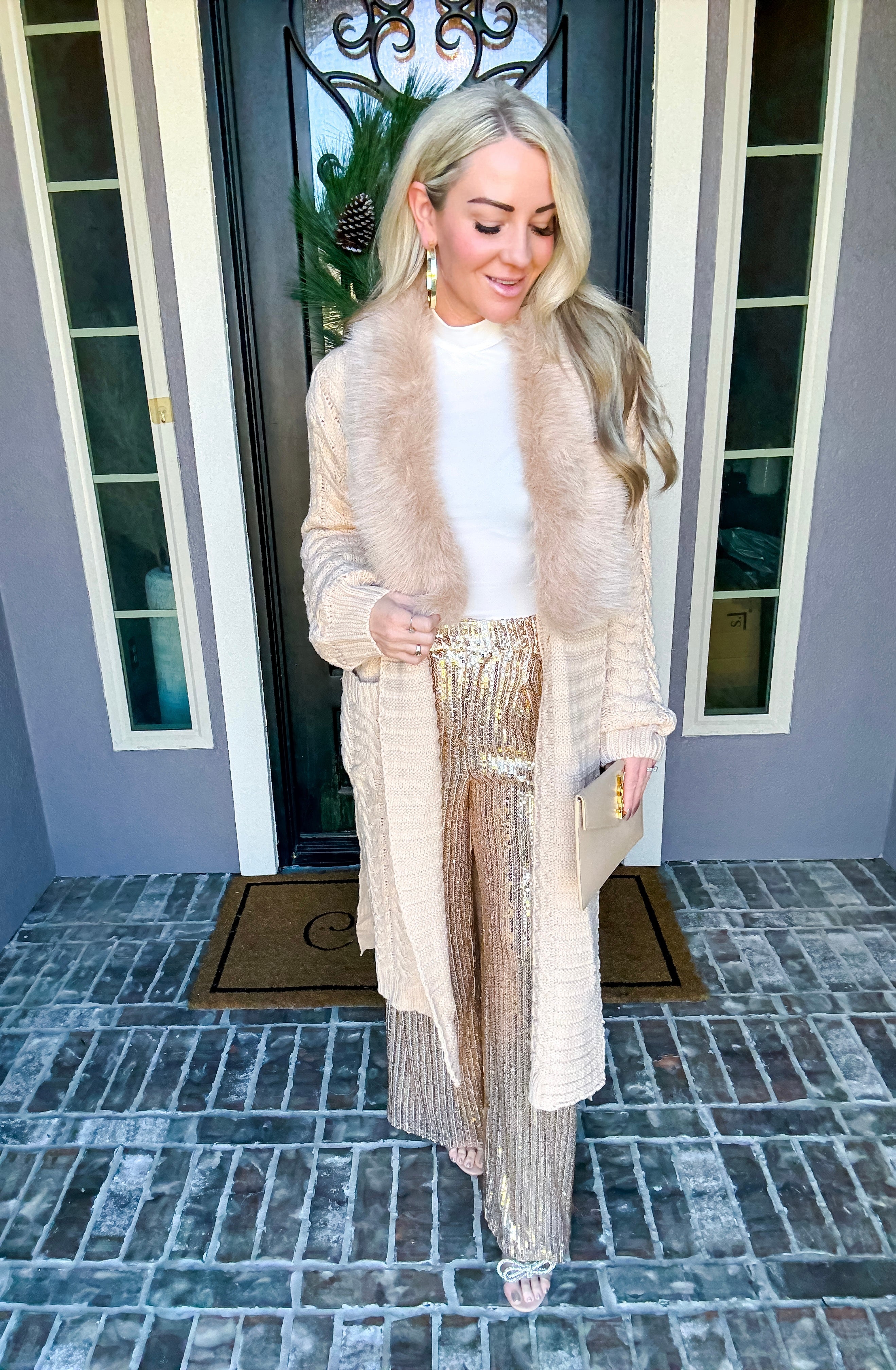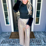 Champagne Shimmer Sequin Pants Elevate your holiday and New Year's Eve celebrations with these stunning sequin pants. Crafted with shimmering champagne-toned sequins, they deliver eye-catching glamour for any festive occasion. The convenient front zip closure ensures easy dressing and a polished silhouette. Perfect for parties, cocktail events, and memorable nights out, these pants combine sophisticated sparkle with practical design for confident, head-turning style.