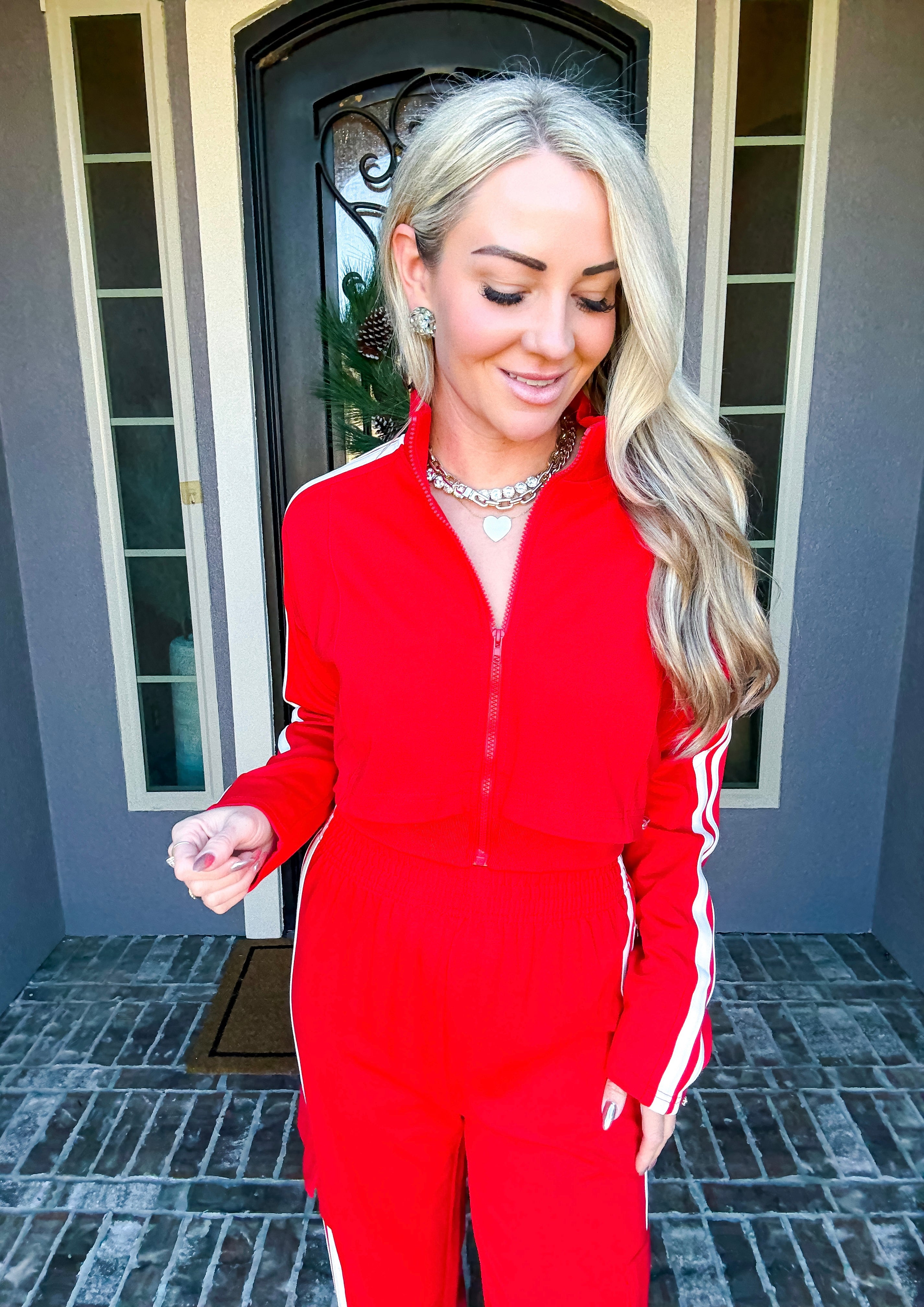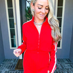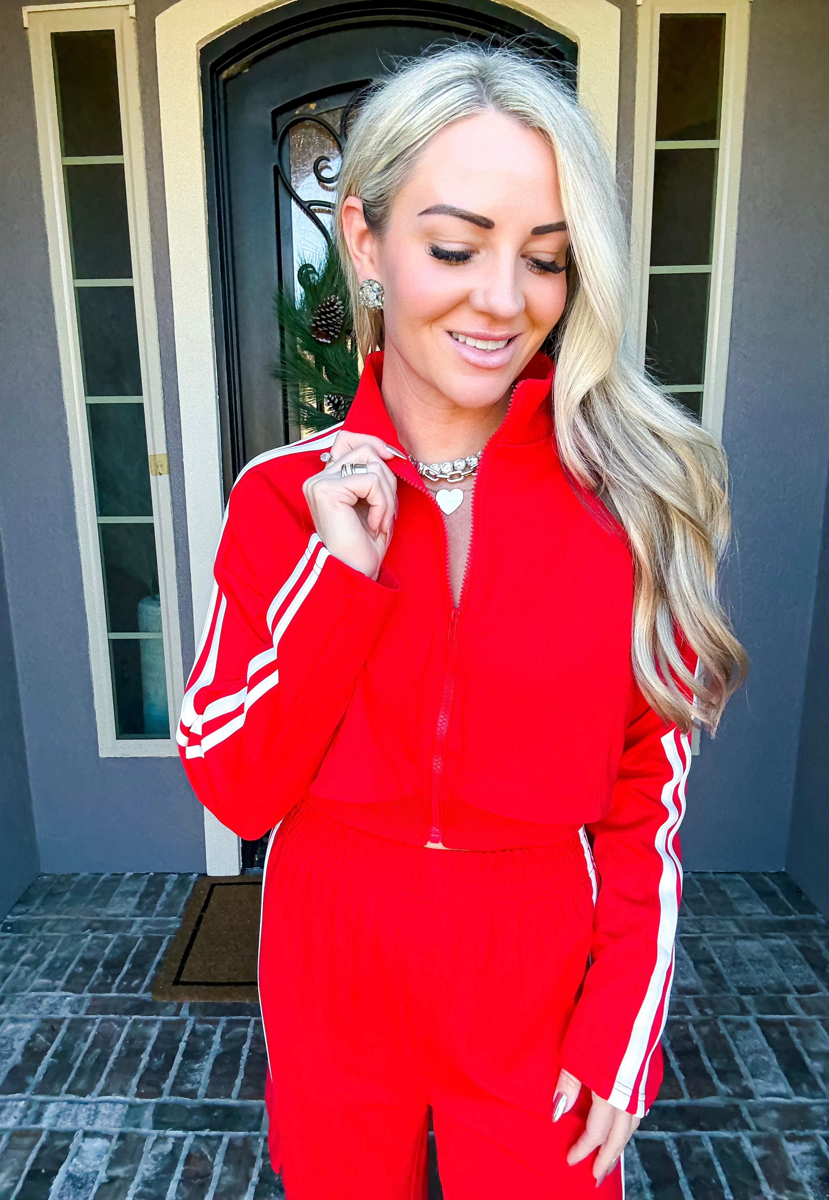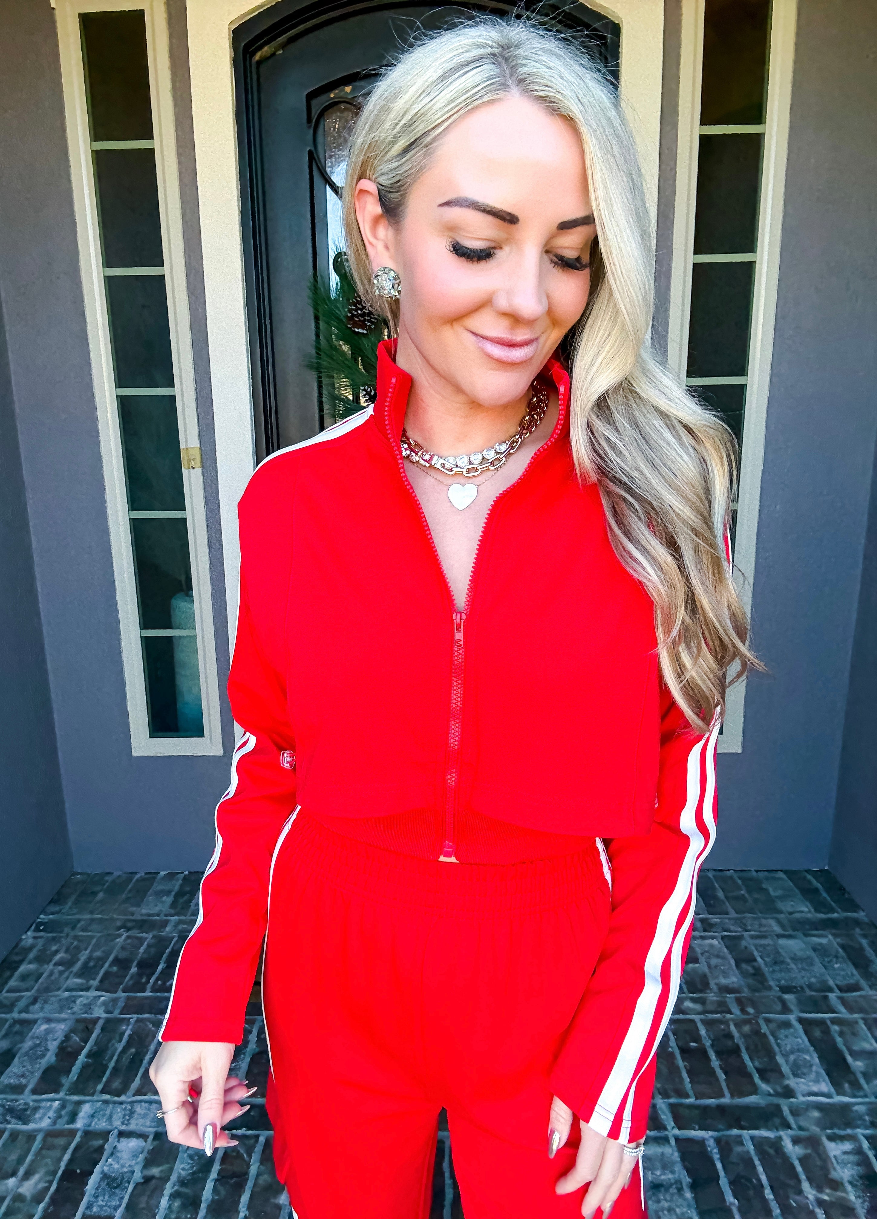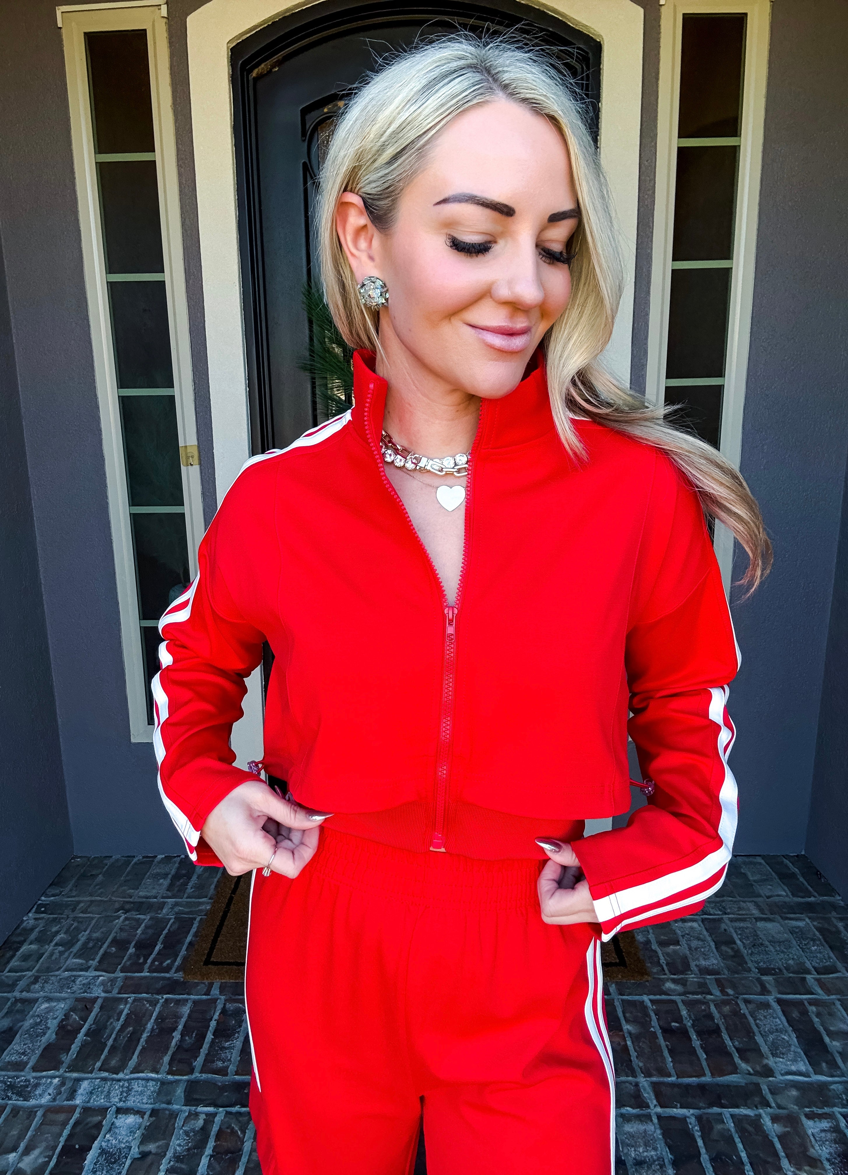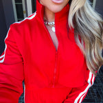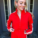 Effortlessly transition from errands to everyday moments in this stunning red track jacket. The front zip design offers quick, convenient layering while premium comfort ensures you stay relaxed throughout your day. Crafted for those who refuse to compromise between style and ease, this jacket delivers polished sophistication without sacrificing the comfort you deserve. Perfect for running around town while looking put-together.