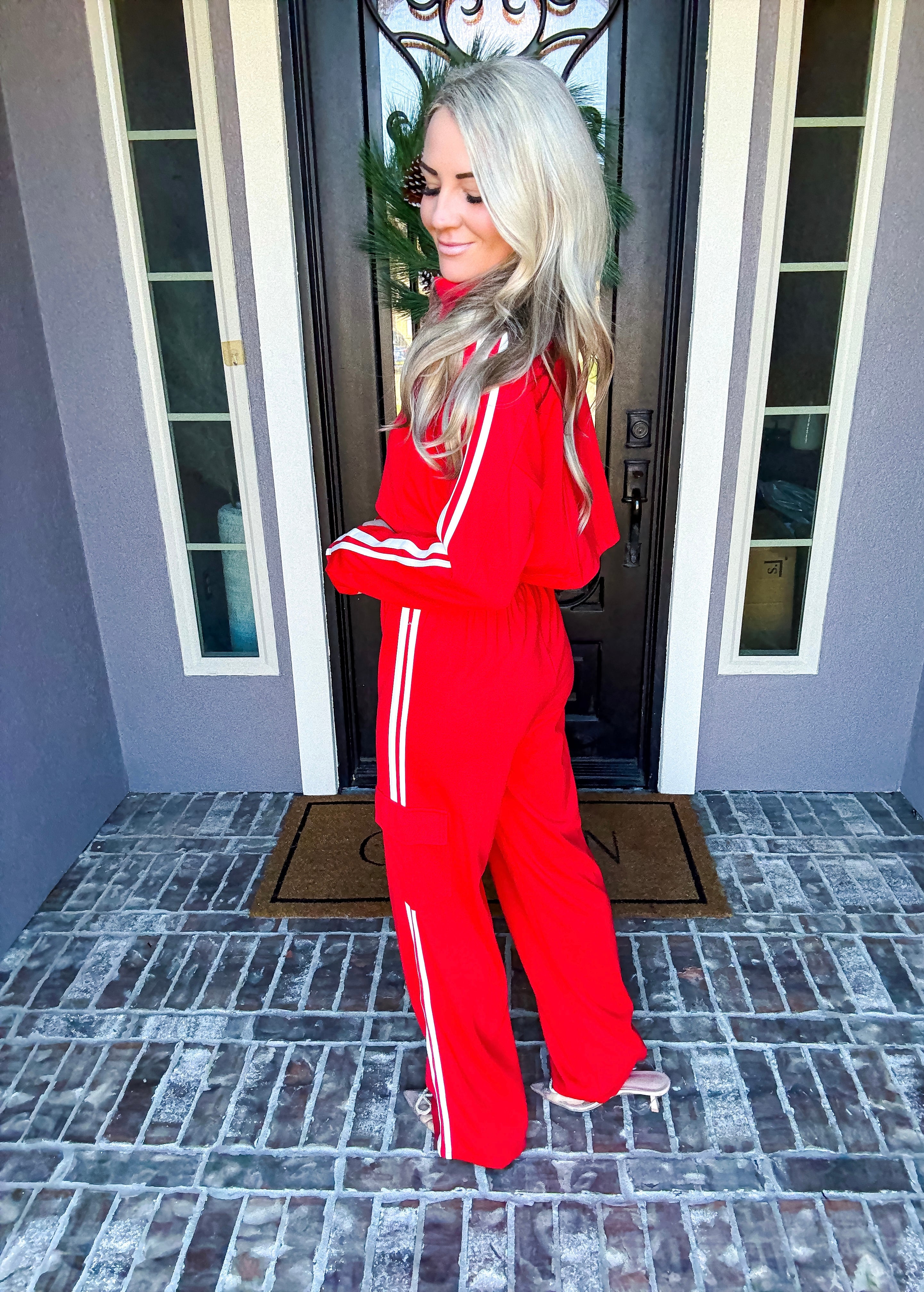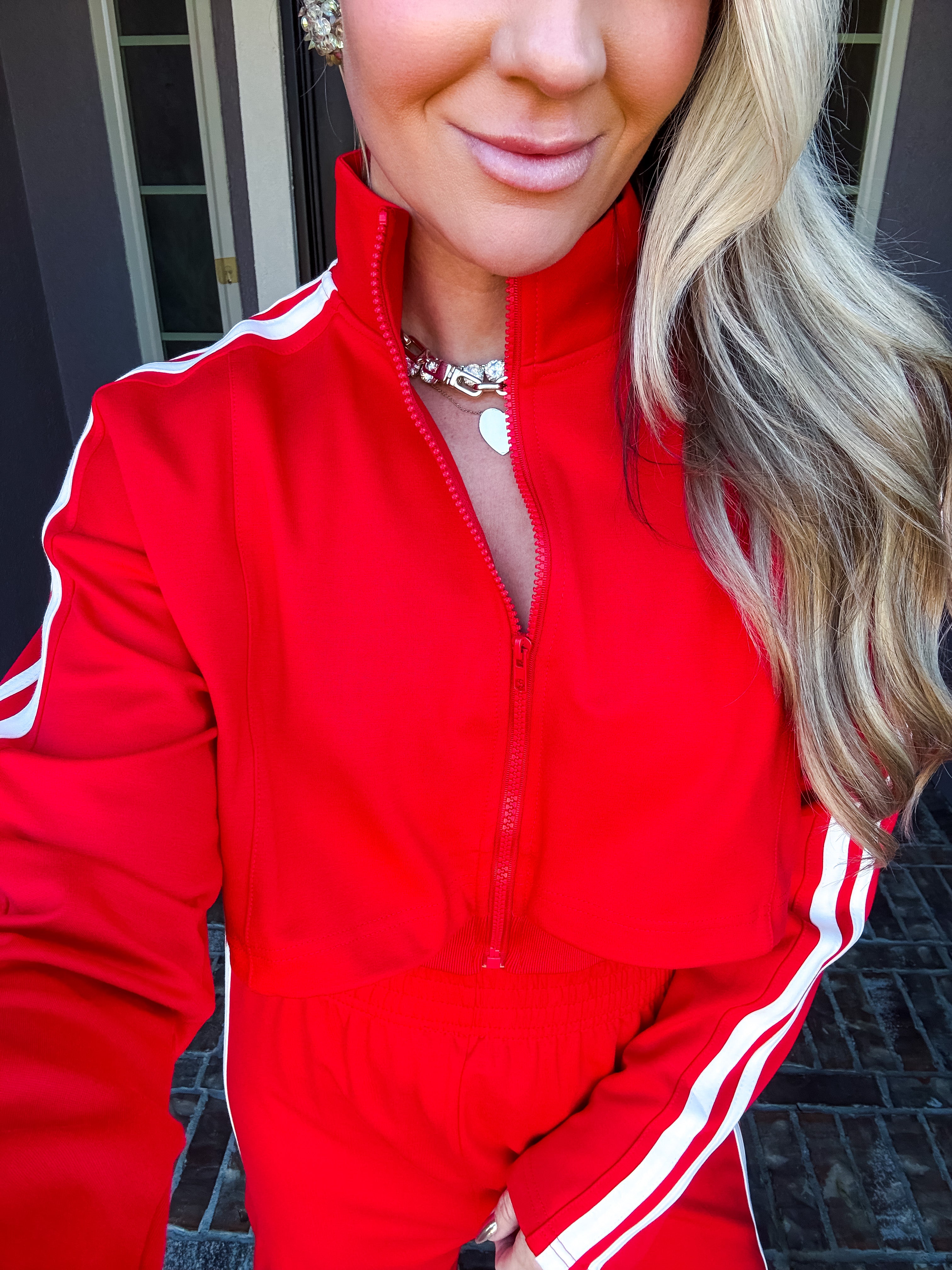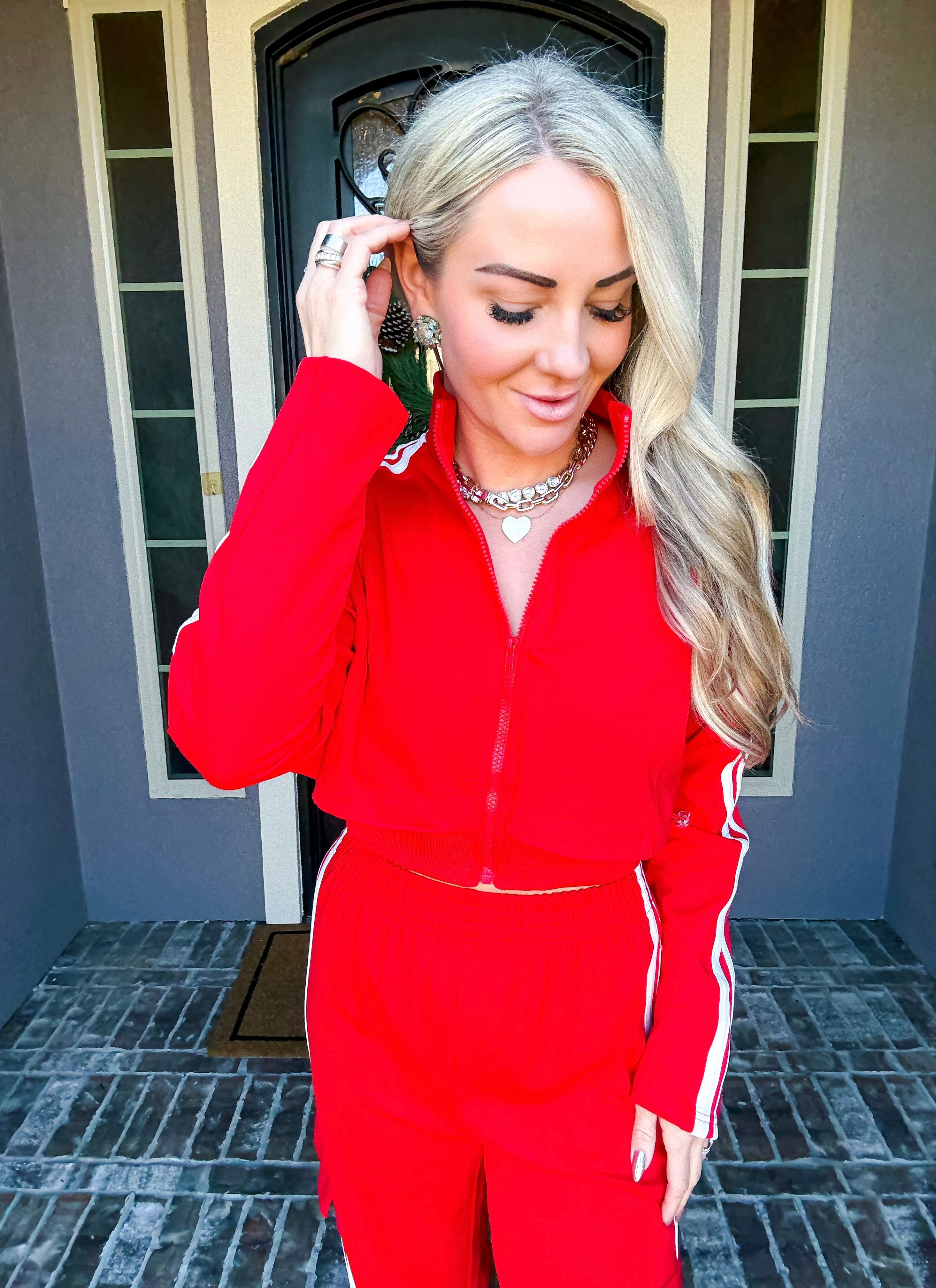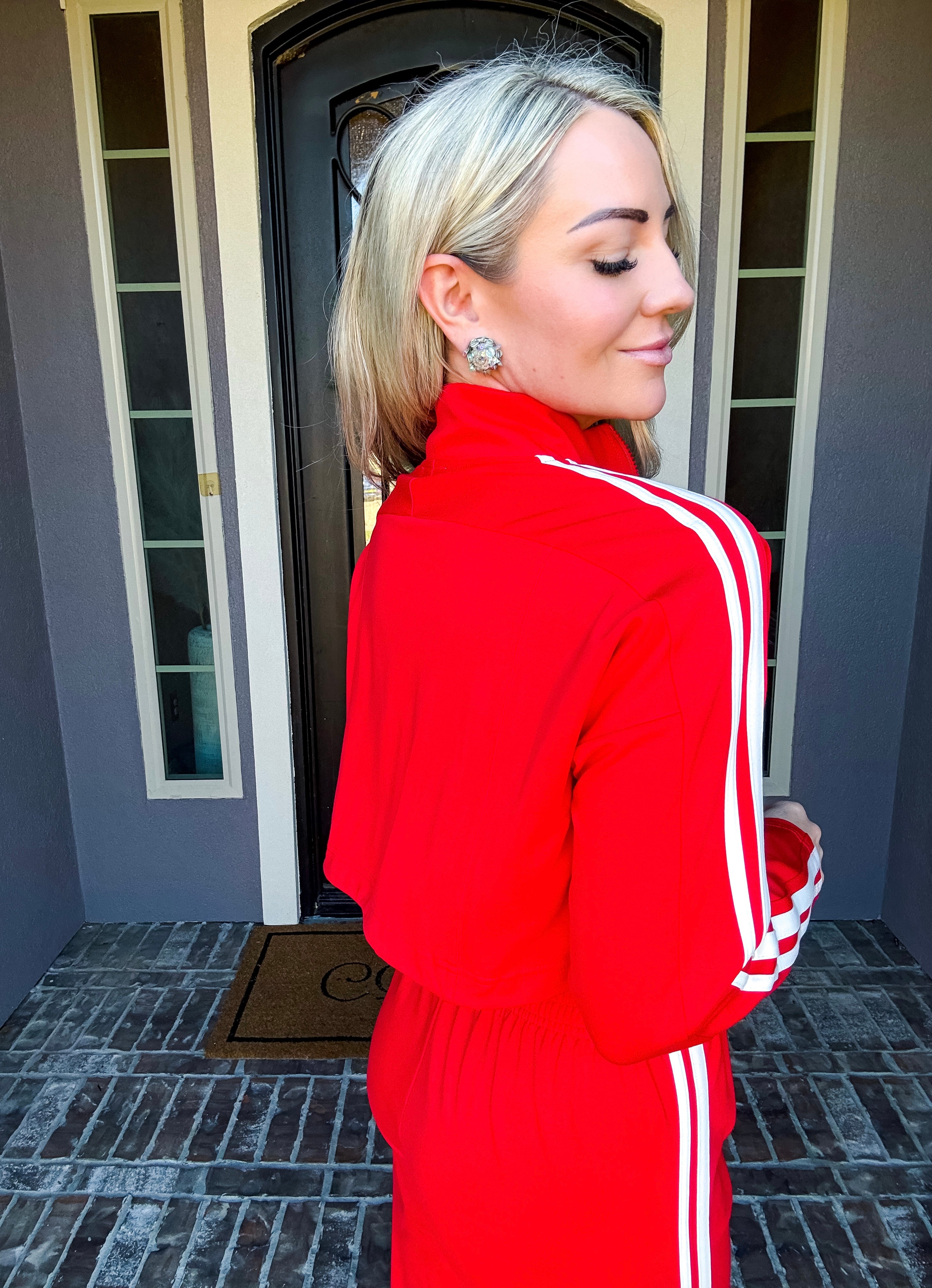 Effortlessly transition from errands to everyday moments in this stunning red track jacket. The front zip design offers quick, convenient layering while premium comfort ensures you stay relaxed throughout your day. Crafted for those who refuse to compromise between style and ease, this jacket delivers polished sophistication without sacrificing the comfort you deserve. Perfect for running around town while looking put-together.