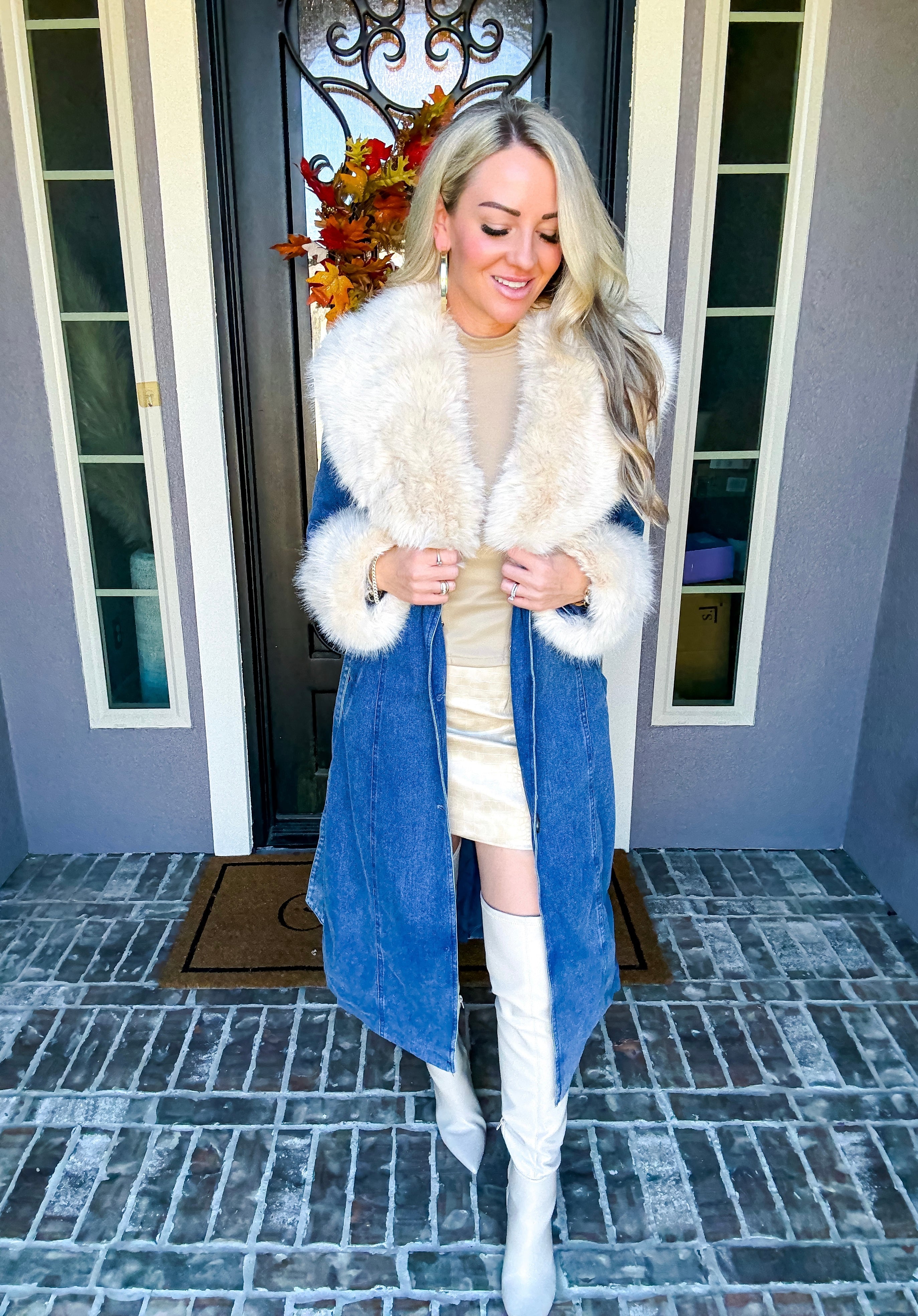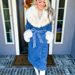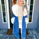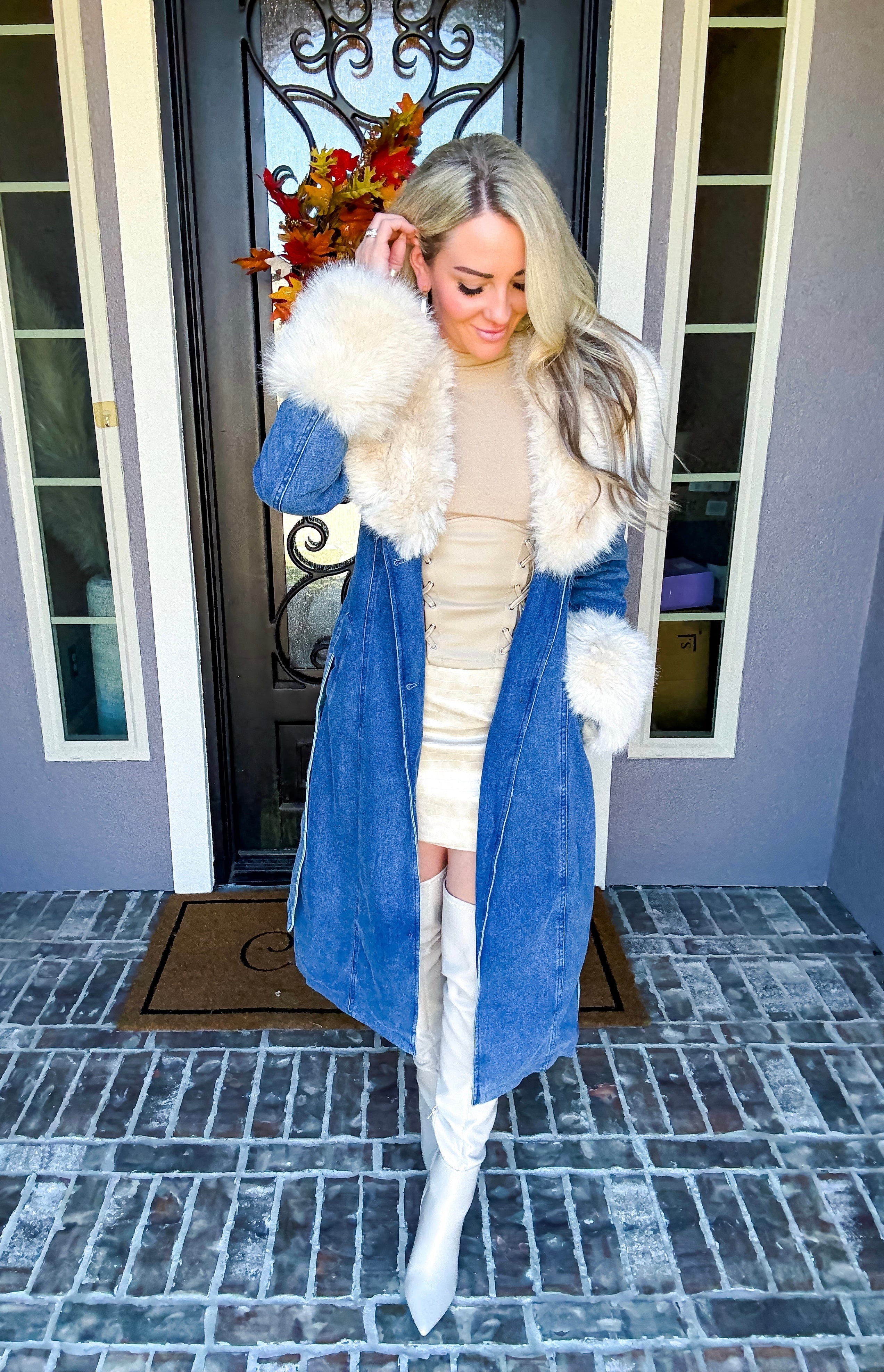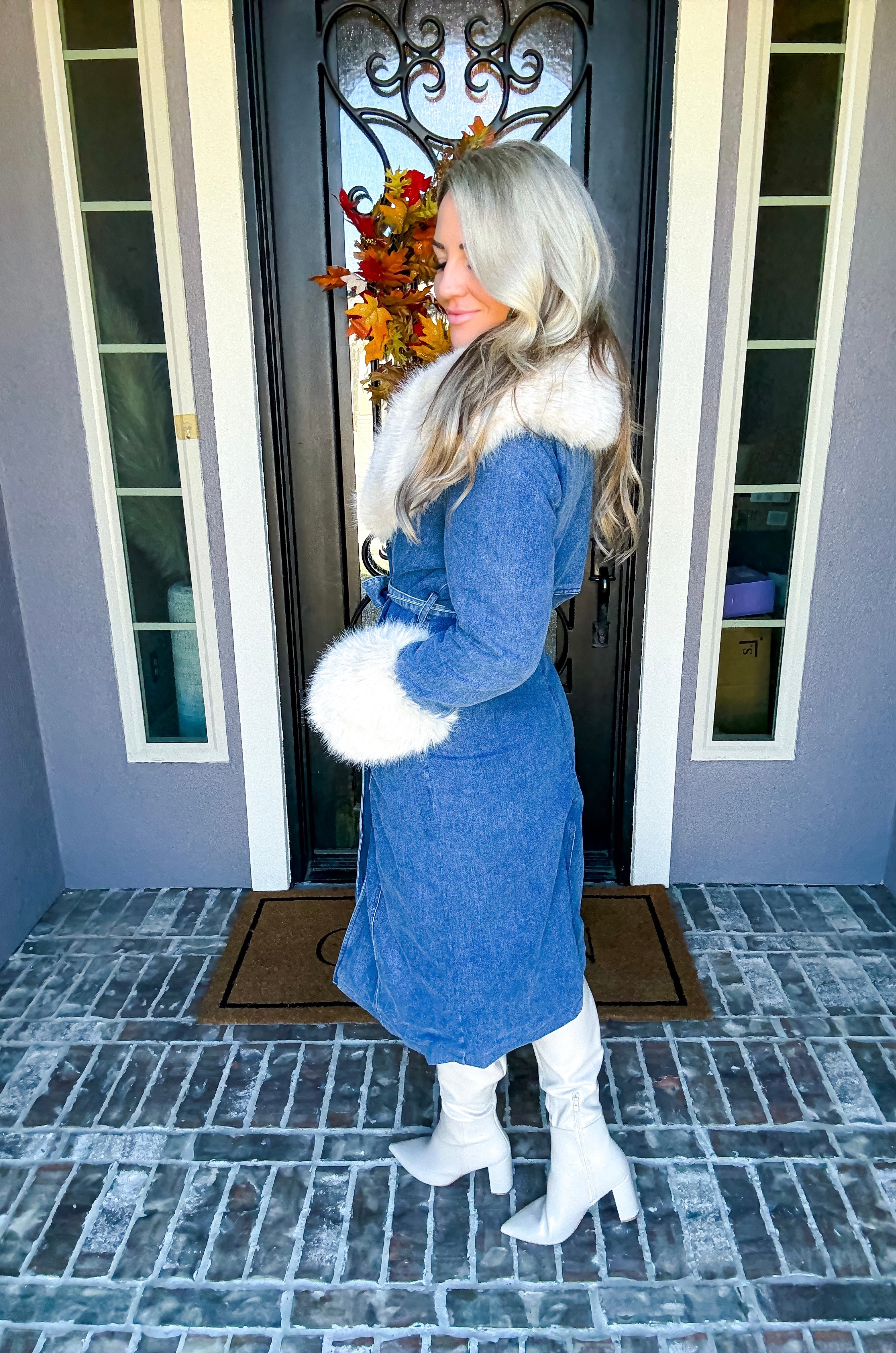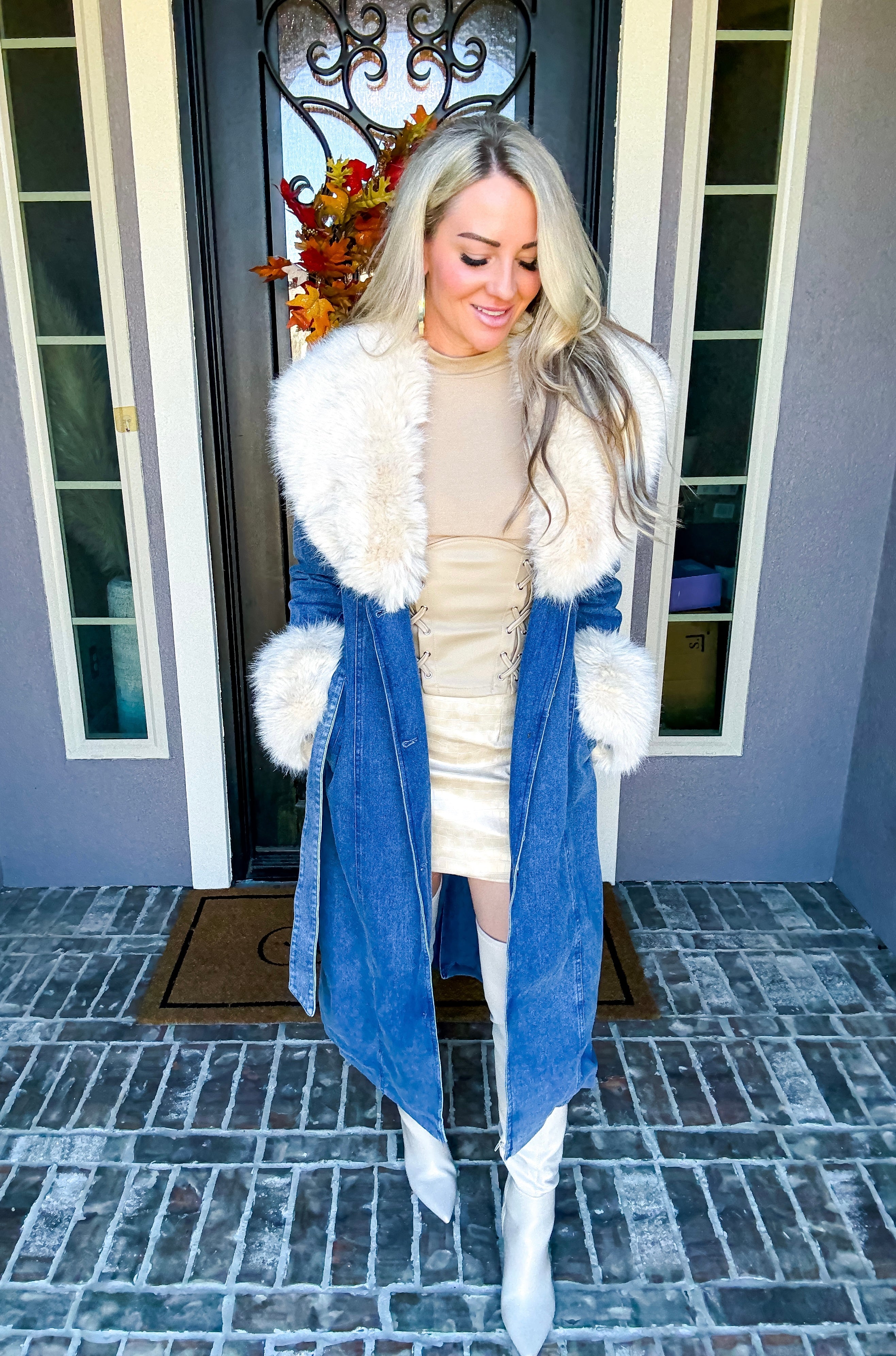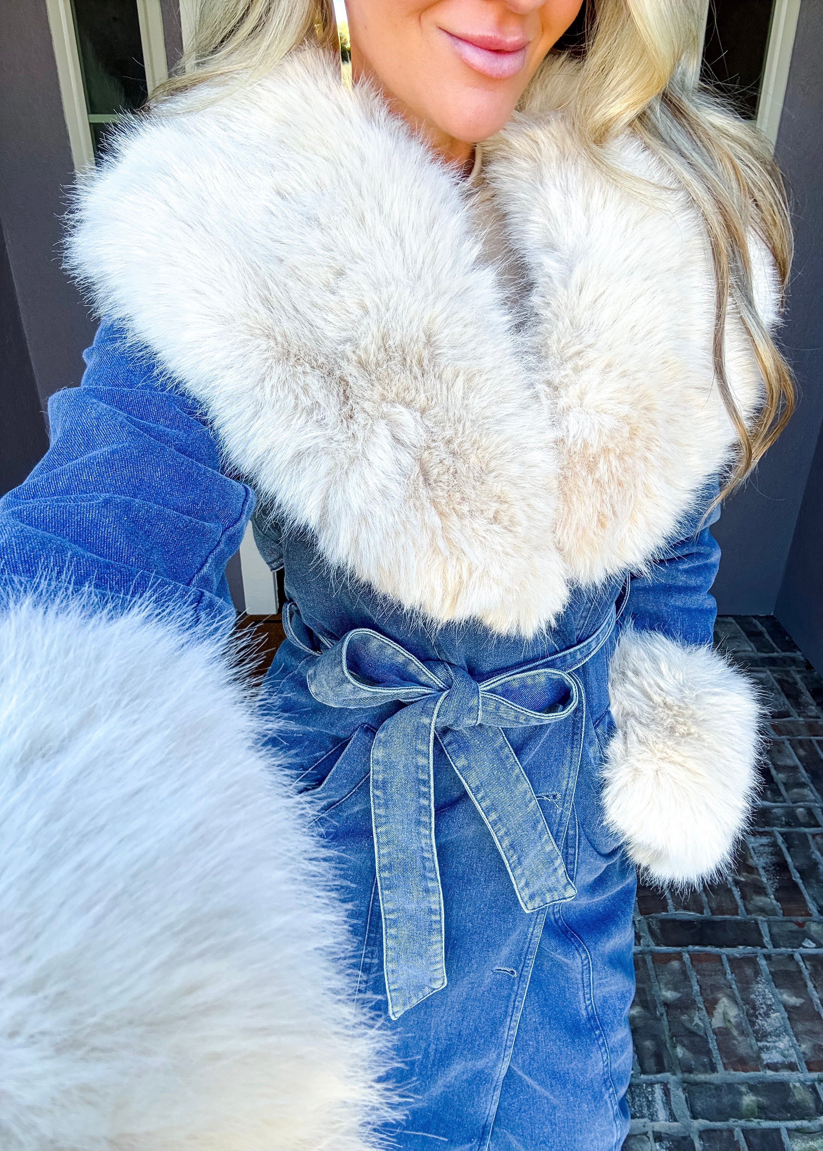 The Denim Dynasty Fur Coat combines timeless denim with luxurious fur collar and cuffs for unmatched style and warmth. Featuring a tie waist, it offers a flattering silhouette while keeping you cozy on chilly days. This versatile coat is designed to be a lasting staple in your wardrobe, ensuring you look effortlessly chic season after season. Expect to turn heads and receive countless compliments with this statement piece.