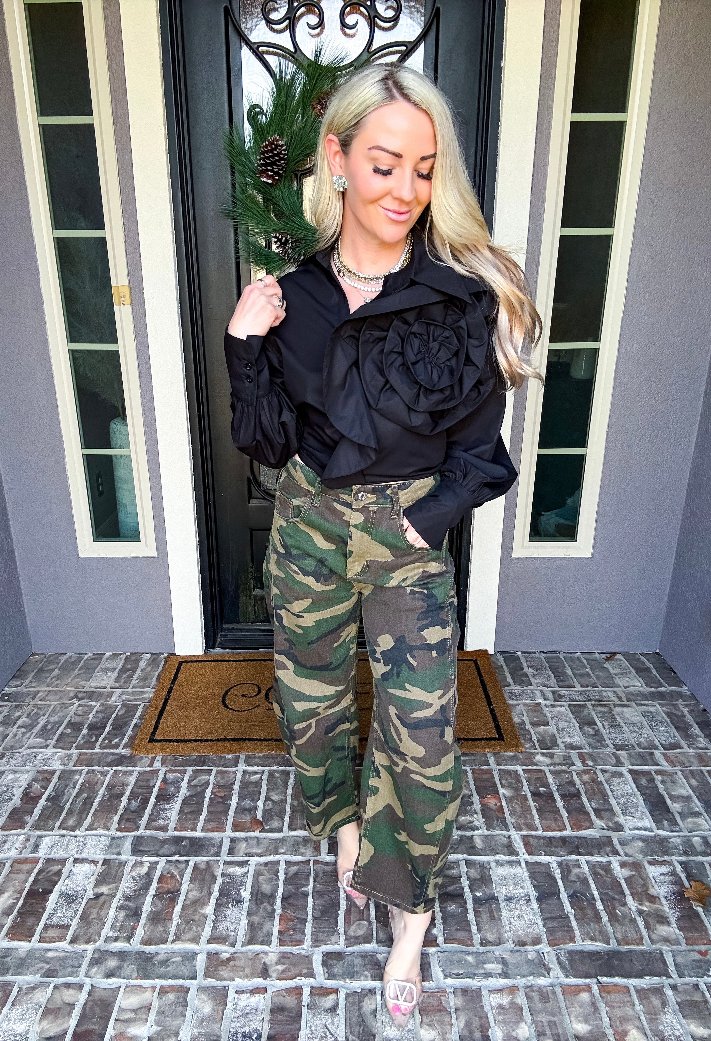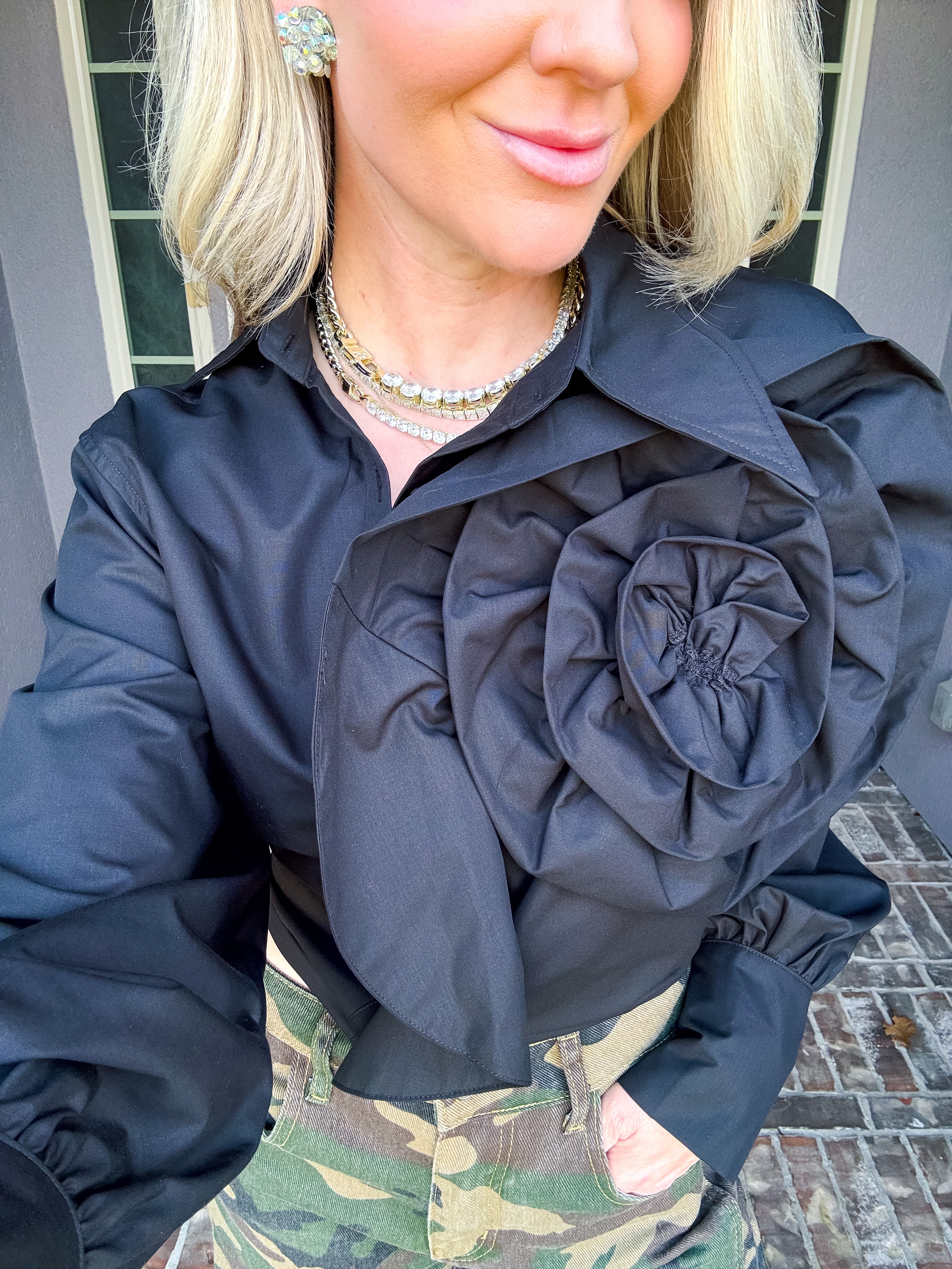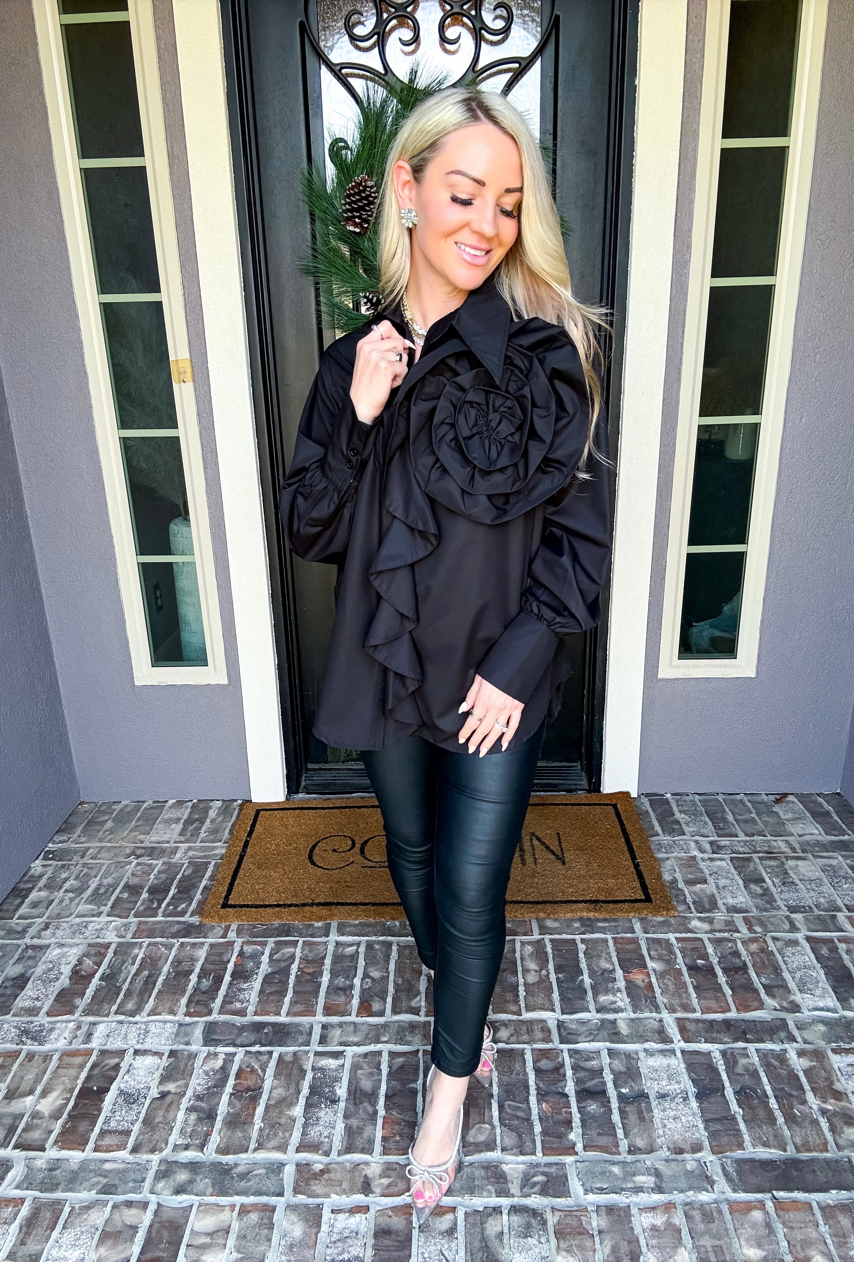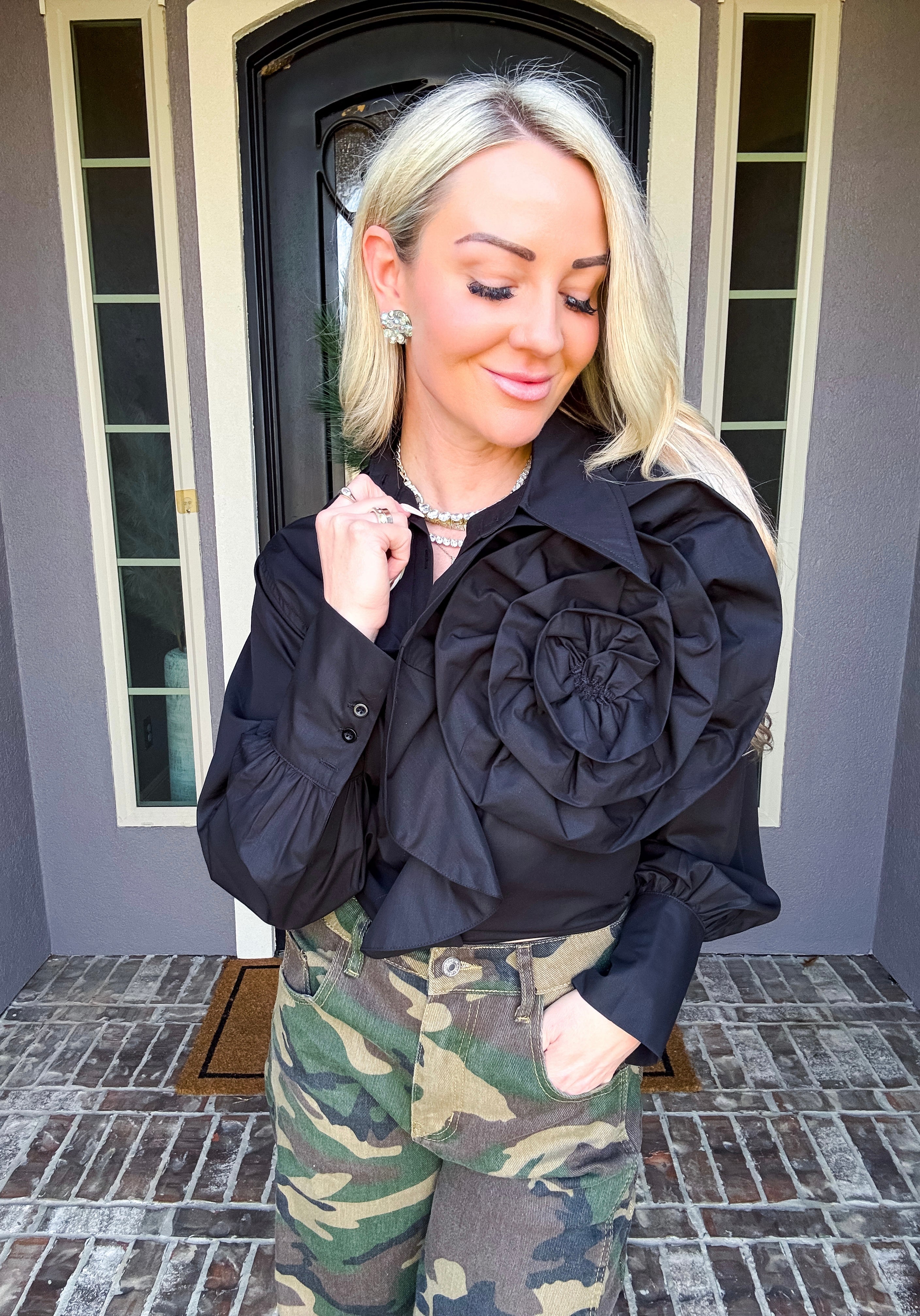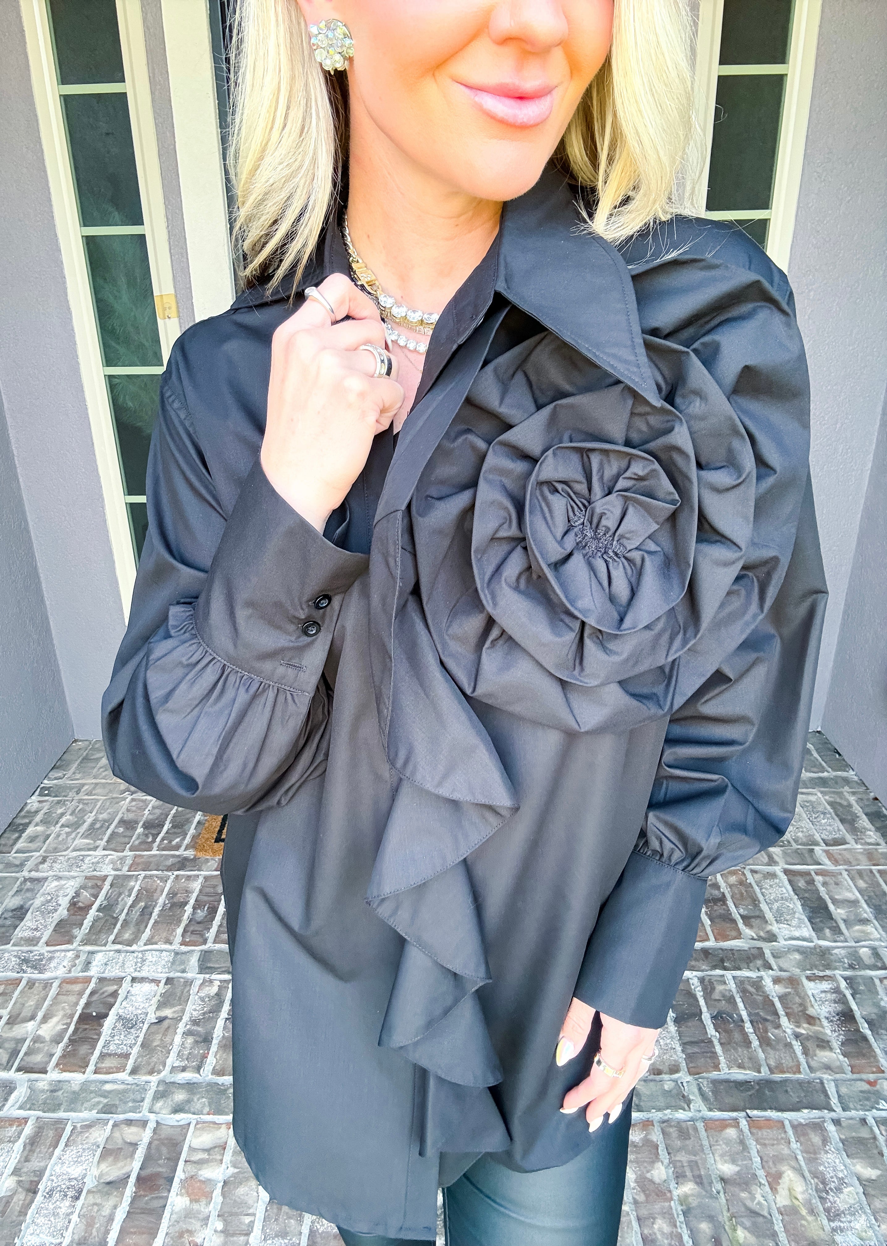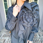 Elevate your wardrobe with this statement blouse, featuring an exaggerated floral motif that commands attention. The asymmetrical collar adds architectural interest and modern sophistication, while the versatile cut transitions seamlessly from polished tucked styling to effortlessly relaxed layering. A high-fashion piece designed for those who understand that true style lies in unexpected details and confident silhouettes.